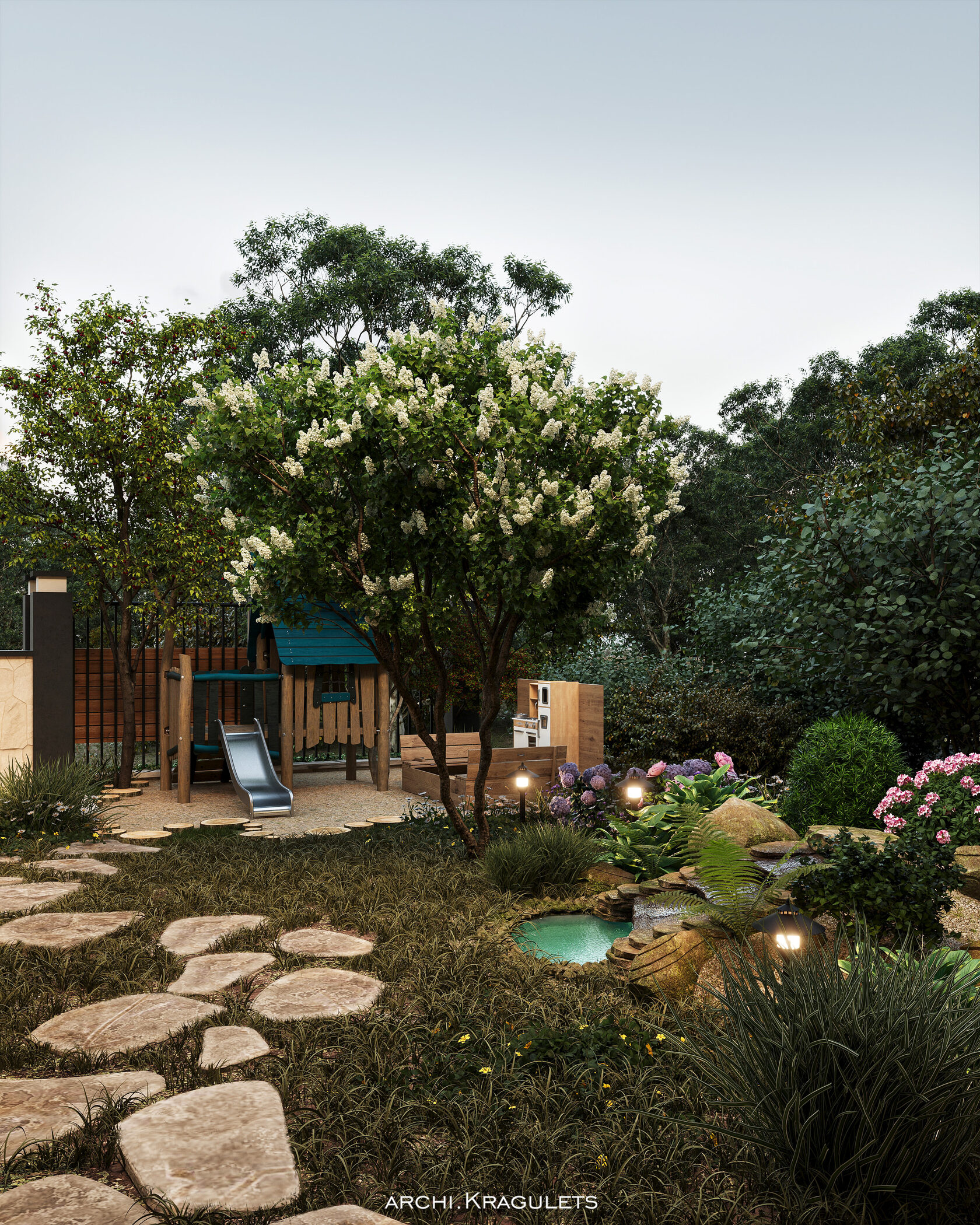 Концепция: Ключевая идея проекта — создание симбиотического пространства, в котором архитектура имитирует и дополняет природные формы. За счет использования древесных форм, натуральных материалов и мягких линий достигается эффект естественного 'прорастания' дома из земли. Дизайн намеренно отражает ритмы и атмосферу леса, призванный обеспечить внутренний покой и ощущение тишины.