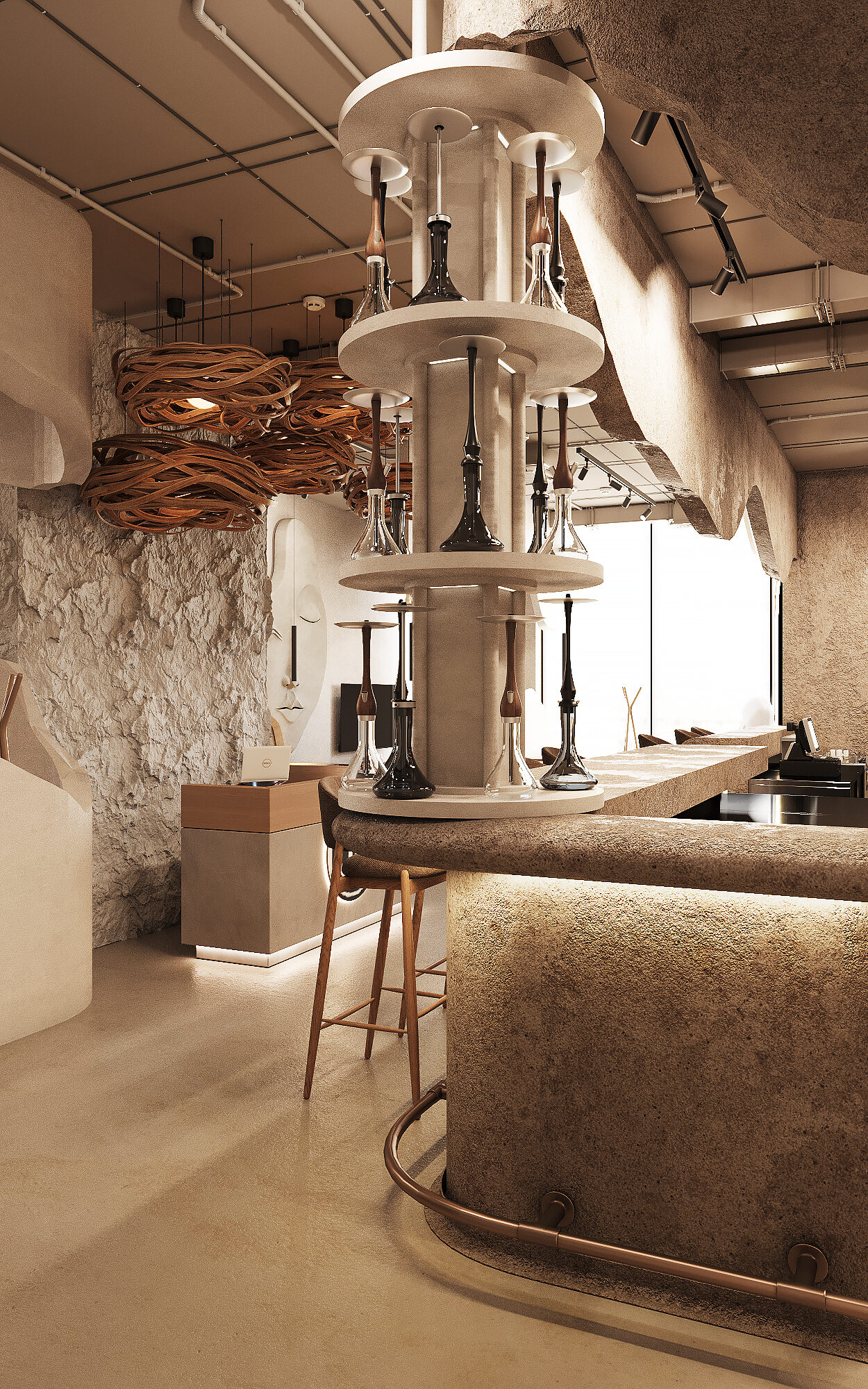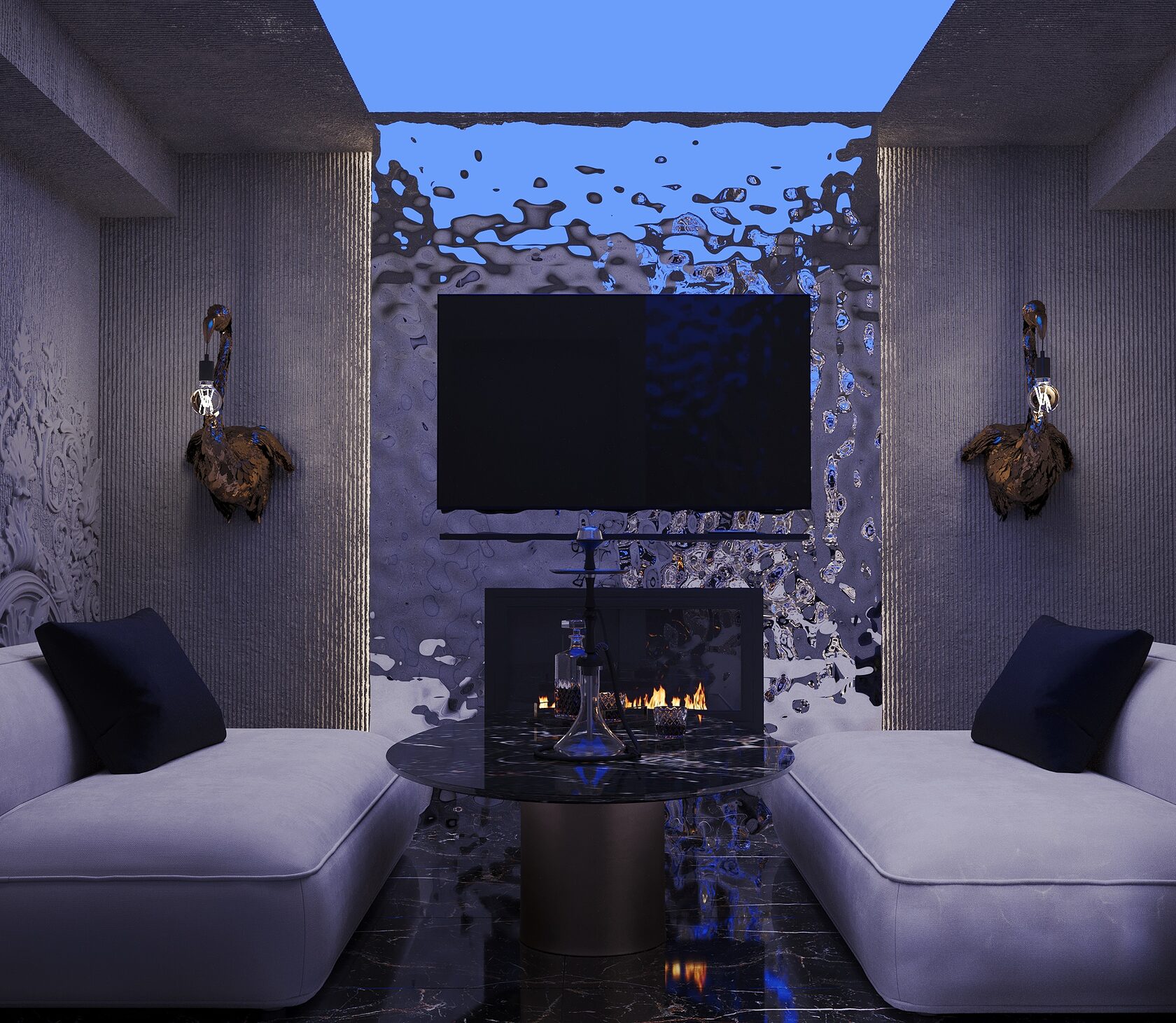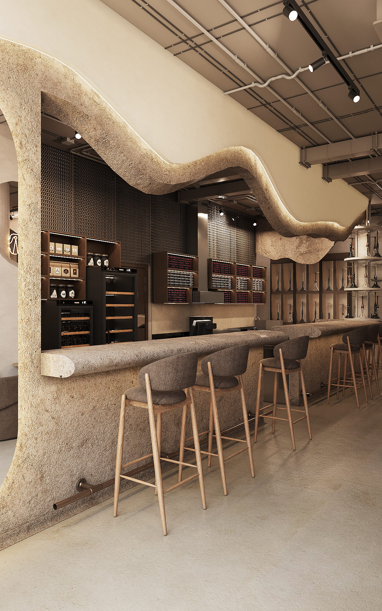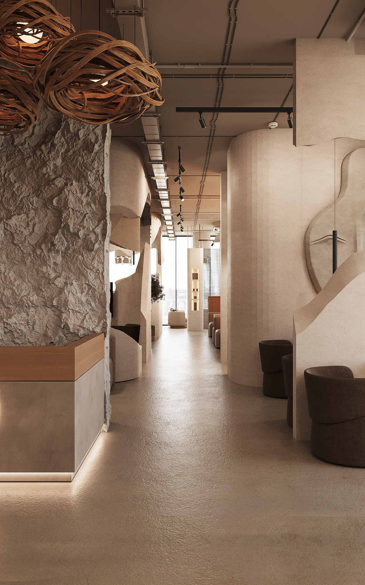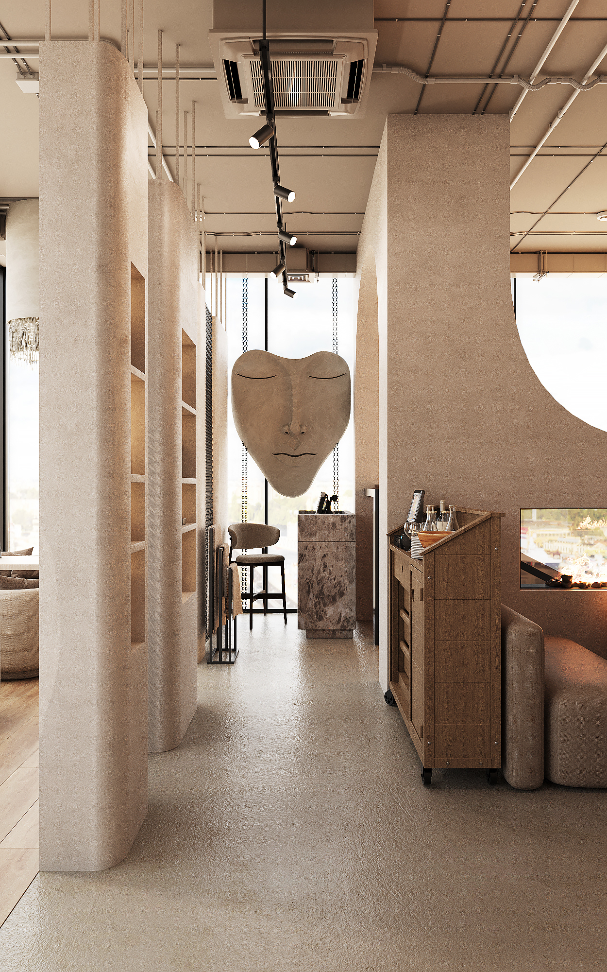 Концепция: Основная концепция проекта заключается в глубоком исследовании бионических форм, которые интегрированы в декор, мебель и интерьер, имитируя естественные изгибы и текстуры пустынных ландшафтов. Каждый предмет мебели и декора разработан по индивидуальному проекту, что обеспечивает абсолютную эксклюзивность и неповторимость интерьера.