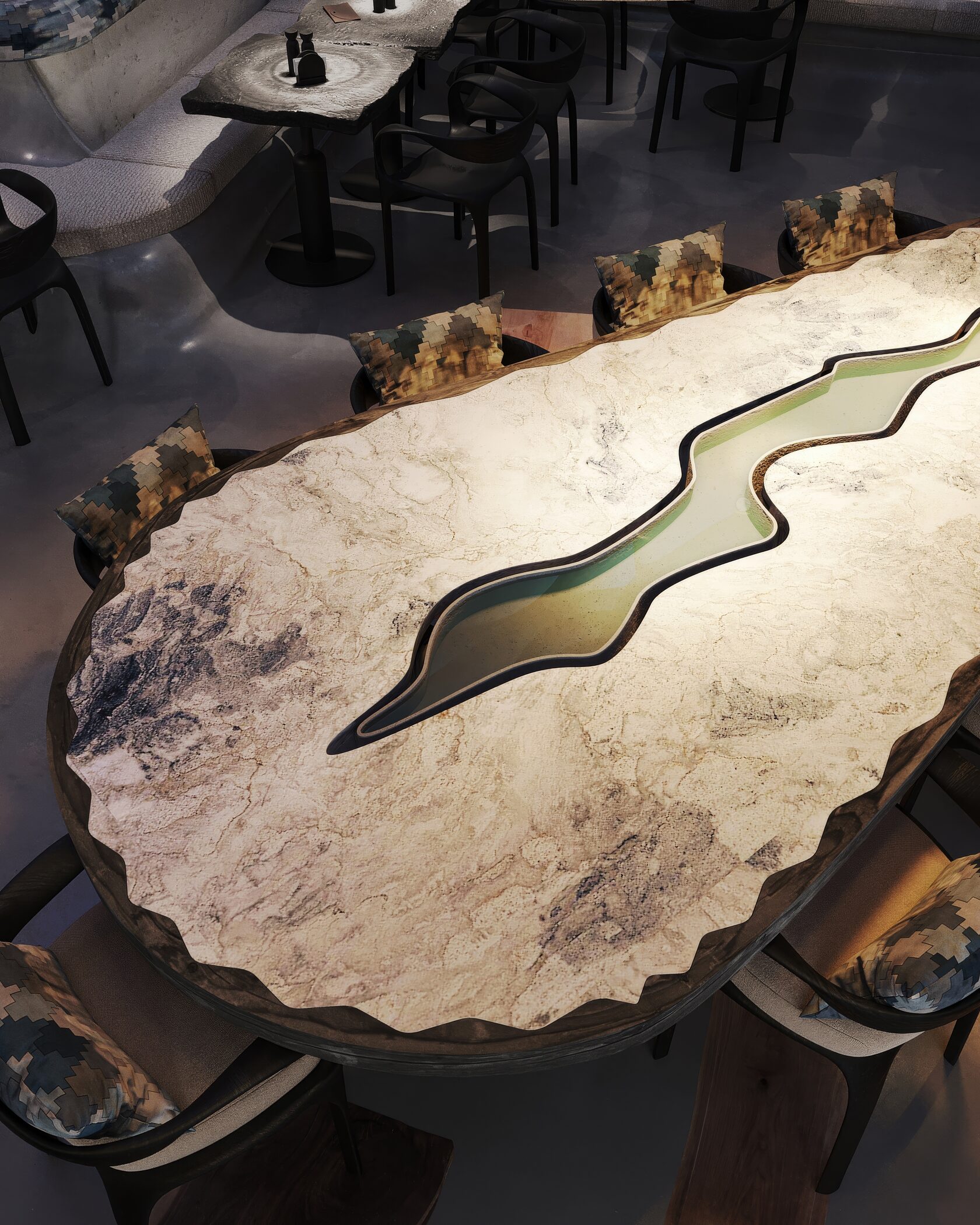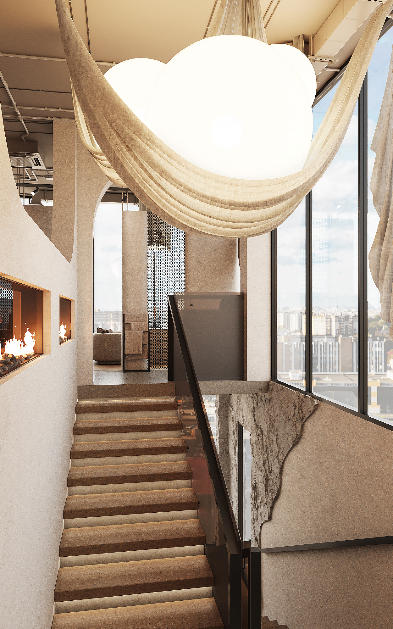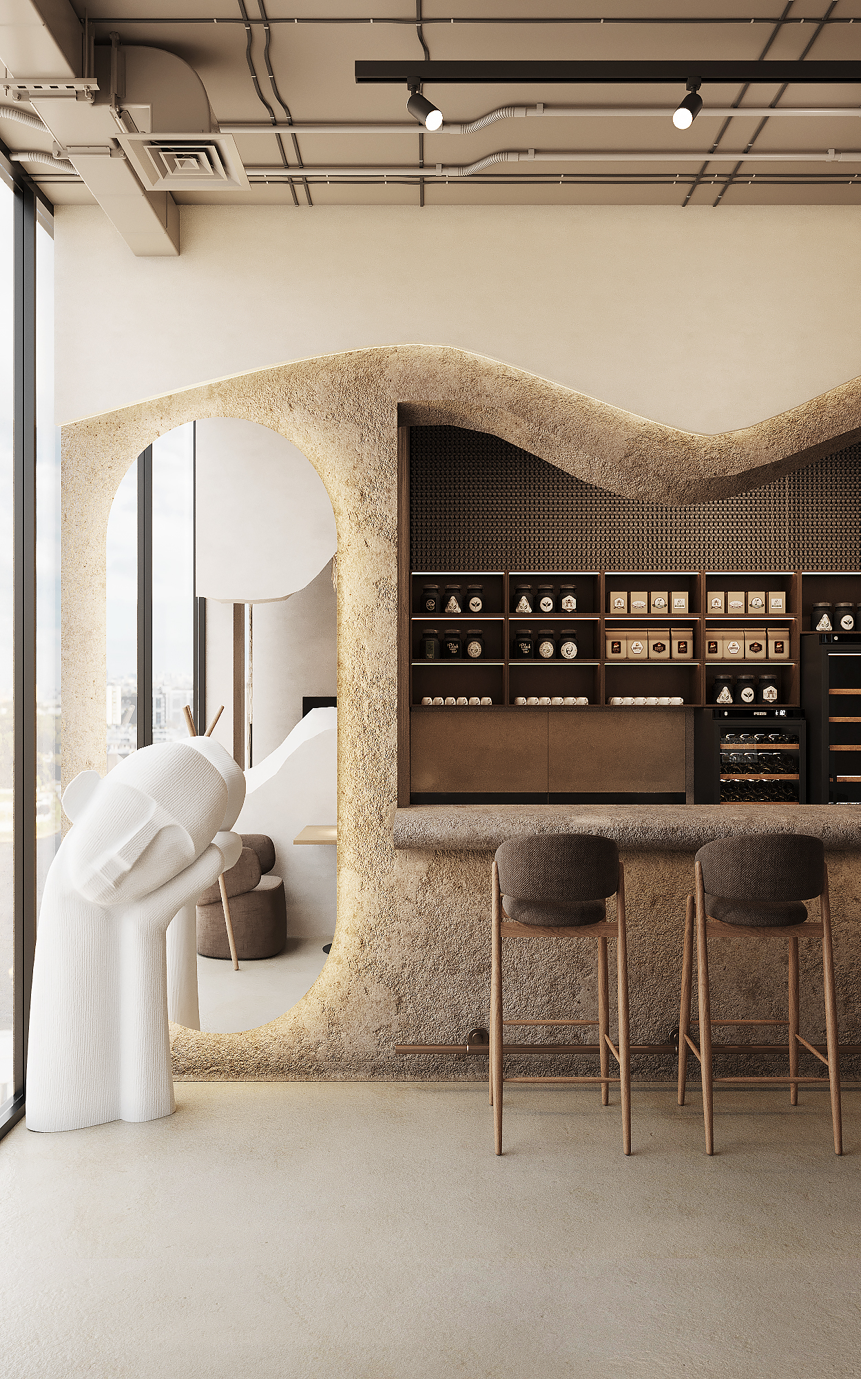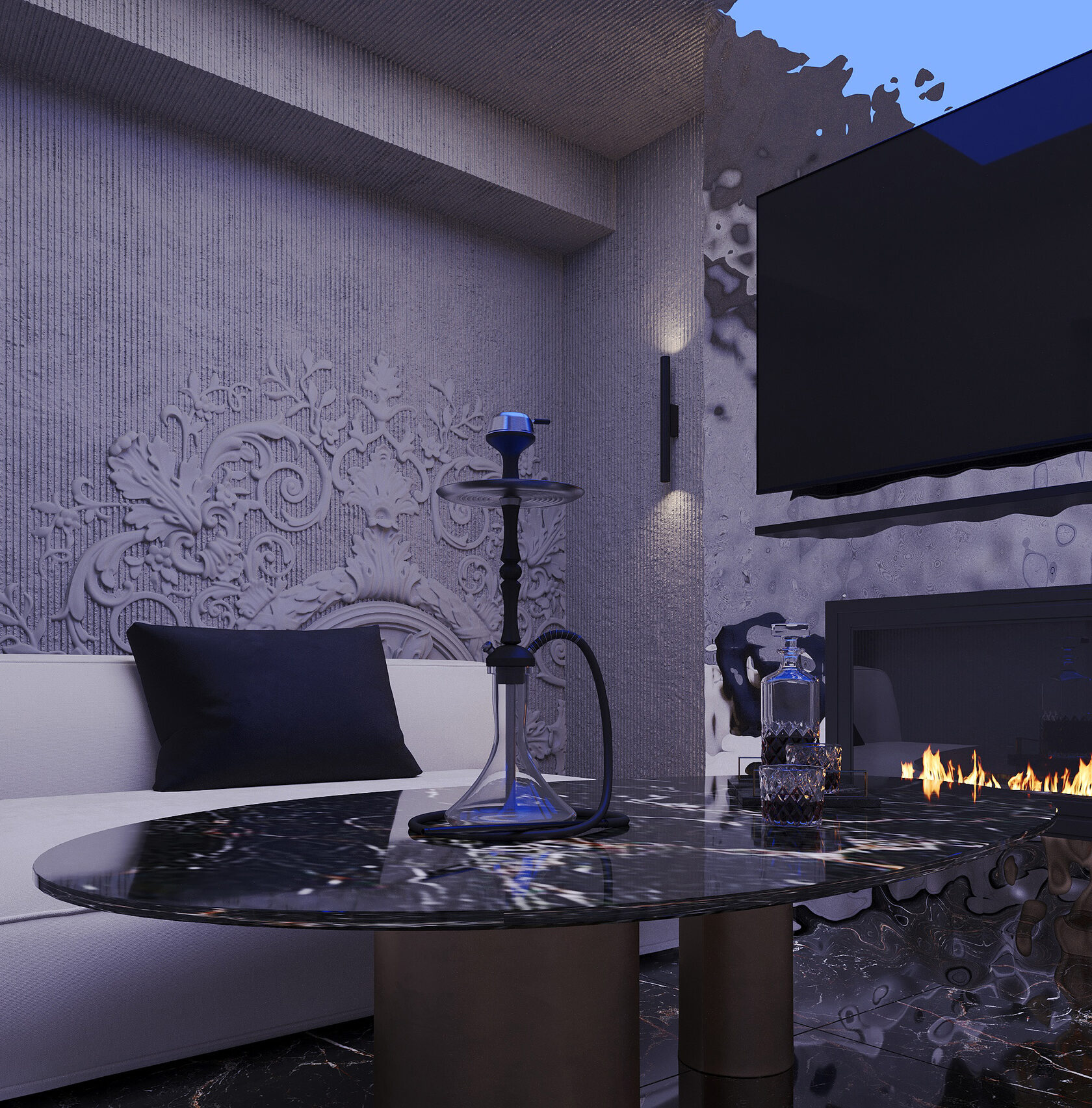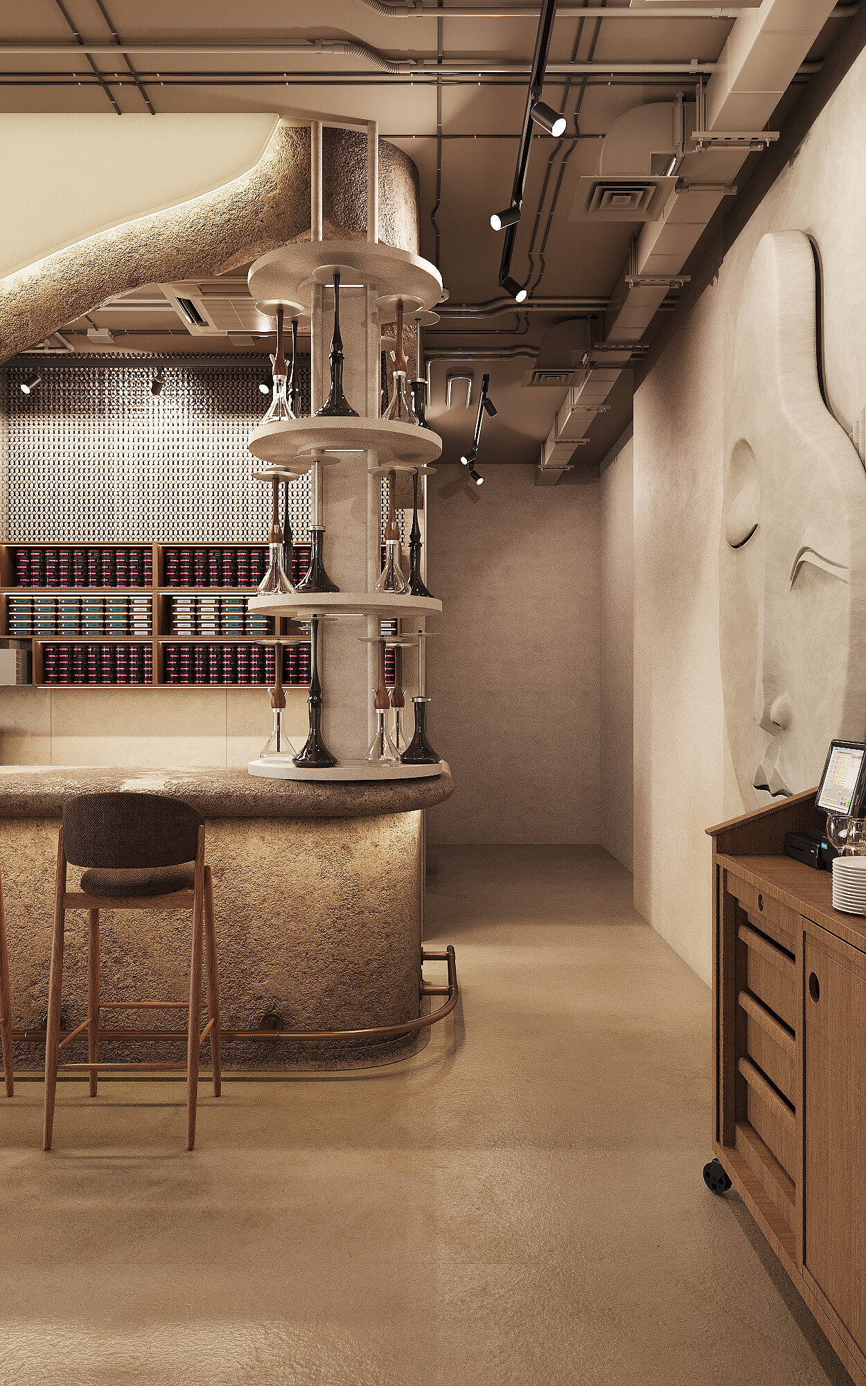 Концепция: Основная концепция проекта заключается в глубоком исследовании бионических форм, которые интегрированы в декор, мебель и интерьер, имитируя естественные изгибы и текстуры пустынных ландшафтов. Каждый предмет мебели и декора разработан по индивидуальному проекту, что обеспечивает абсолютную эксклюзивность и неповторимость интерьера.