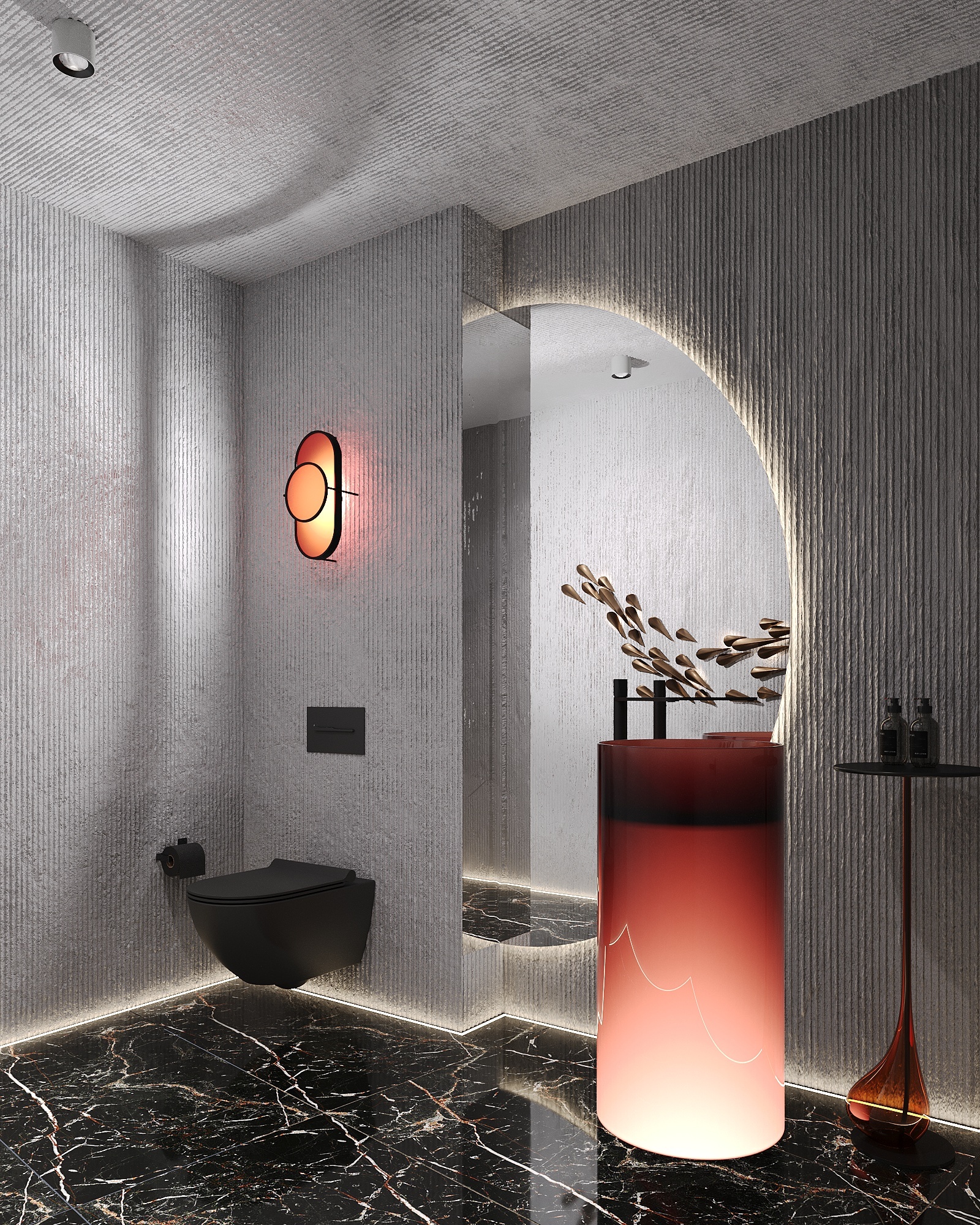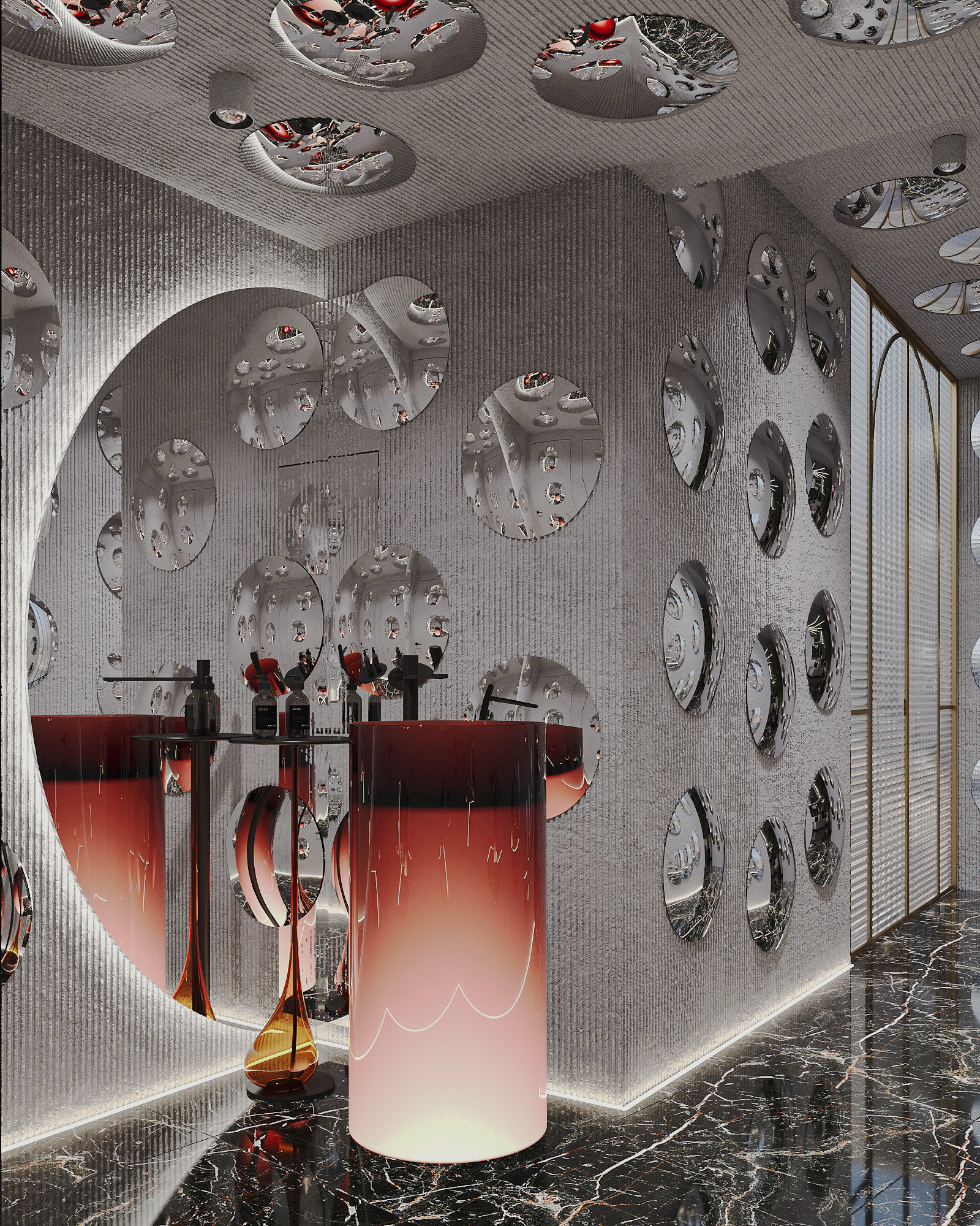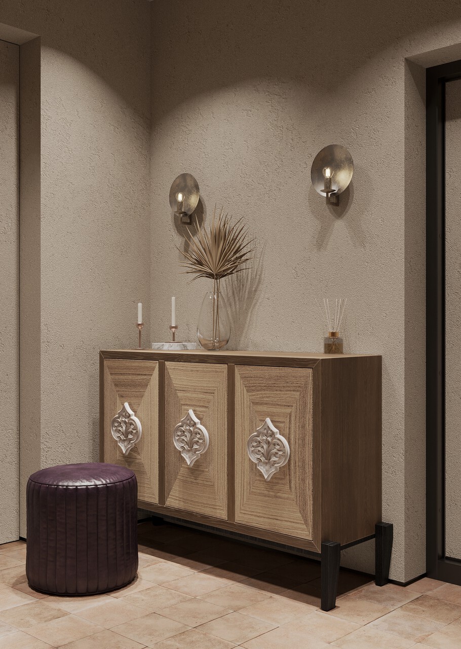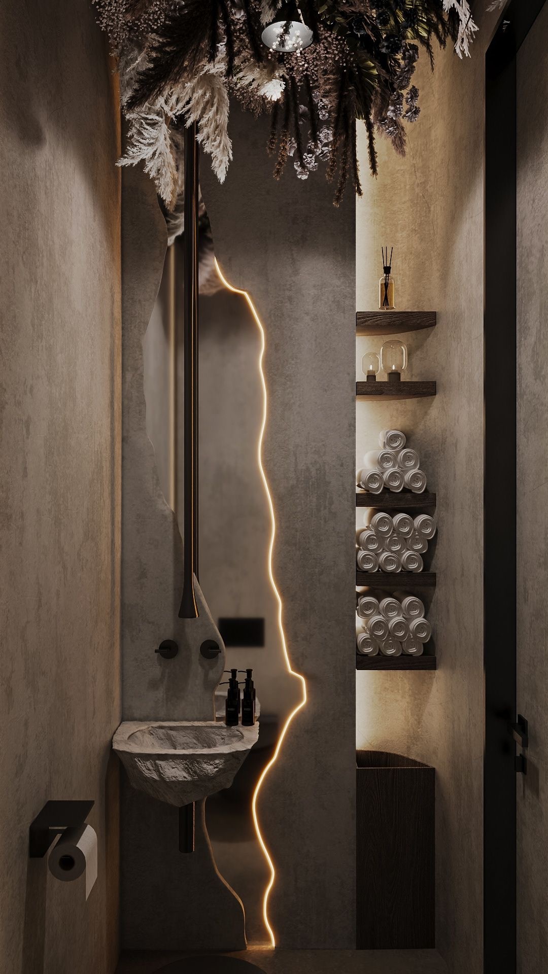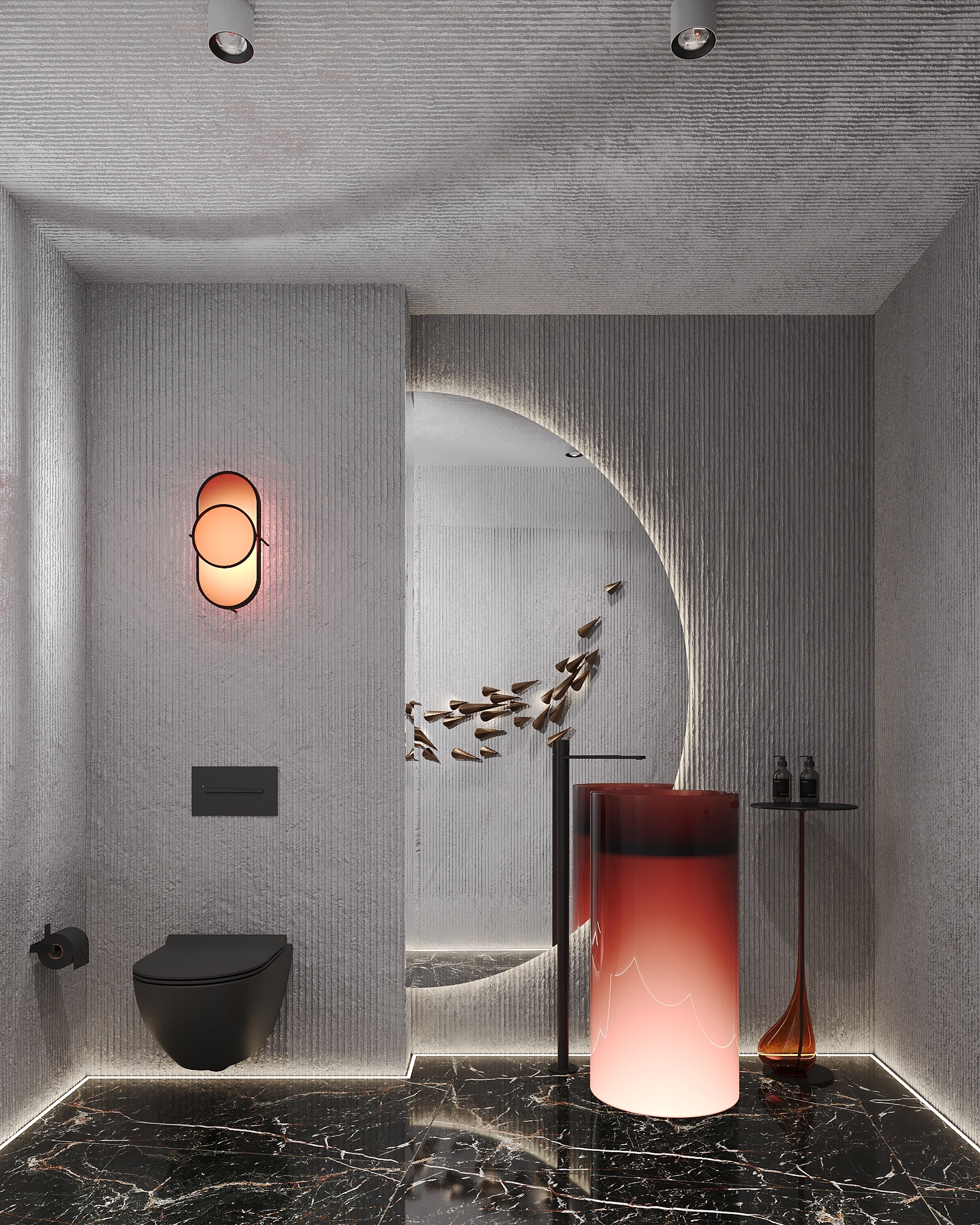 Концепция: Основная концепция проекта заключается в глубоком исследовании бионических форм, которые интегрированы в декор, мебель и интерьер, имитируя естественные изгибы и текстуры пустынных ландшафтов. Каждый предмет мебели и декора разработан по индивидуальному проекту, что обеспечивает абсолютную эксклюзивность и неповторимость интерьера.