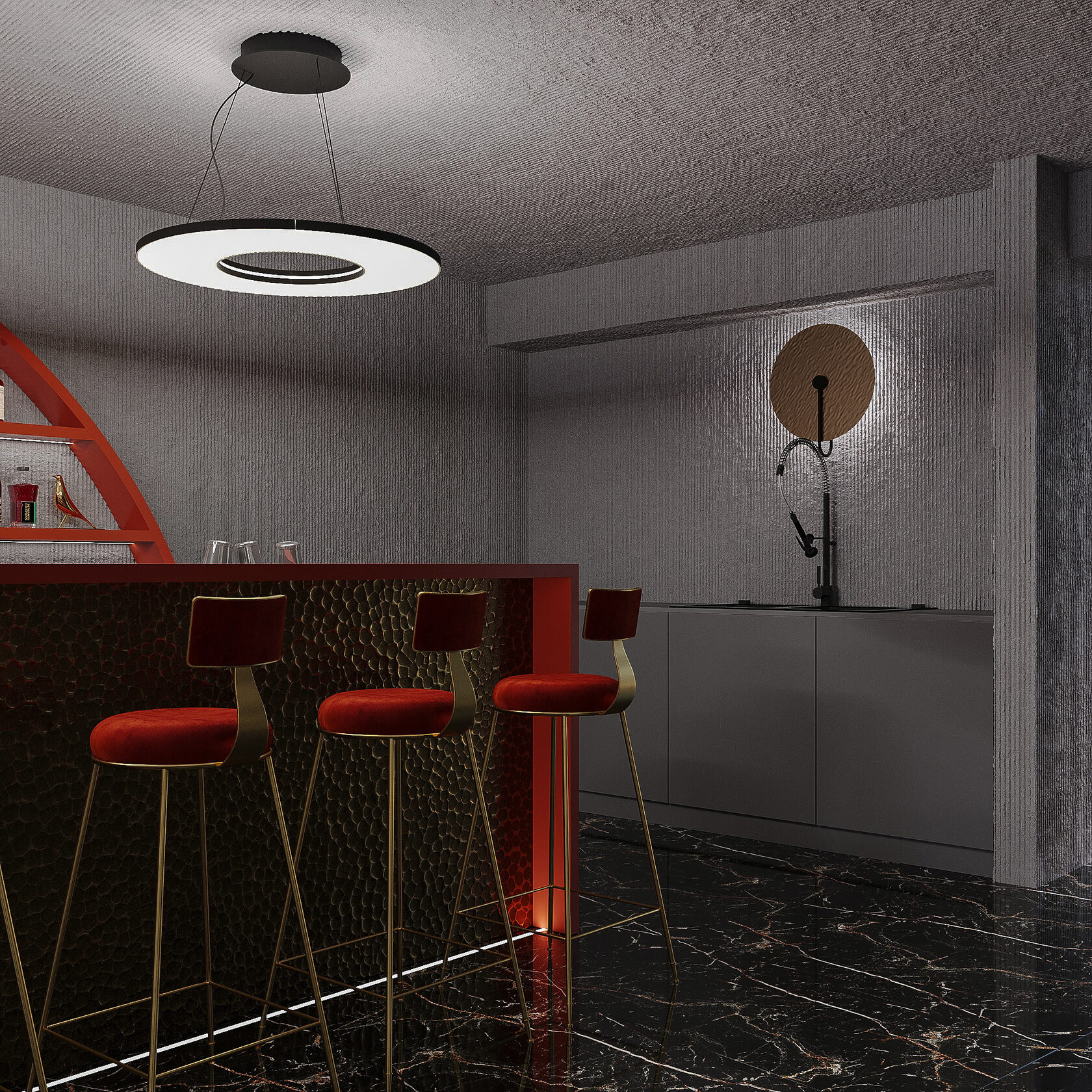 Интерьер дополняется оригинальными светильниками в форме «шишек» и линейной подсветкой, которая акцентирует архитектурные элементы, не перегружая пространство. Все зоны — от барной стойки до обеденного стола — логично связаны между собой и обеспечивают комфортное перемещение гостей.