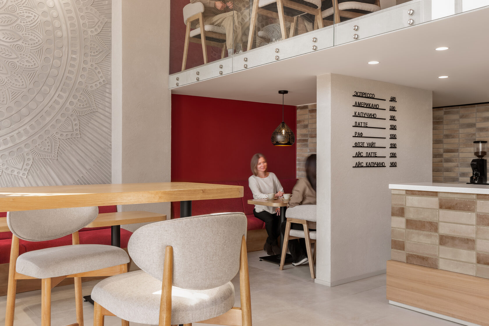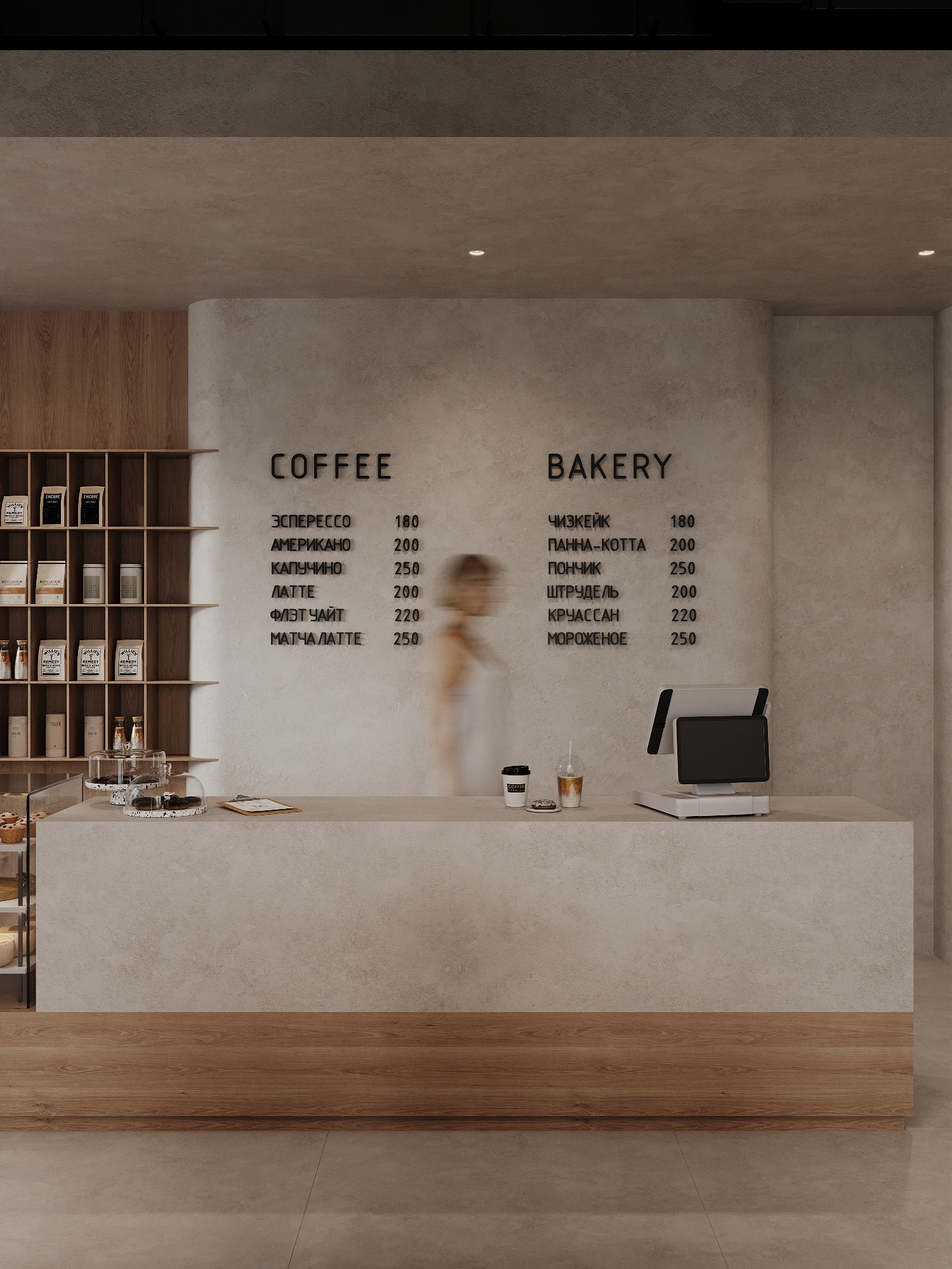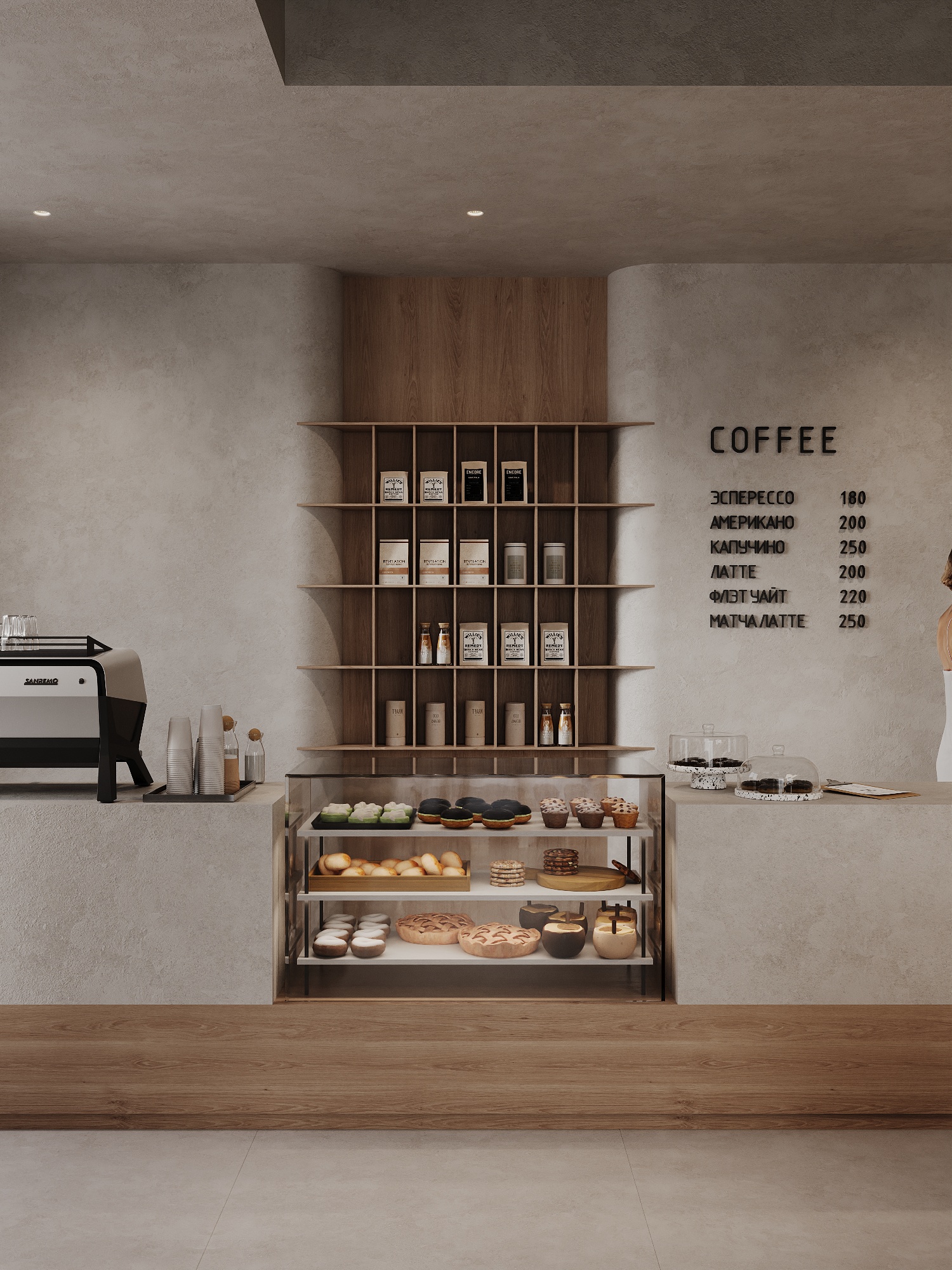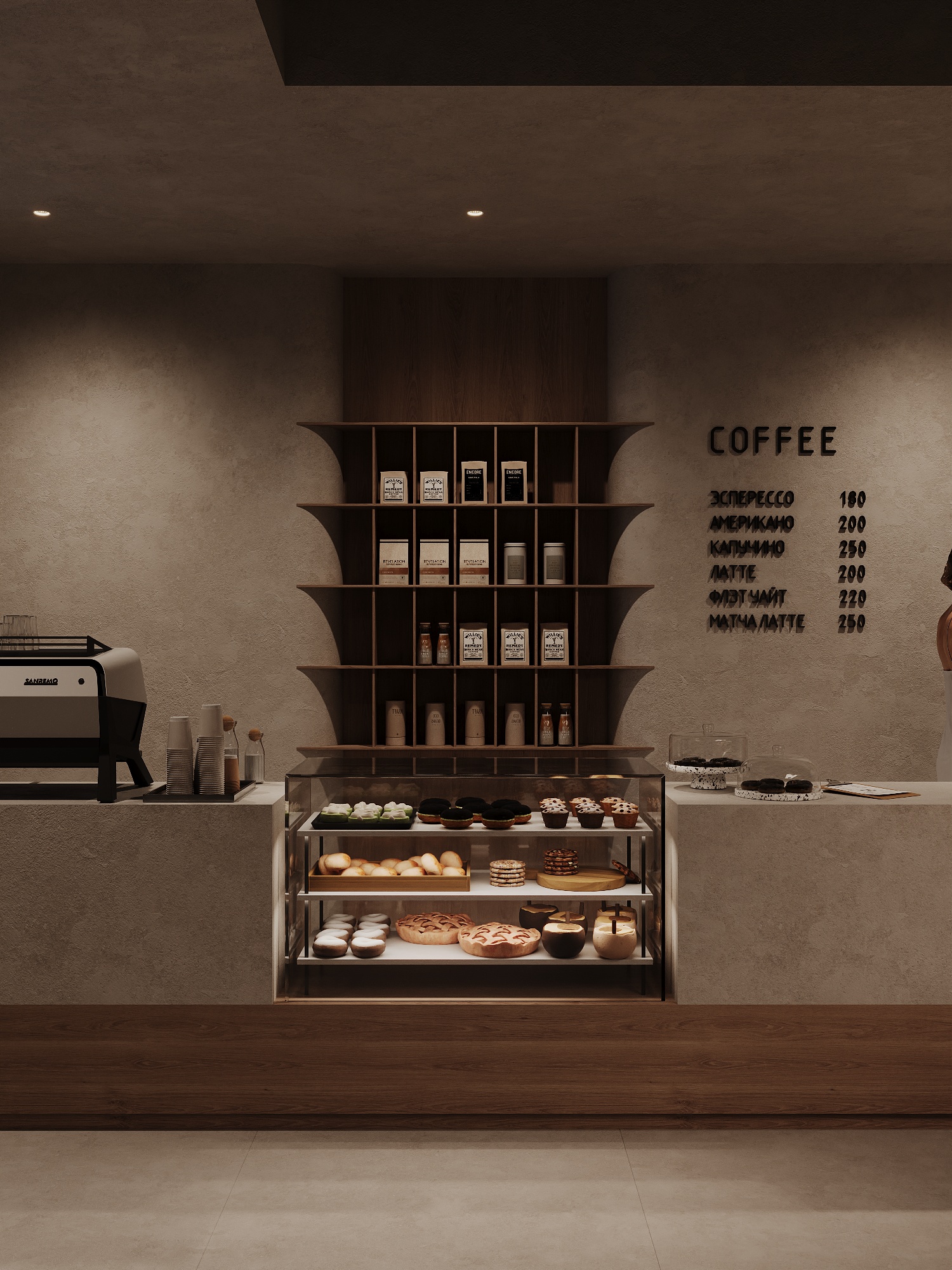 Особое внимание уделено зонированию и эргономике — несмотря на компактность, кофейня воспринимается как уютное, завершённое пространство.