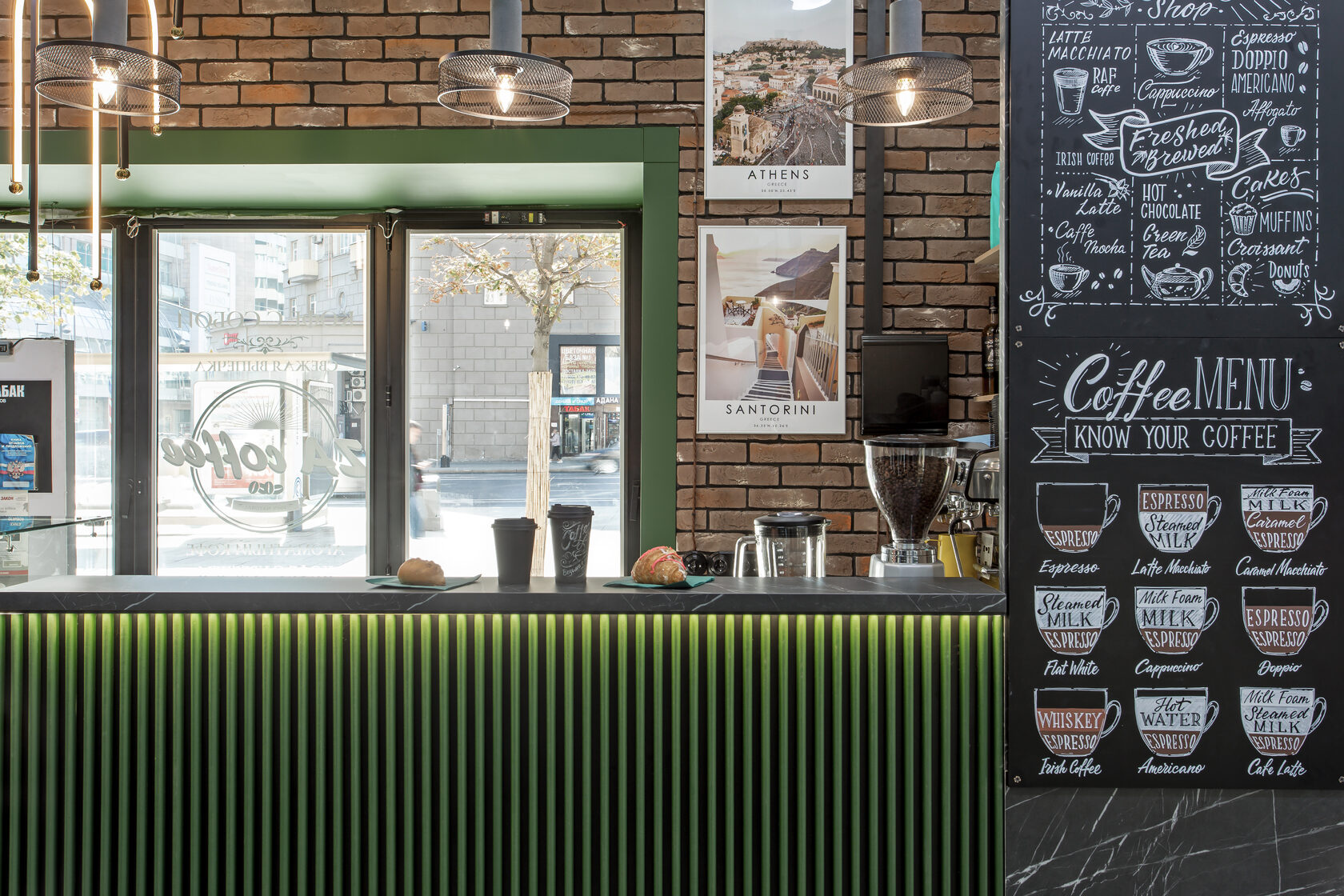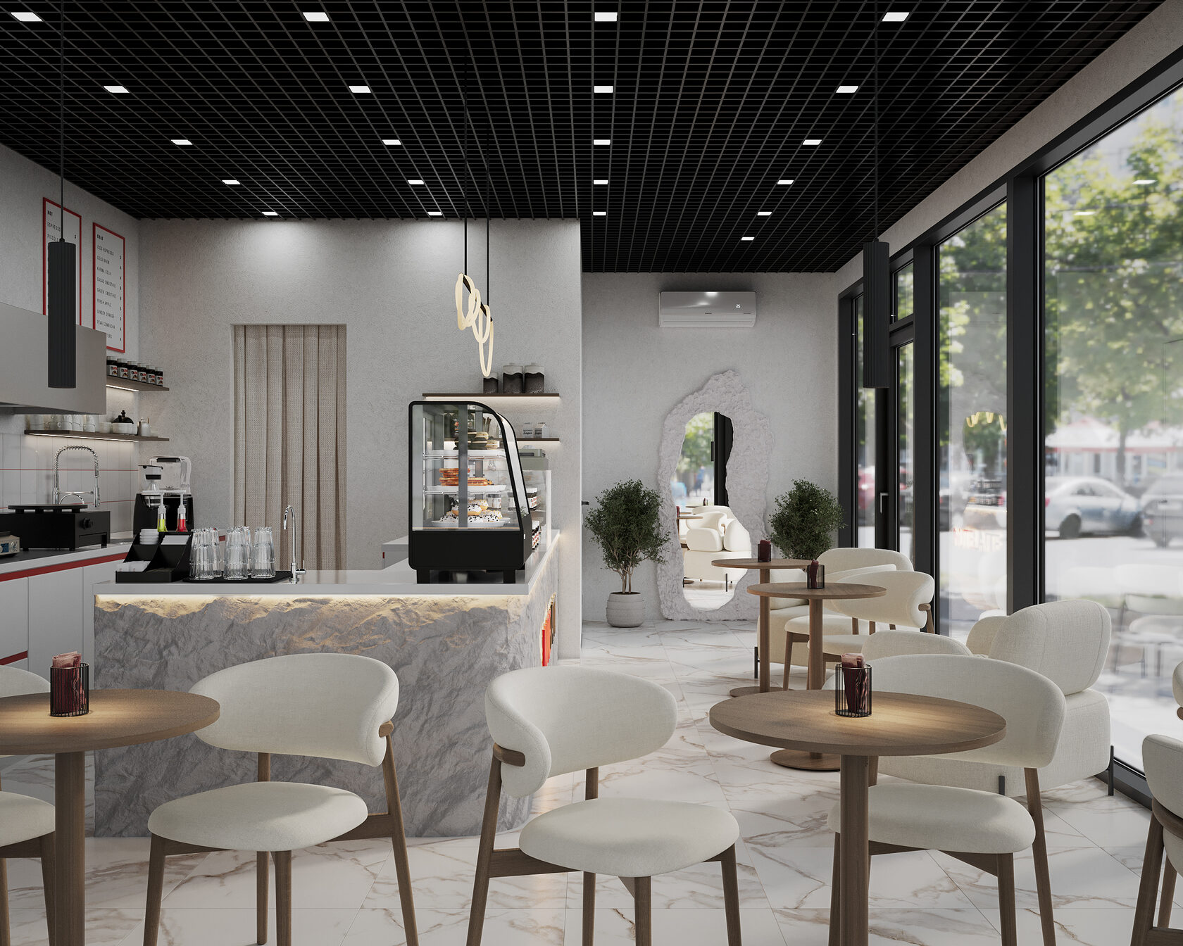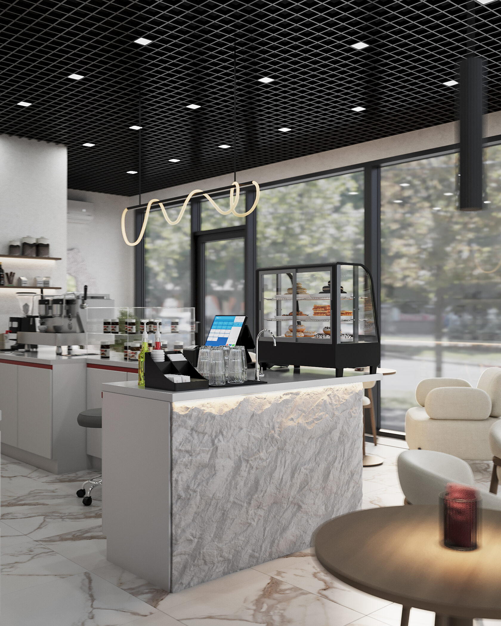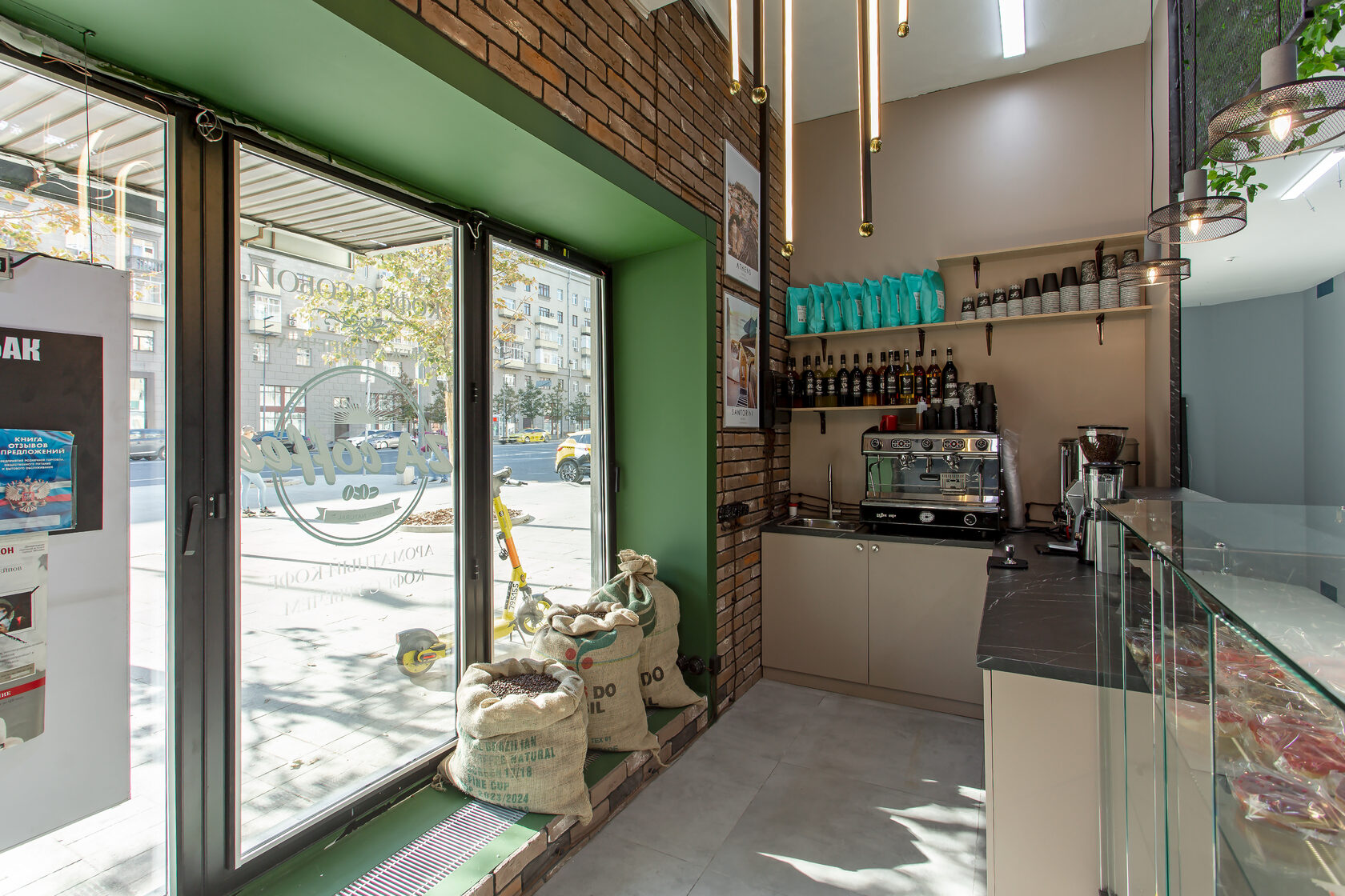 Особое внимание уделено зонированию и эргономике — несмотря на компактность, кофейня воспринимается как уютное, завершённое пространство.