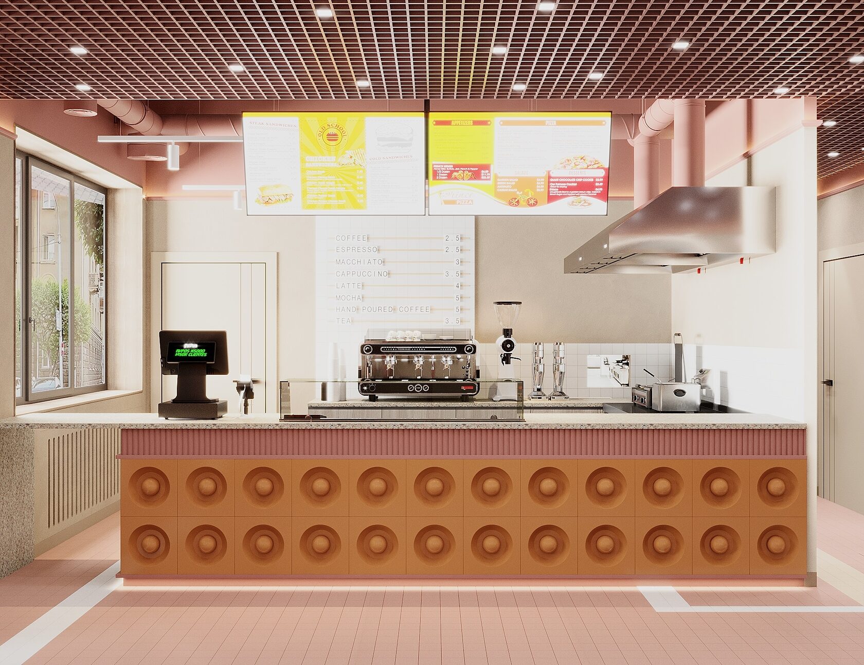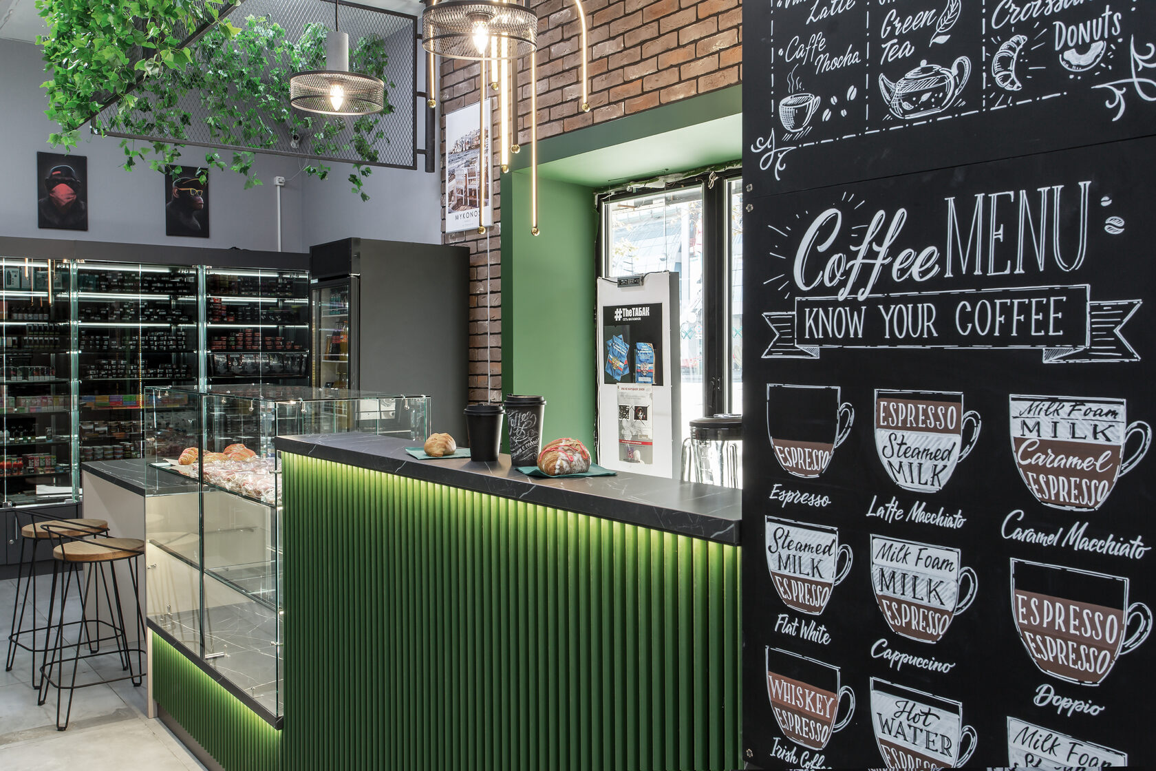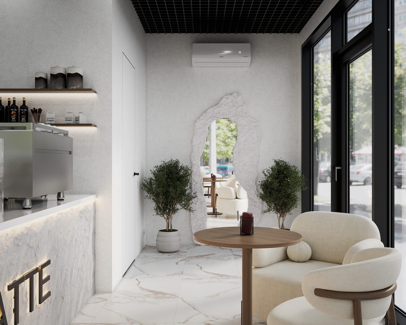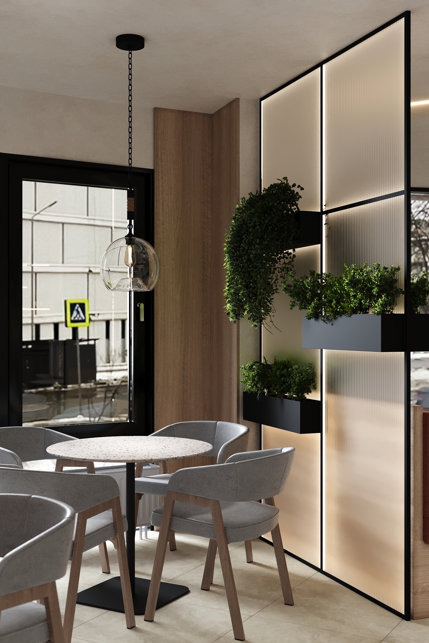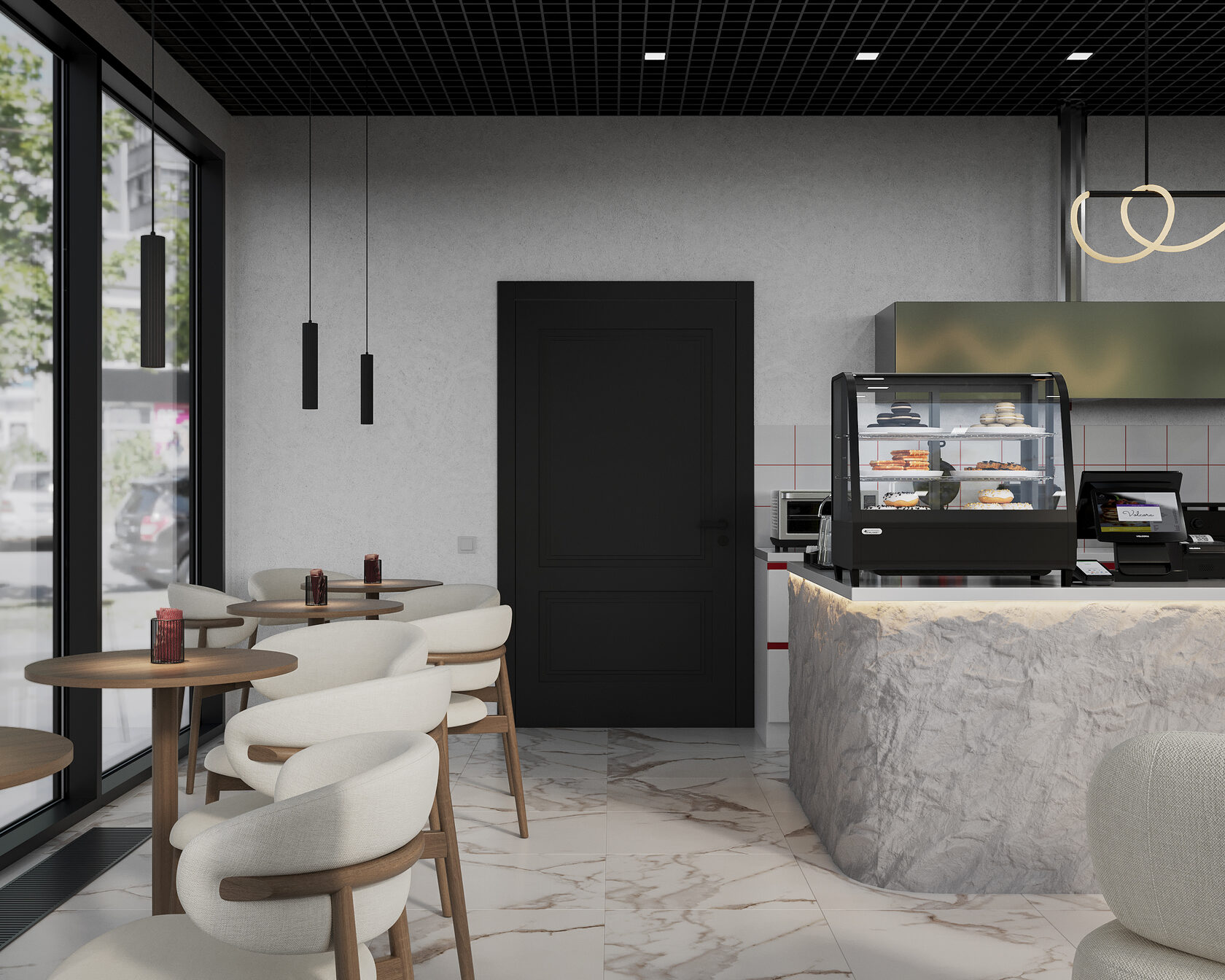 Особое внимание уделено зонированию и эргономике — несмотря на компактность, кофейня воспринимается как уютное, завершённое пространство.