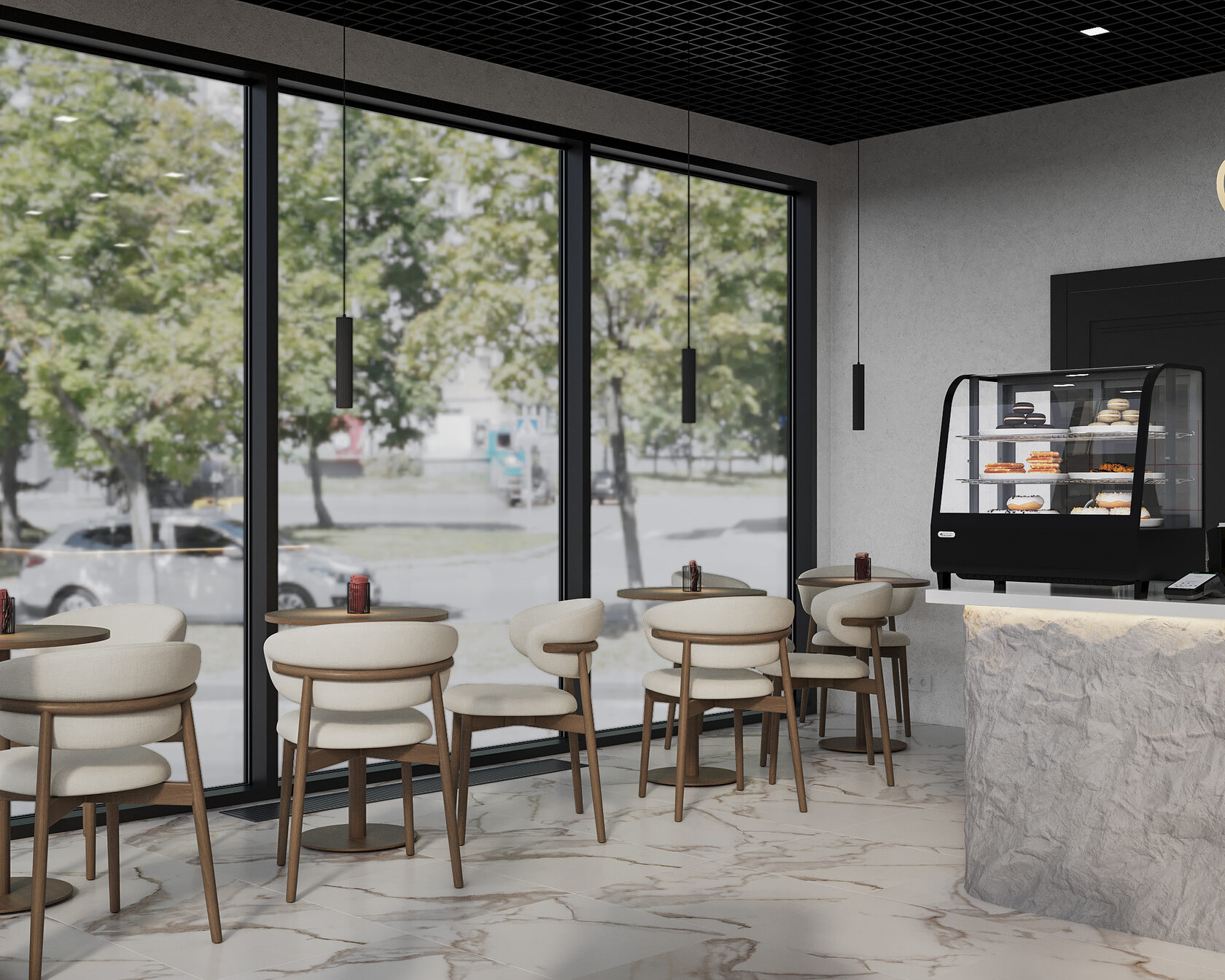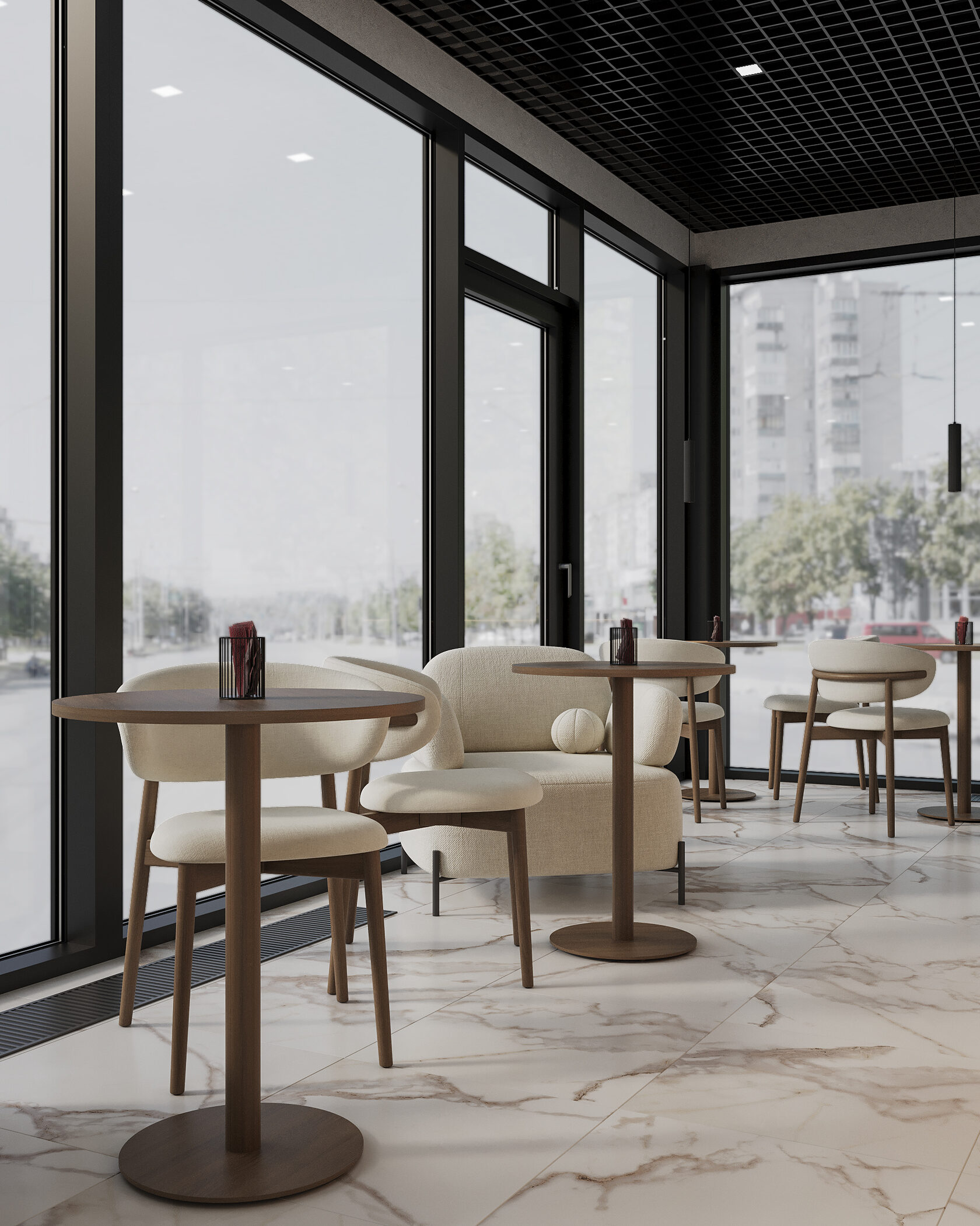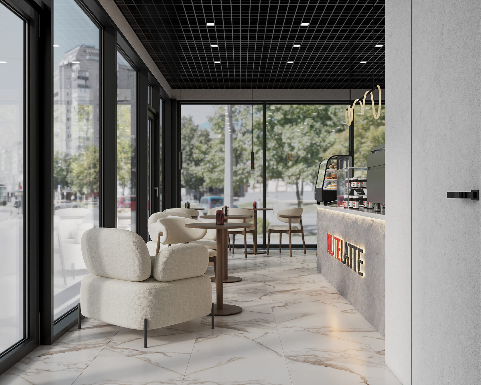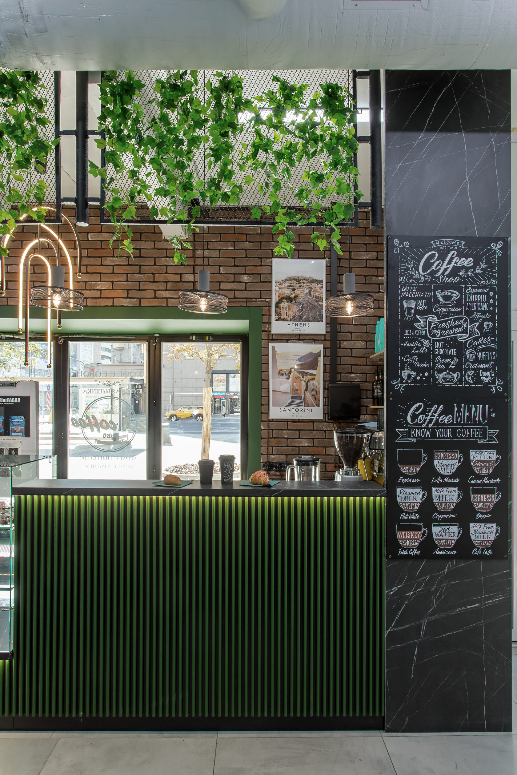 Особое внимание уделено зонированию и эргономике — несмотря на компактность, кофейня воспринимается как уютное, завершённое пространство.