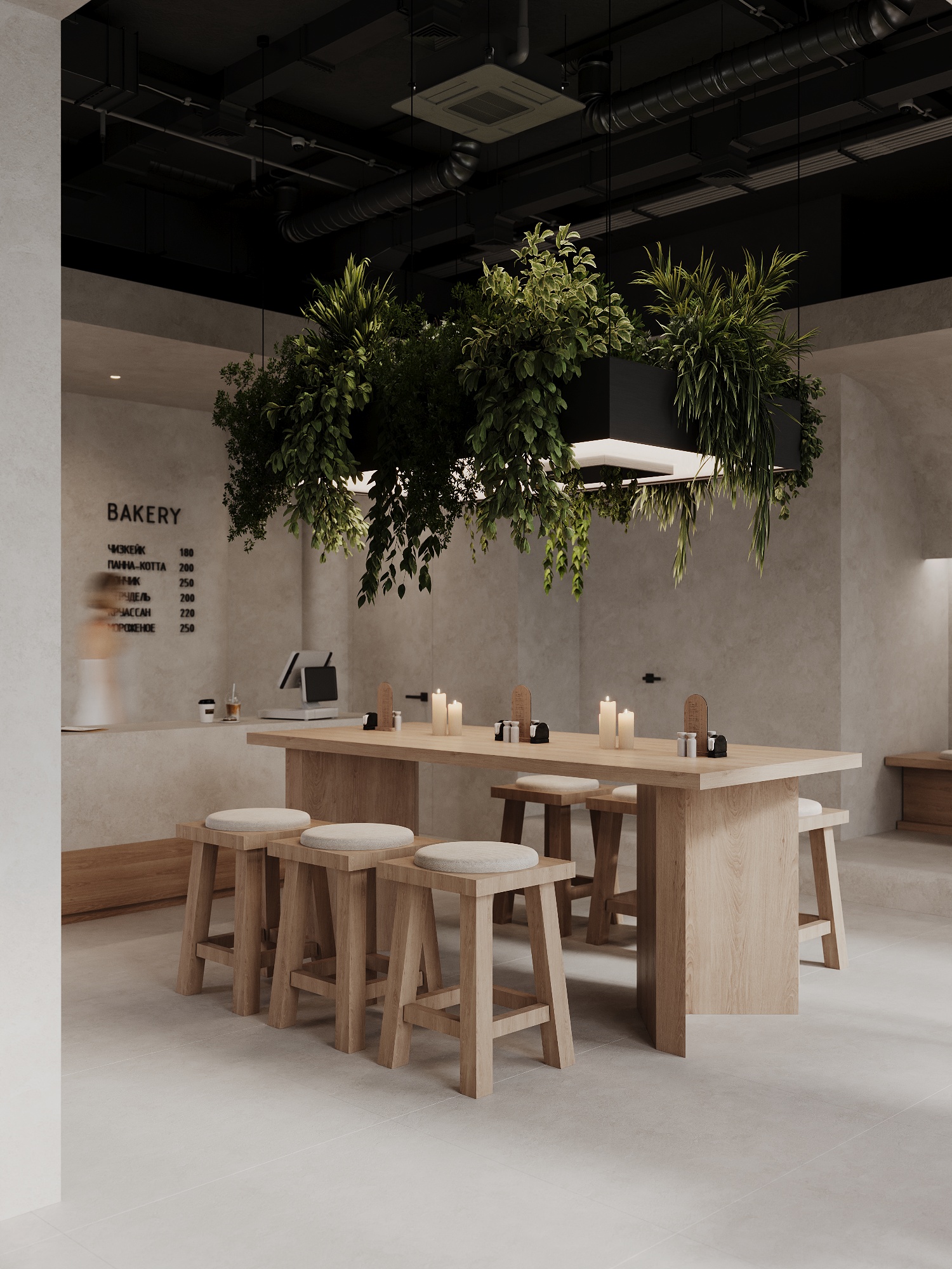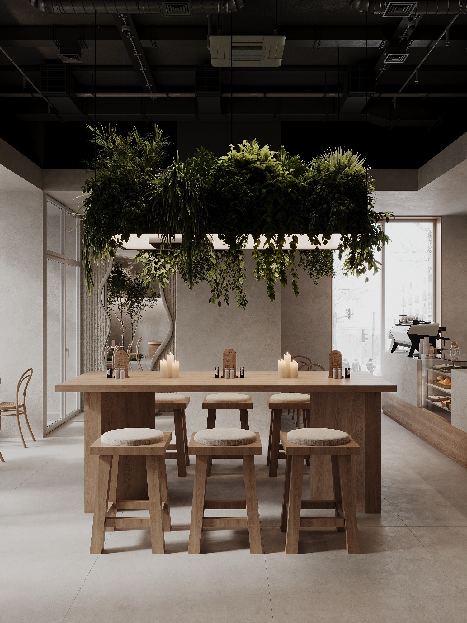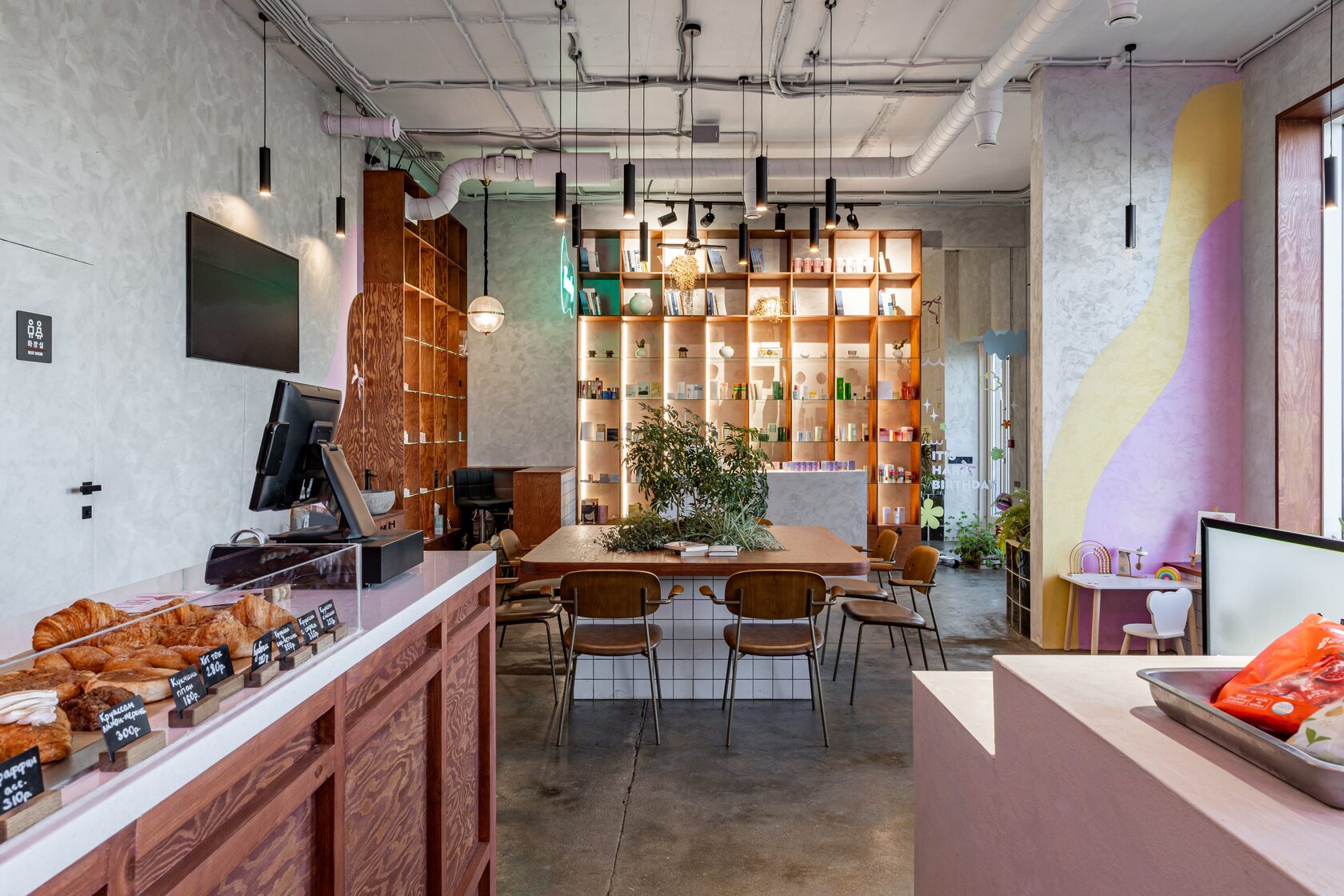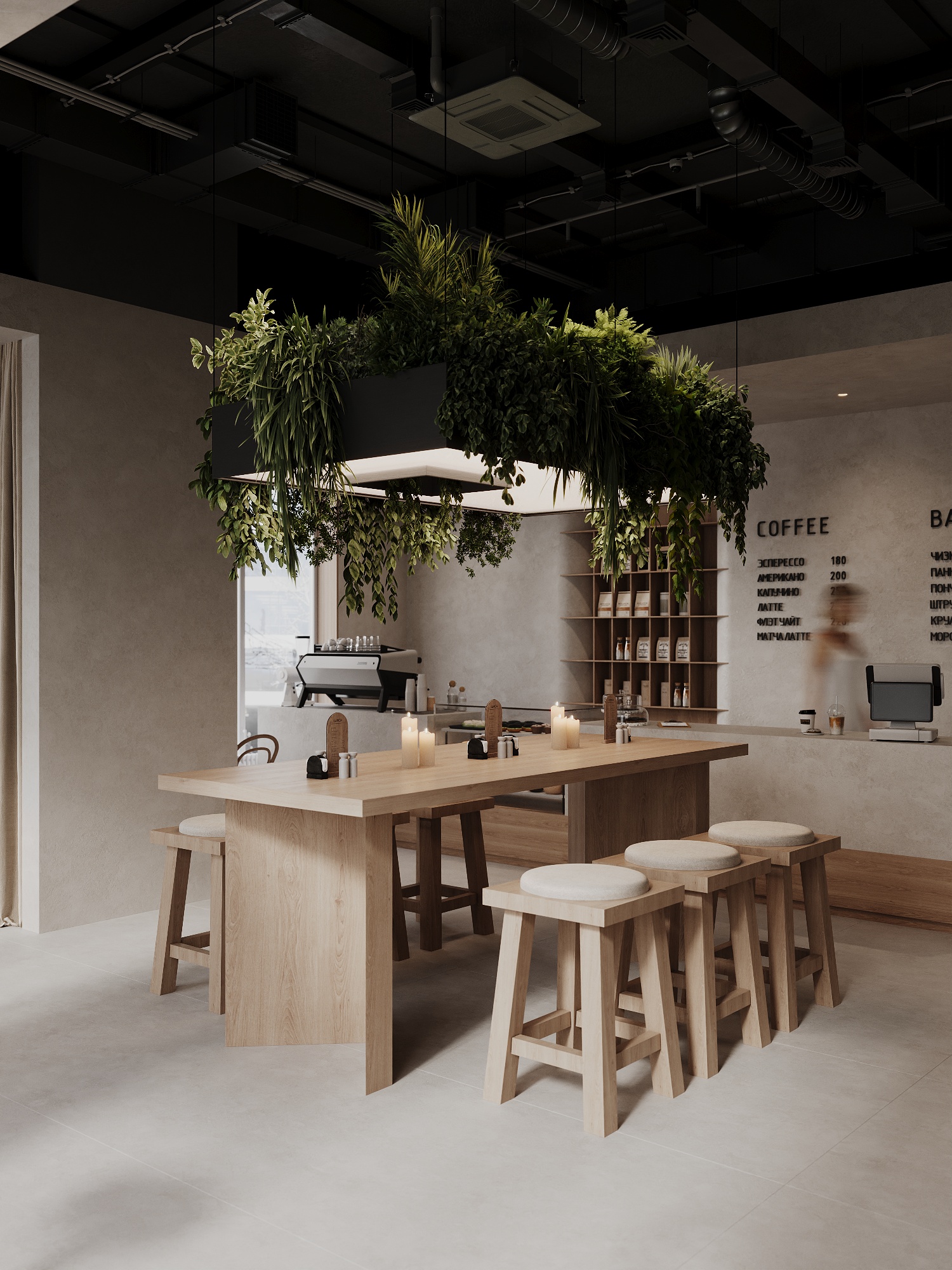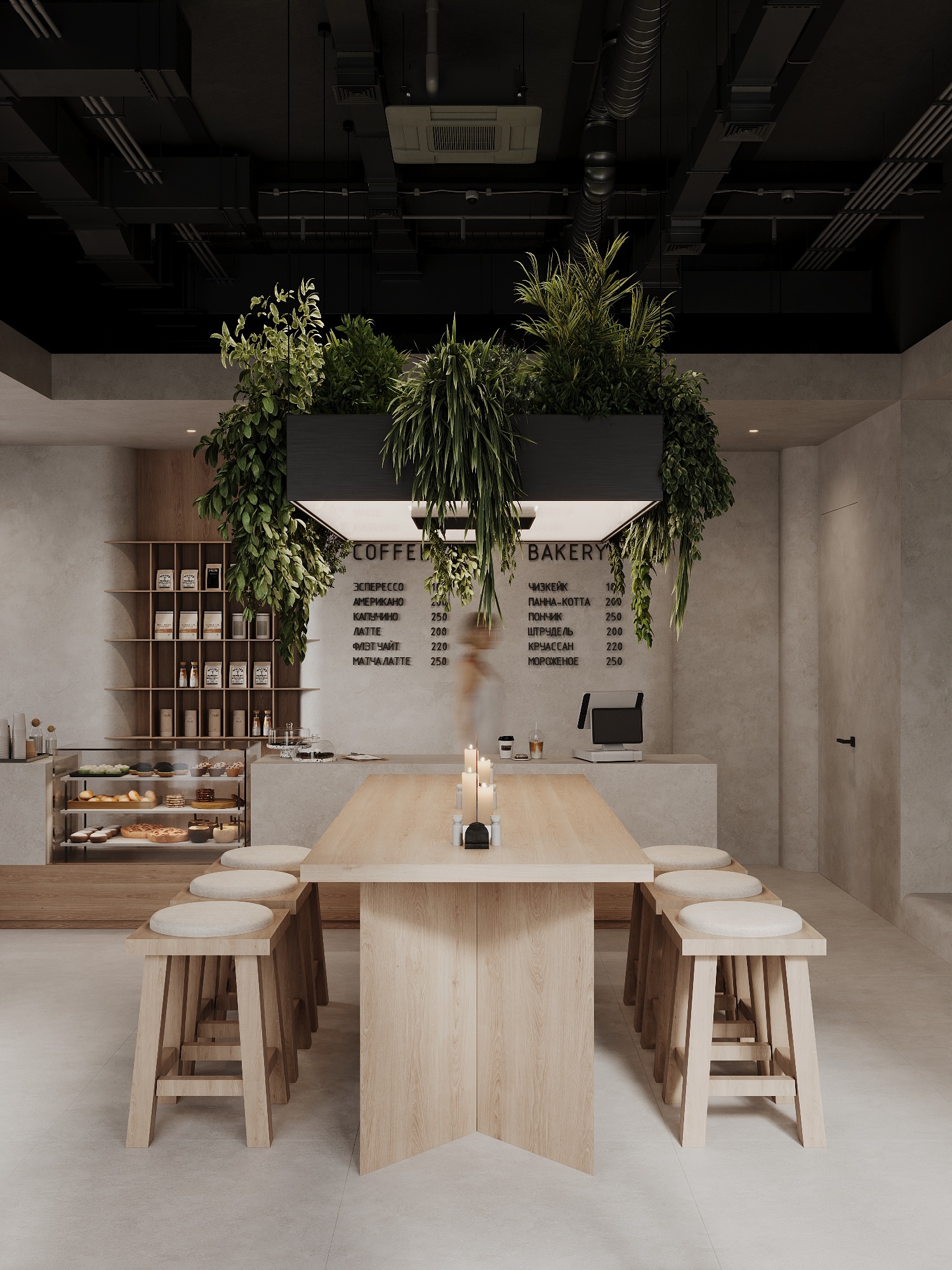 Концепция: Идея проекта строится на соединении человека и природы через архитектуру. Основными материалами стали сосновое дерево с выразительной текстурой, металл с индустриальными акцентами и стекло, пропускающее максимум естественного света. Каждый элемент интерьера несёт отпечаток индивидуального подхода: массивные столешницы с бетонными вставками, скамьи и вешалки ручной работы, витрины с терраццо — всё продумано до мелочей.