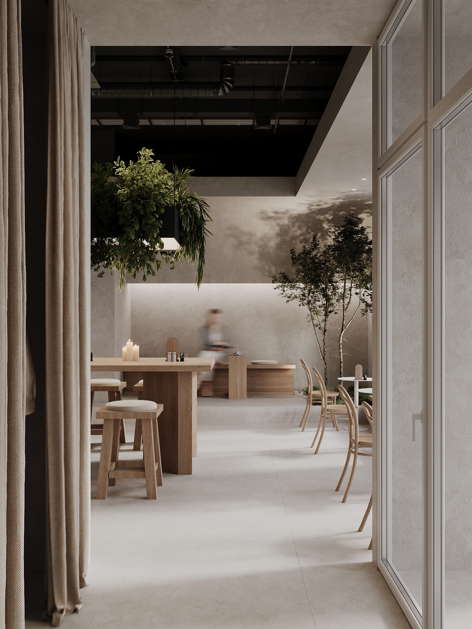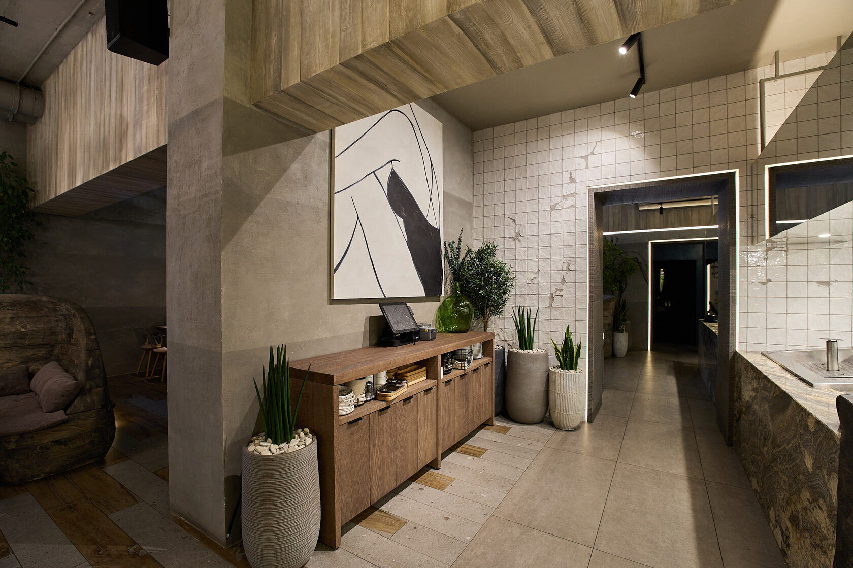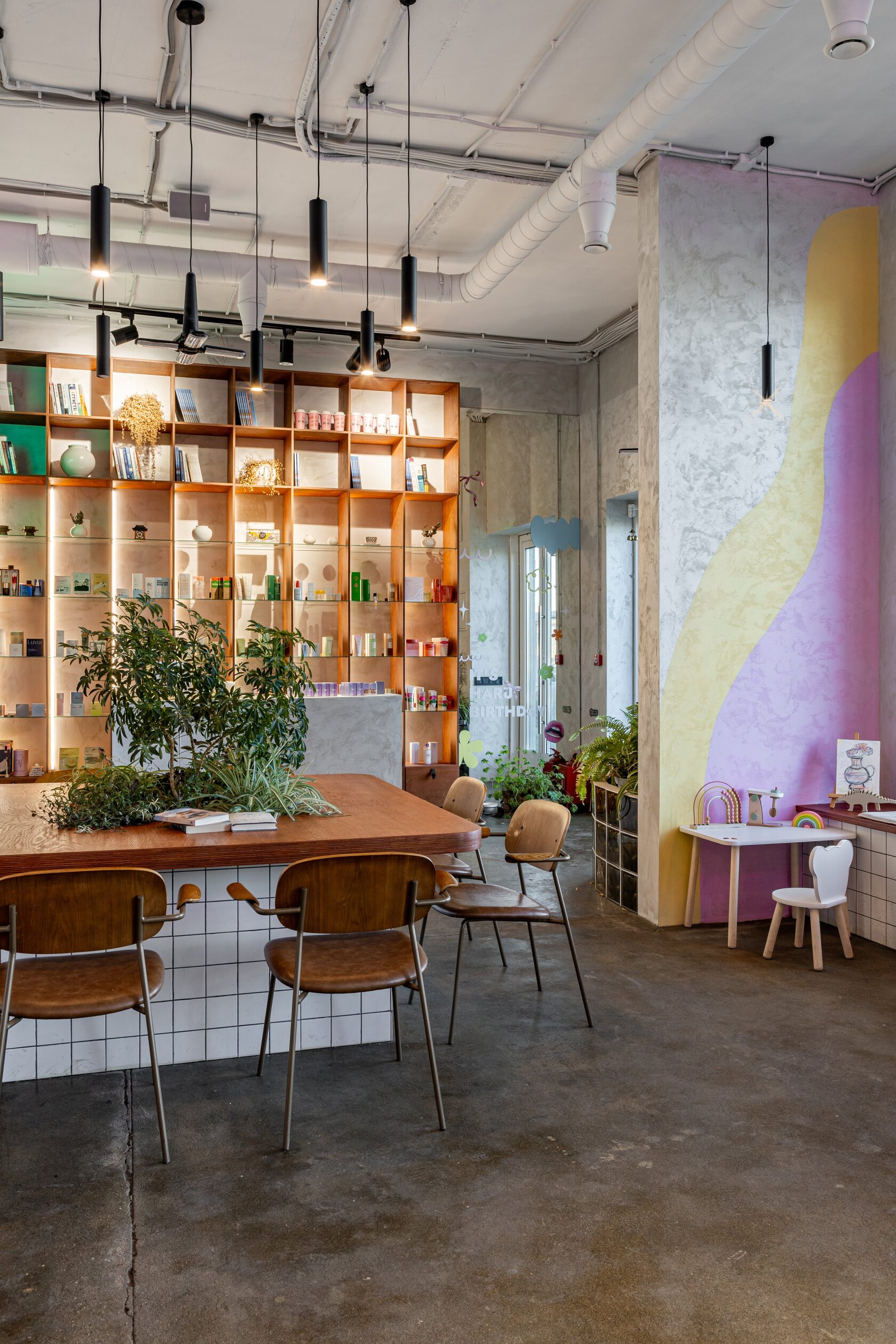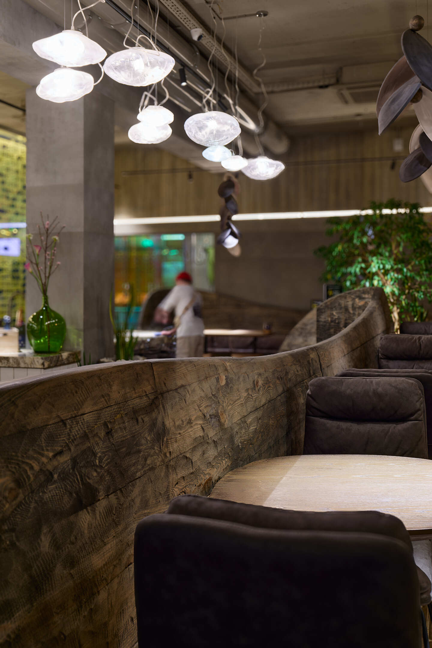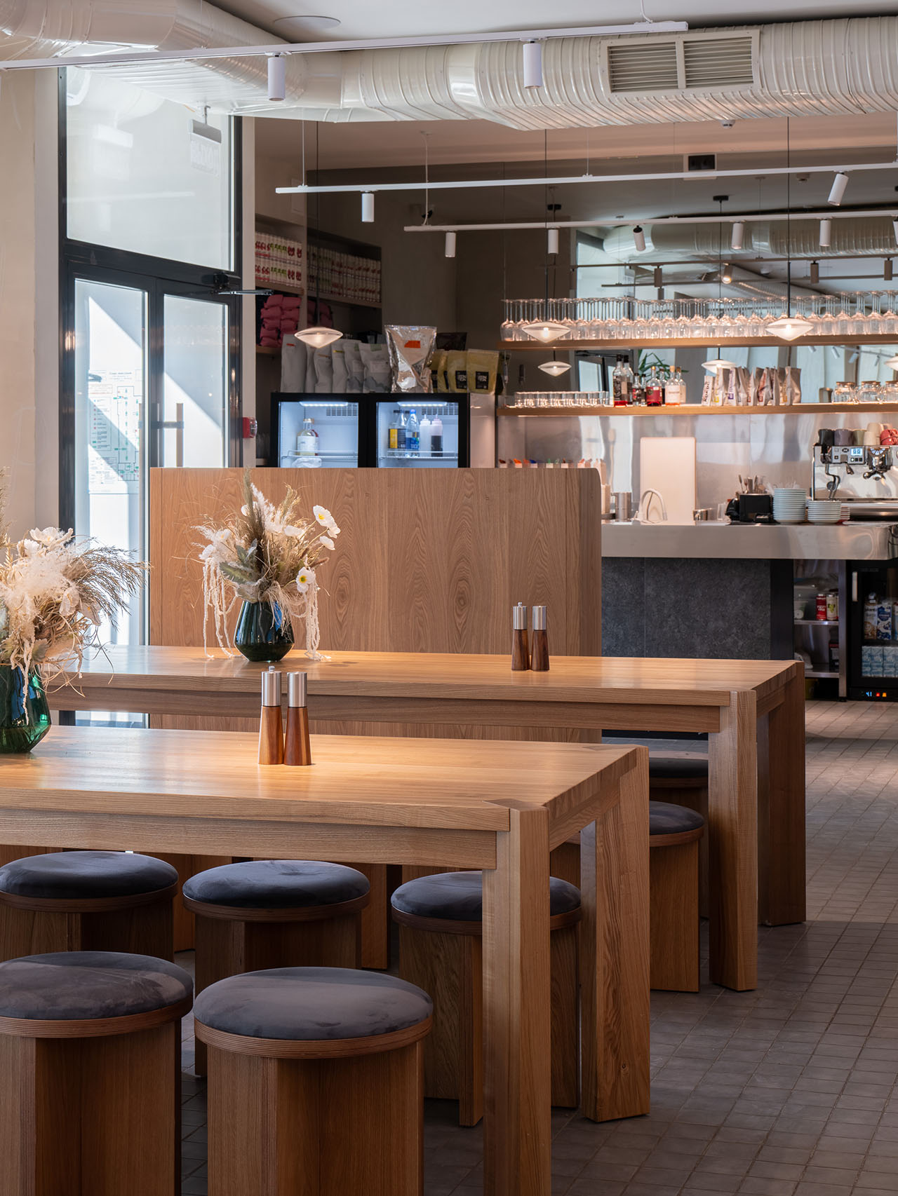 Концепция: Идея проекта строится на соединении человека и природы через архитектуру. Основными материалами стали сосновое дерево с выразительной текстурой, металл с индустриальными акцентами и стекло, пропускающее максимум естественного света. Каждый элемент интерьера несёт отпечаток индивидуального подхода: массивные столешницы с бетонными вставками, скамьи и вешалки ручной работы, витрины с терраццо — всё продумано до мелочей.