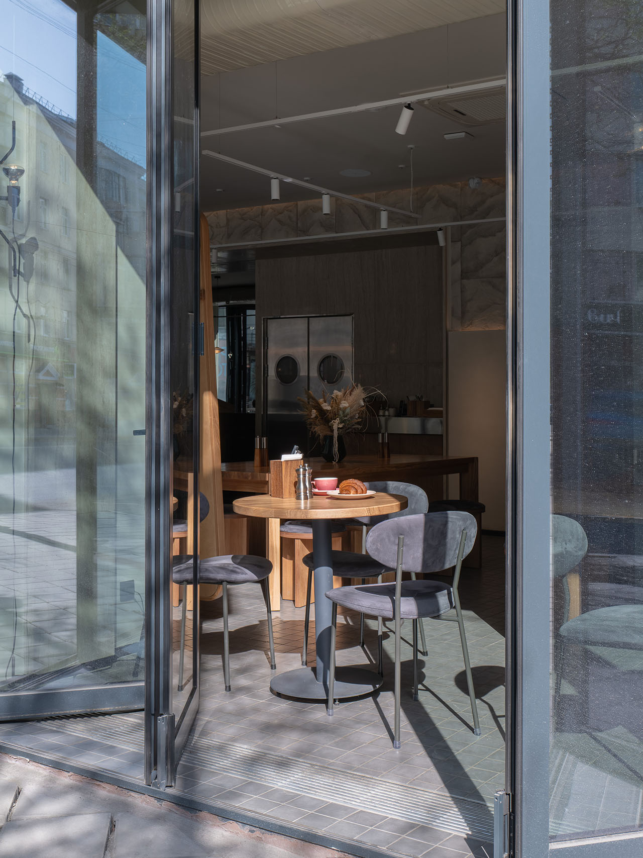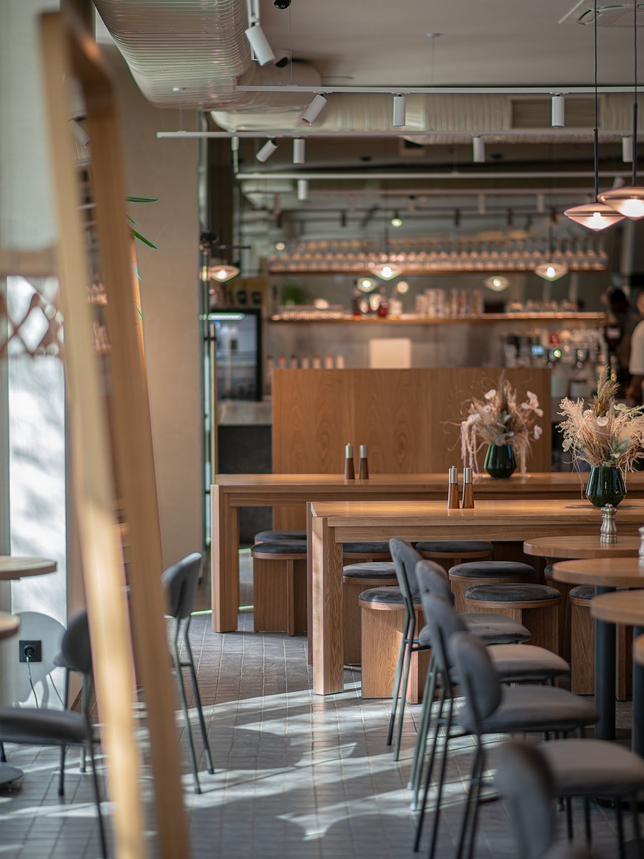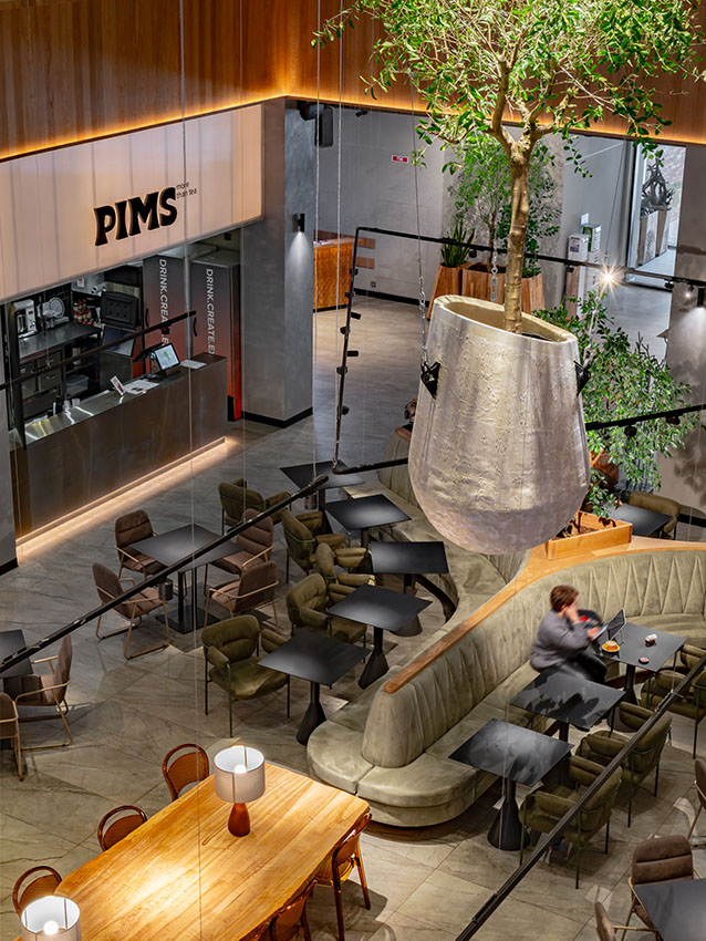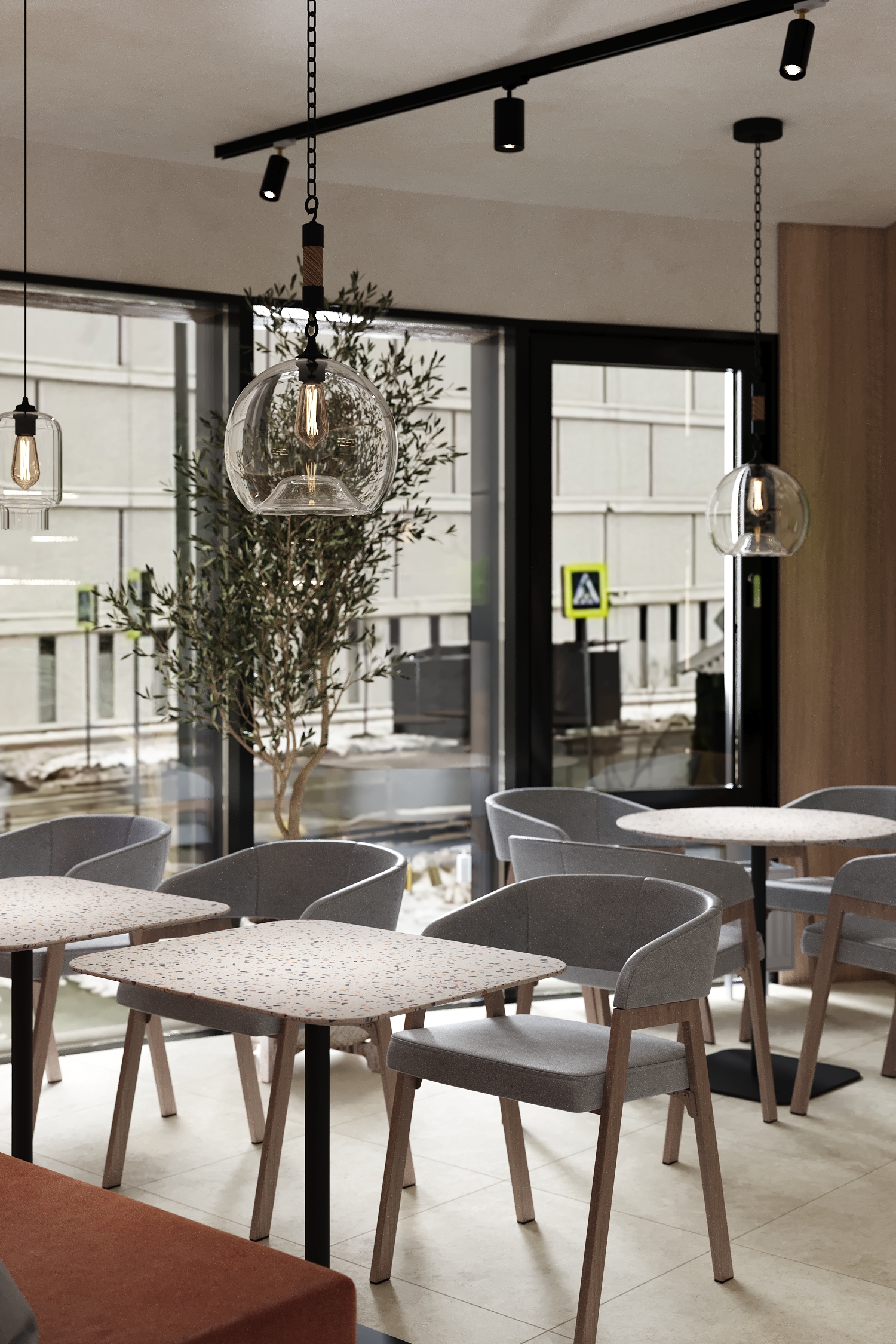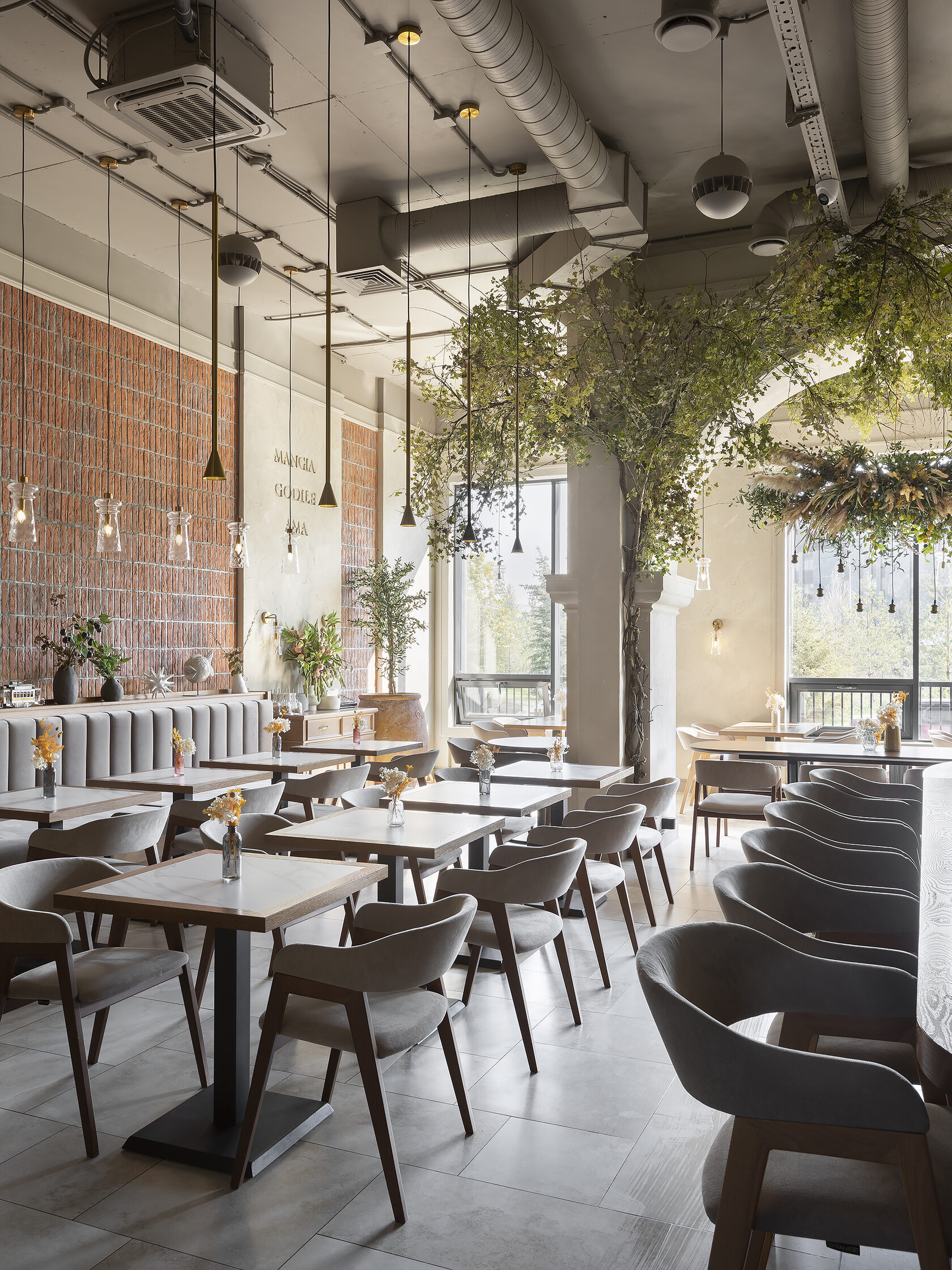 Концепция: Идея проекта строится на соединении человека и природы через архитектуру. Основными материалами стали сосновое дерево с выразительной текстурой, металл с индустриальными акцентами и стекло, пропускающее максимум естественного света. Каждый элемент интерьера несёт отпечаток индивидуального подхода: массивные столешницы с бетонными вставками, скамьи и вешалки ручной работы, витрины с терраццо — всё продумано до мелочей.