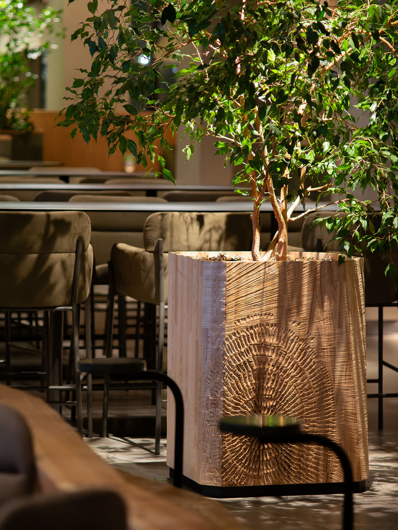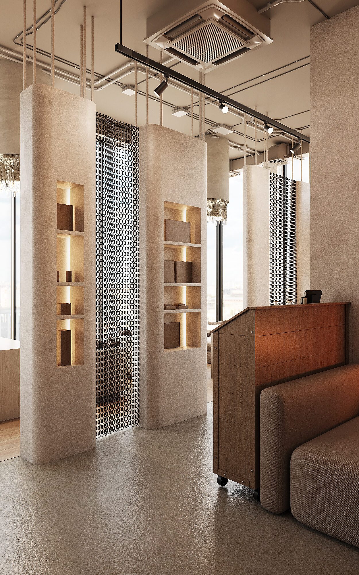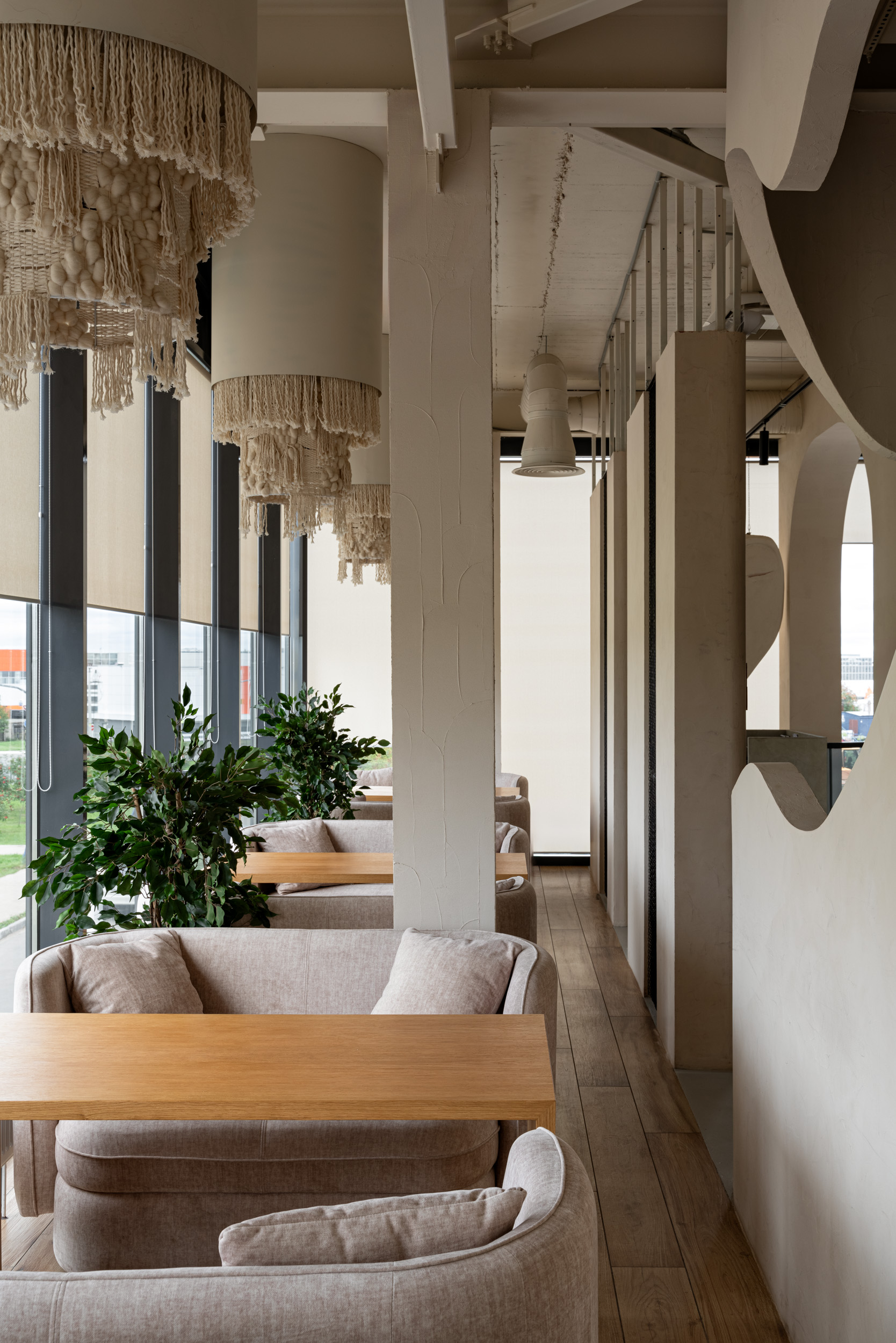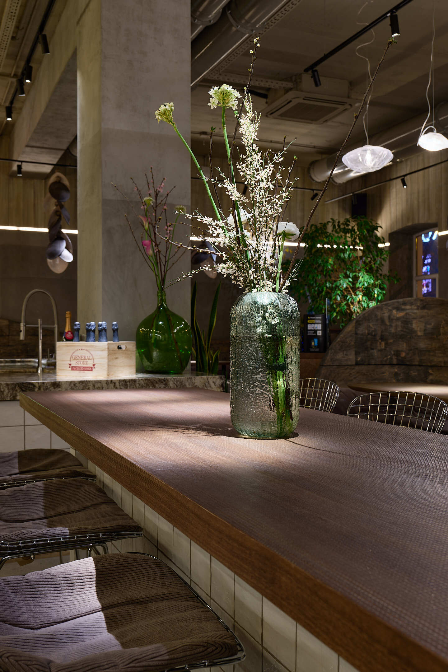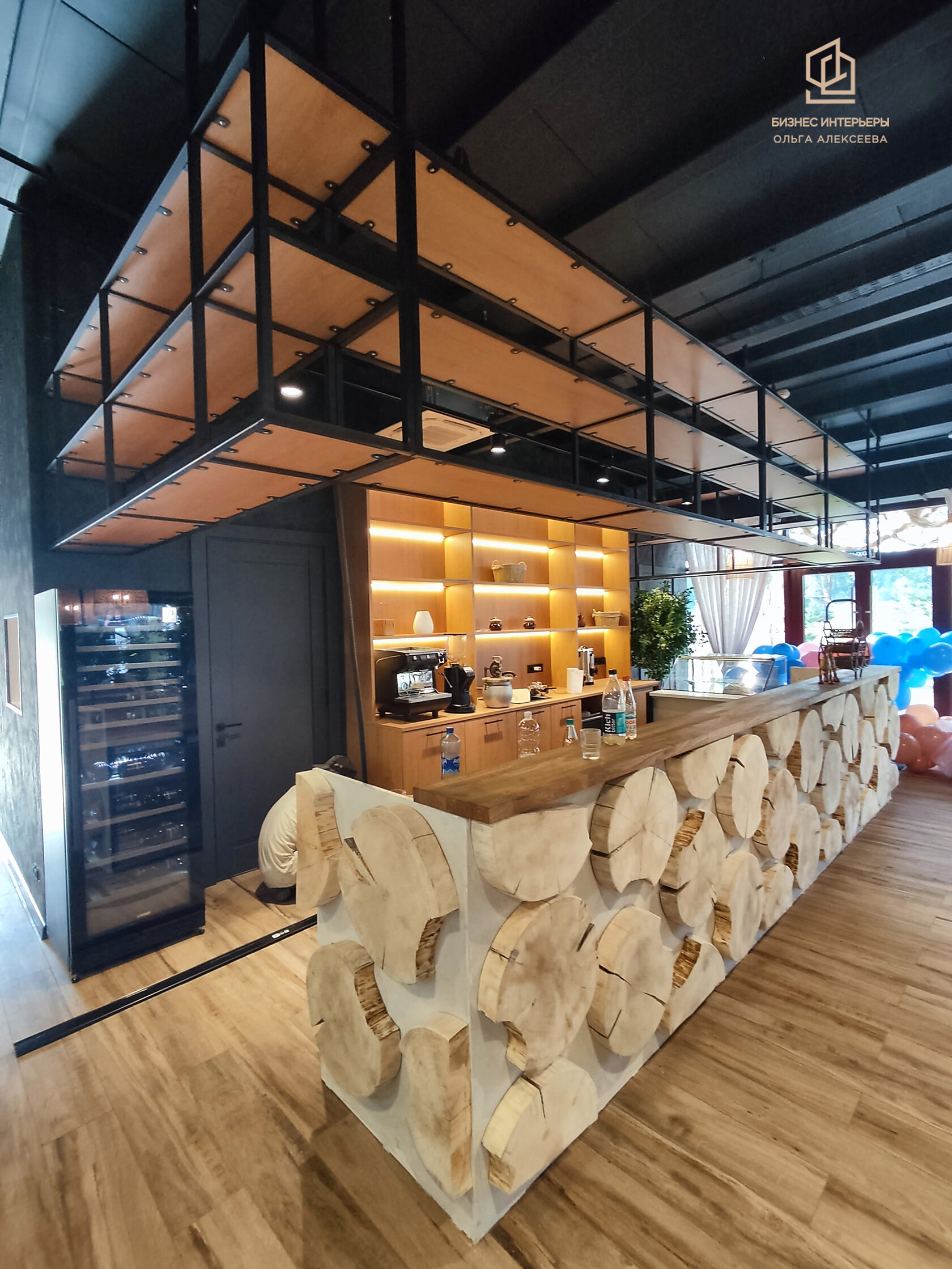 Концепция: Идея проекта строится на соединении человека и природы через архитектуру. Основными материалами стали сосновое дерево с выразительной текстурой, металл с индустриальными акцентами и стекло, пропускающее максимум естественного света. Каждый элемент интерьера несёт отпечаток индивидуального подхода: массивные столешницы с бетонными вставками, скамьи и вешалки ручной работы, витрины с терраццо — всё продумано до мелочей.