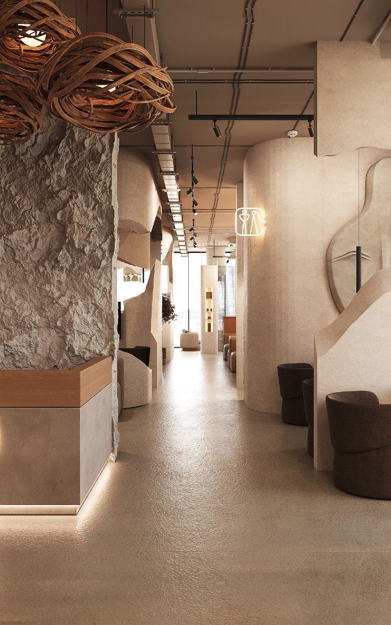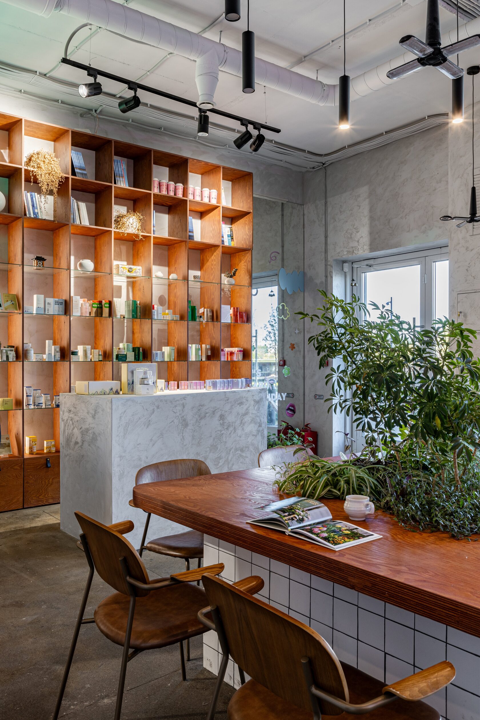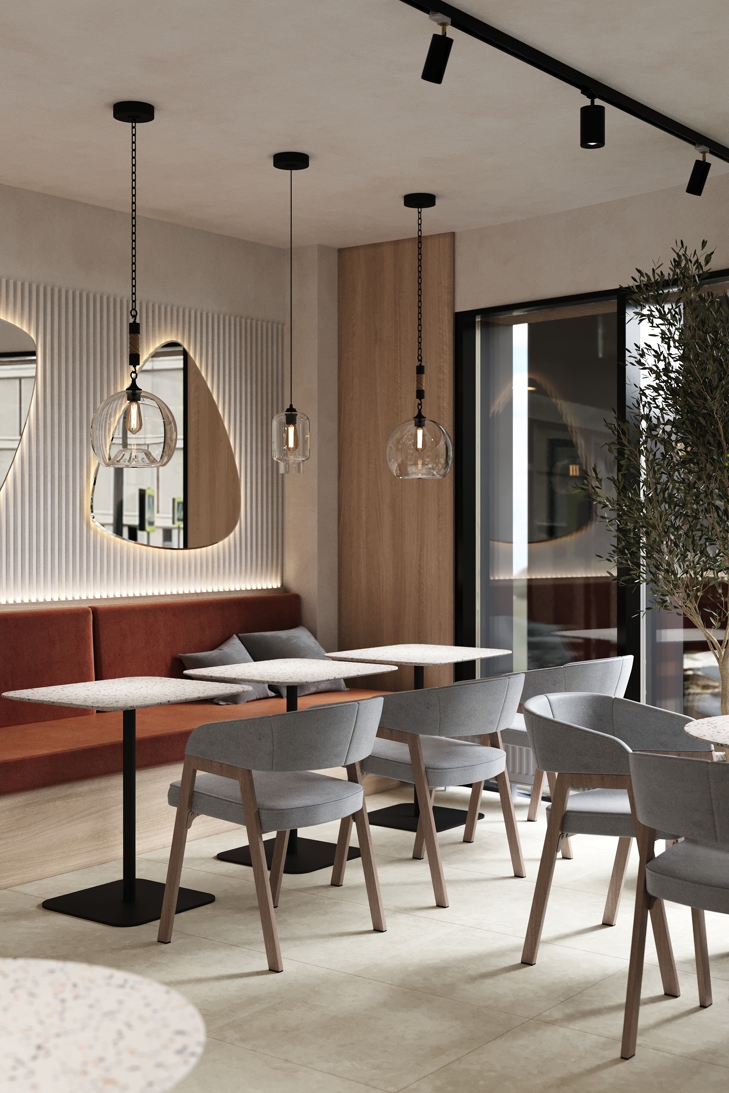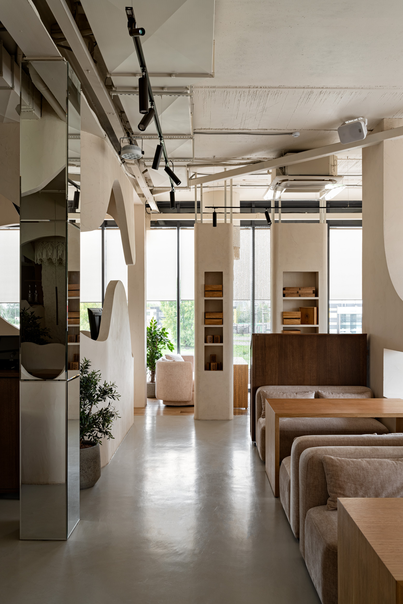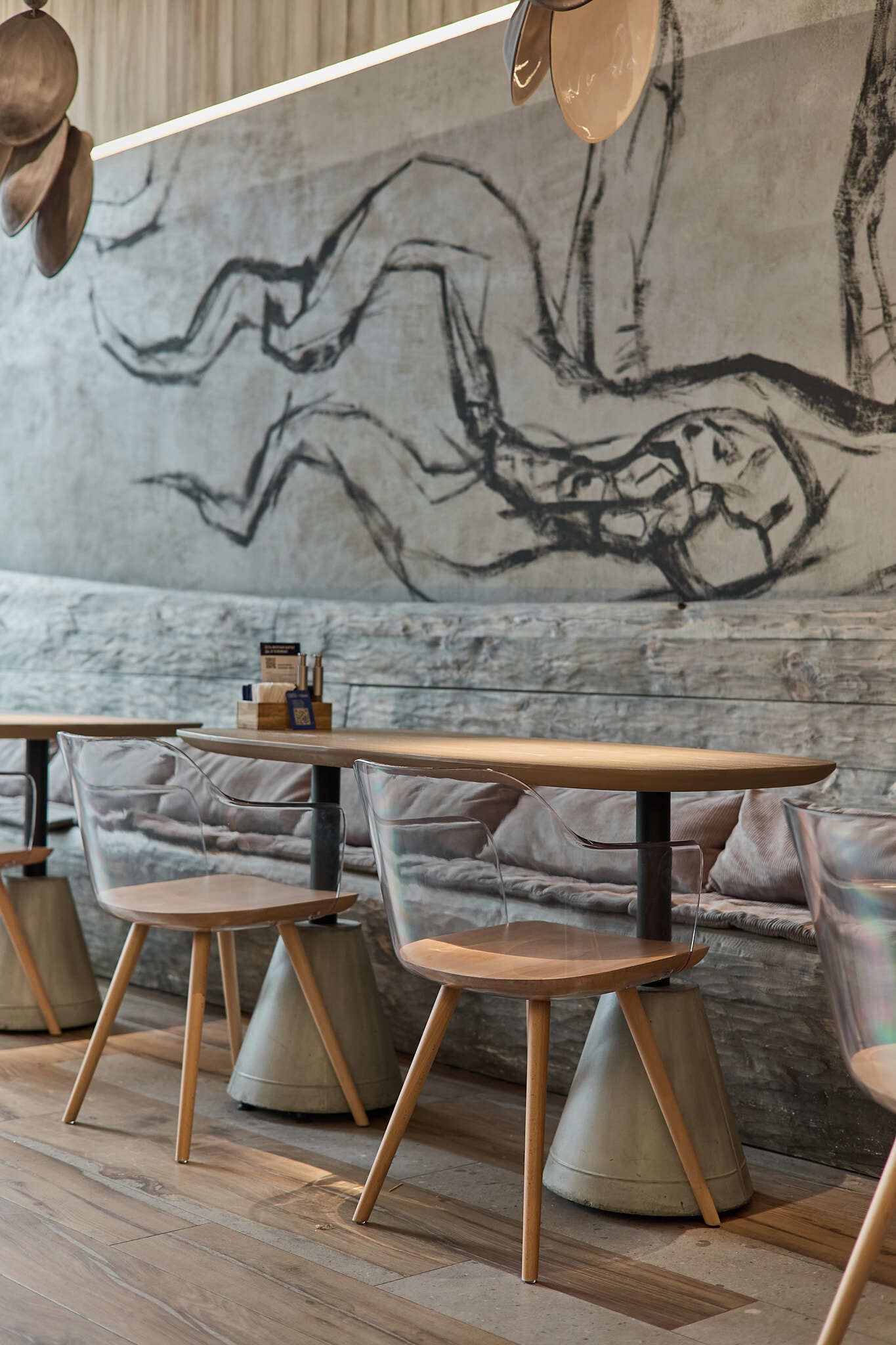 Концепция: Идея проекта строится на соединении человека и природы через архитектуру. Основными материалами стали сосновое дерево с выразительной текстурой, металл с индустриальными акцентами и стекло, пропускающее максимум естественного света. Каждый элемент интерьера несёт отпечаток индивидуального подхода: массивные столешницы с бетонными вставками, скамьи и вешалки ручной работы, витрины с терраццо — всё продумано до мелочей.