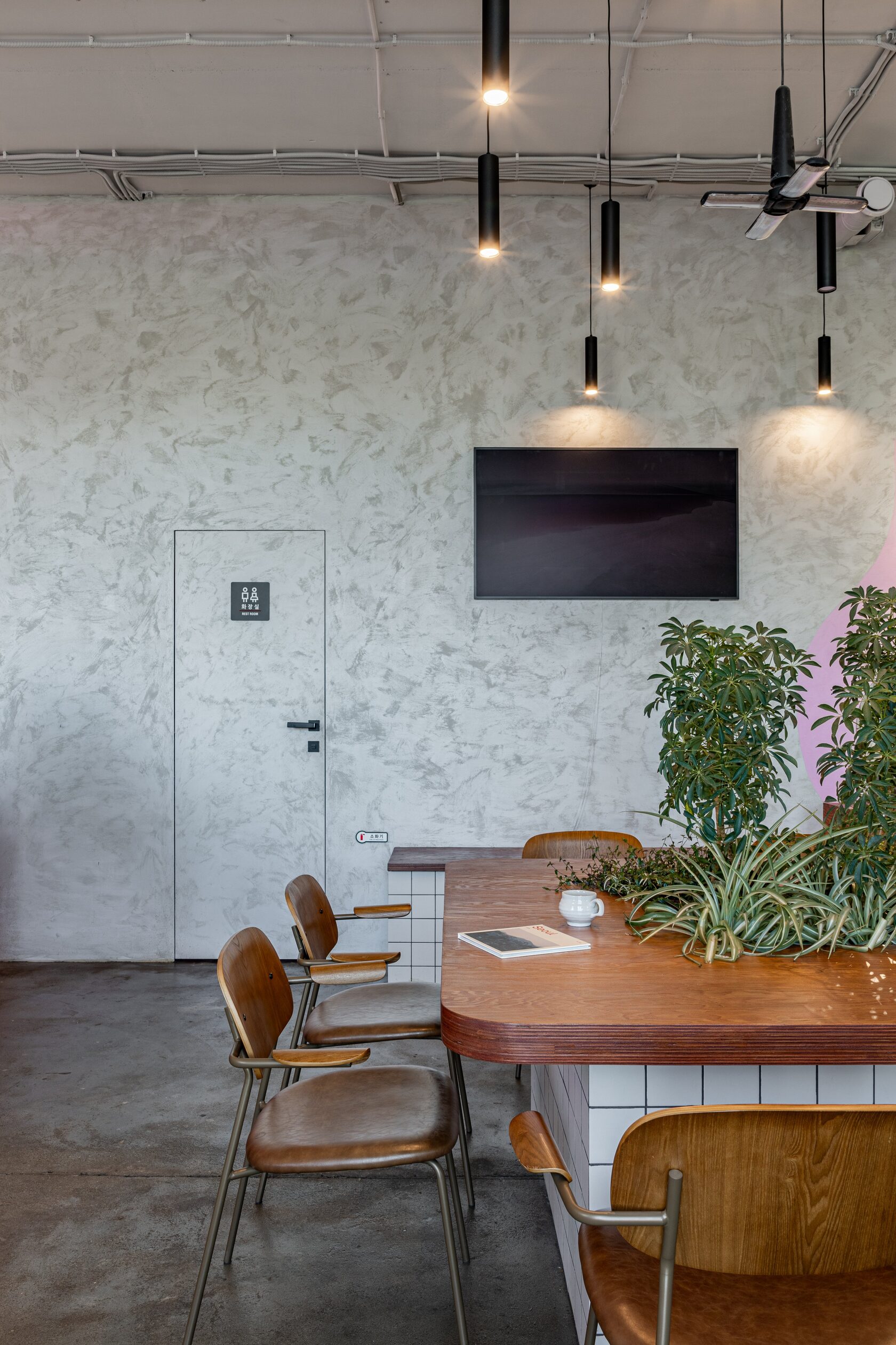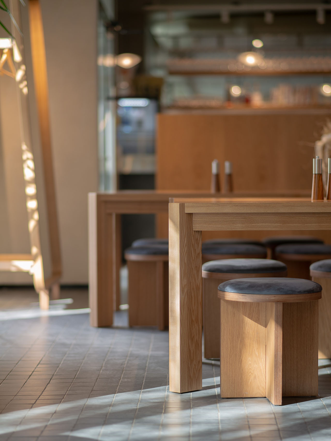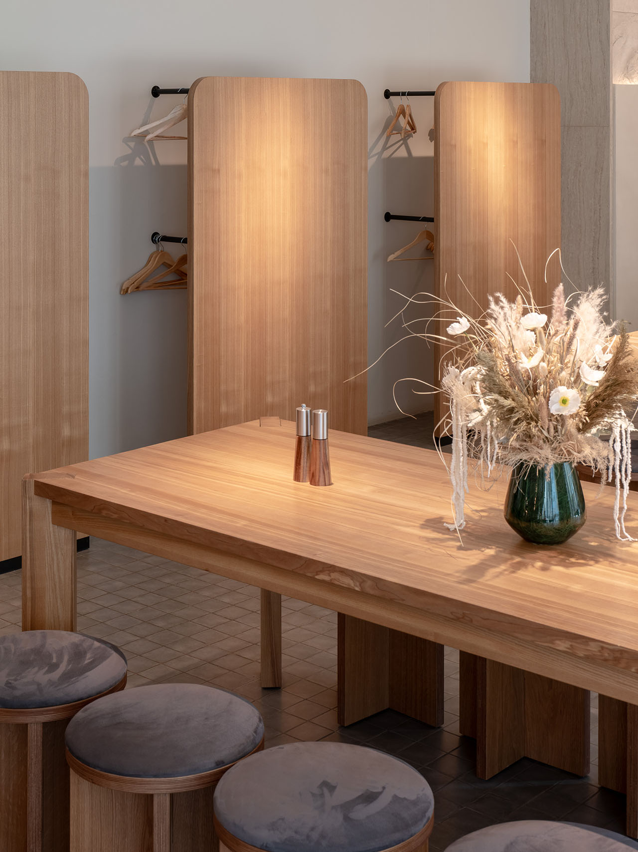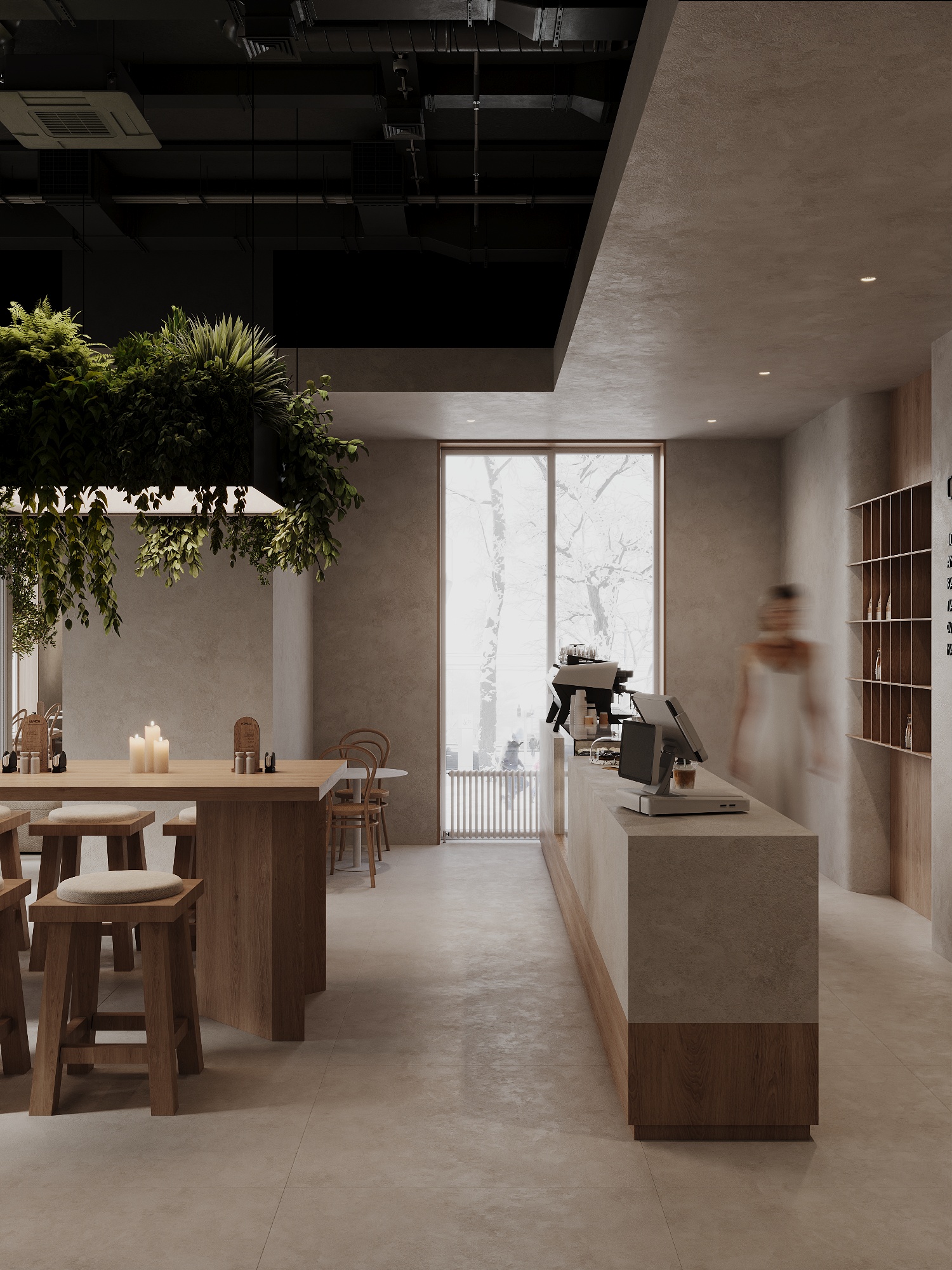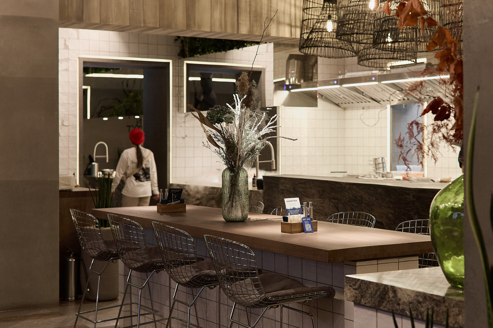 Концепция: Идея проекта строится на соединении человека и природы через архитектуру. Основными материалами стали сосновое дерево с выразительной текстурой, металл с индустриальными акцентами и стекло, пропускающее максимум естественного света. Каждый элемент интерьера несёт отпечаток индивидуального подхода: массивные столешницы с бетонными вставками, скамьи и вешалки ручной работы, витрины с терраццо — всё продумано до мелочей.