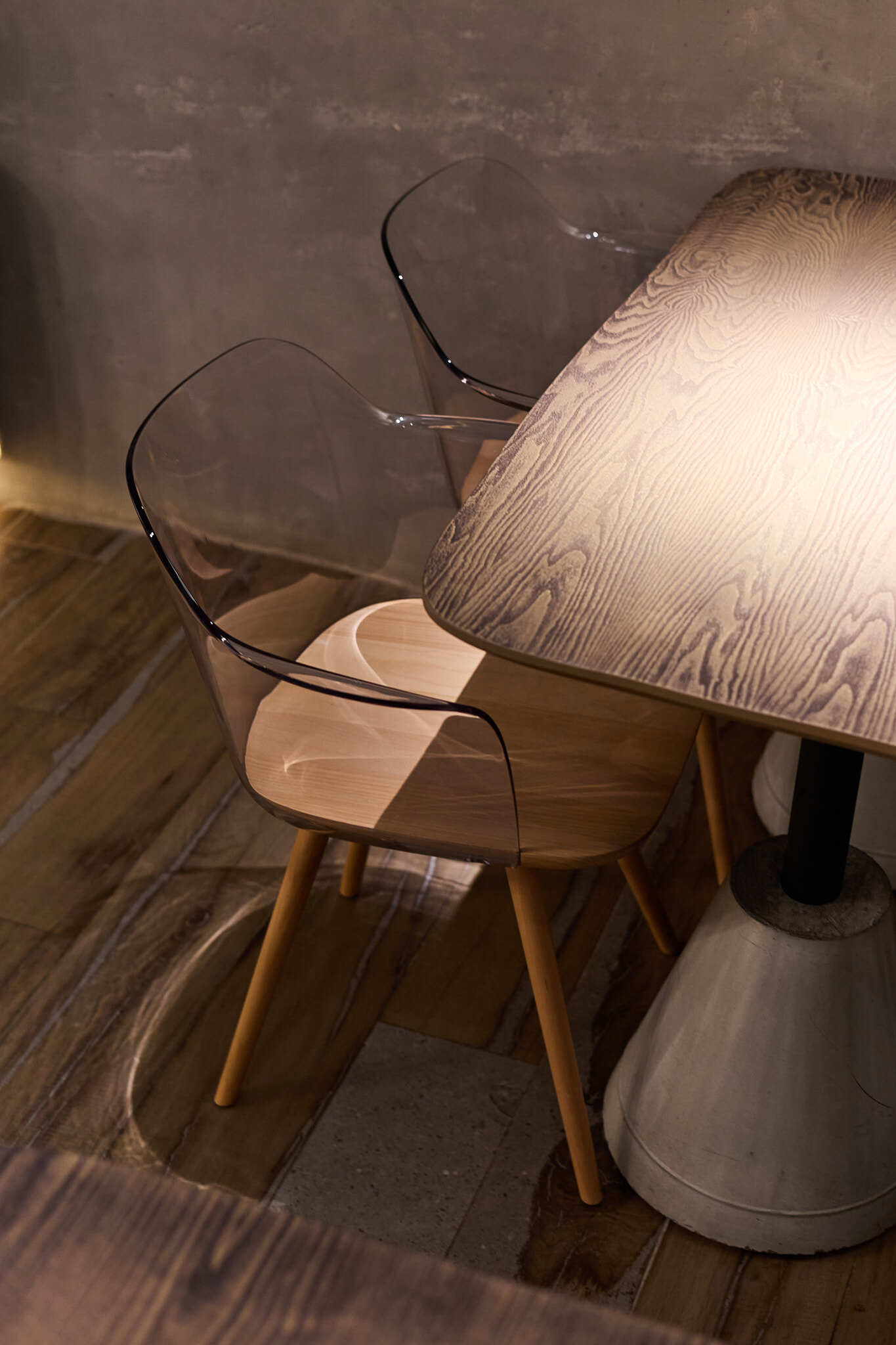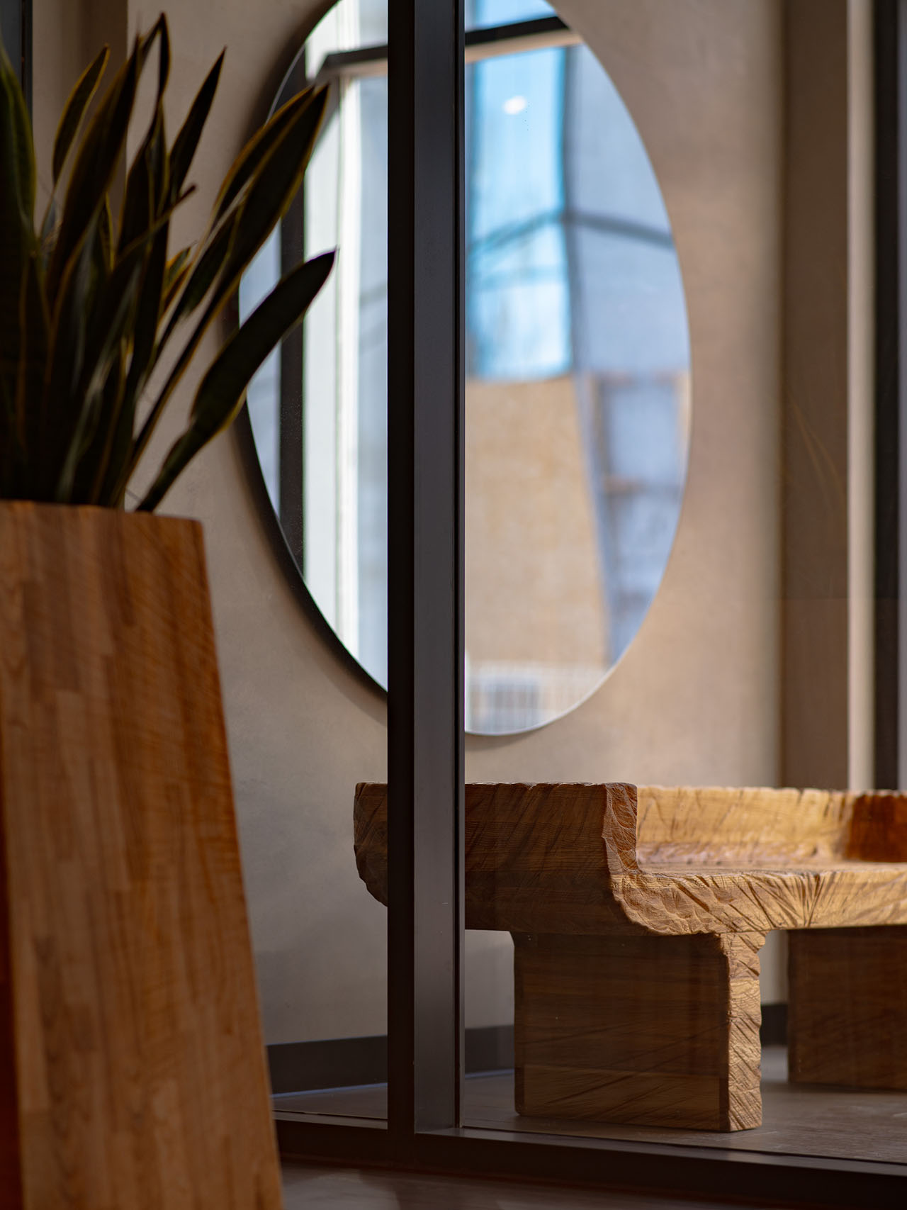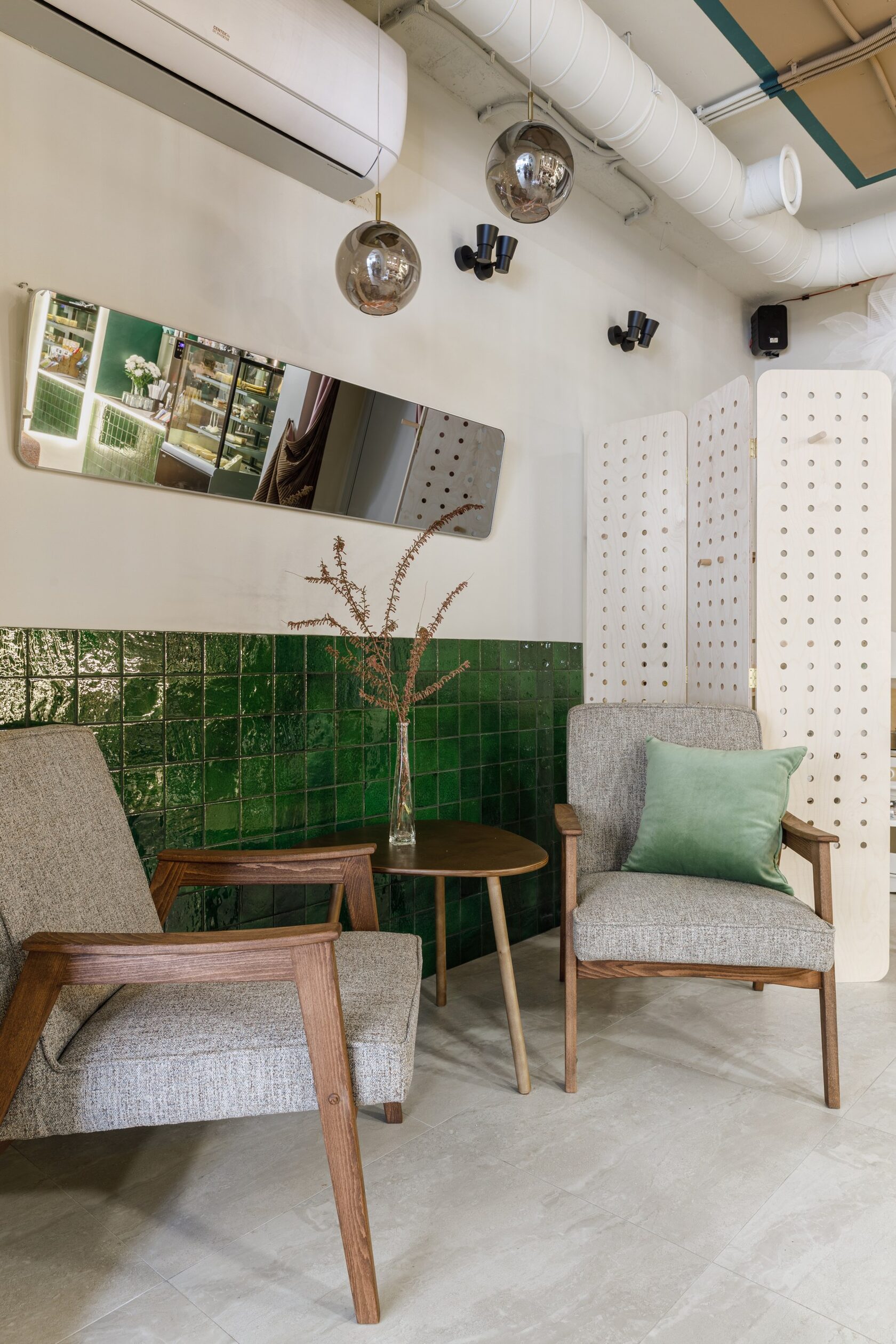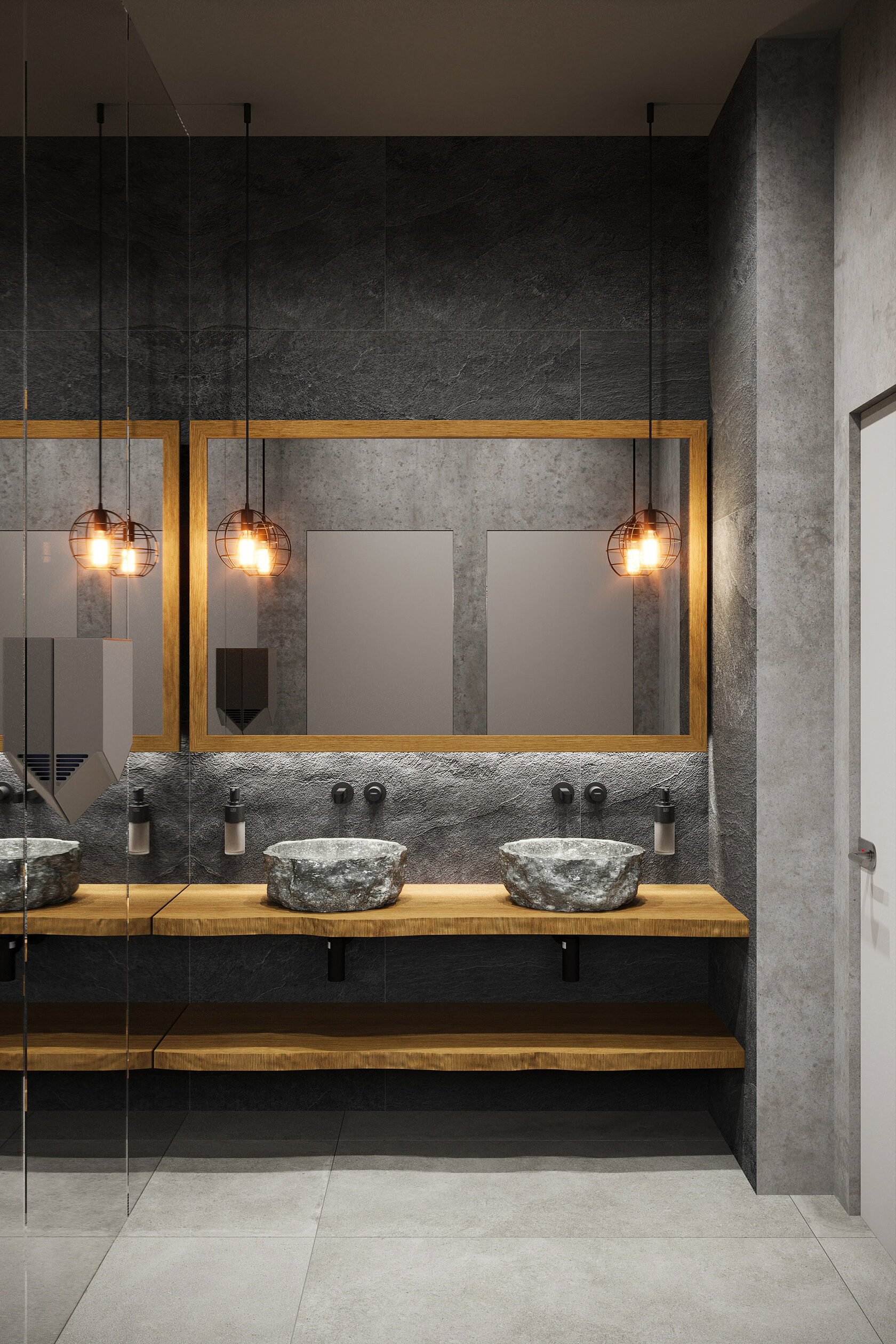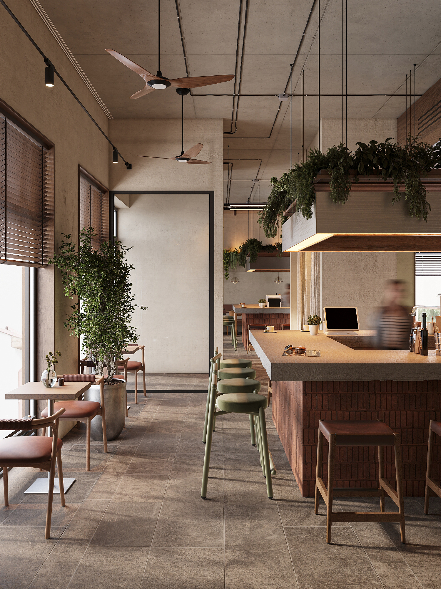 Концепция: Идея проекта строится на соединении человека и природы через архитектуру. Основными материалами стали сосновое дерево с выразительной текстурой, металл с индустриальными акцентами и стекло, пропускающее максимум естественного света. Каждый элемент интерьера несёт отпечаток индивидуального подхода: массивные столешницы с бетонными вставками, скамьи и вешалки ручной работы, витрины с терраццо — всё продумано до мелочей.
