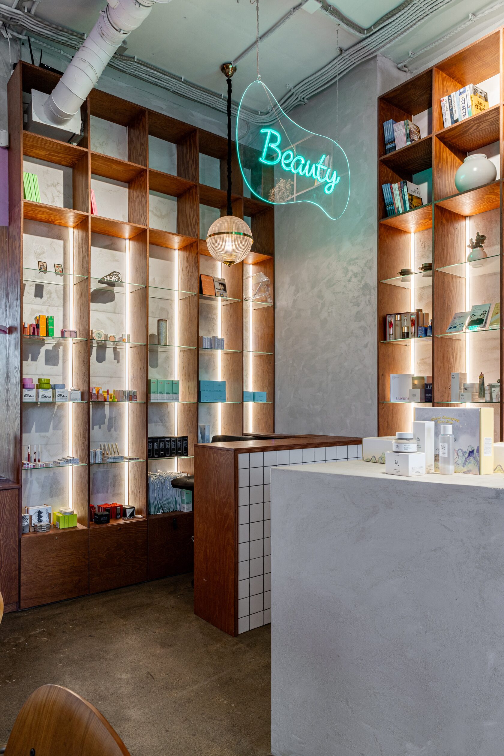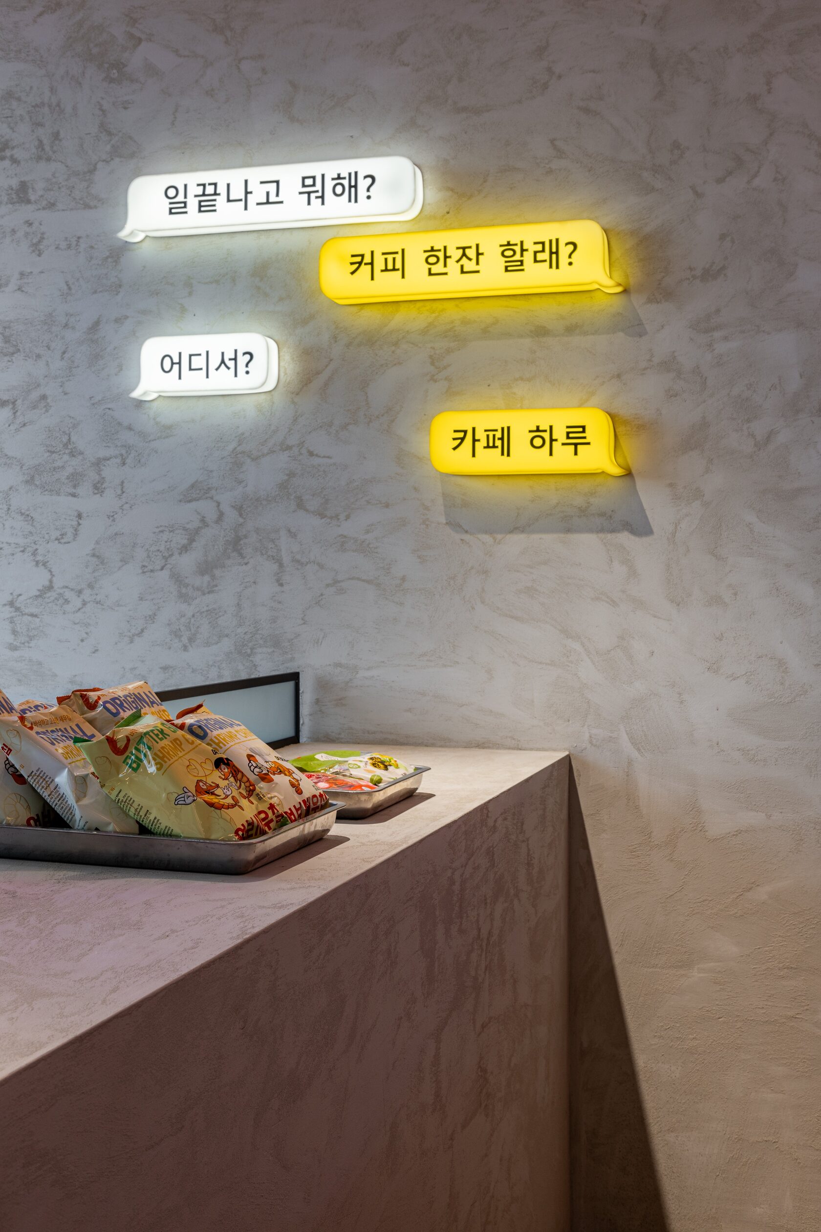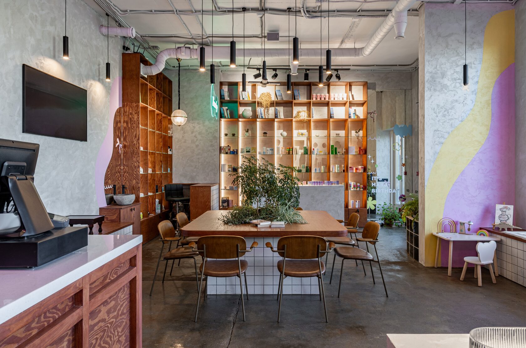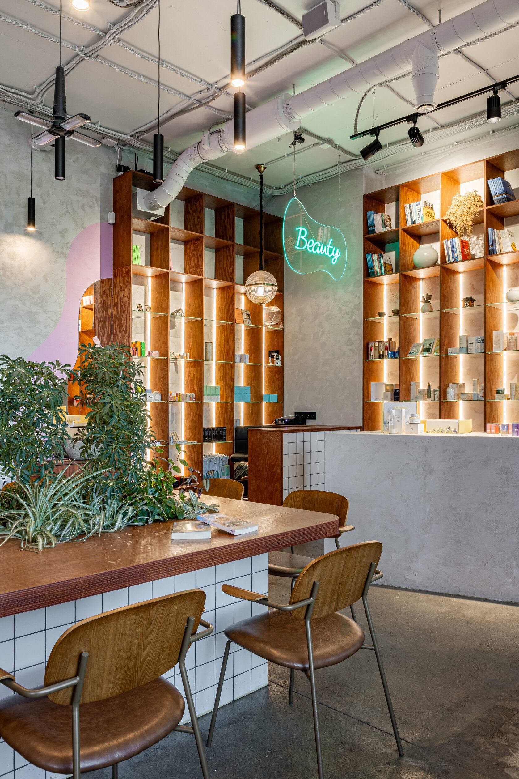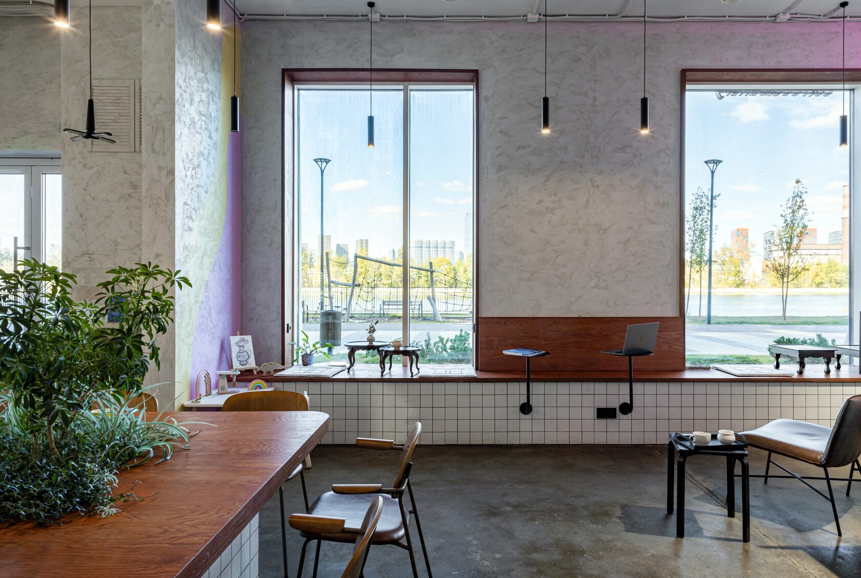 На площади 70 м² создано уникальное пространство, объединяющее кофейню и магазин косметики. Благодаря продуманному зонированию, подиуму и оформленным витражам удалось сохранить открытость интерьера, подчеркнув индивидуальность каждой зоны. Панорамные окна с видом на Москву-реку задали настроение современного брутального интерьера, дополненного яркими корейскими мотивами.