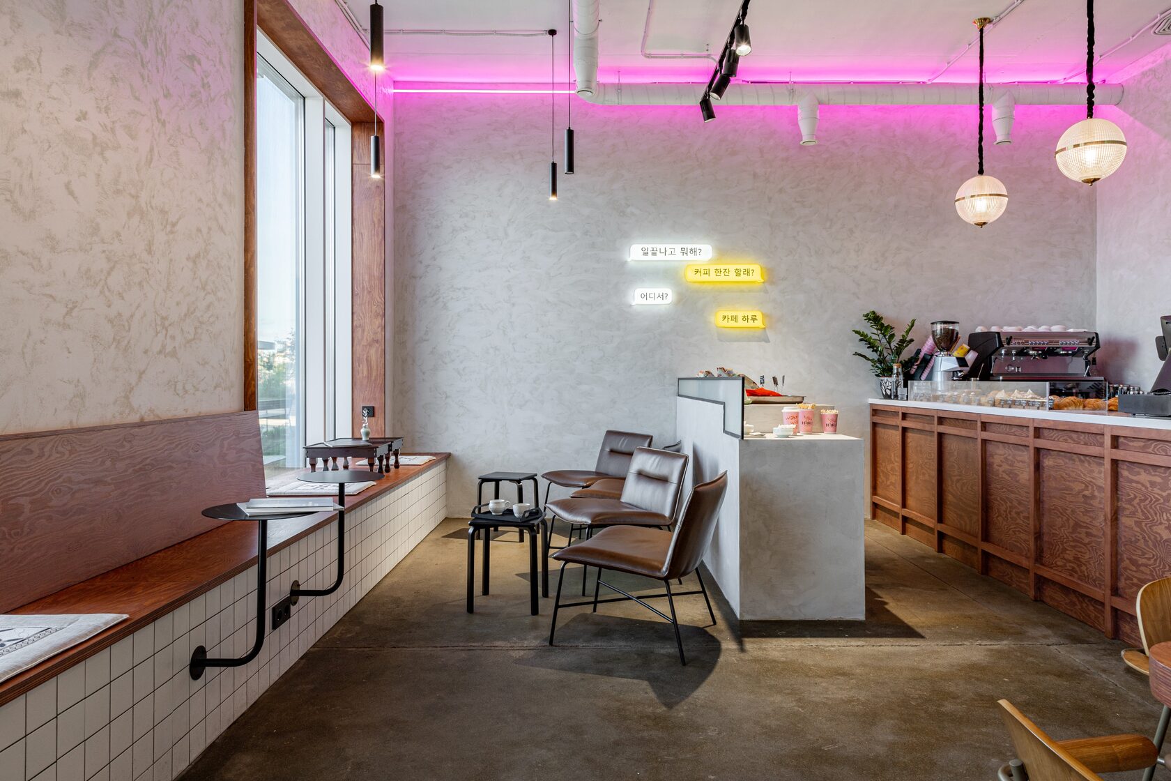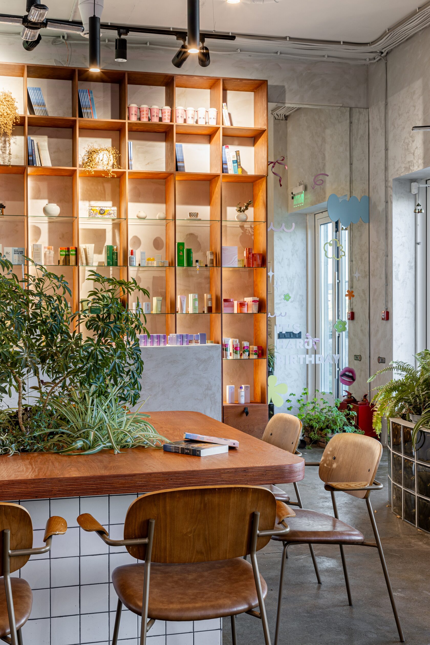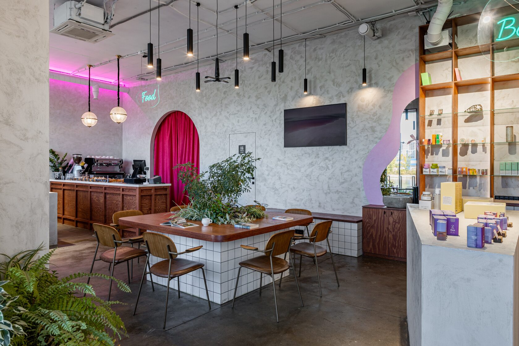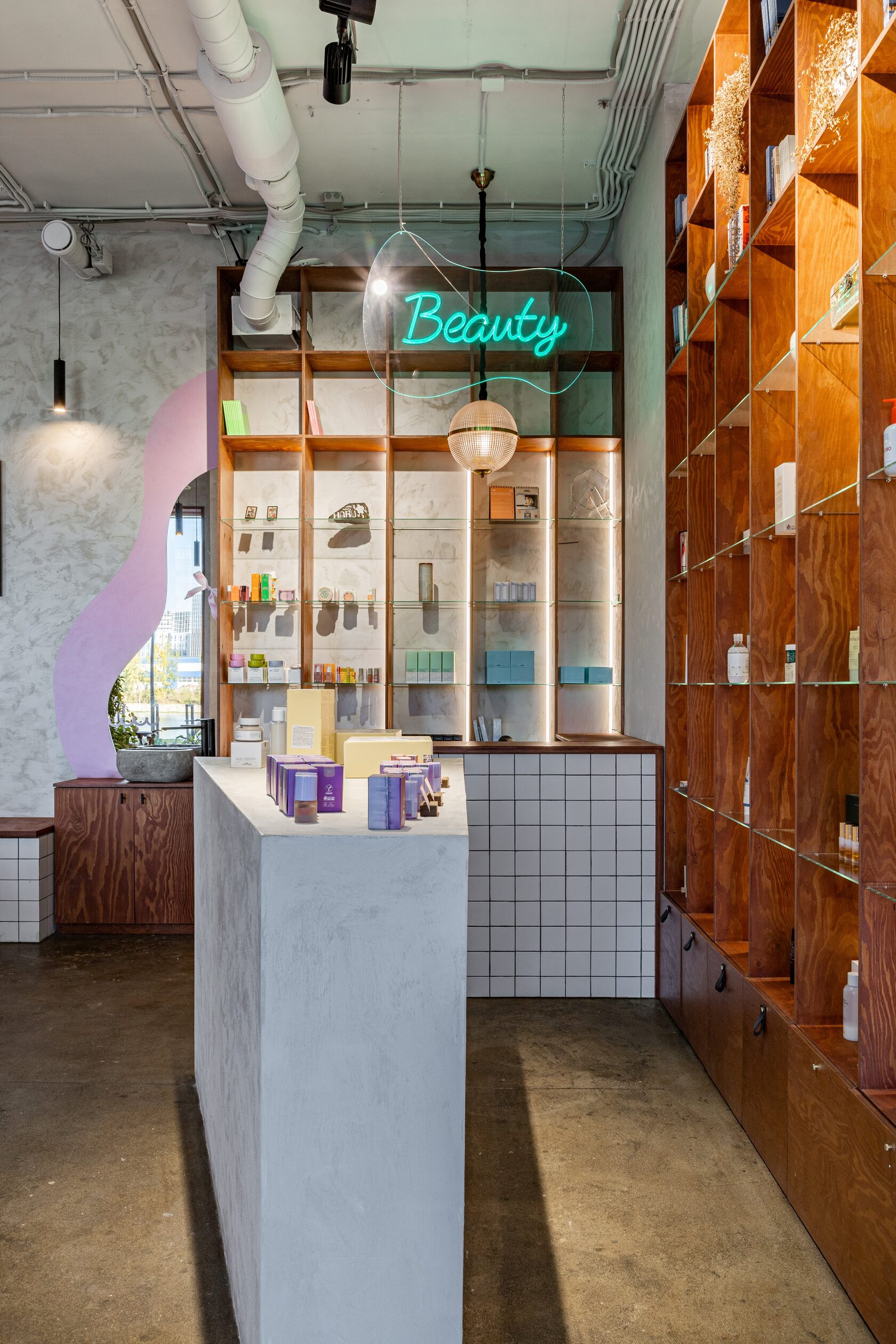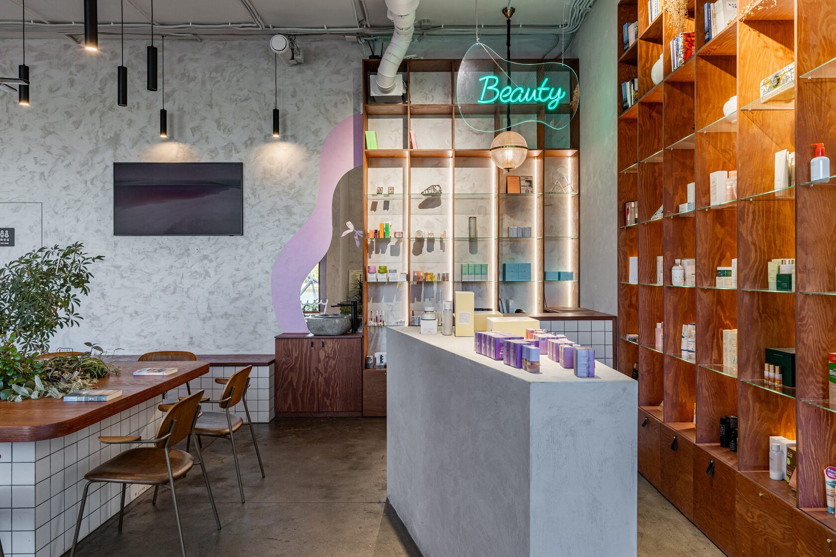 На площади 70 м² создано уникальное пространство, объединяющее кофейню и магазин косметики. Благодаря продуманному зонированию, подиуму и оформленным витражам удалось сохранить открытость интерьера, подчеркнув индивидуальность каждой зоны. Панорамные окна с видом на Москву-реку задали настроение современного брутального интерьера, дополненного яркими корейскими мотивами.