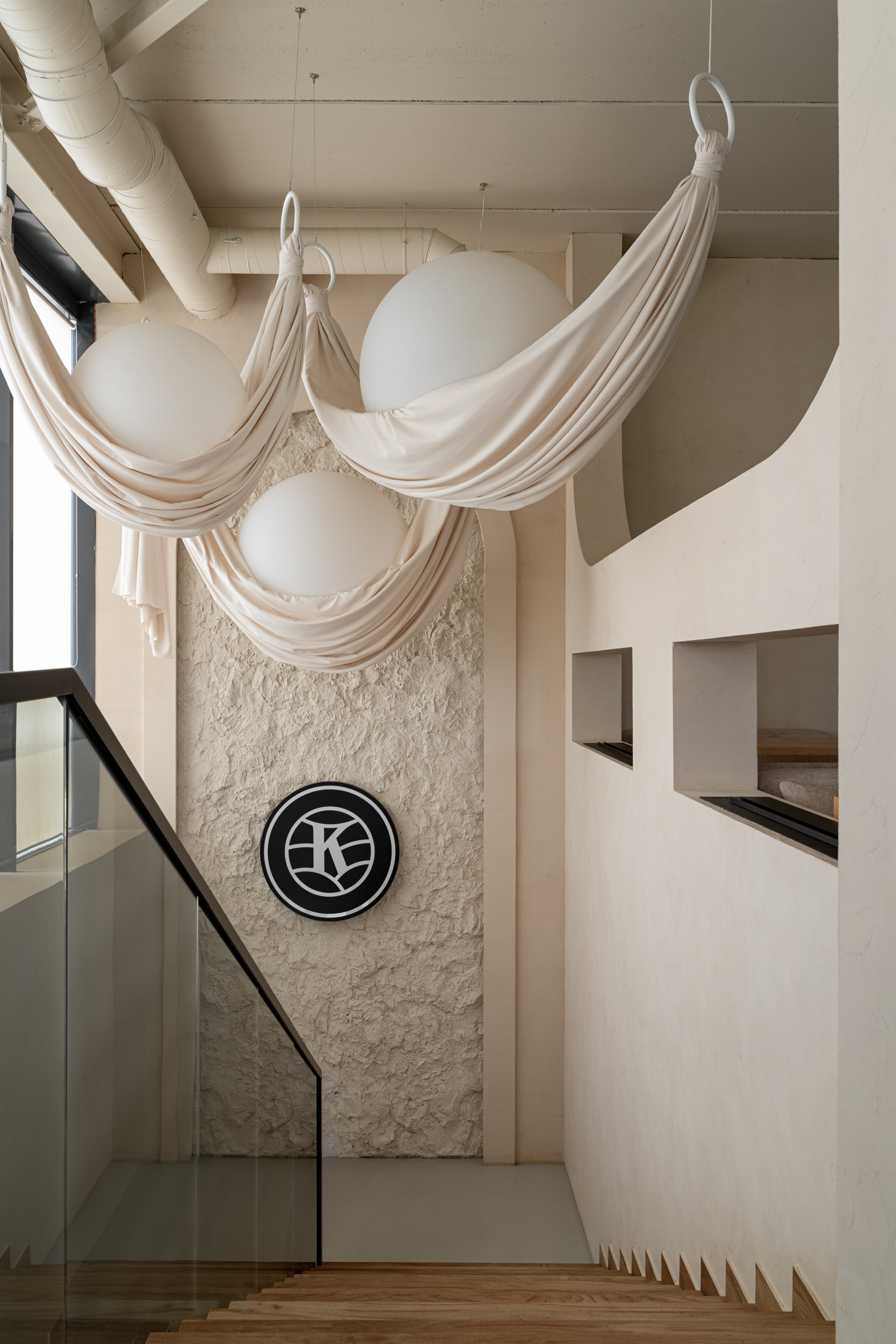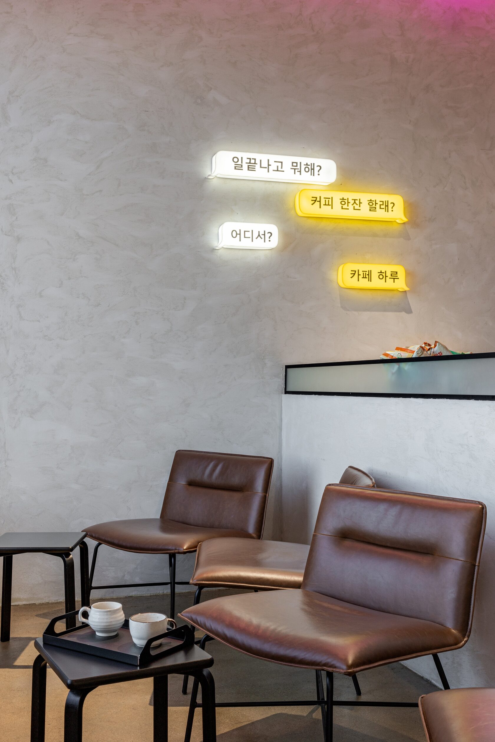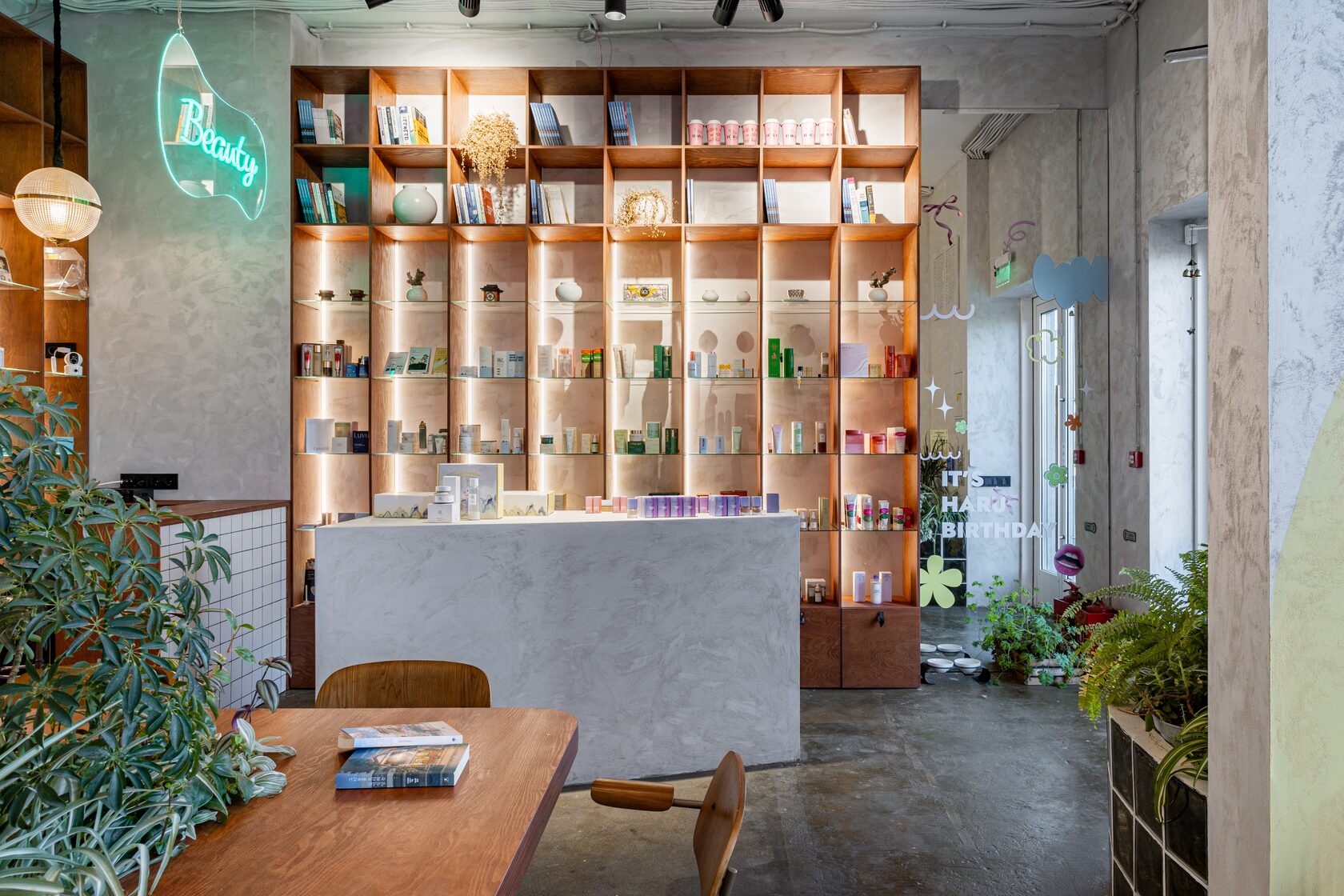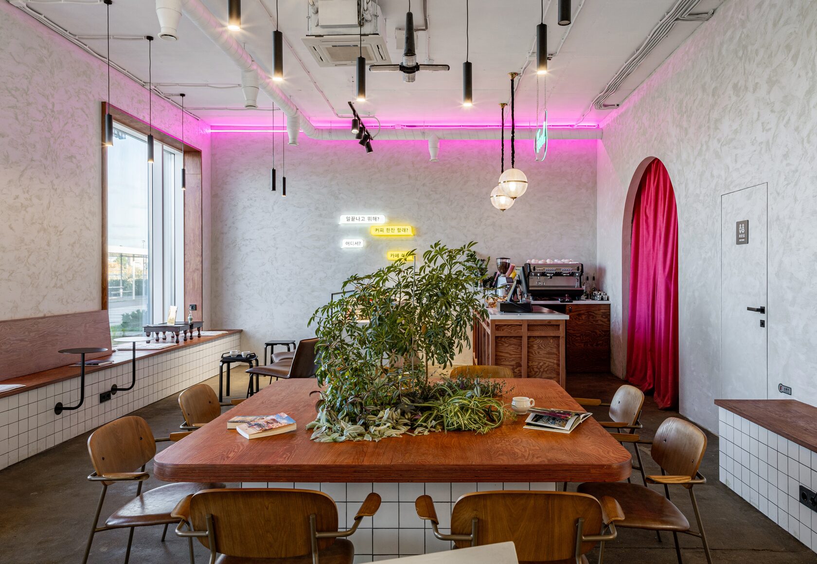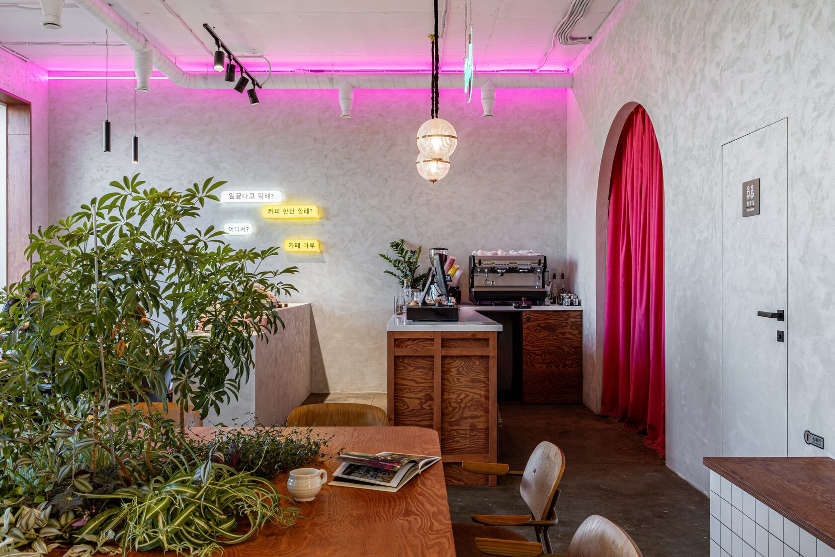 На площади 70 м² создано уникальное пространство, объединяющее кофейню и магазин косметики. Благодаря продуманному зонированию, подиуму и оформленным витражам удалось сохранить открытость интерьера, подчеркнув индивидуальность каждой зоны. Панорамные окна с видом на Москву-реку задали настроение современного брутального интерьера, дополненного яркими корейскими мотивами.