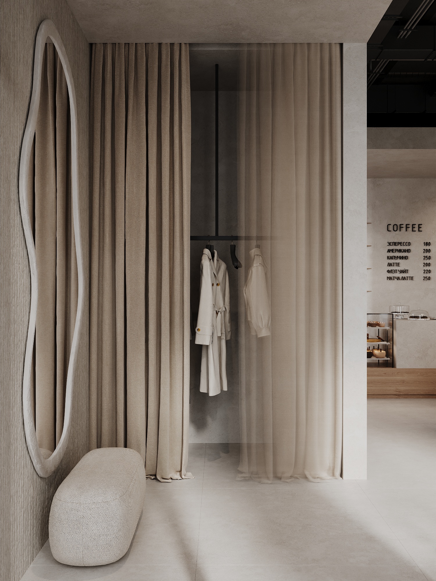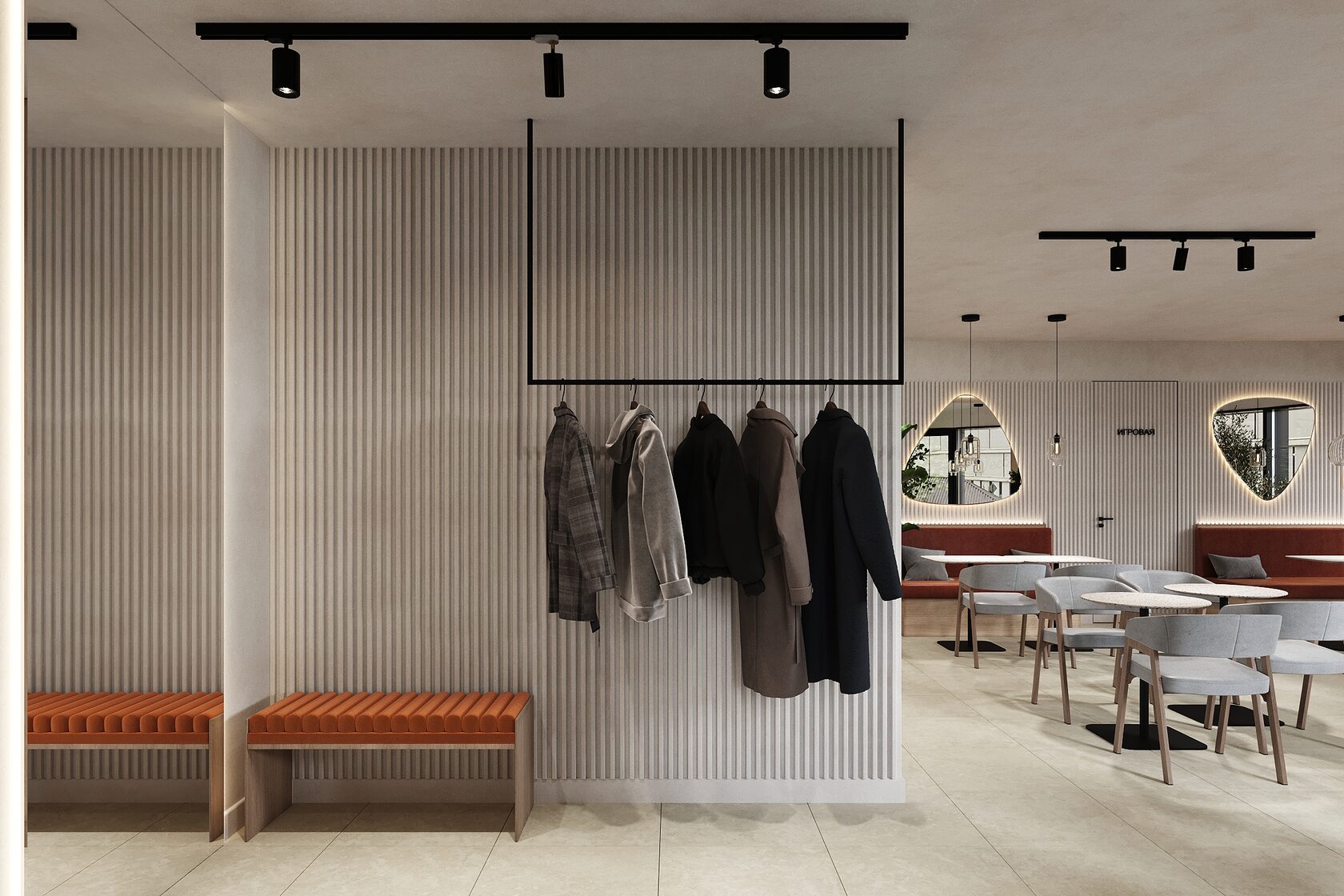 Владелец магазина женской одежды обратился ко мне, когда решил изменить вектор бизнеса — к моде добавить кофе. Так родилась идея модного бутик-кафе, сочетающего эстетику бутика и уют кофейни. Пространство должно было остаться женственным, легким, но при этом стать более открытым и гостеприимным.
