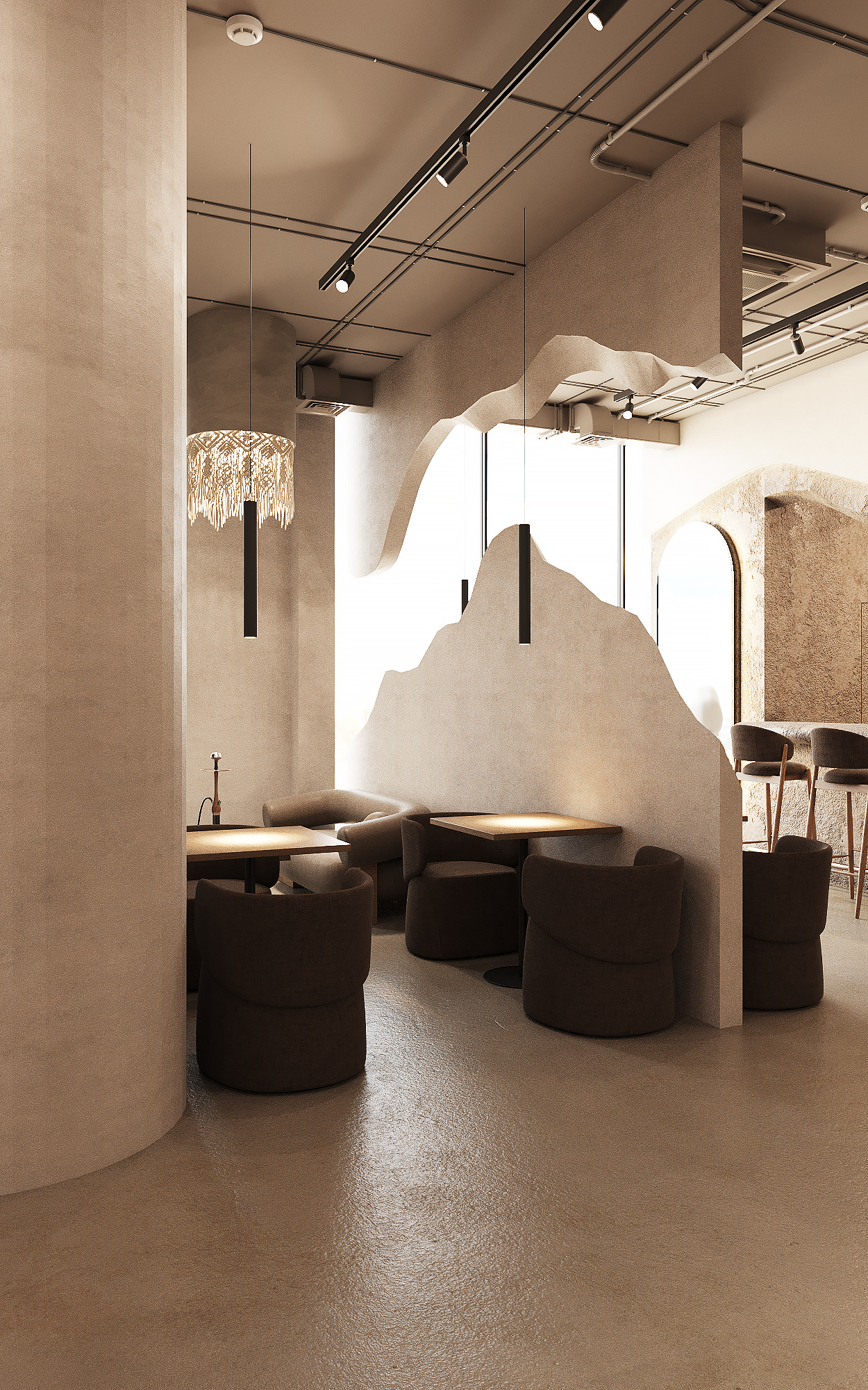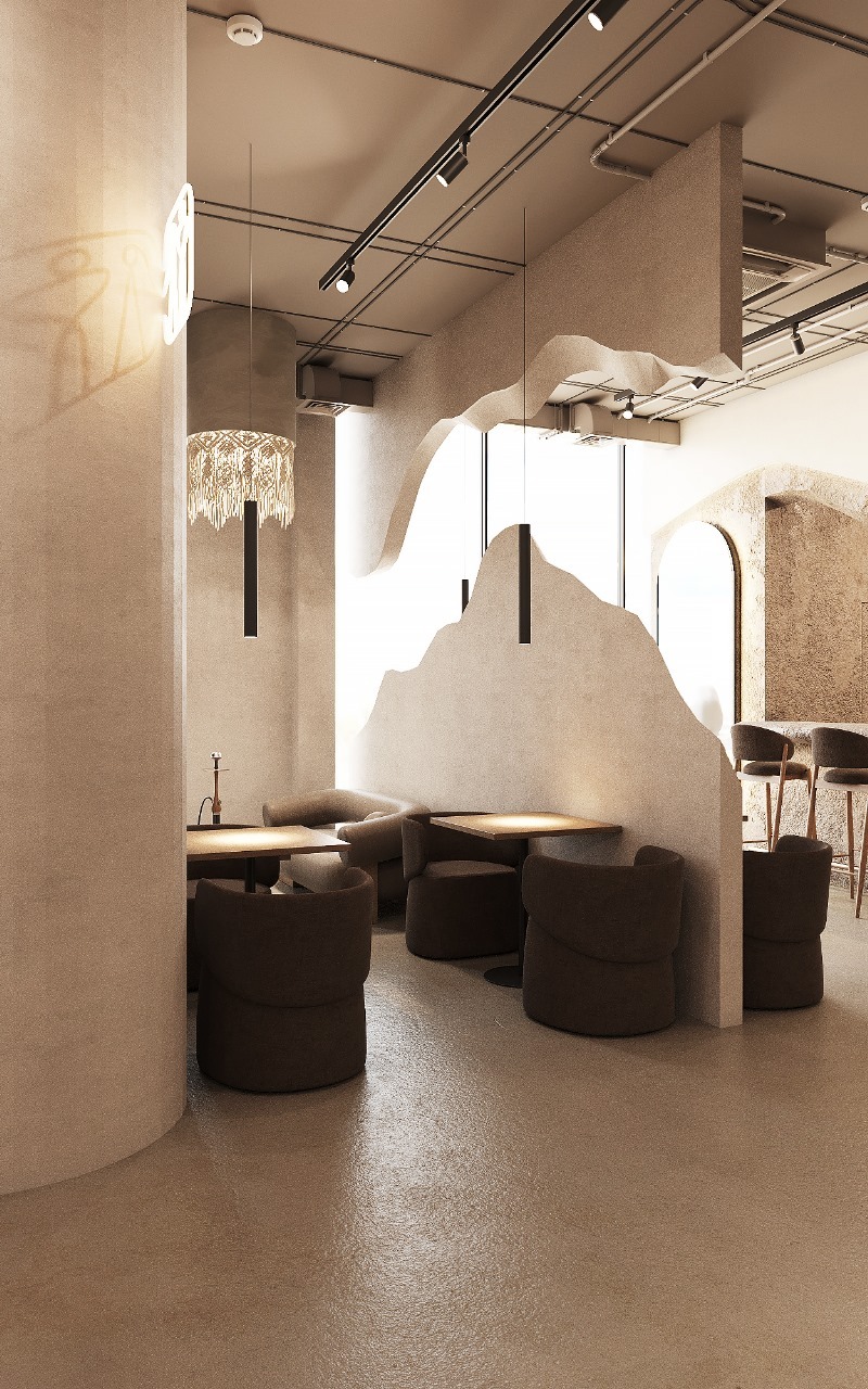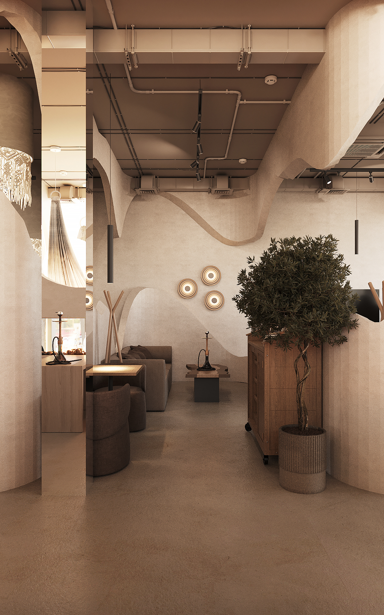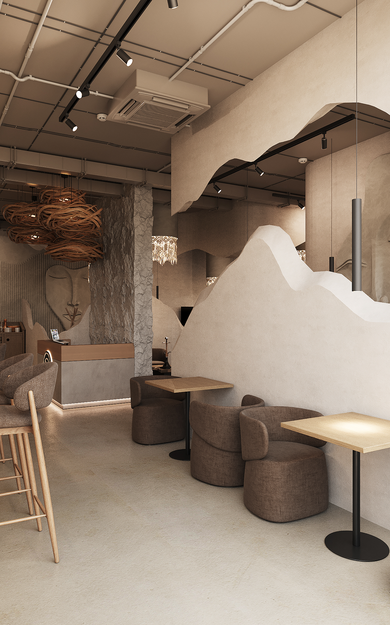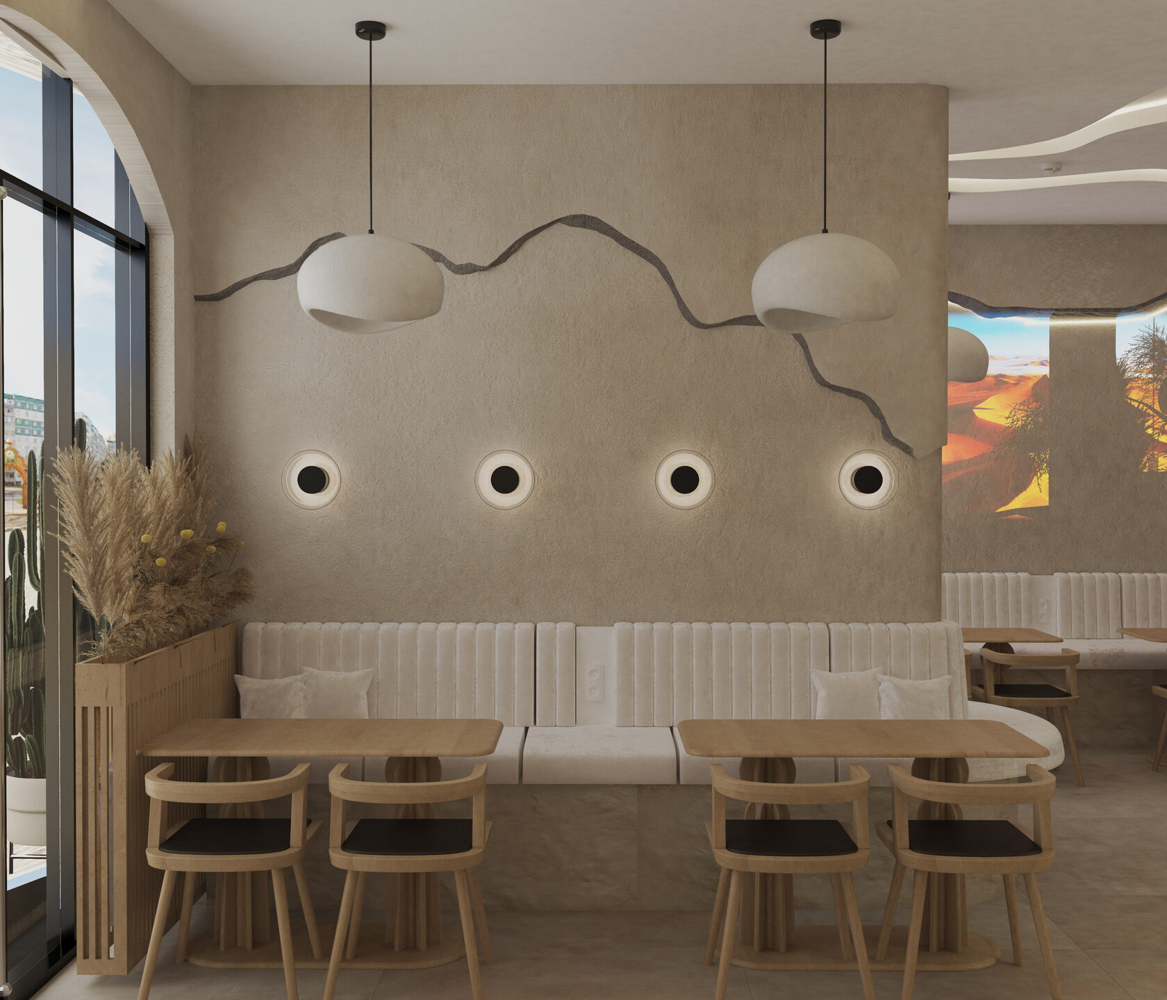 Этот проект представляет собой смелое воплощение идеи заказчика — создание пространства, полностью погружающего в атмосферу бесконечных дюн, золотого песка и палящего солнца пустыни. Кафе является образцом экостиля, где каждый элемент отражает гармонию природы.
