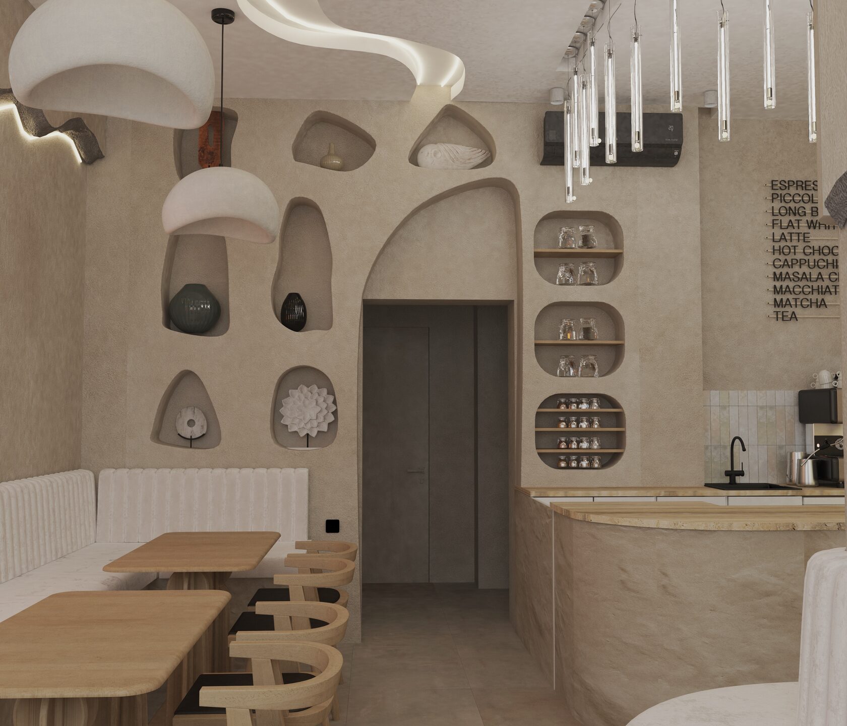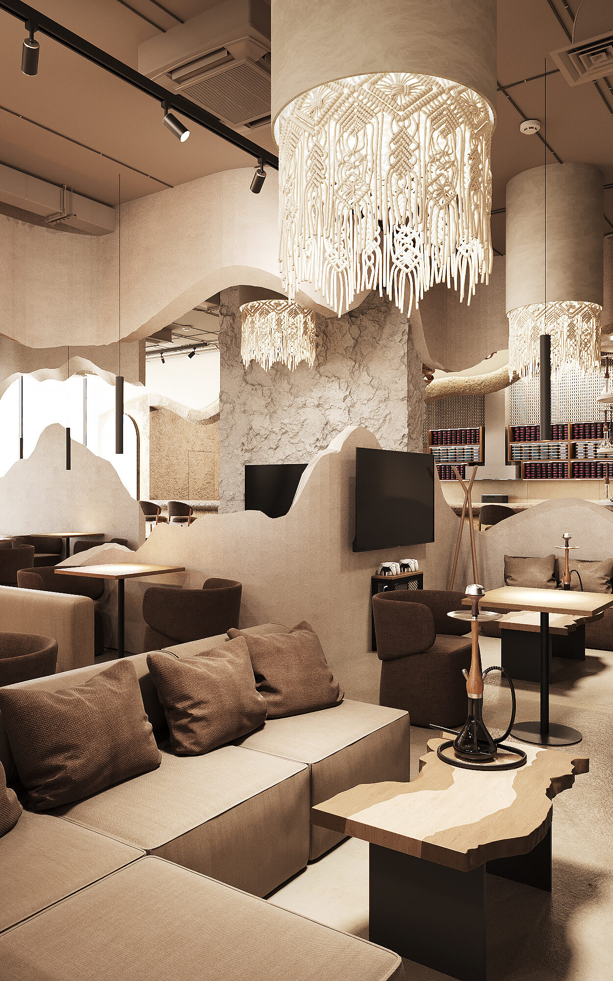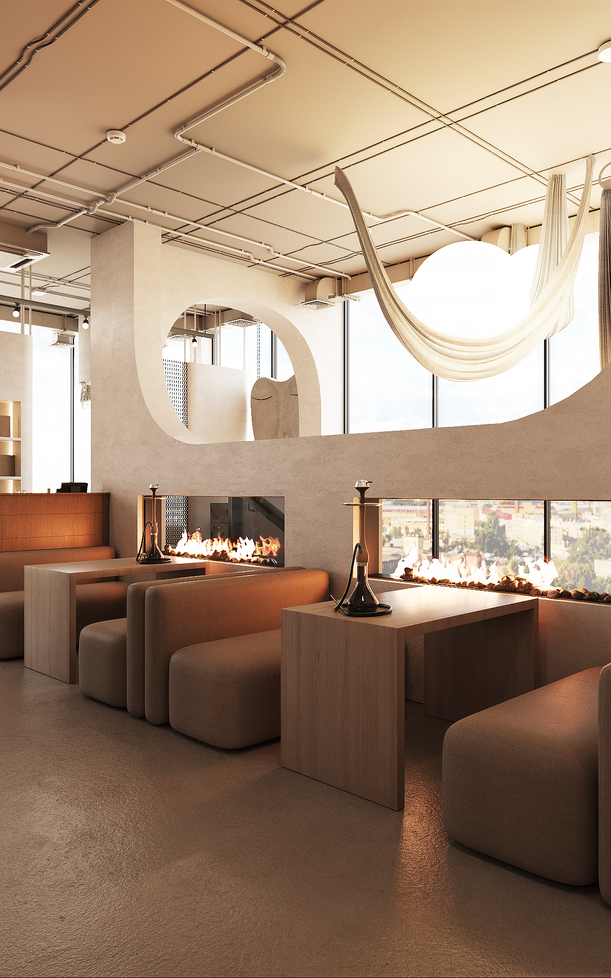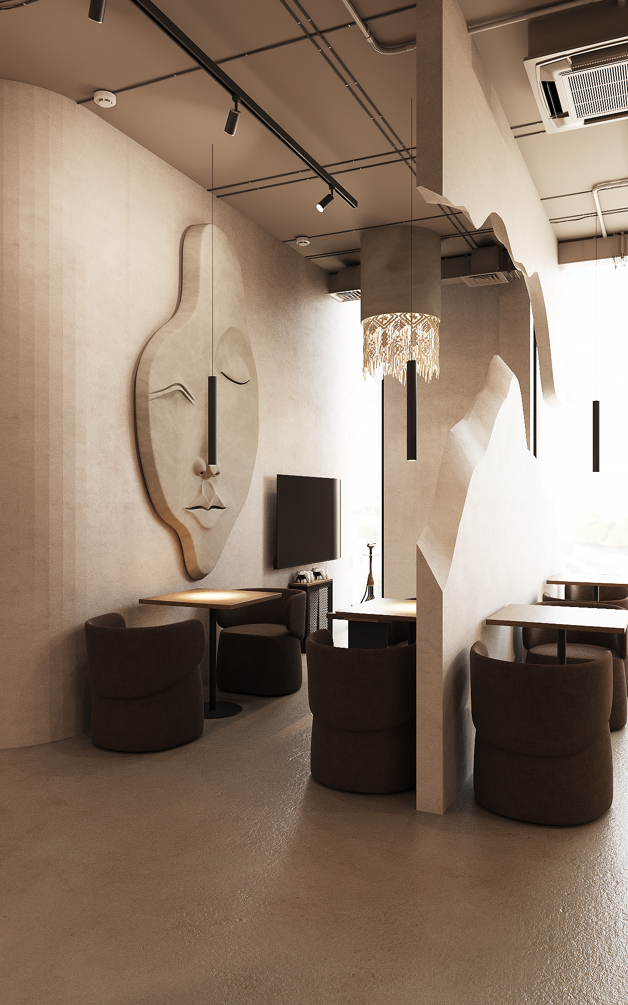 Этот проект представляет собой смелое воплощение идеи заказчика — создание пространства, полностью погружающего в атмосферу бесконечных дюн, золотого песка и палящего солнца пустыни. Кафе является образцом экостиля, где каждый элемент отражает гармонию природы.