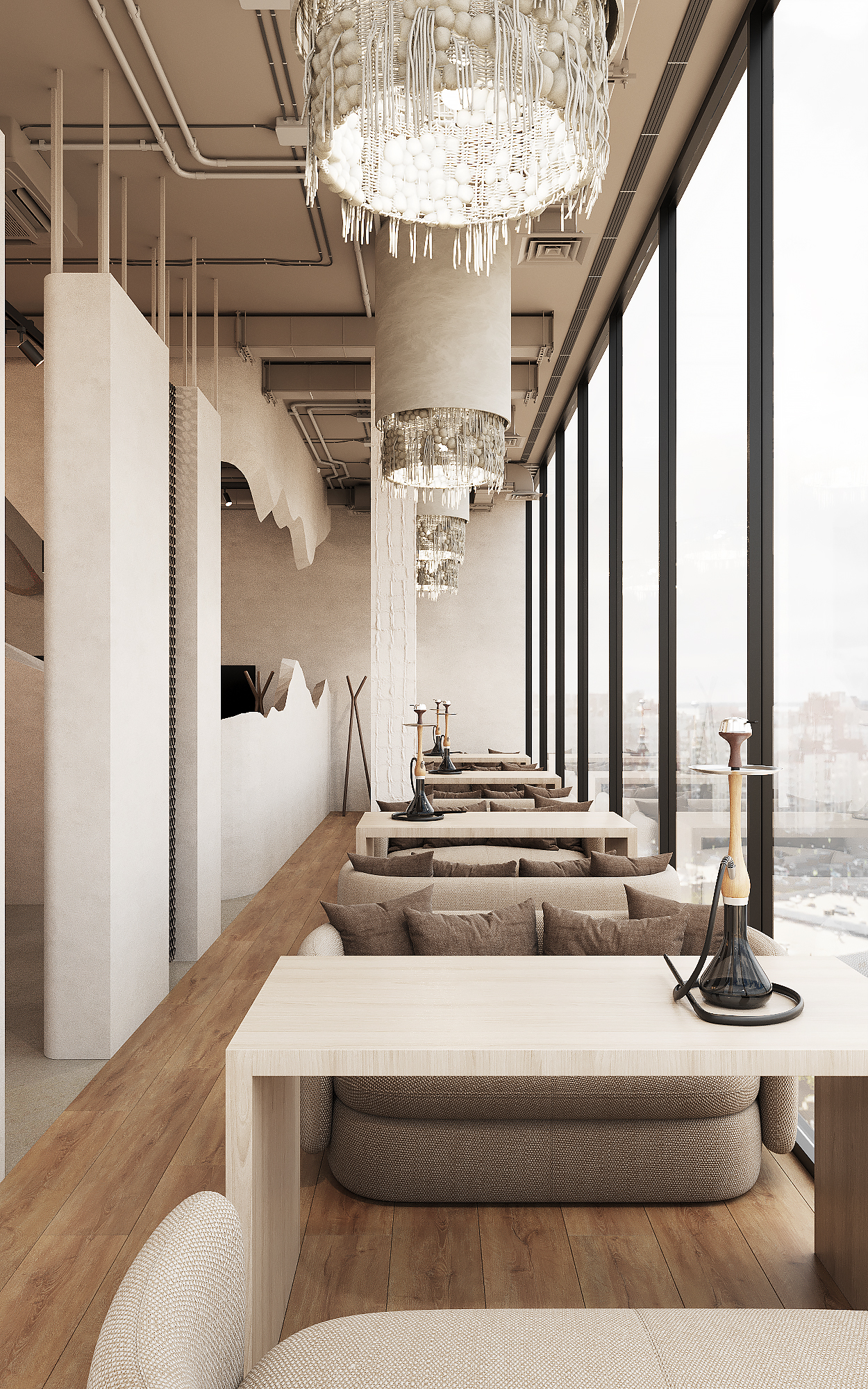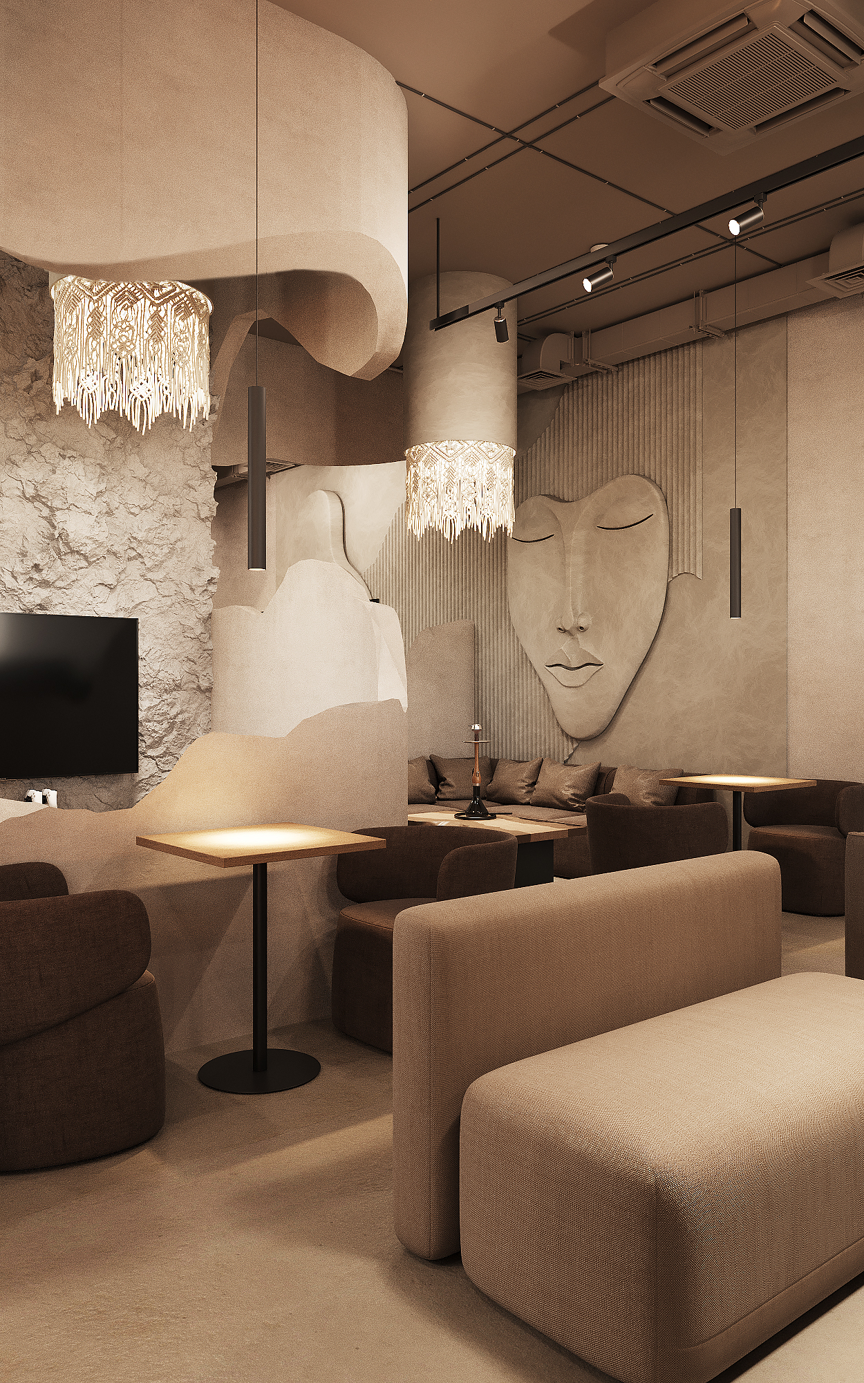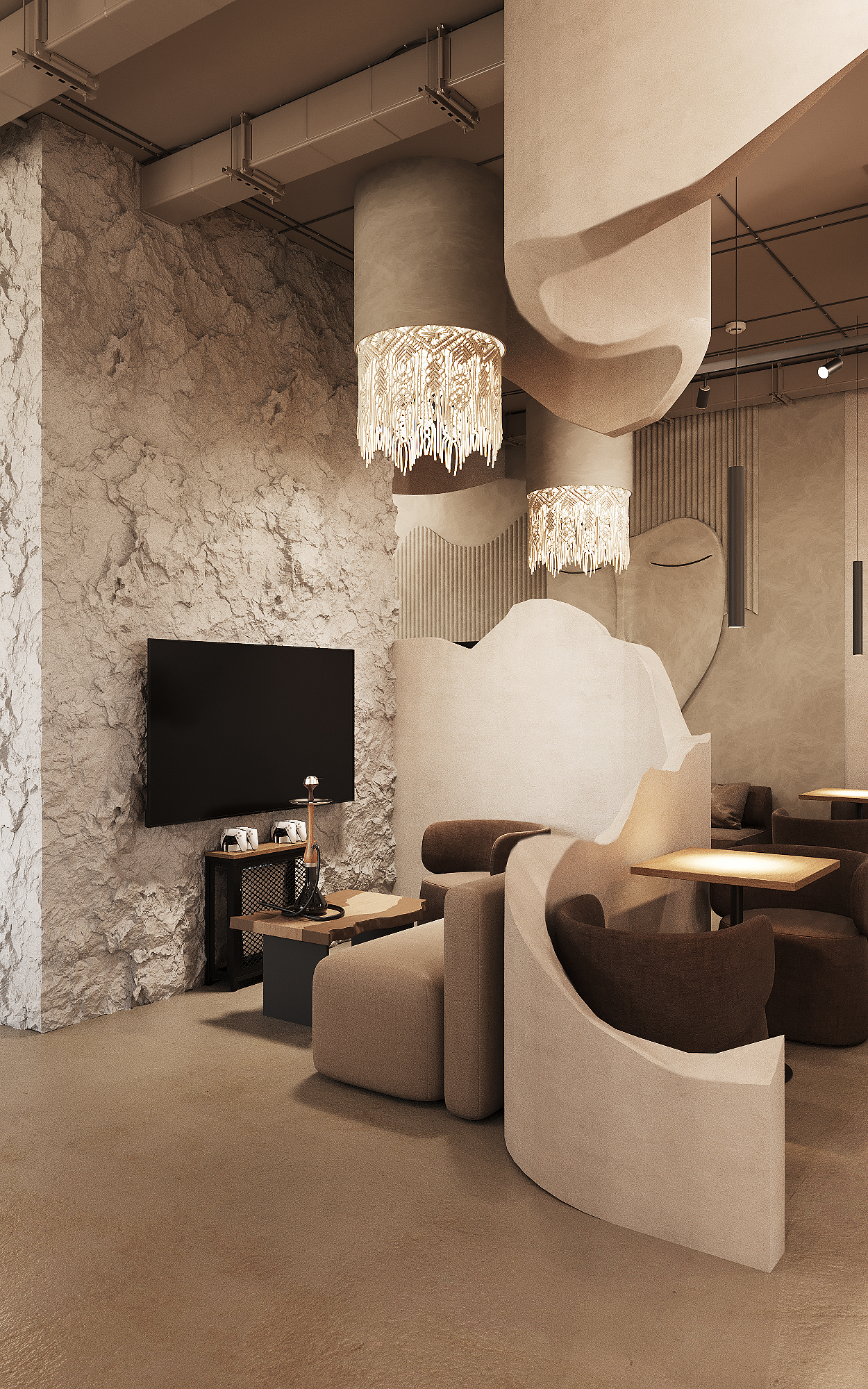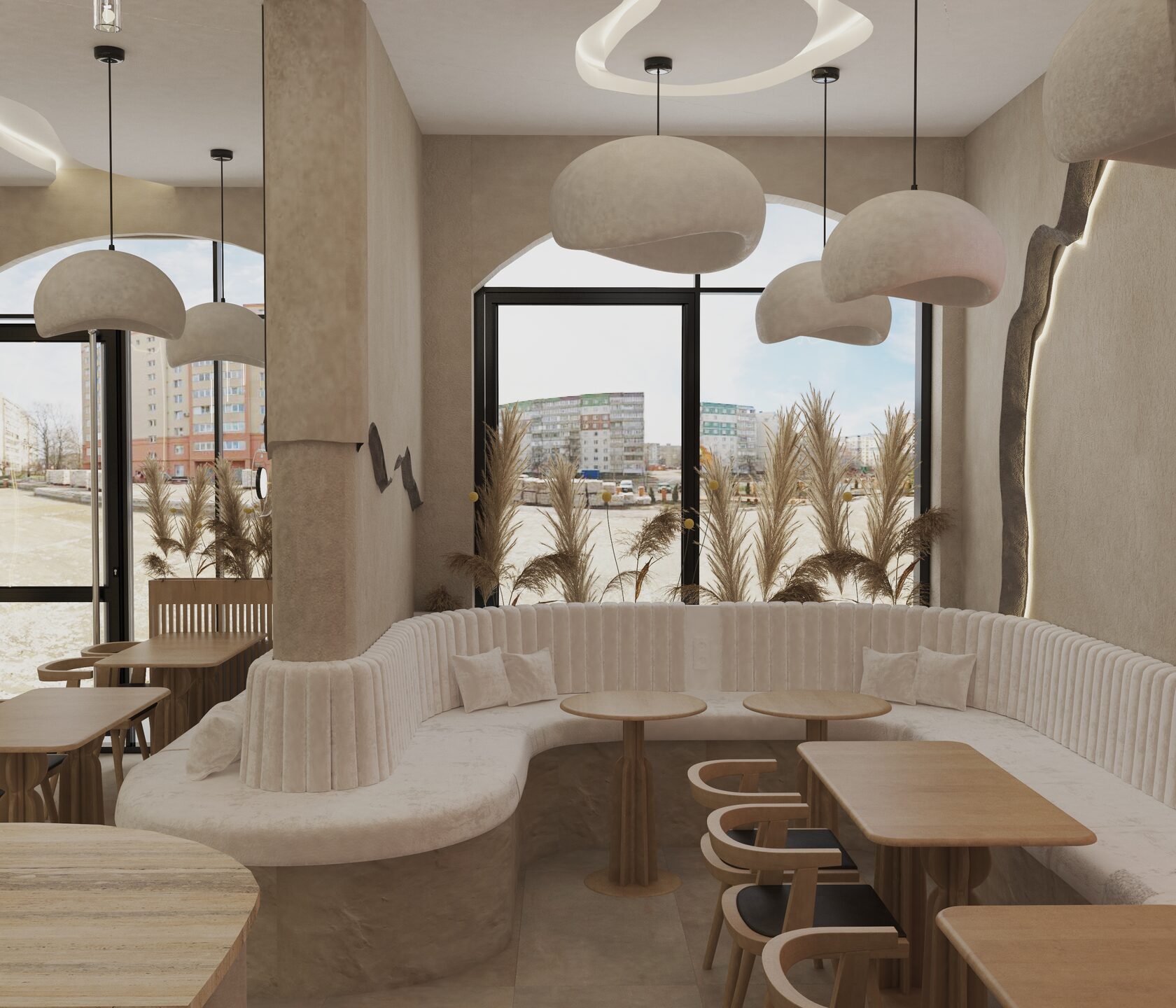 Этот проект представляет собой смелое воплощение идеи заказчика — создание пространства, полностью погружающего в атмосферу бесконечных дюн, золотого песка и палящего солнца пустыни. Кафе является образцом экостиля, где каждый элемент отражает гармонию природы.