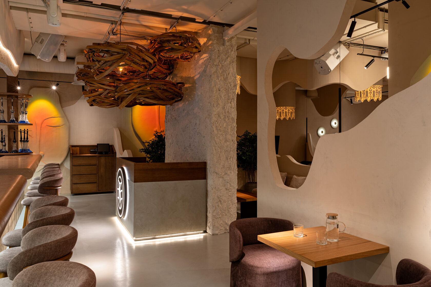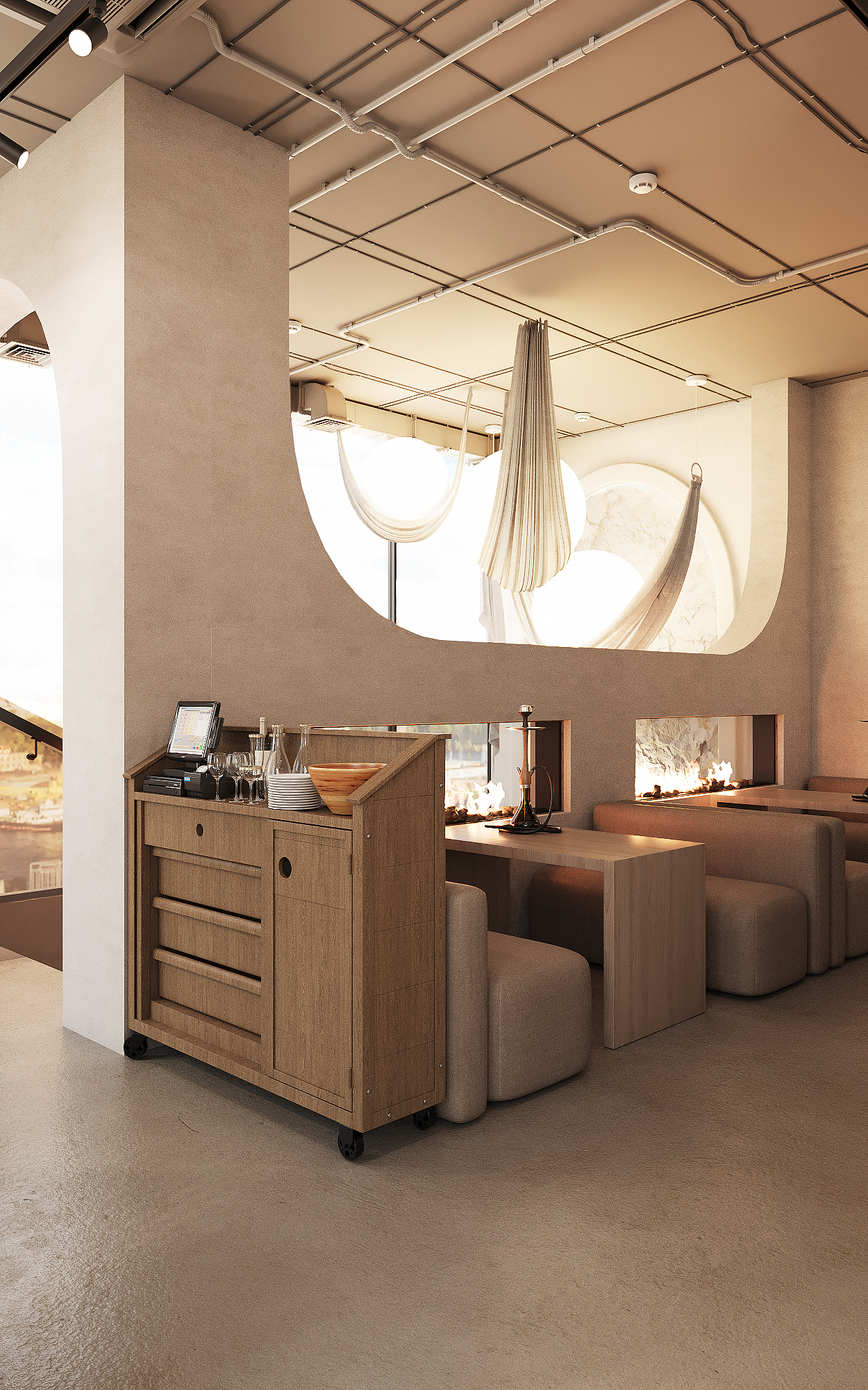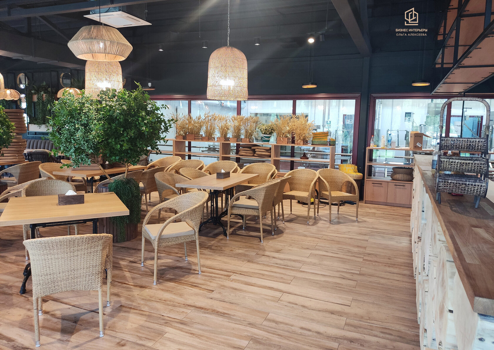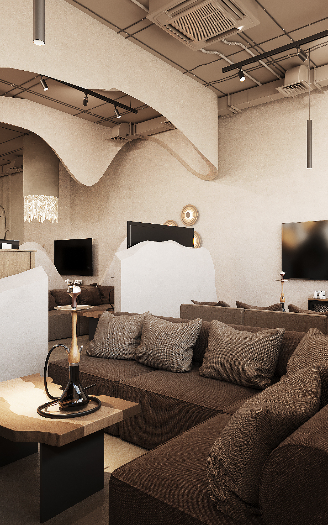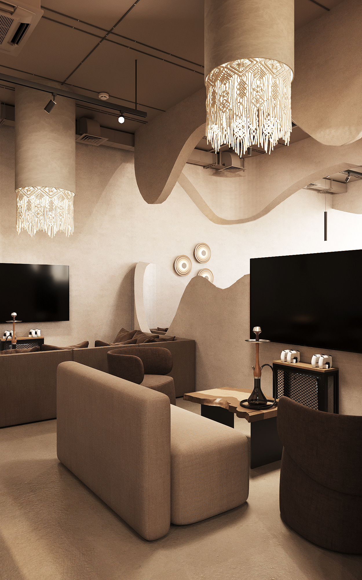 Этот проект представляет собой смелое воплощение идеи заказчика — создание пространства, полностью погружающего в атмосферу бесконечных дюн, золотого песка и палящего солнца пустыни. Кафе является образцом экостиля, где каждый элемент отражает гармонию природы.
