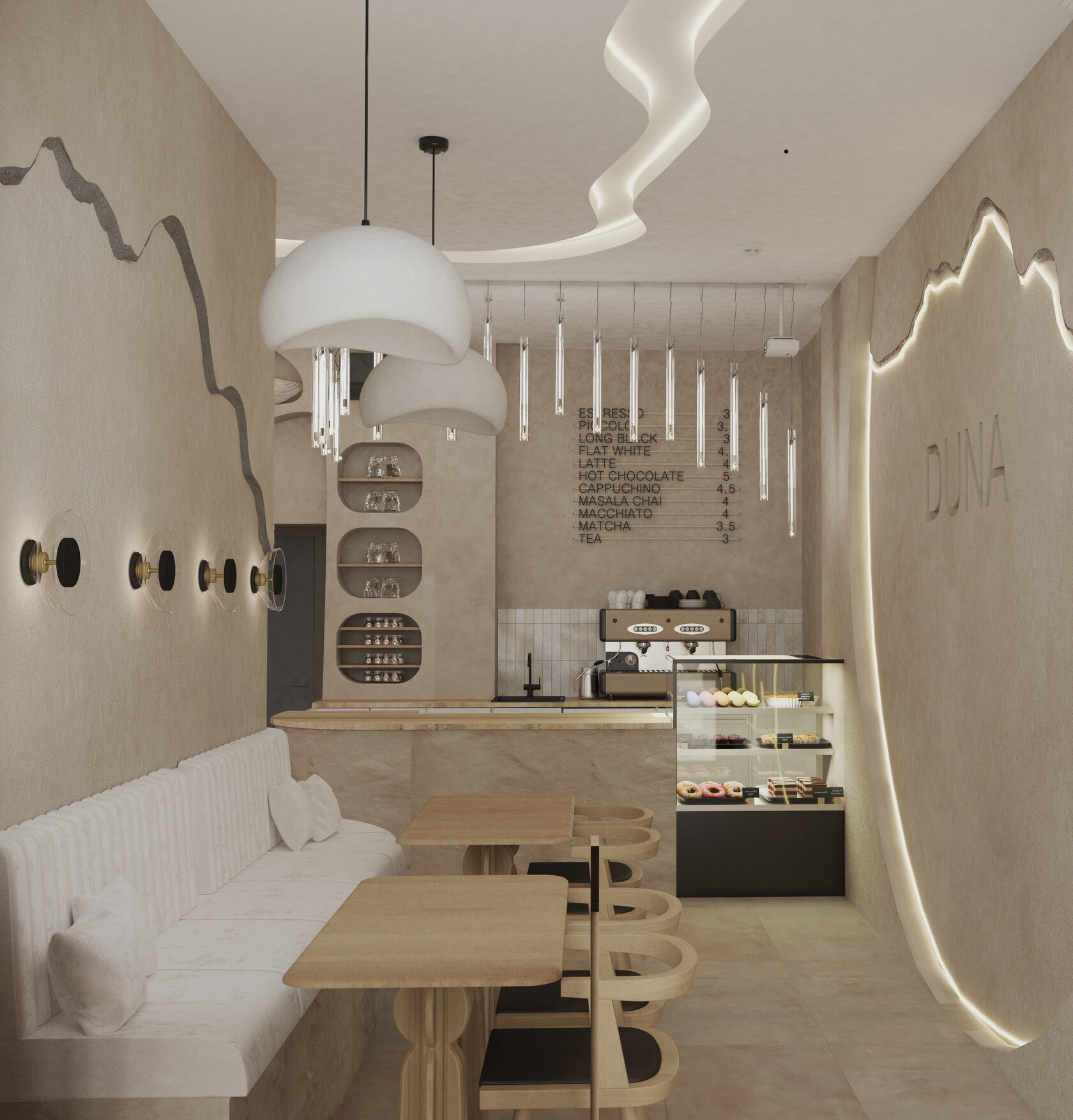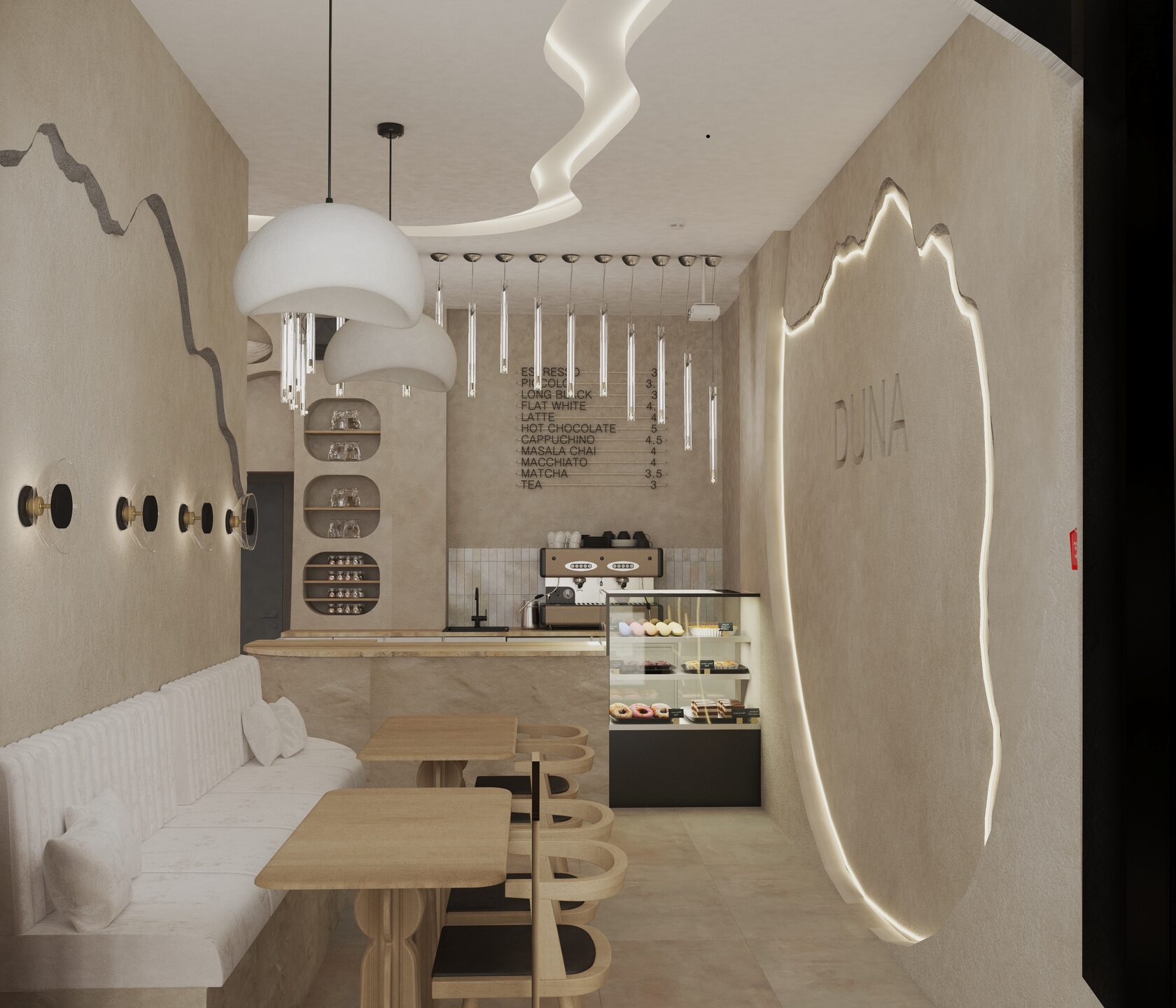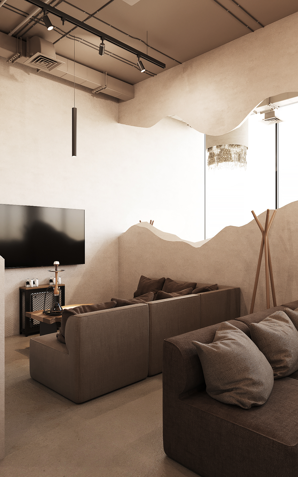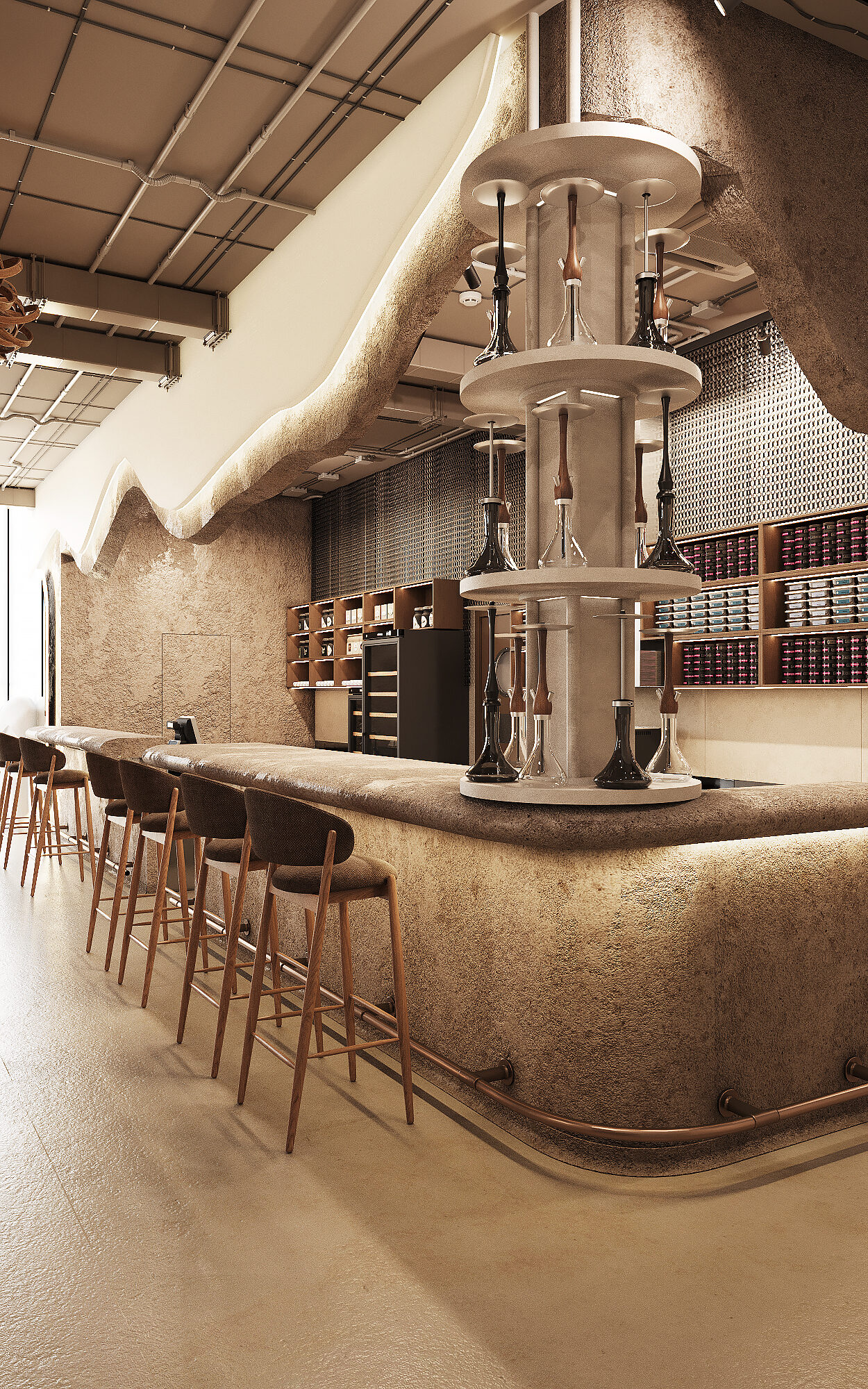 Этот проект представляет собой смелое воплощение идеи заказчика — создание пространства, полностью погружающего в атмосферу бесконечных дюн, золотого песка и палящего солнца пустыни. Кафе является образцом экостиля, где каждый элемент отражает гармонию природы.