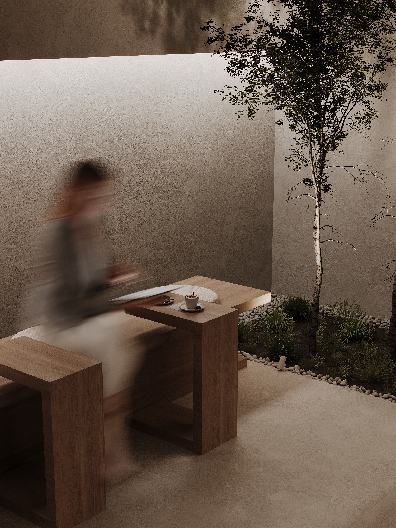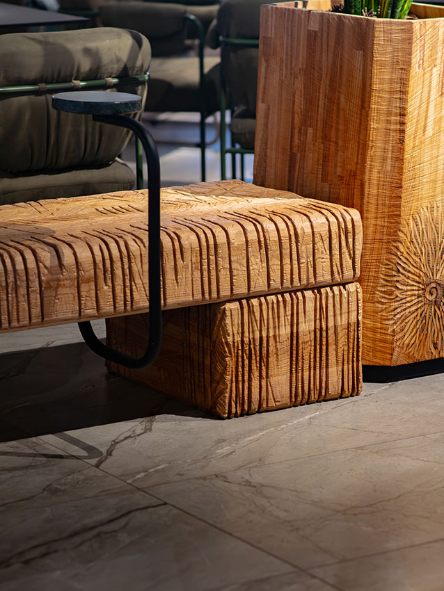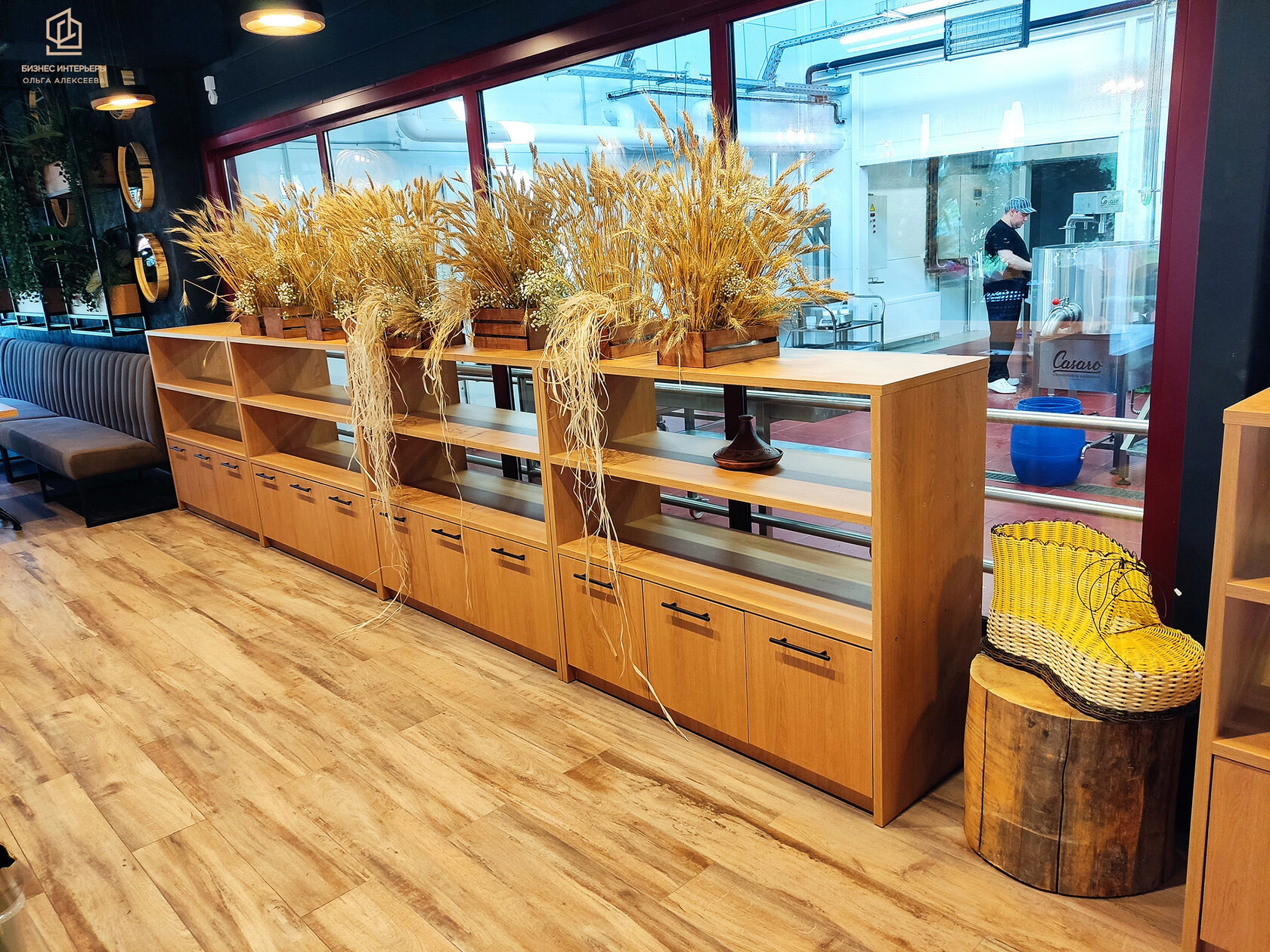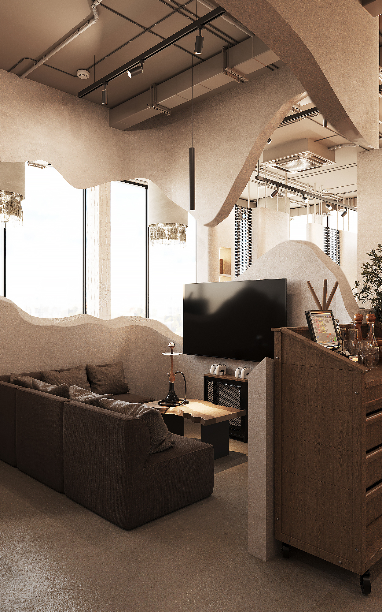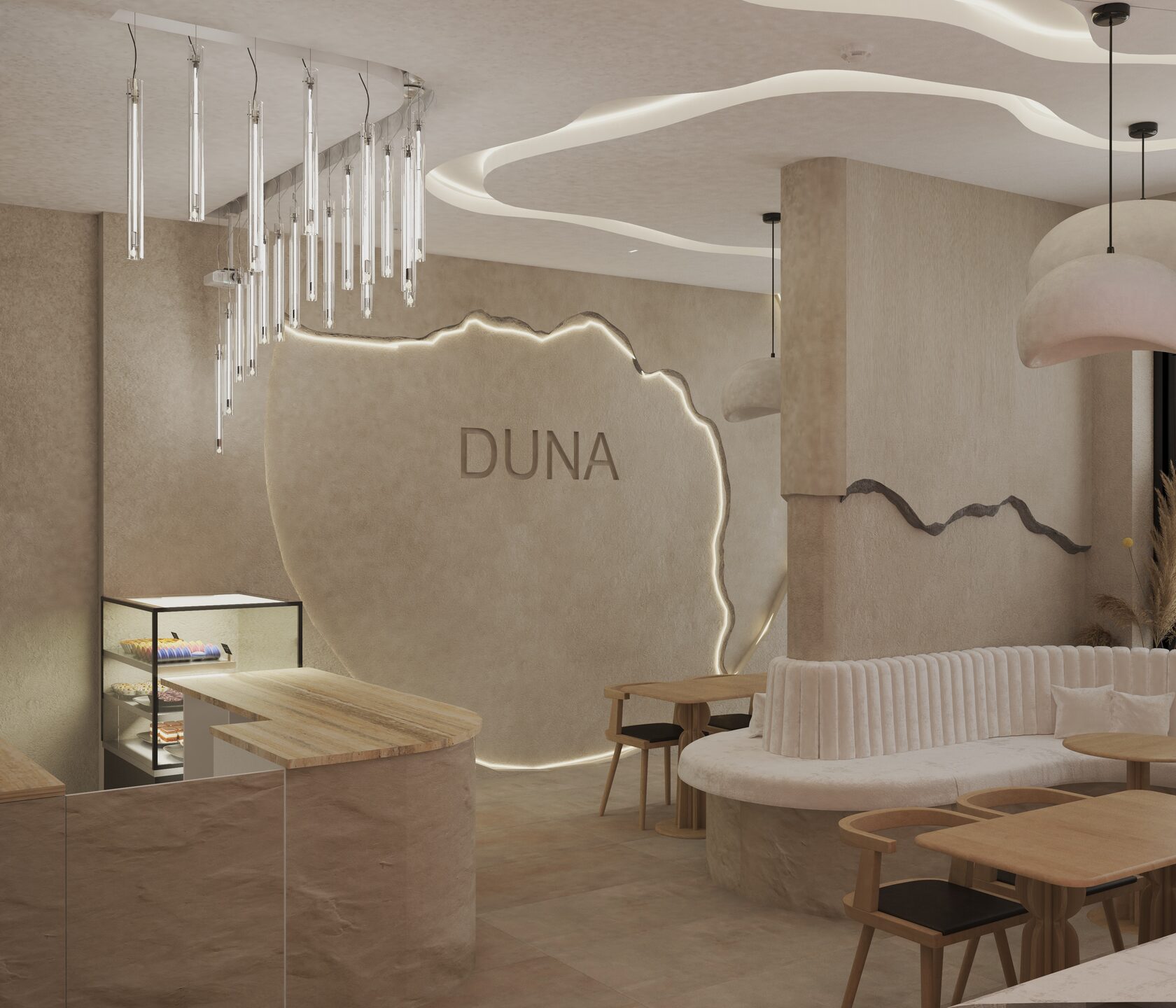 Этот проект представляет собой смелое воплощение идеи заказчика — создание пространства, полностью погружающего в атмосферу бесконечных дюн, золотого песка и палящего солнца пустыни. Кафе является образцом экостиля, где каждый элемент отражает гармонию природы.