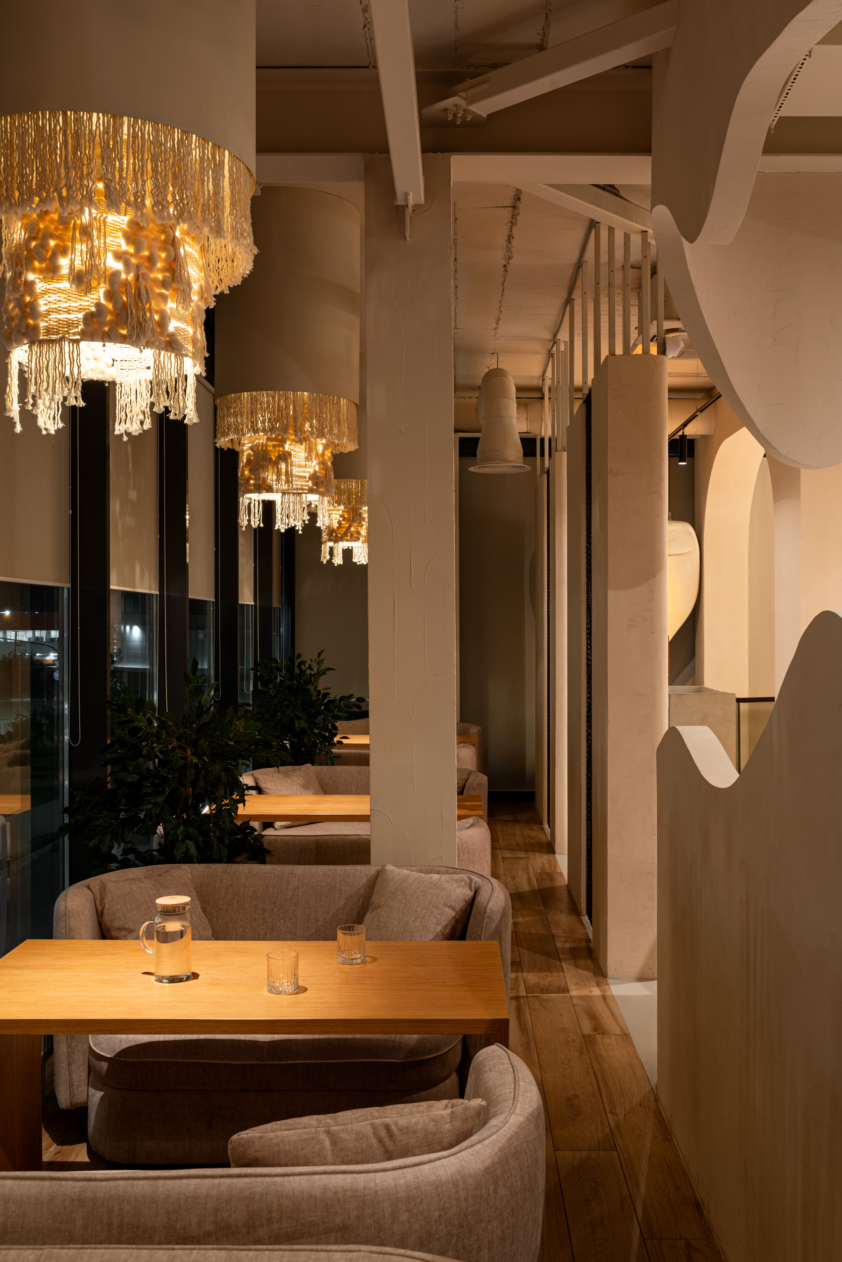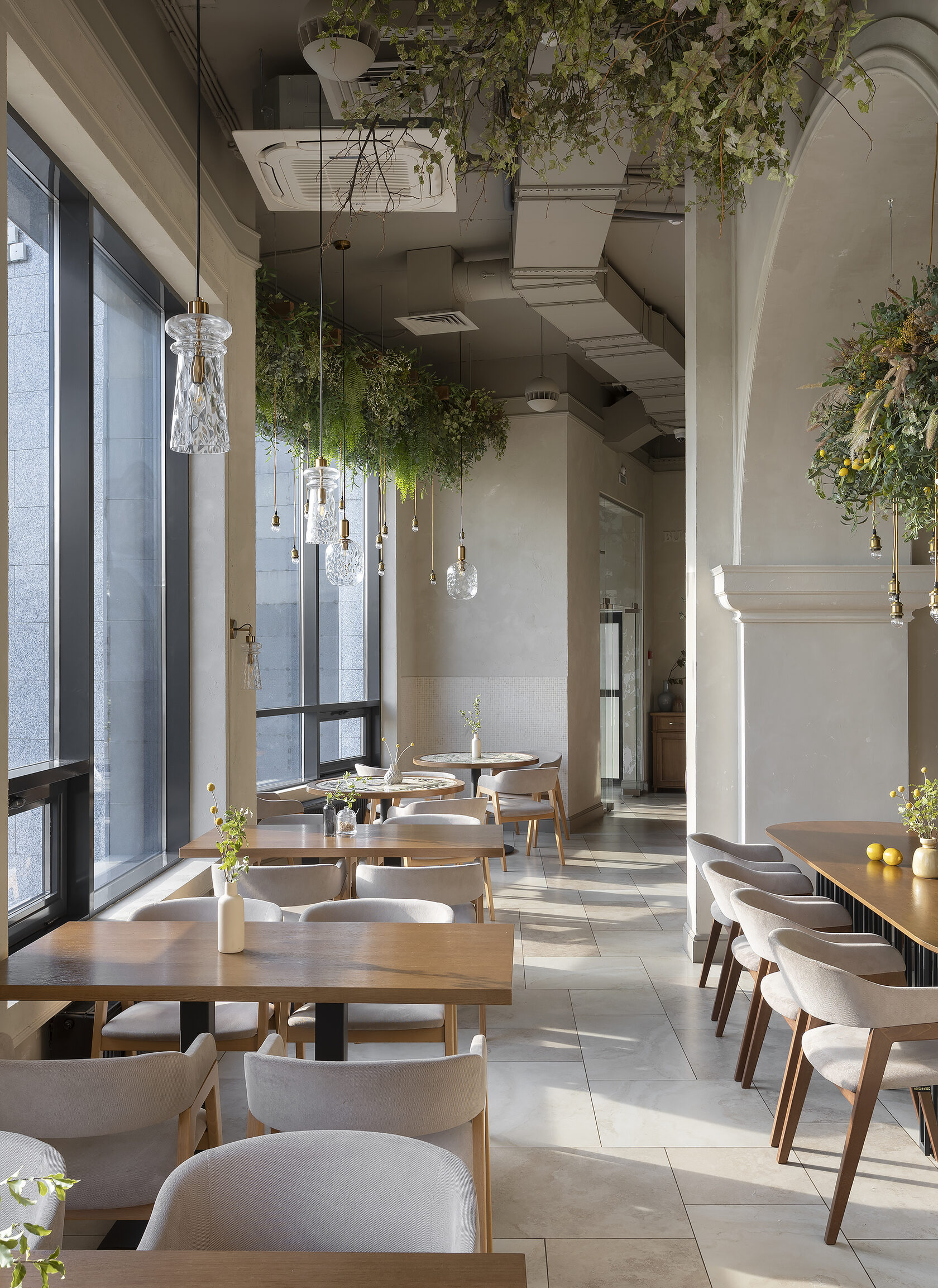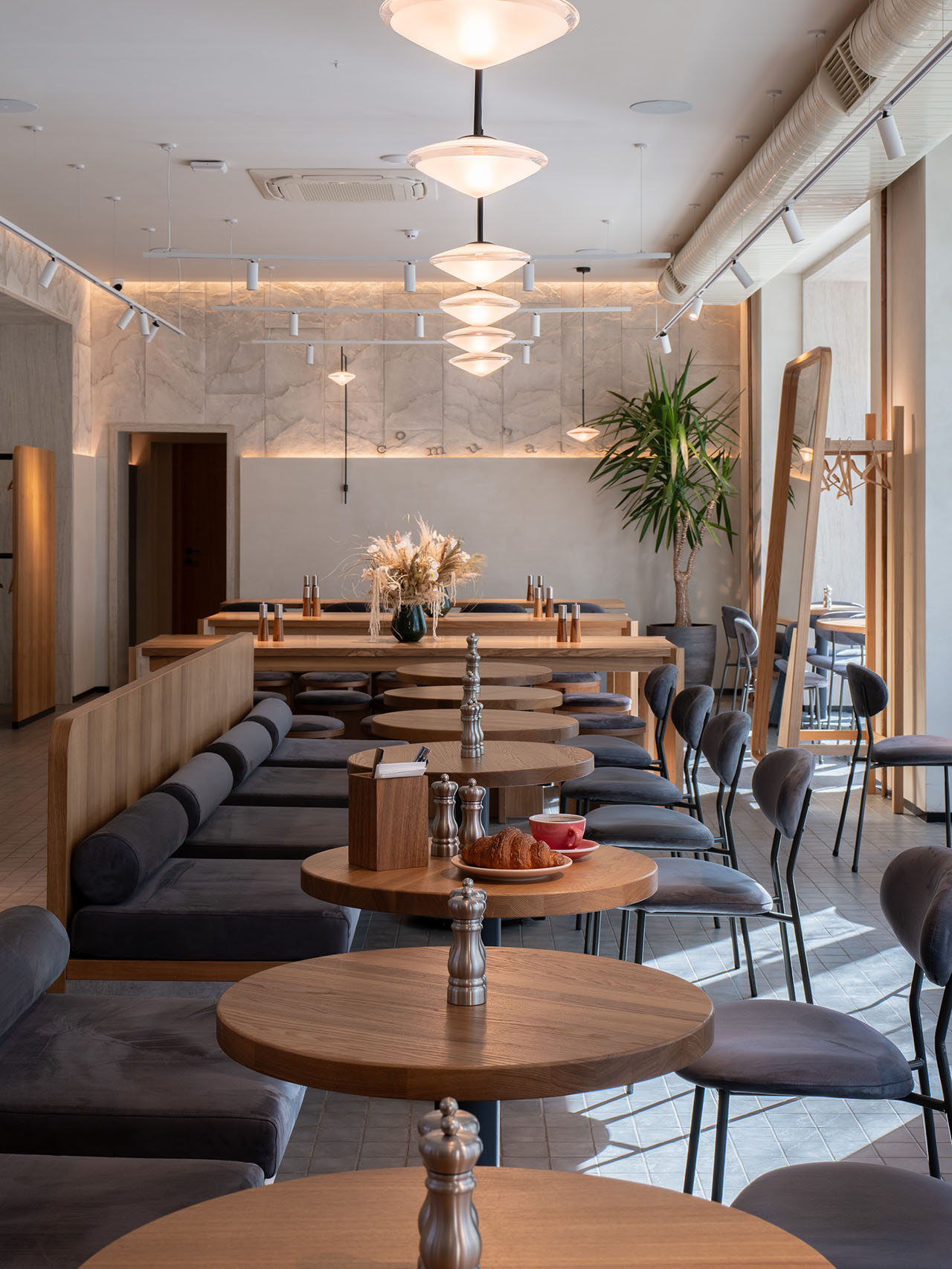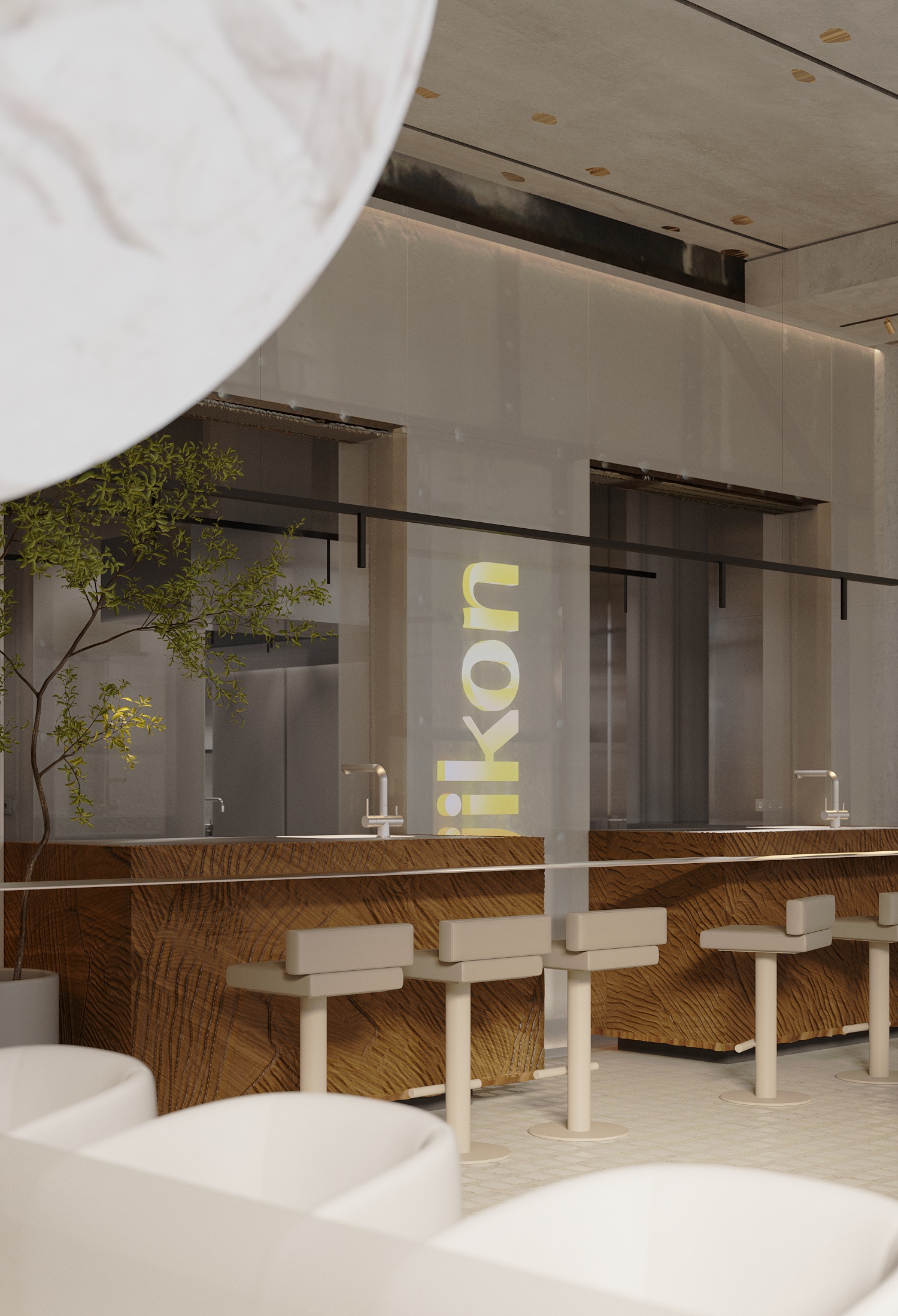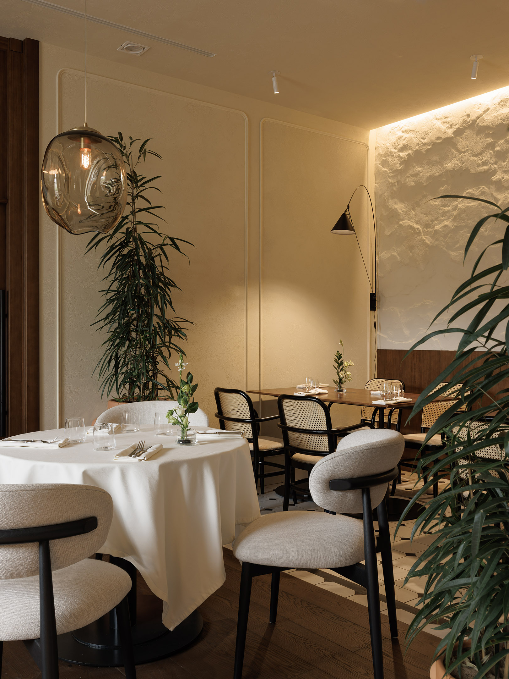 Концепция: В основе дизайна лежит стремление к чистоте и легкости, где каждая деталь играет ключевую роль. Отделка из светлого травертина, натурального дерева и фактур камня создает ощущение роскоши и спокойствия. Искусно спроектированная мебель с безупречными узлами, скрытый за зеркалами гардероб и тонкий внутренний брендинг подчеркивают продуманность. Главной особенностью является фасадный витраж, который трансформирует зал в летнюю веранду, стирая границы между внутренним и внешним пространством, а также тщательно выверенный свет и открытая планировка, усиливающие концепцию современного легкого ресторана.