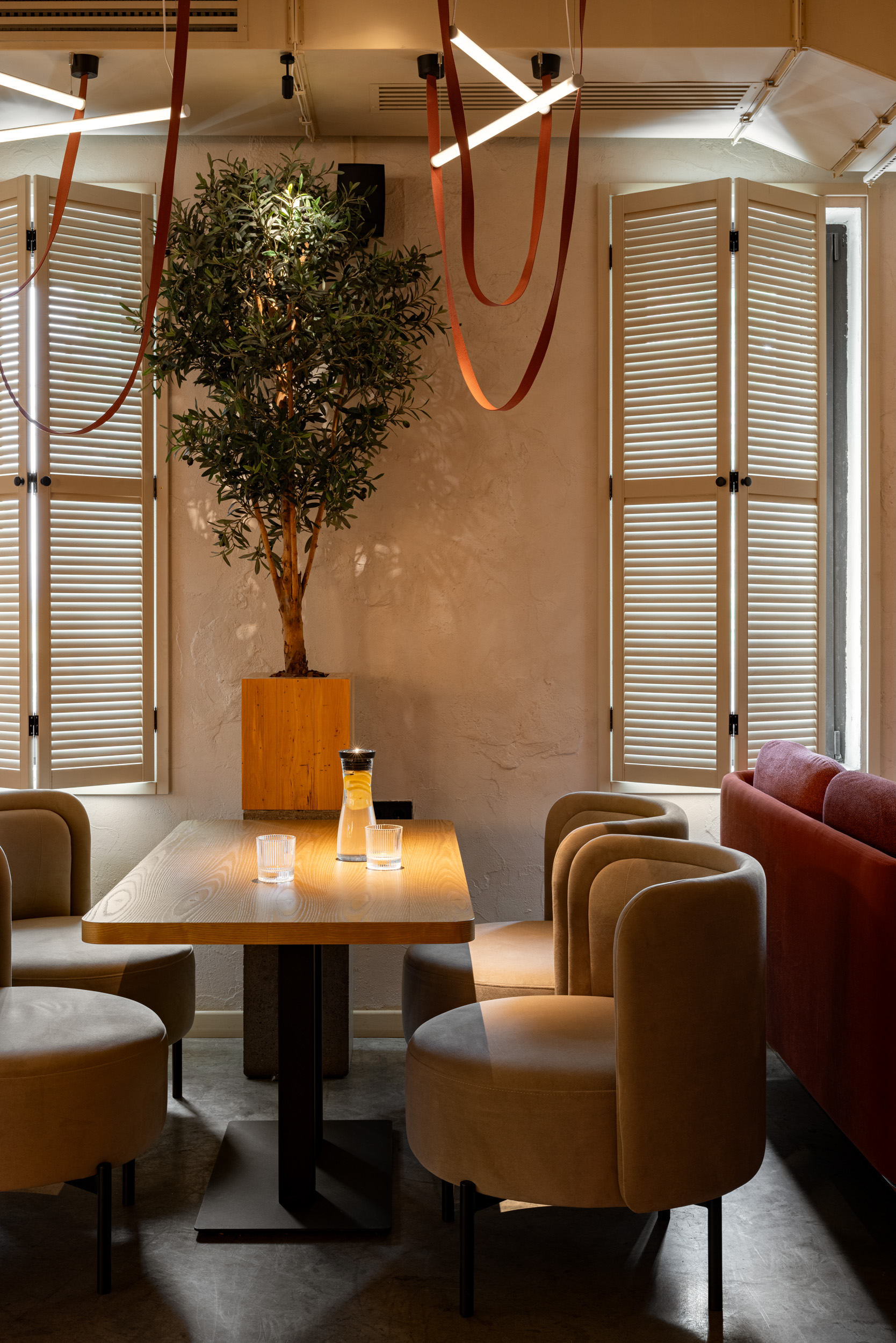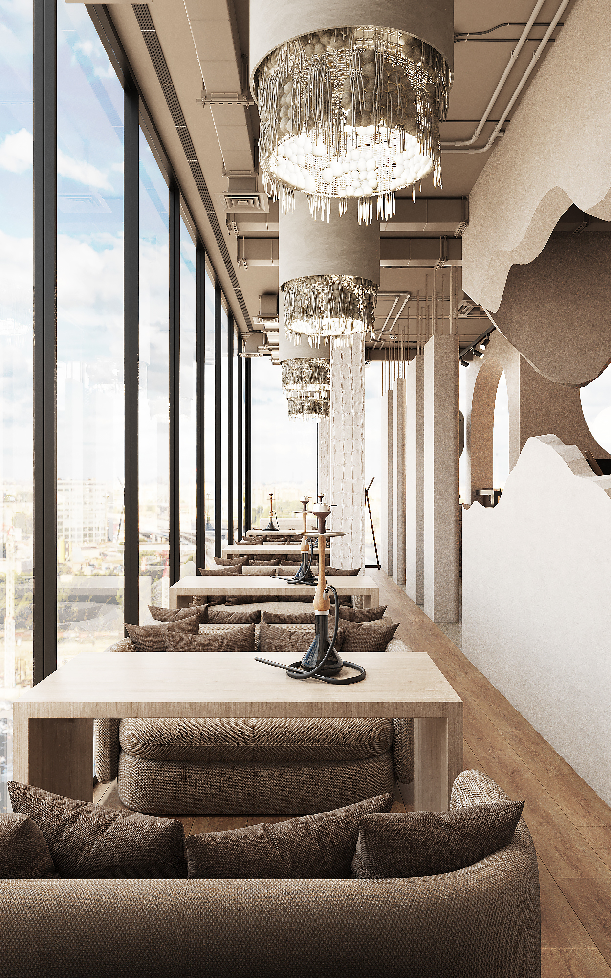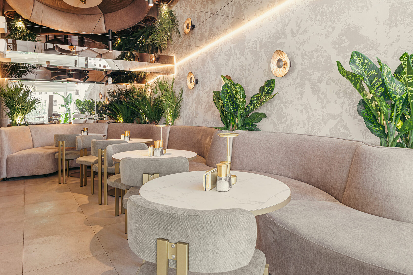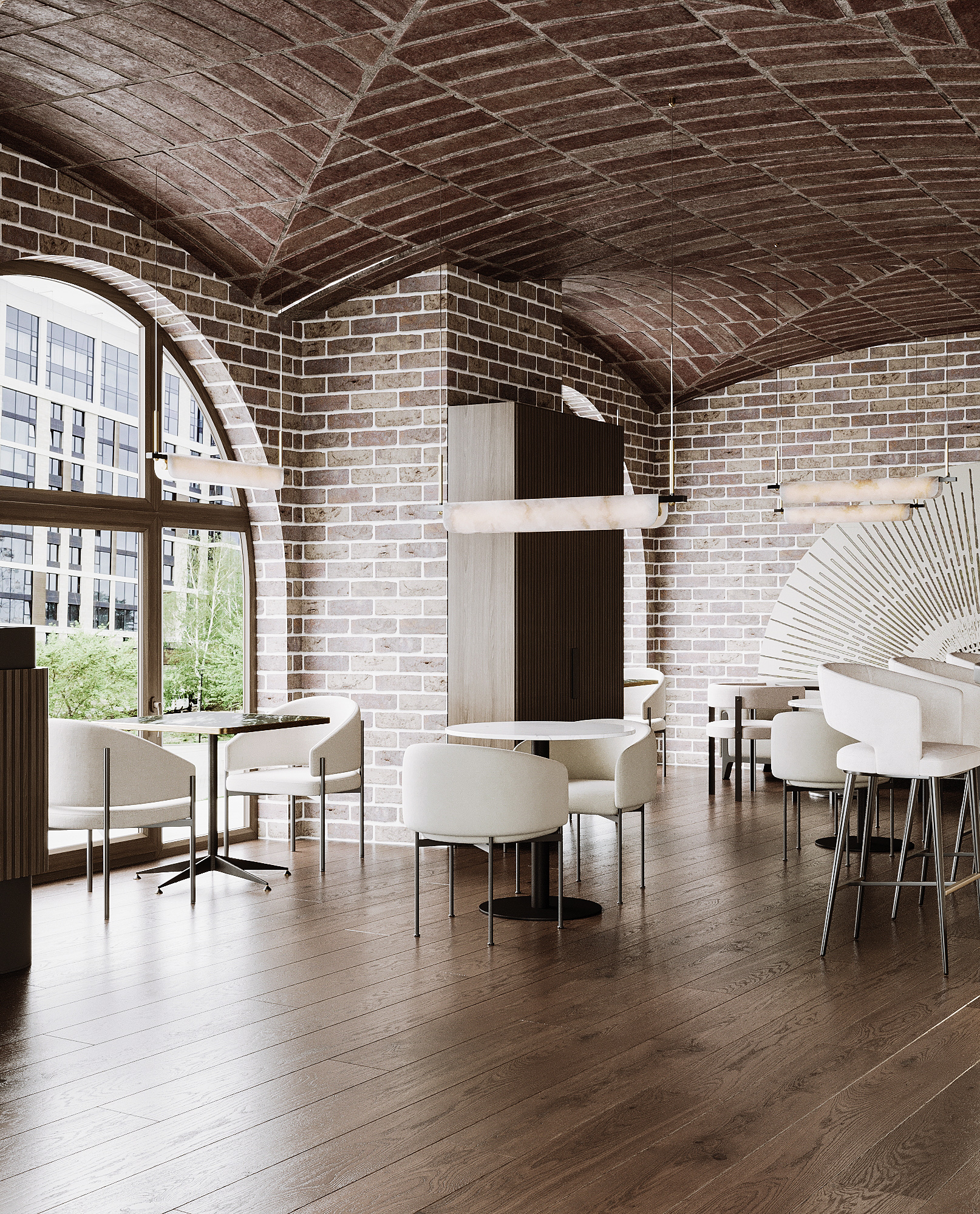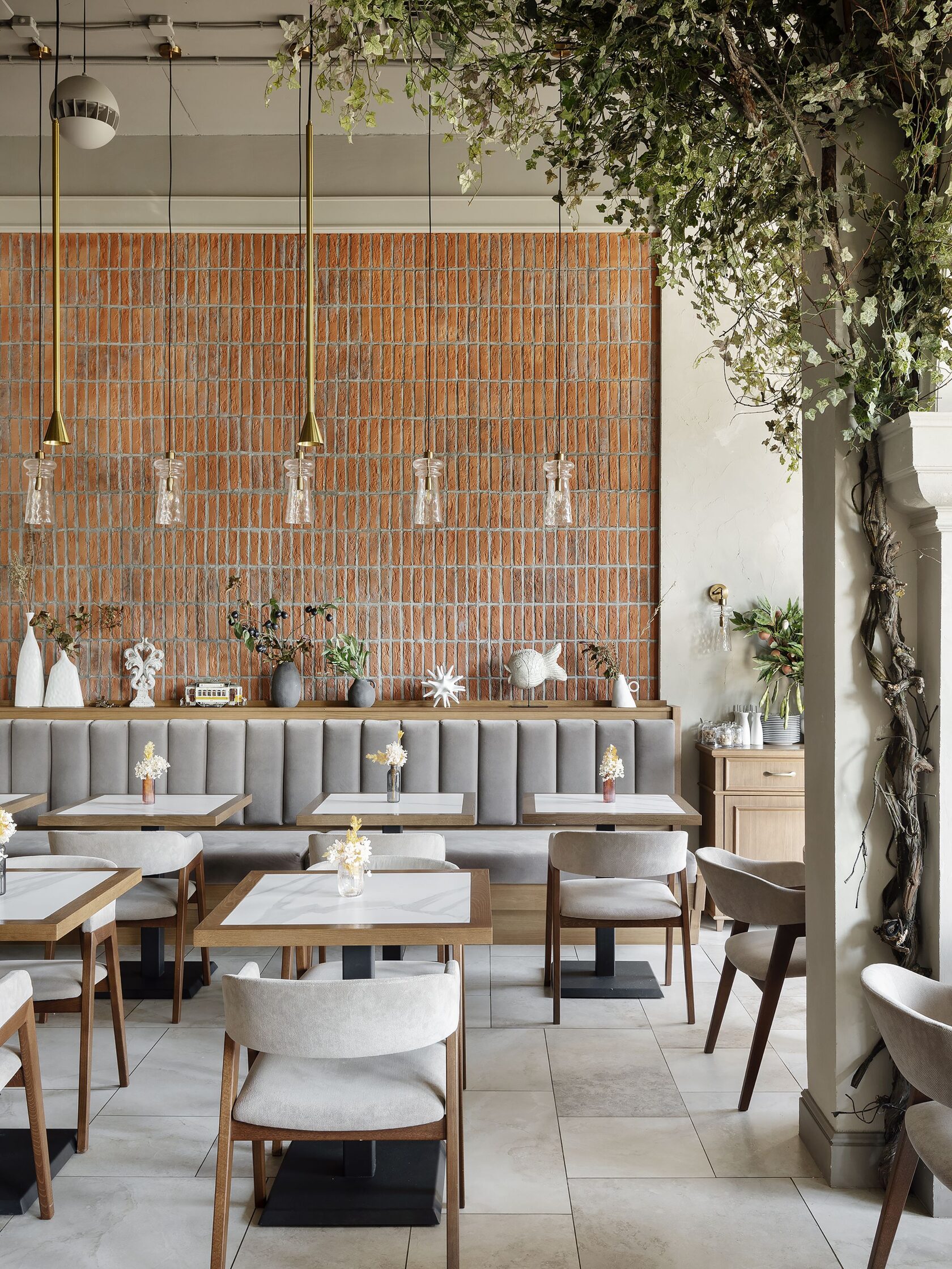 Концепция: В основе дизайна лежит стремление к чистоте и легкости, где каждая деталь играет ключевую роль. Отделка из светлого травертина, натурального дерева и фактур камня создает ощущение роскоши и спокойствия. Искусно спроектированная мебель с безупречными узлами, скрытый за зеркалами гардероб и тонкий внутренний брендинг подчеркивают продуманность. Главной особенностью является фасадный витраж, который трансформирует зал в летнюю веранду, стирая границы между внутренним и внешним пространством, а также тщательно выверенный свет и открытая планировка, усиливающие концепцию современного легкого ресторана.