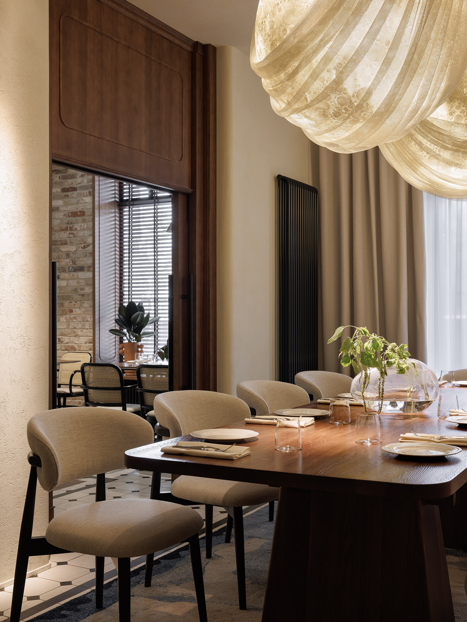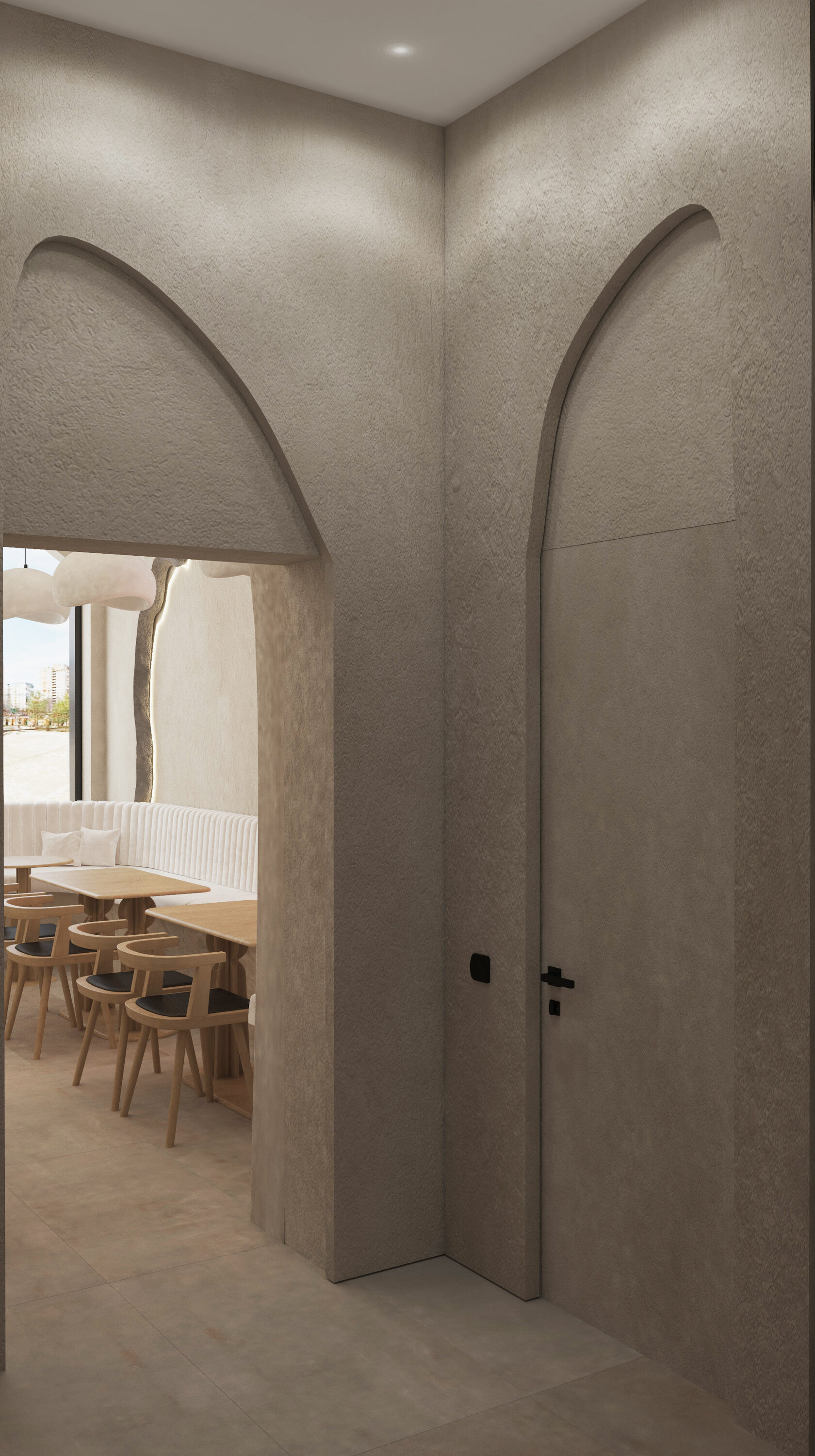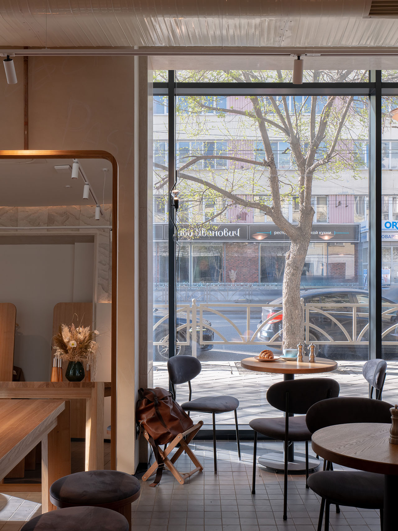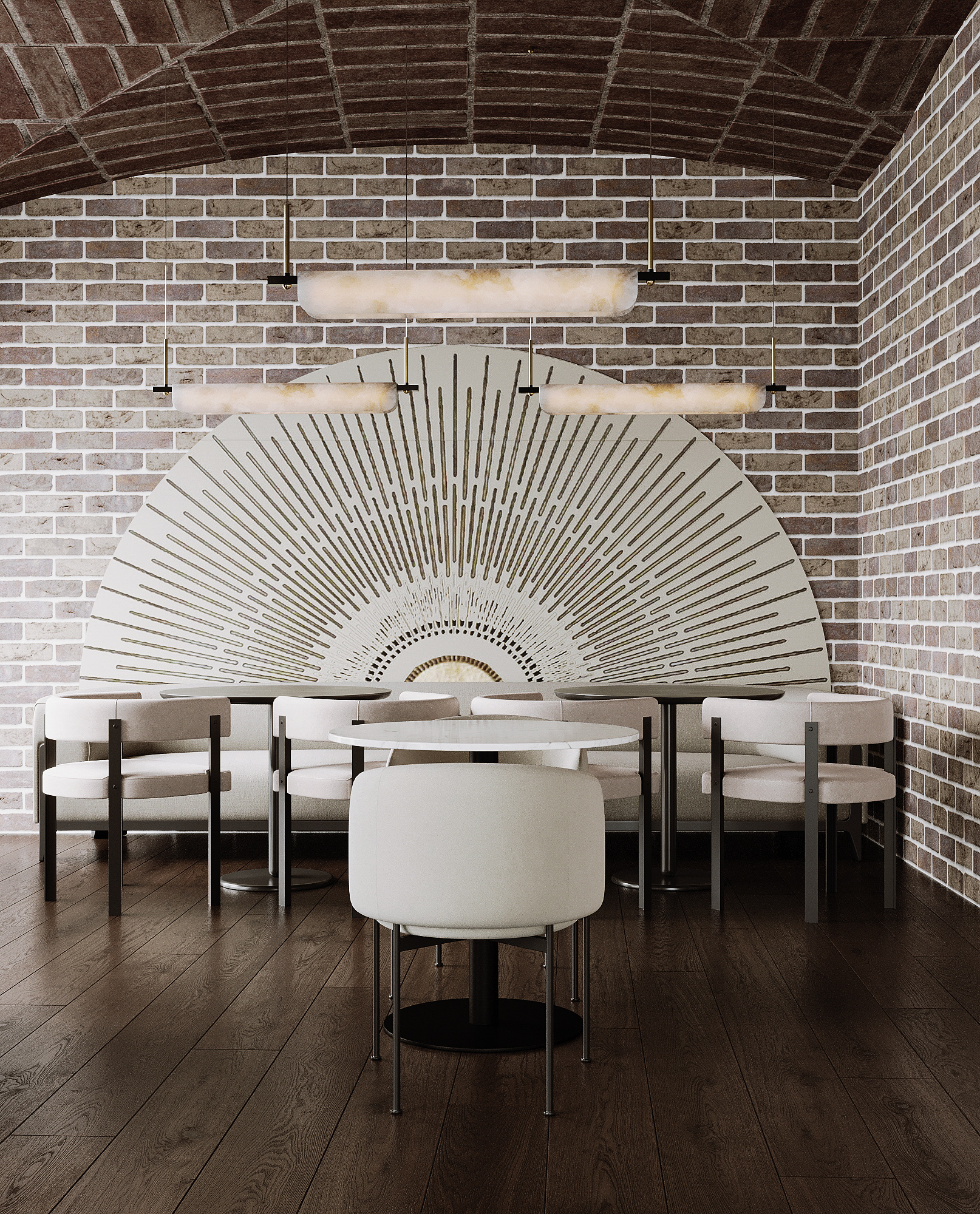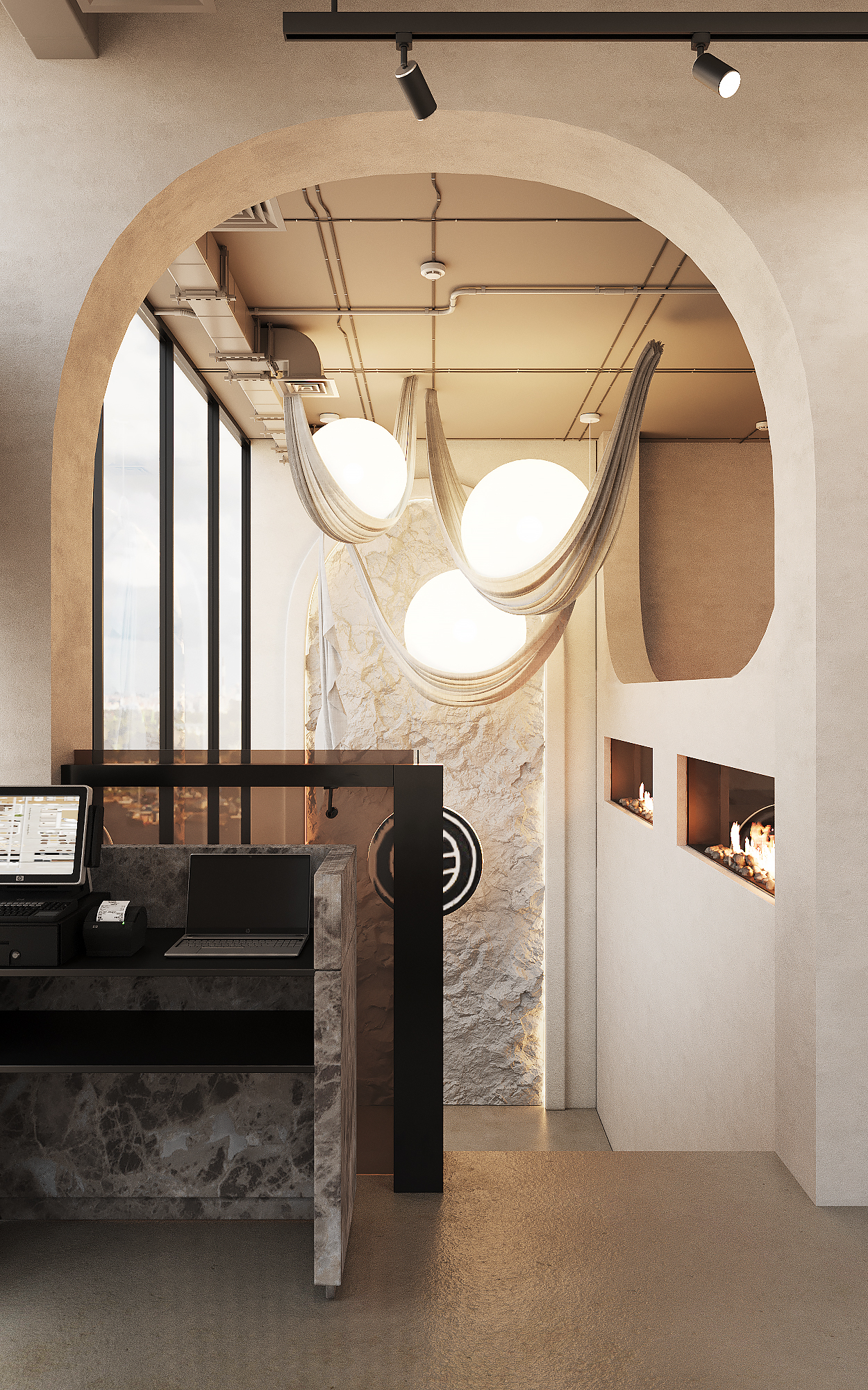 Концепция: В основе дизайна лежит стремление к чистоте и легкости, где каждая деталь играет ключевую роль. Отделка из светлого травертина, натурального дерева и фактур камня создает ощущение роскоши и спокойствия. Искусно спроектированная мебель с безупречными узлами, скрытый за зеркалами гардероб и тонкий внутренний брендинг подчеркивают продуманность. Главной особенностью является фасадный витраж, который трансформирует зал в летнюю веранду, стирая границы между внутренним и внешним пространством, а также тщательно выверенный свет и открытая планировка, усиливающие концепцию современного легкого ресторана.