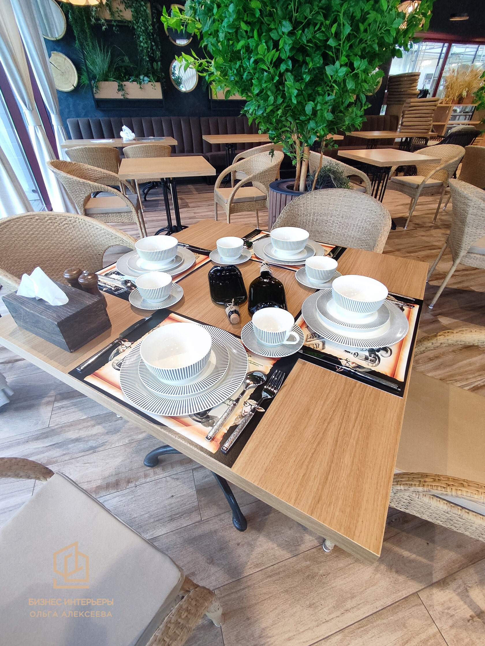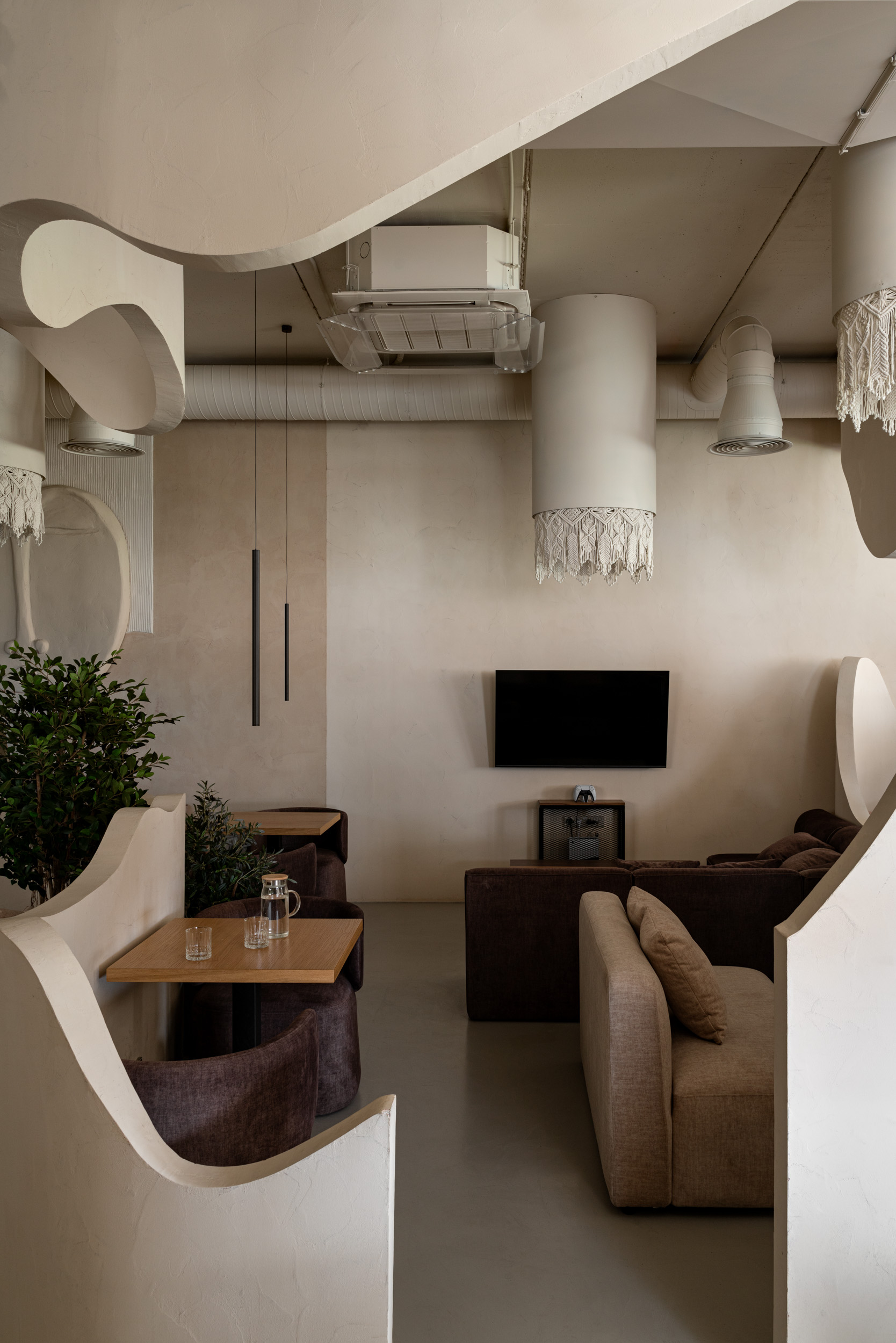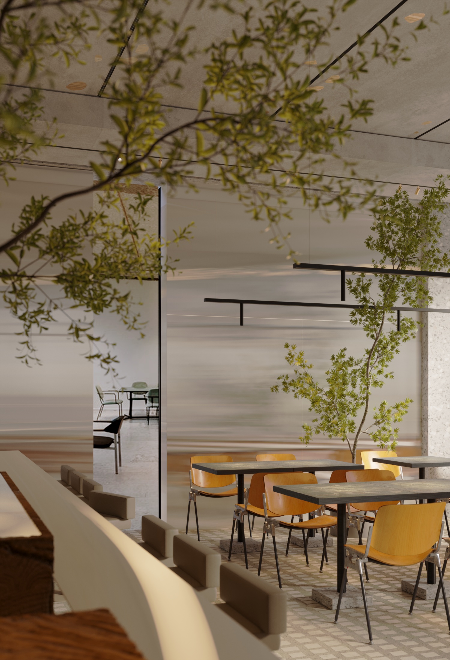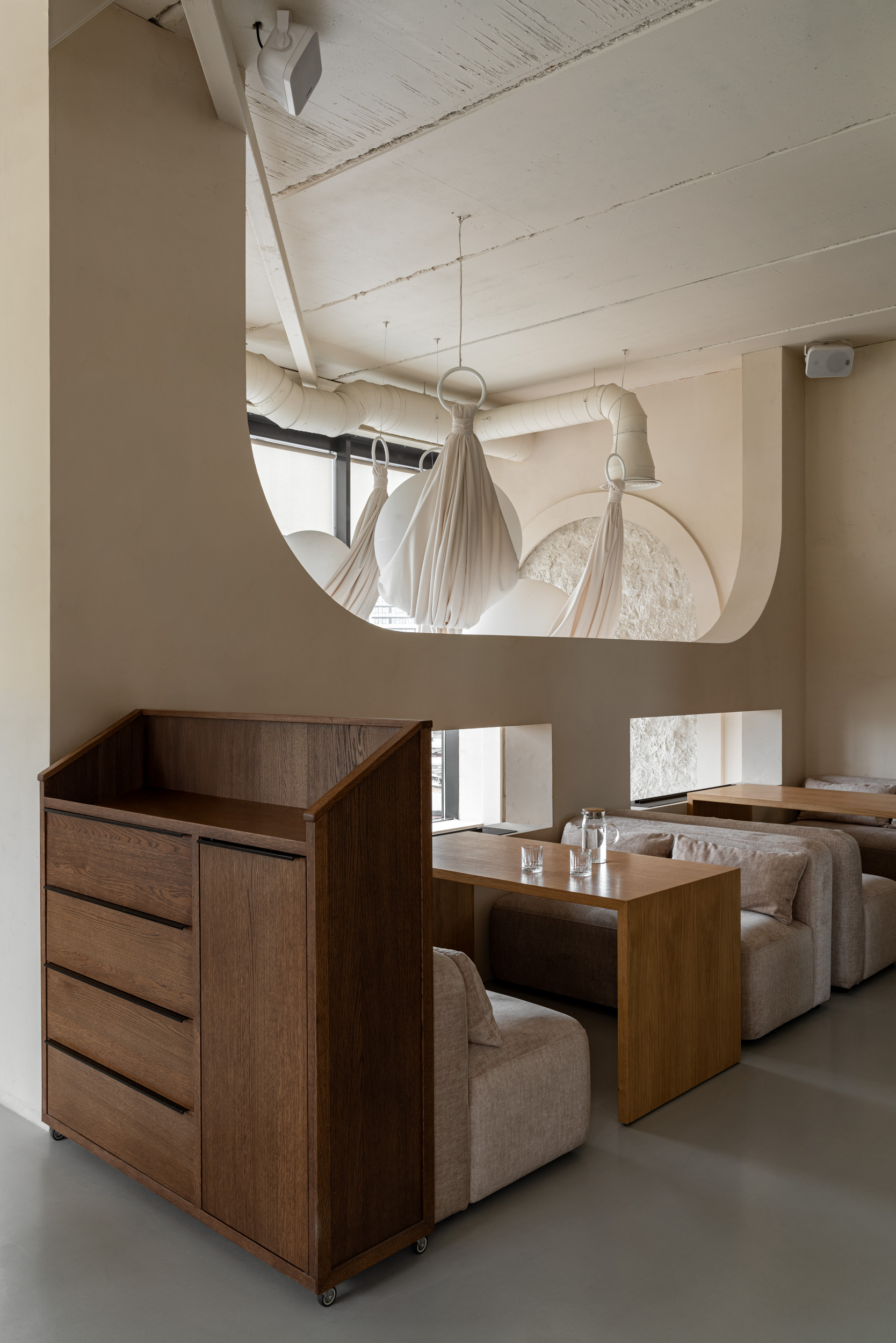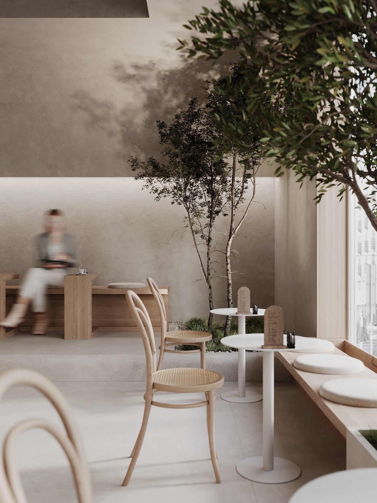 Концепция: В основе дизайна лежит стремление к чистоте и легкости, где каждая деталь играет ключевую роль. Отделка из светлого травертина, натурального дерева и фактур камня создает ощущение роскоши и спокойствия. Искусно спроектированная мебель с безупречными узлами, скрытый за зеркалами гардероб и тонкий внутренний брендинг подчеркивают продуманность. Главной особенностью является фасадный витраж, который трансформирует зал в летнюю веранду, стирая границы между внутренним и внешним пространством, а также тщательно выверенный свет и открытая планировка, усиливающие концепцию современного легкого ресторана.