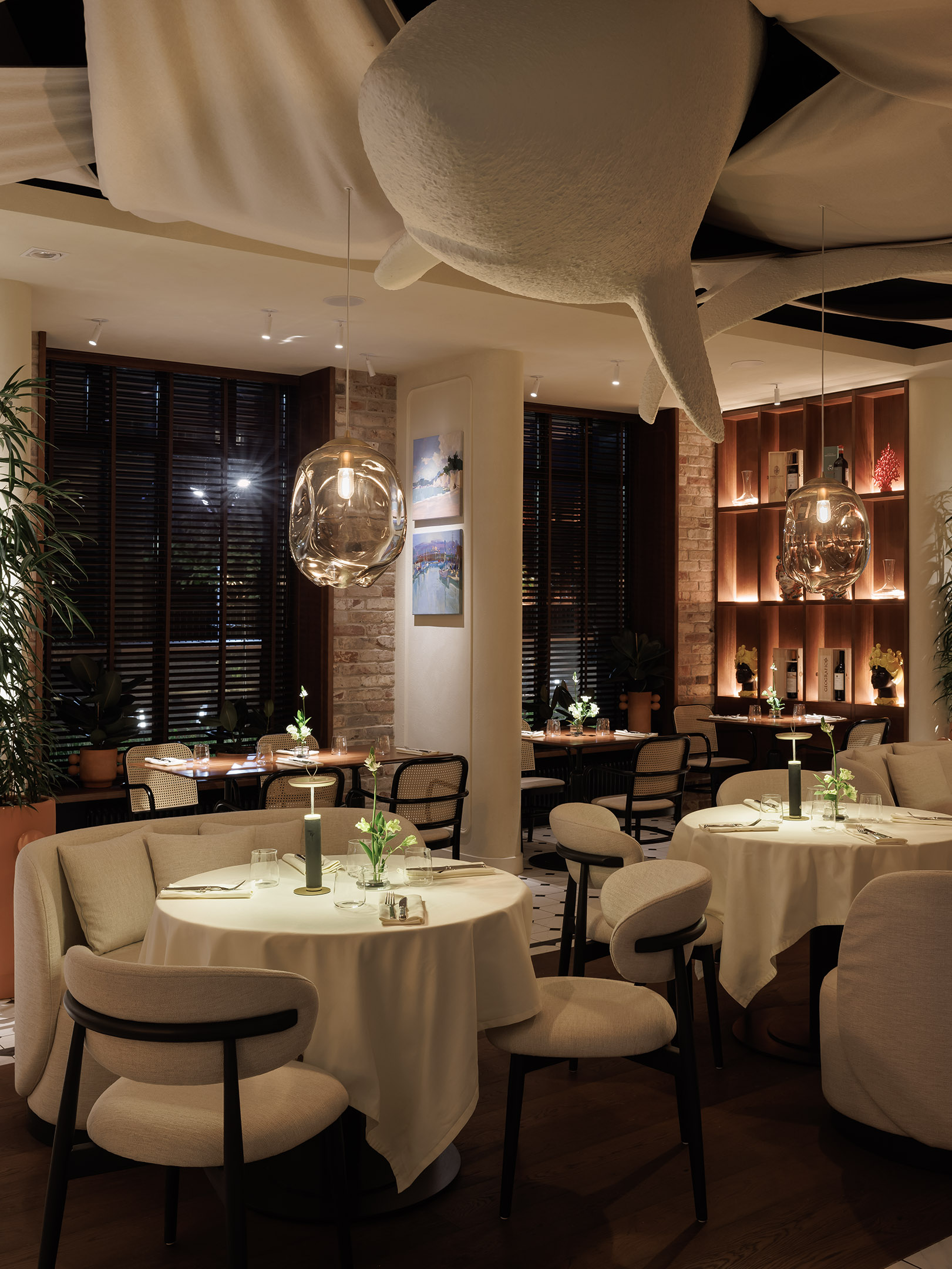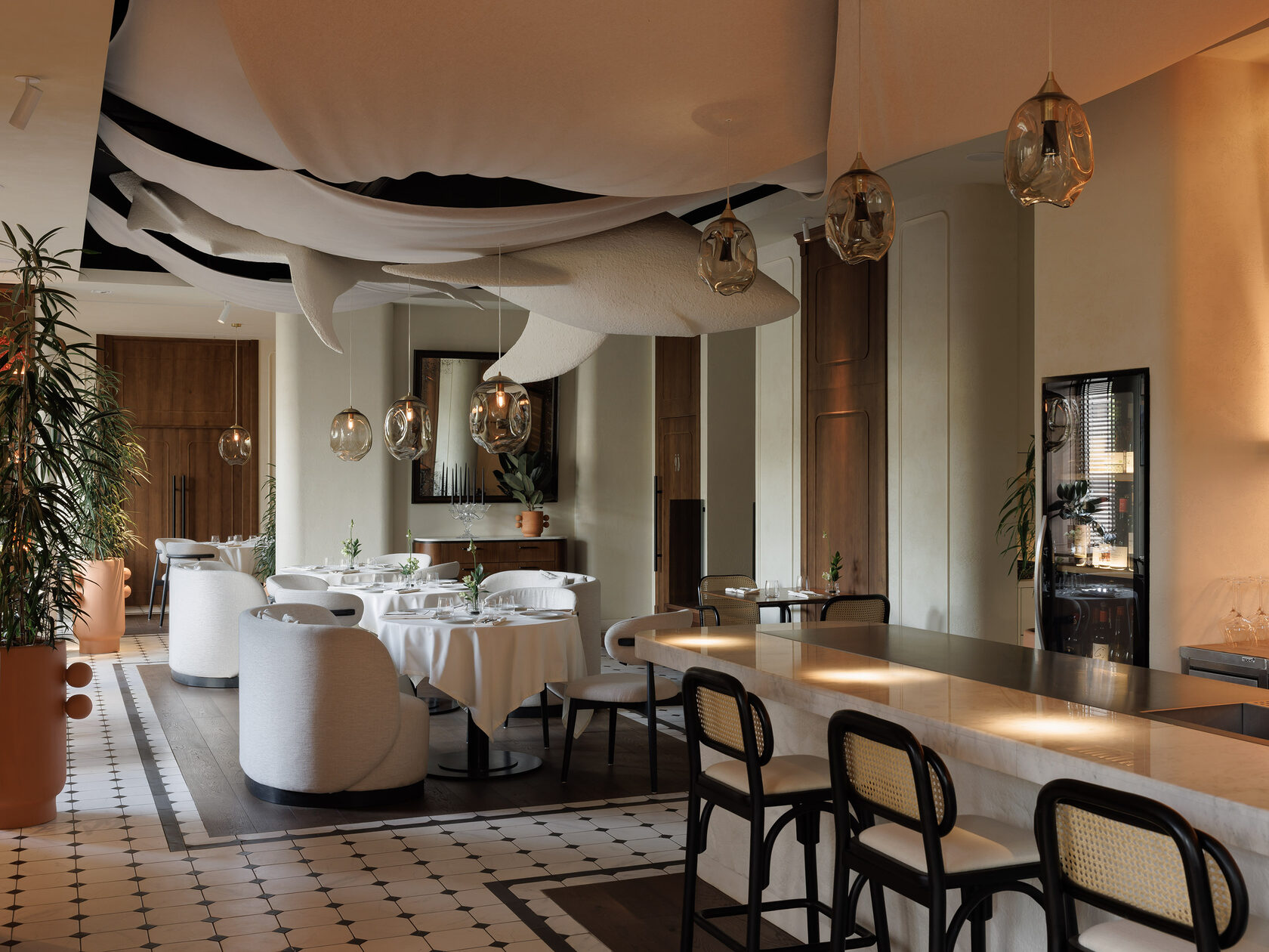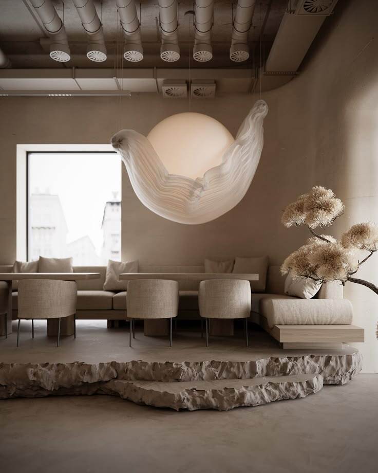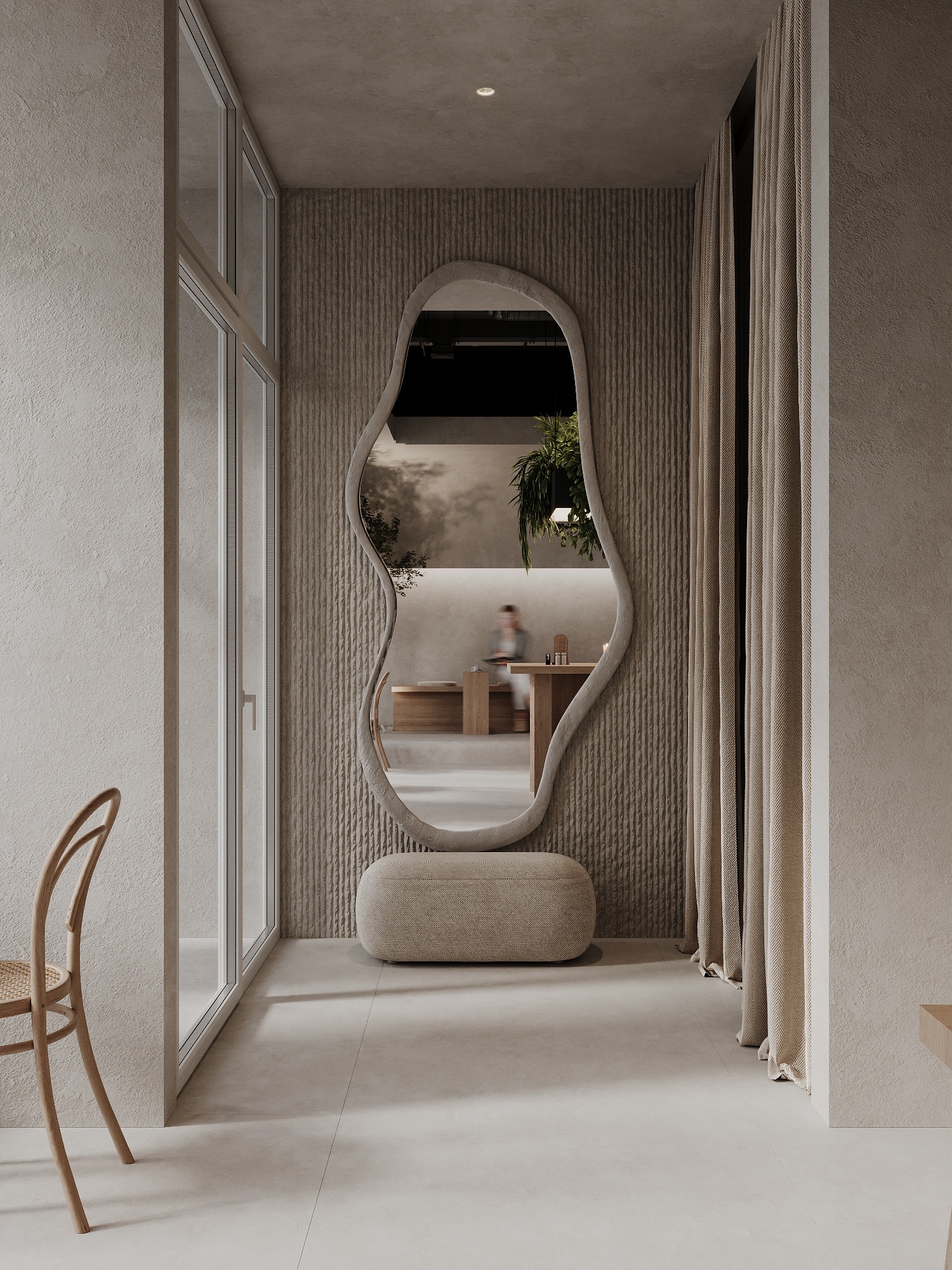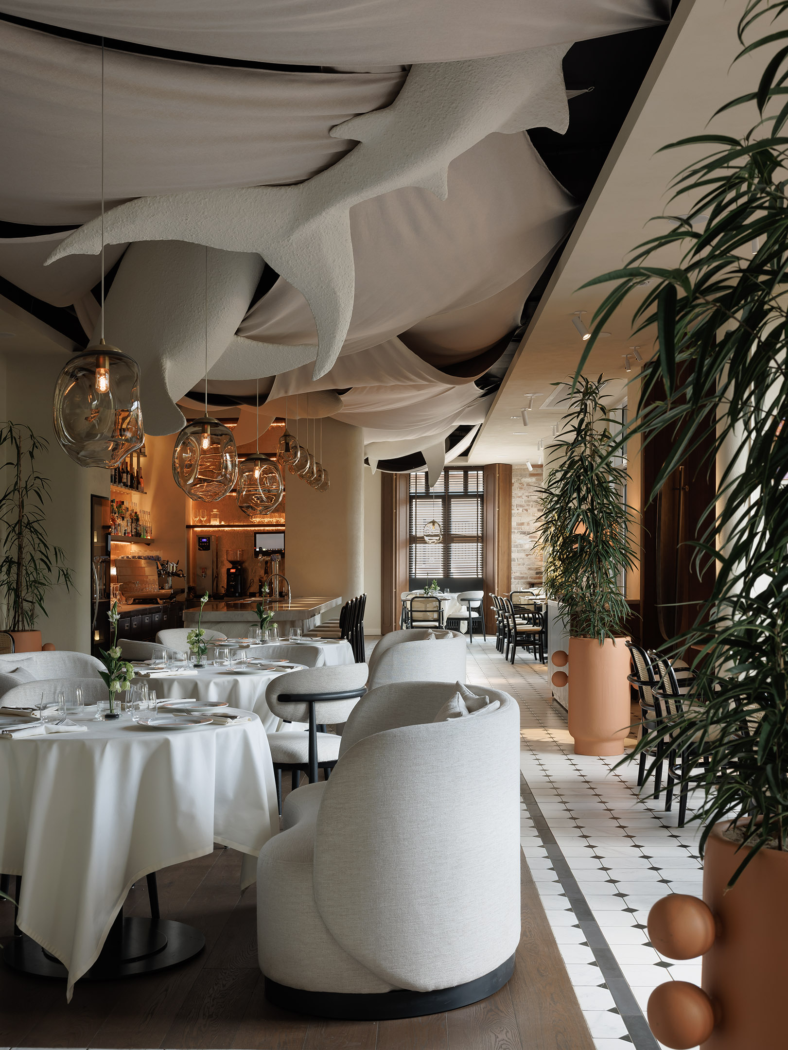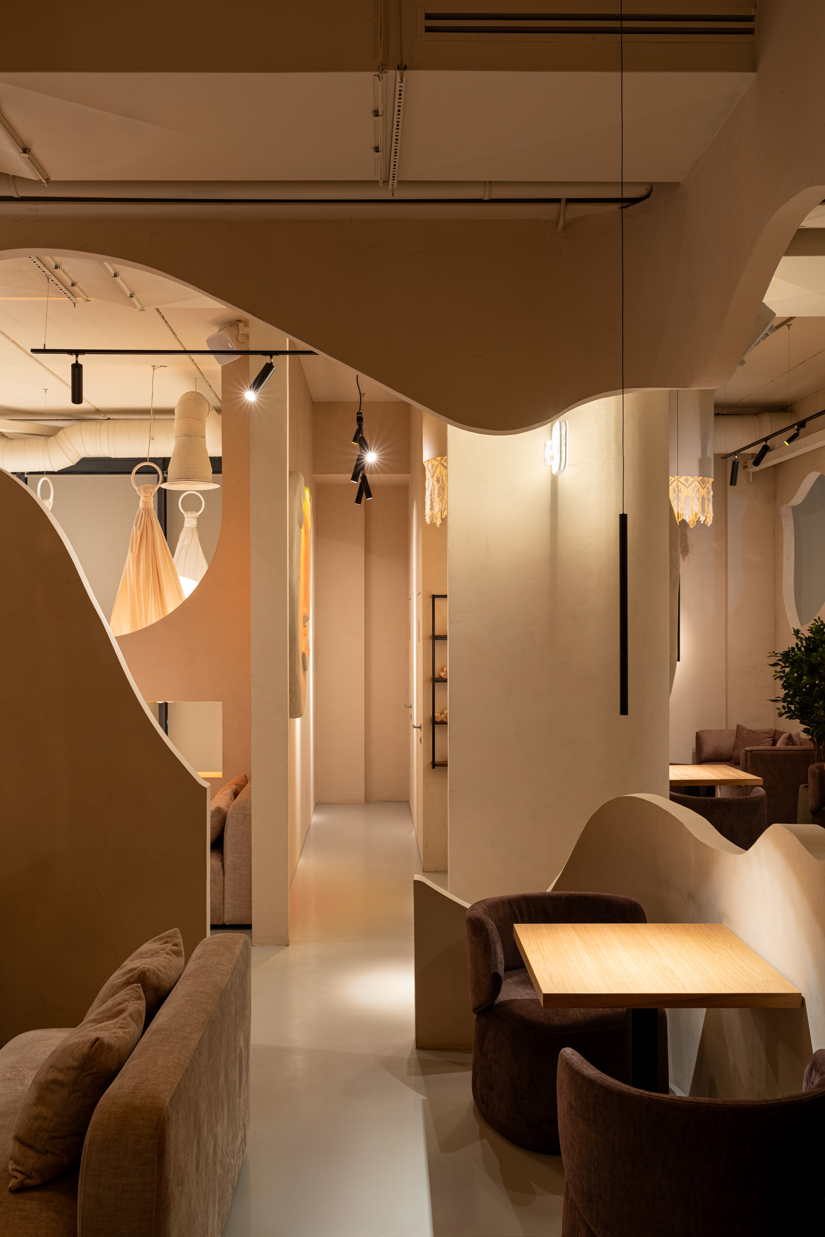 Концепция: В основе дизайна лежит стремление к чистоте и легкости, где каждая деталь играет ключевую роль. Отделка из светлого травертина, натурального дерева и фактур камня создает ощущение роскоши и спокойствия. Искусно спроектированная мебель с безупречными узлами, скрытый за зеркалами гардероб и тонкий внутренний брендинг подчеркивают продуманность. Главной особенностью является фасадный витраж, который трансформирует зал в летнюю веранду, стирая границы между внутренним и внешним пространством, а также тщательно выверенный свет и открытая планировка, усиливающие концепцию современного легкого ресторана.