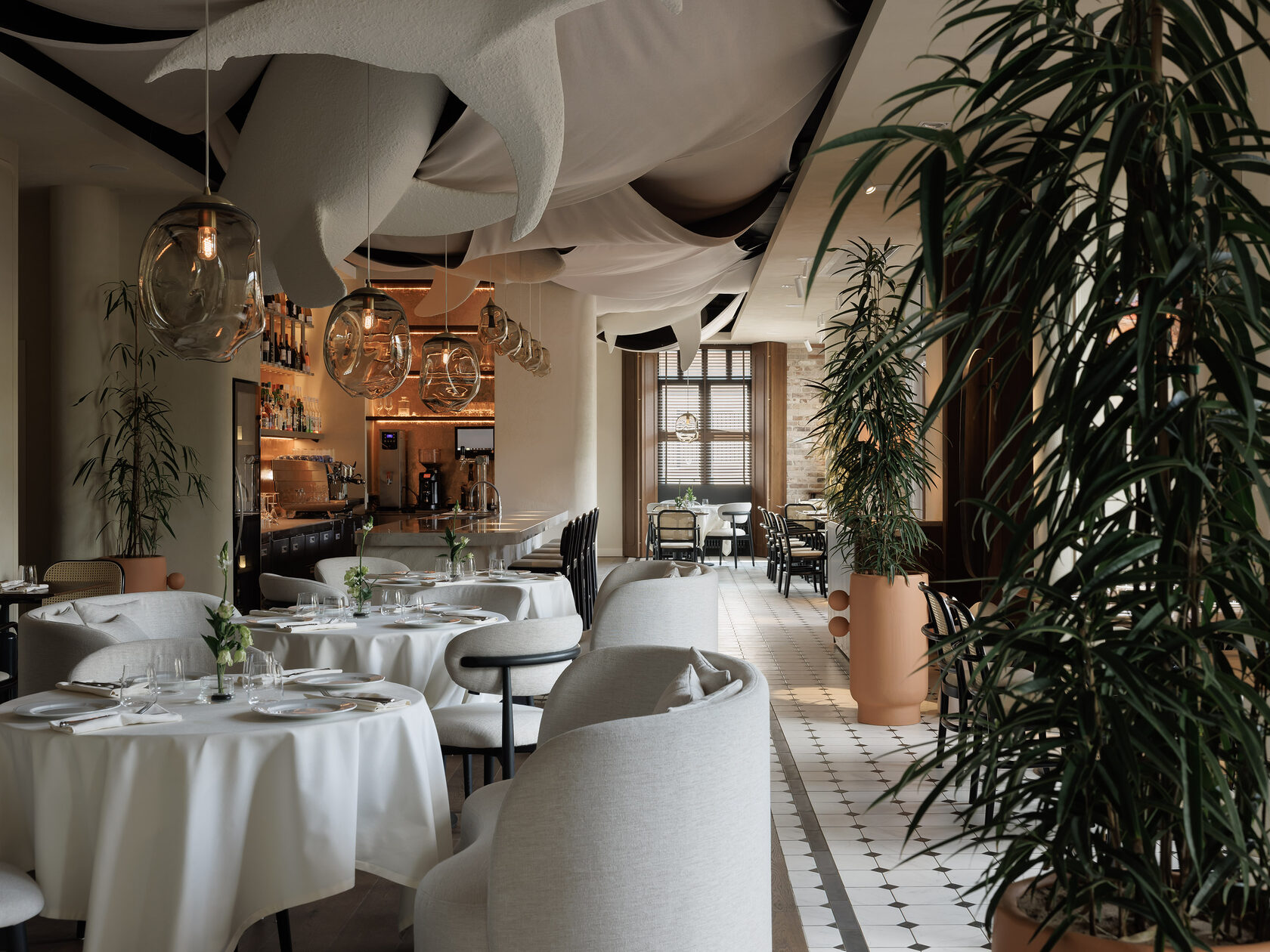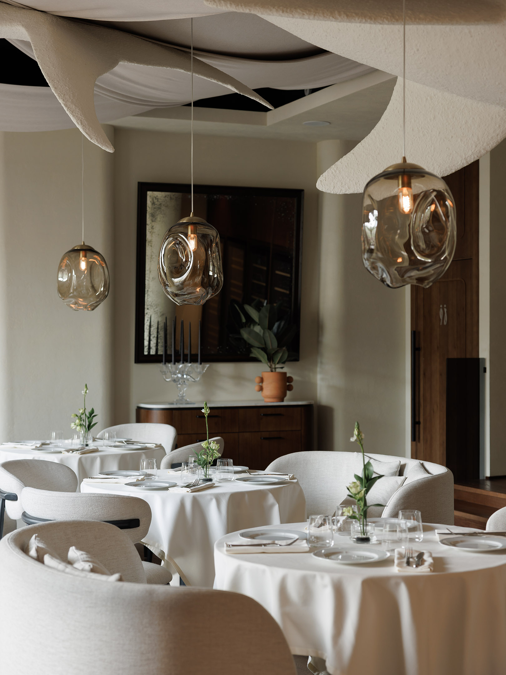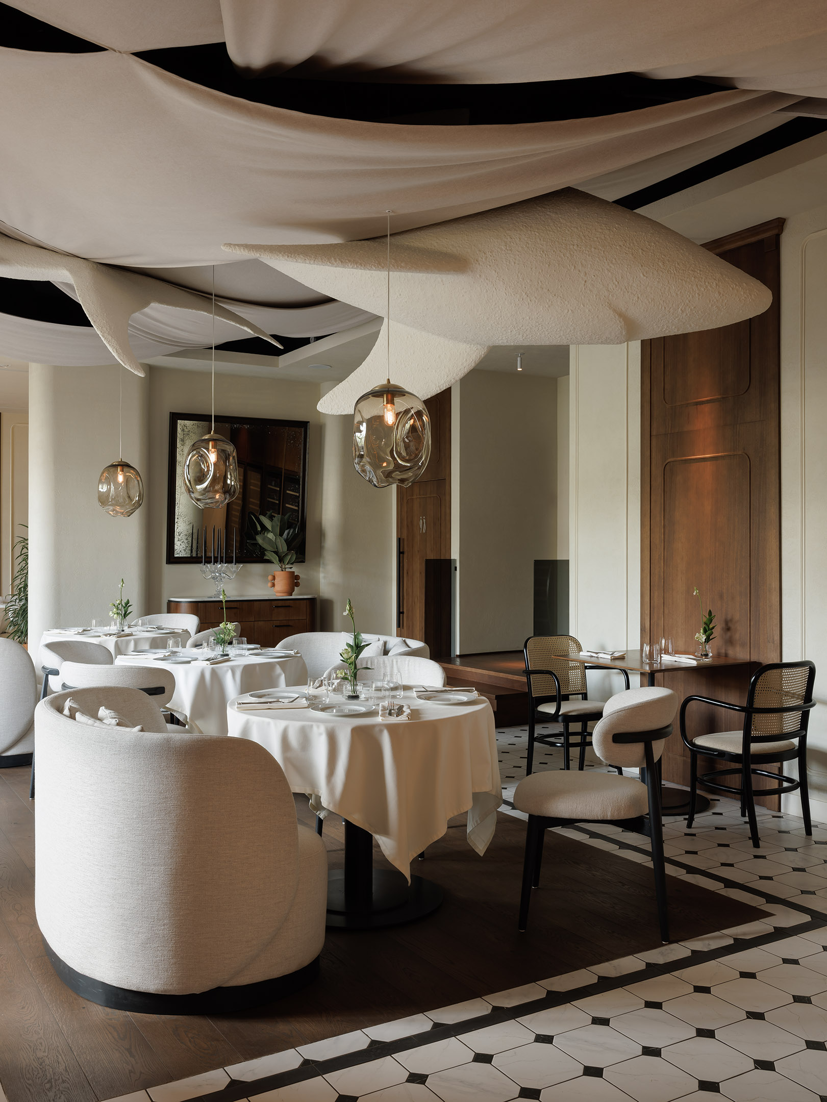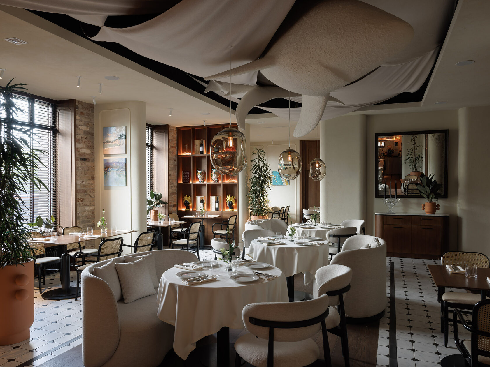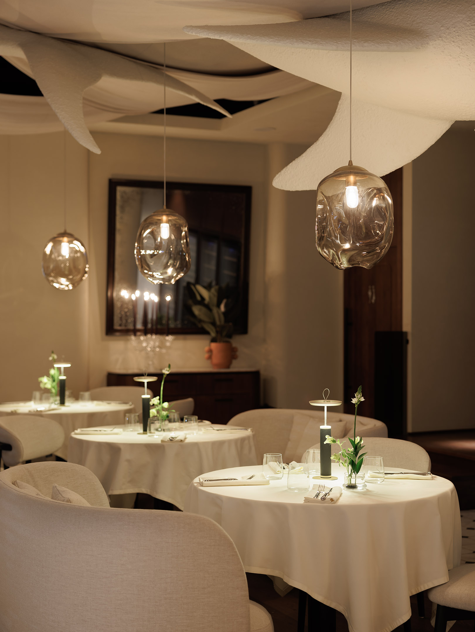 Концепция: В основе дизайна лежит стремление к чистоте и легкости, где каждая деталь играет ключевую роль. Отделка из светлого травертина, натурального дерева и фактур камня создает ощущение роскоши и спокойствия. Искусно спроектированная мебель с безупречными узлами, скрытый за зеркалами гардероб и тонкий внутренний брендинг подчеркивают продуманность. Главной особенностью является фасадный витраж, который трансформирует зал в летнюю веранду, стирая границы между внутренним и внешним пространством, а также тщательно выверенный свет и открытая планировка, усиливающие концепцию современного легкого ресторана.
