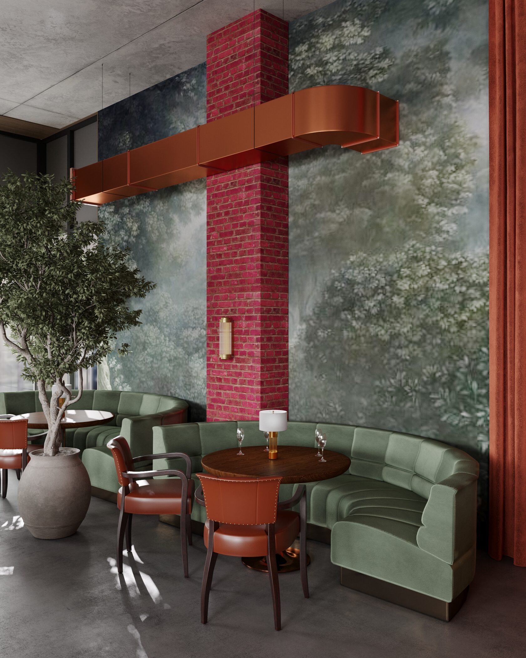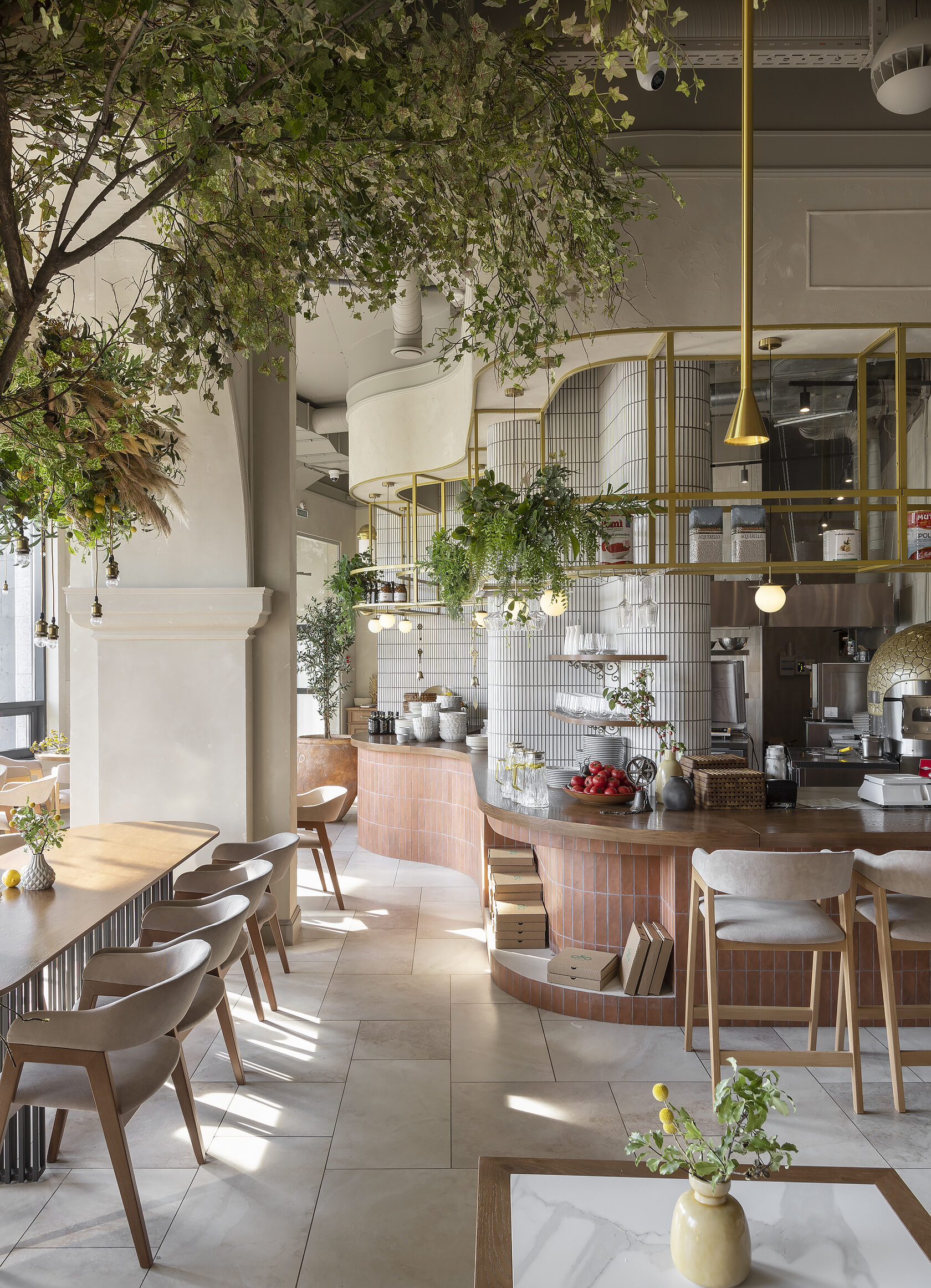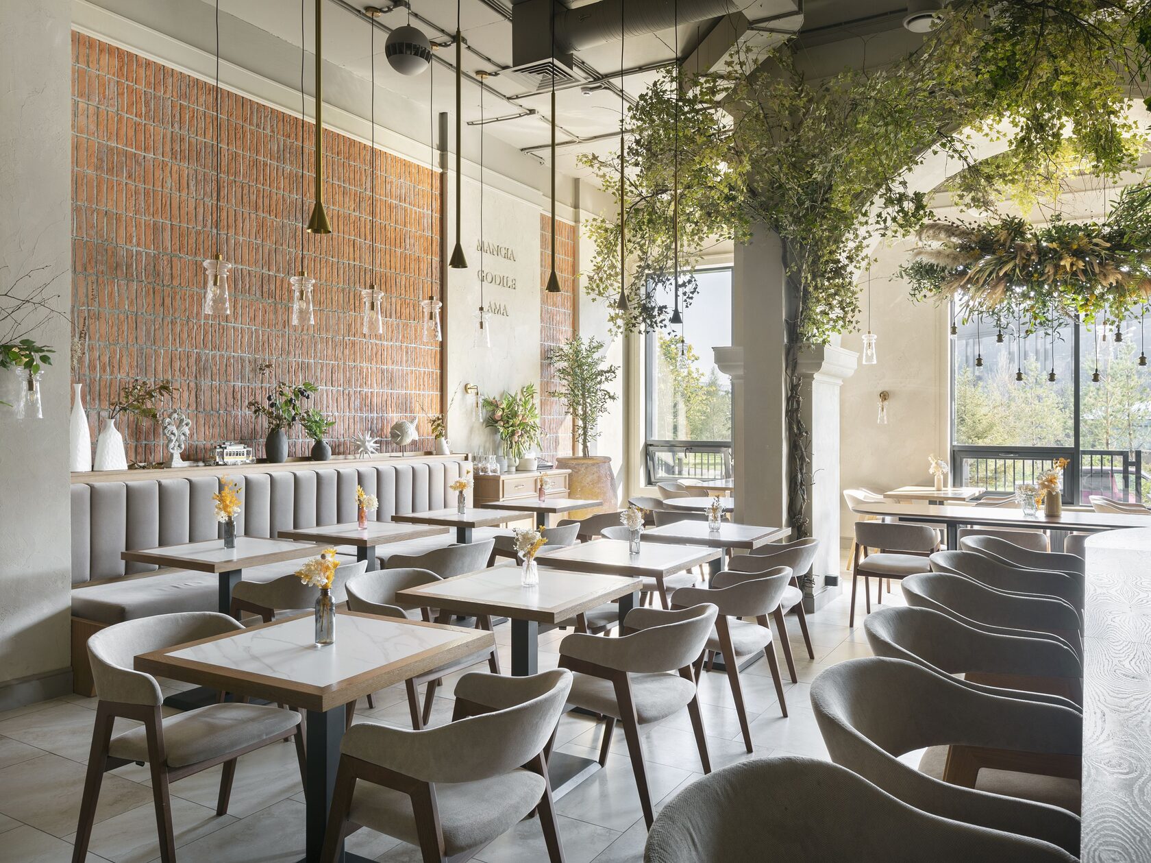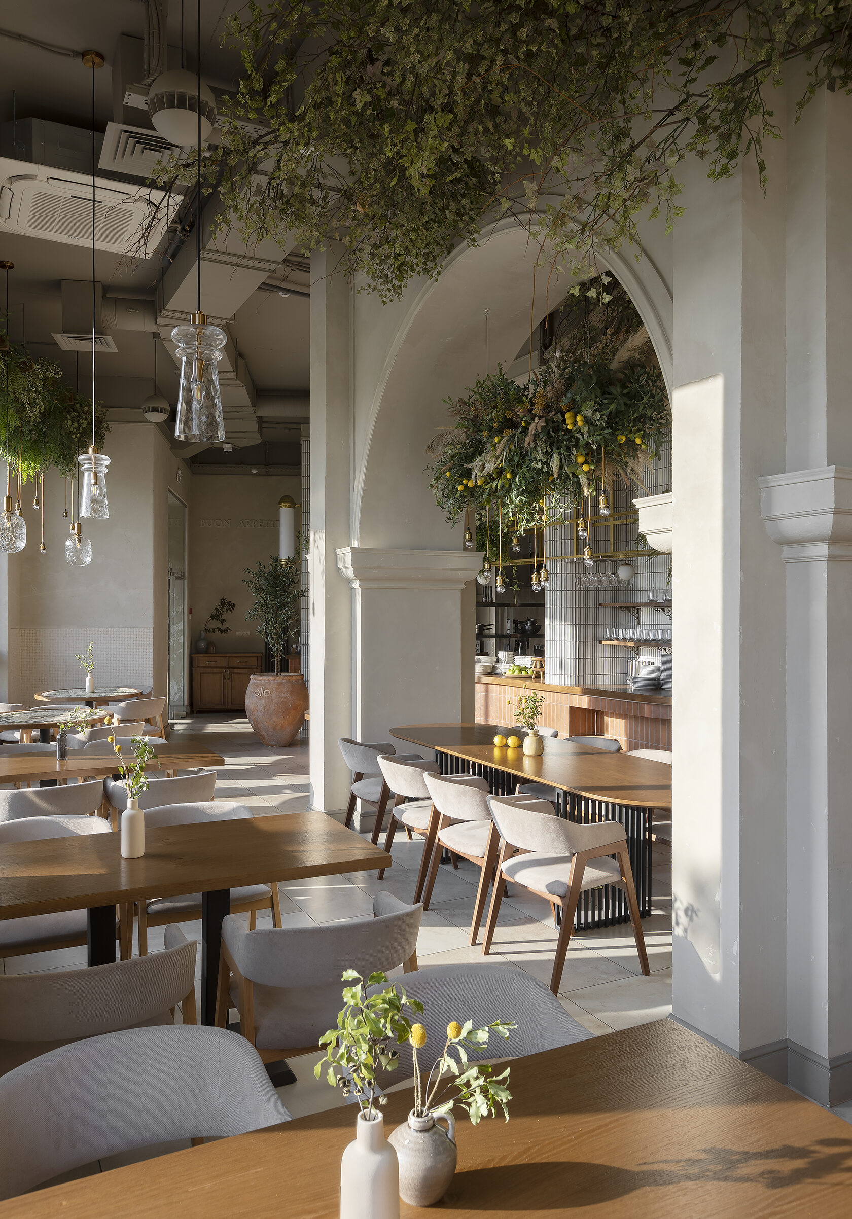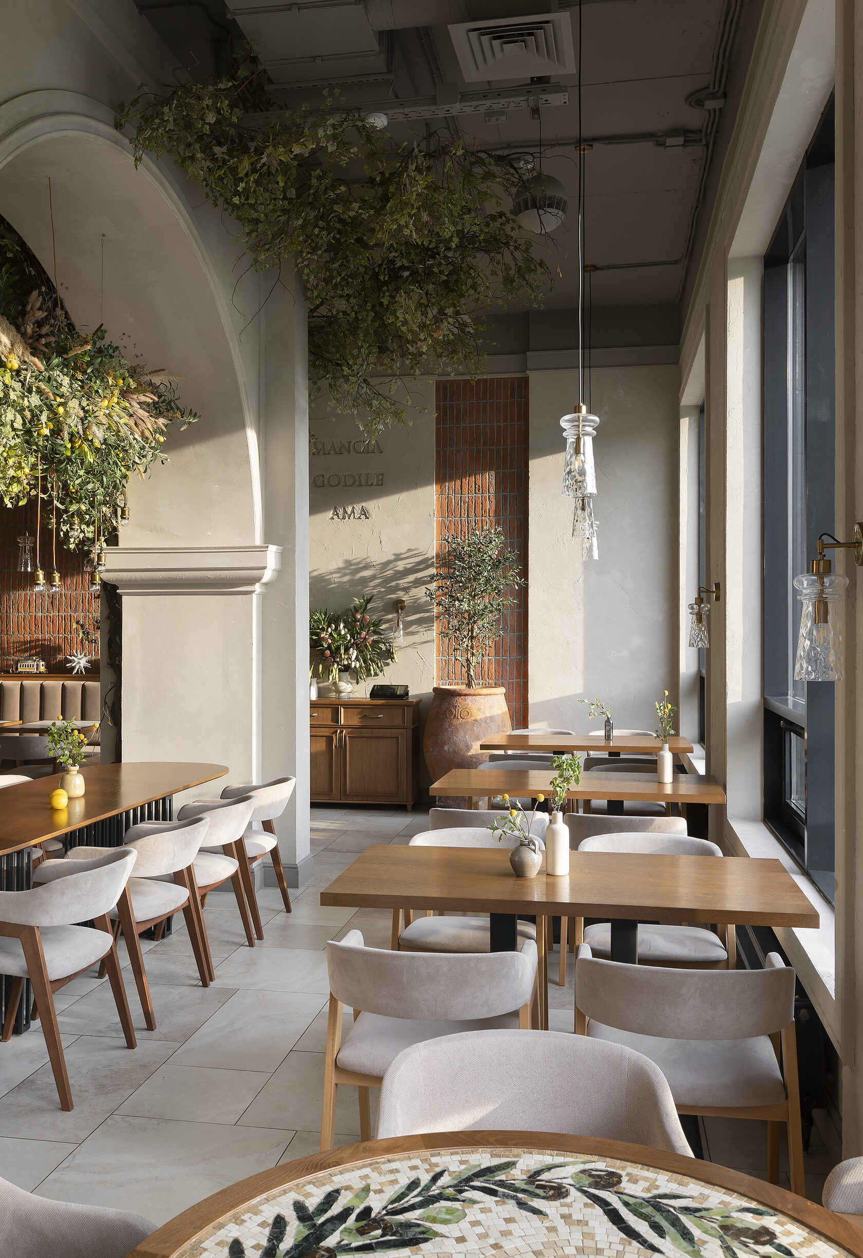 Интерьер итальянского ресторана построен вокруг образа уютной веранды в тёплой Тоскане. Концепция основана на лёгкости, природности и ощущении неспешного отдыха. Пространство наполнено светом, растительными орнаментами и обилием живой зелени, что создаёт атмосферу расслабленного загородного ужина в итальянской провинции.