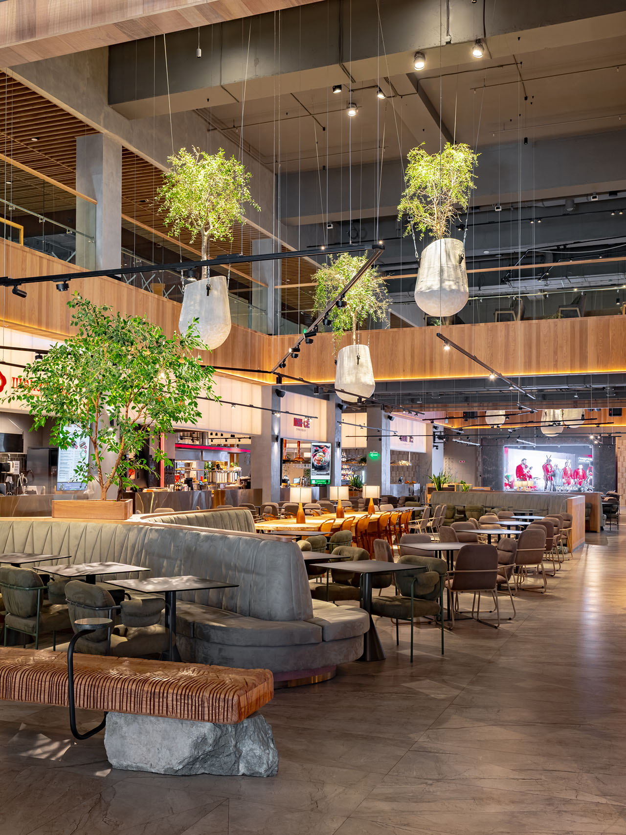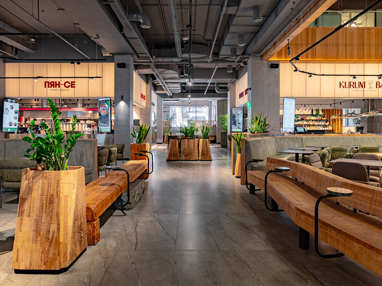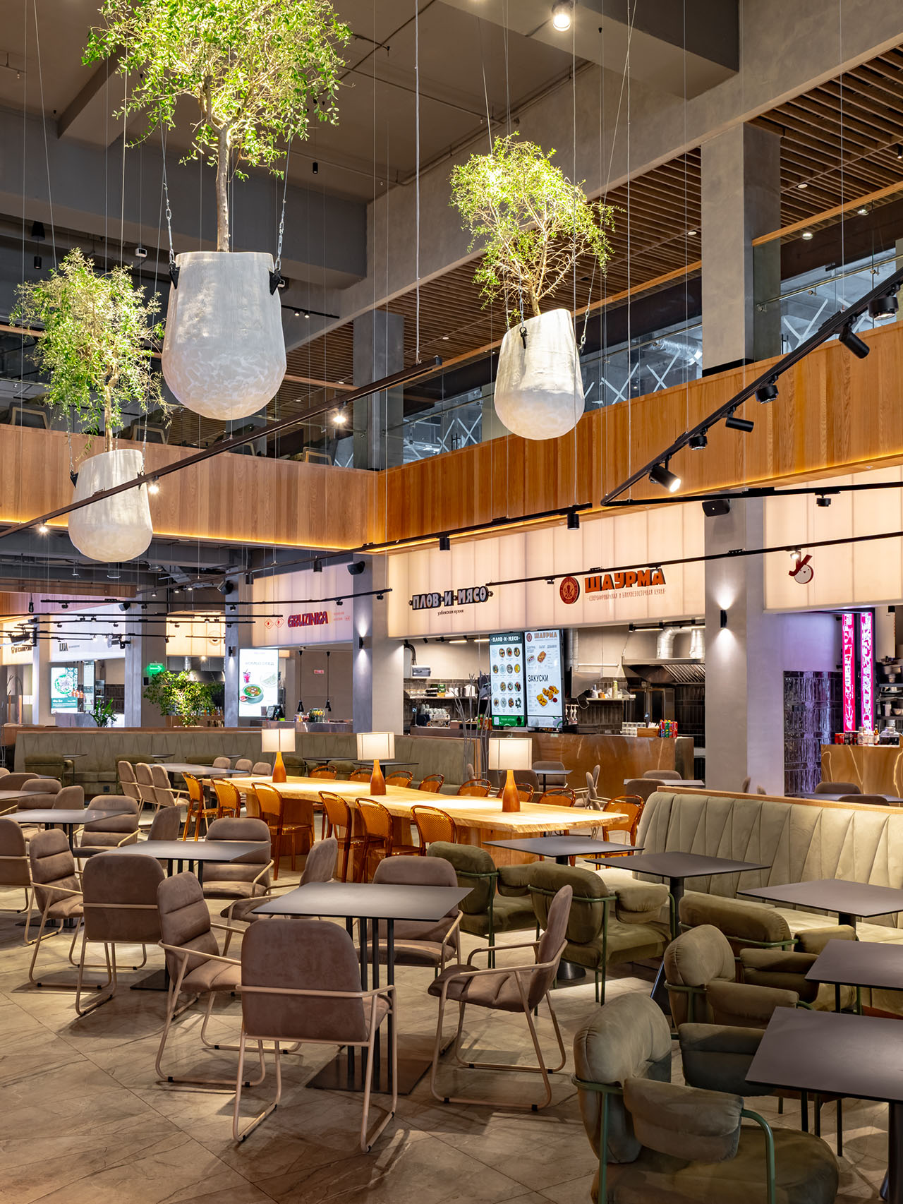 Этот проект представляет собой фудкорт нового поколения в «Екатеринбург Сити», переосмысливающий традиционный подход к гастрономическим пространствам. Создан как цельное, единое пространство, свободное от визуального шума, он призван обеспечить атмосферу ресторана, а не обычного фудкорта, объединяя разнообразие кухонь в выдержанную концепцию.