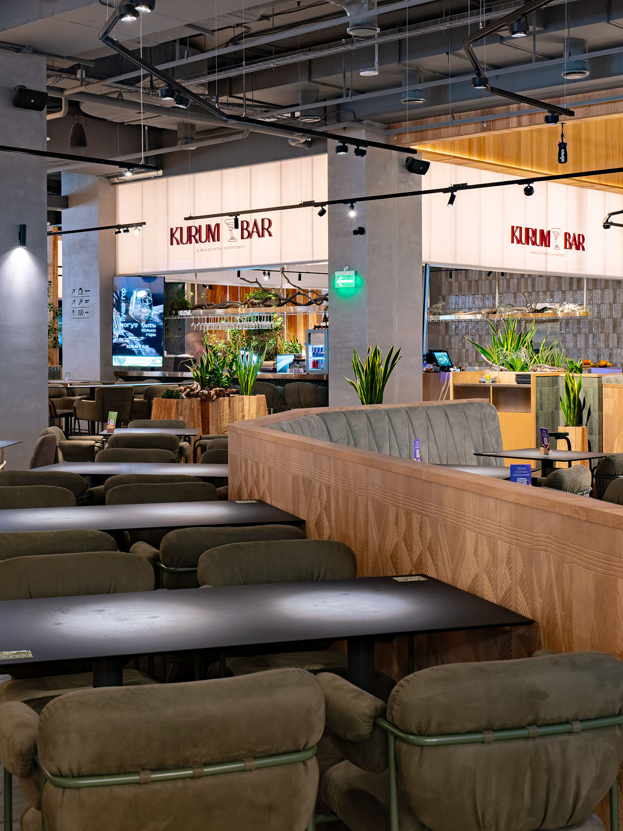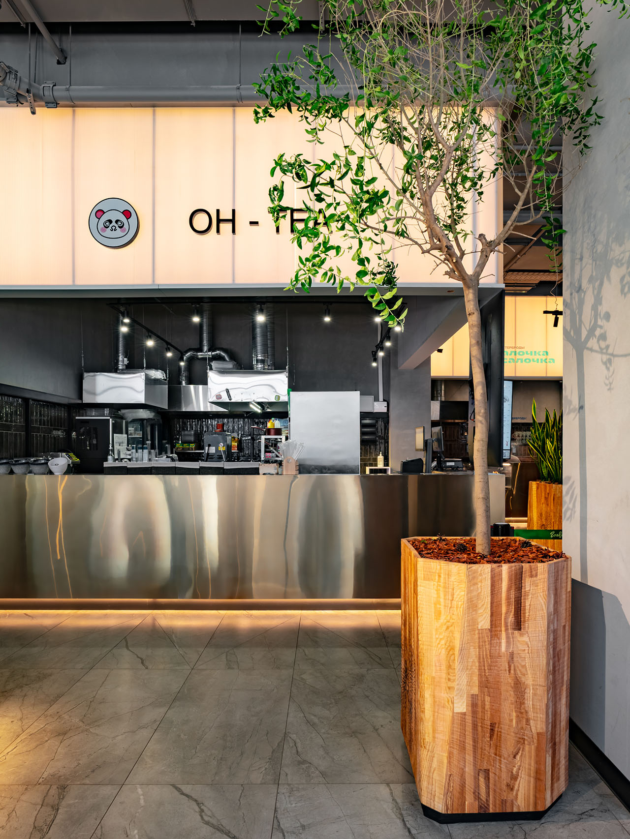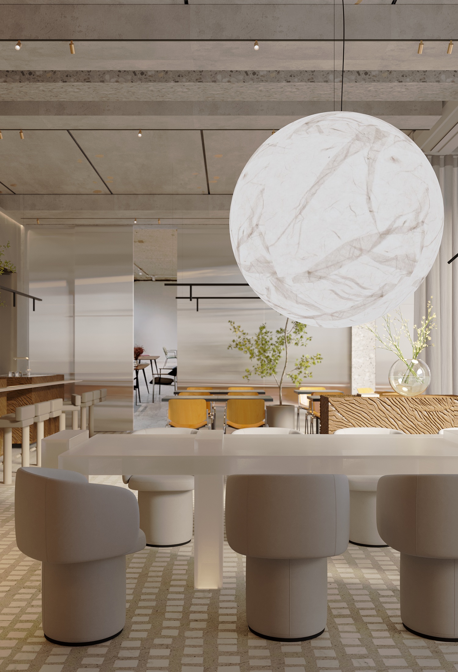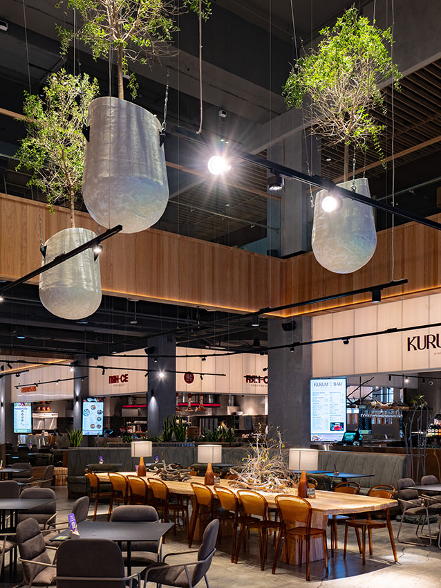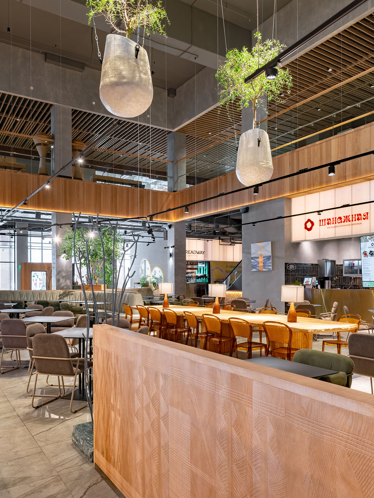Этот проект представляет собой фудкорт нового поколения в «Екатеринбург Сити», переосмысливающий традиционный подход к гастрономическим пространствам. Создан как цельное, единое пространство, свободное от визуального шума, он призван обеспечить атмосферу ресторана, а не обычного фудкорта, объединяя разнообразие кухонь в выдержанную концепцию.