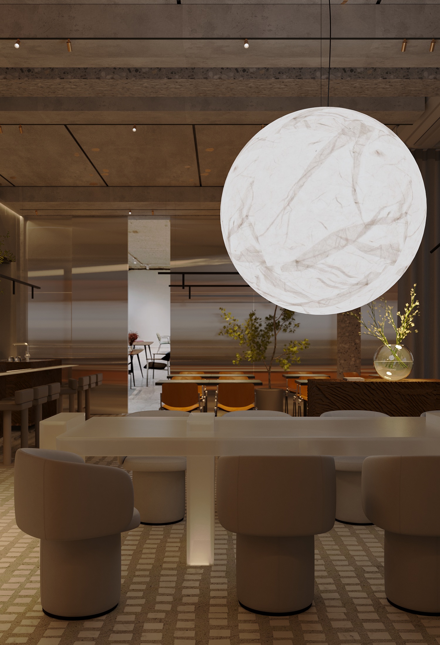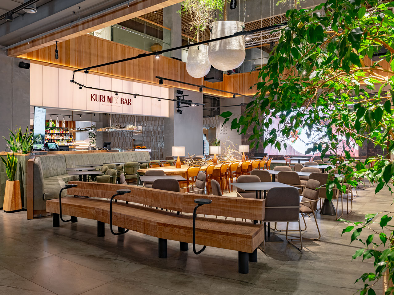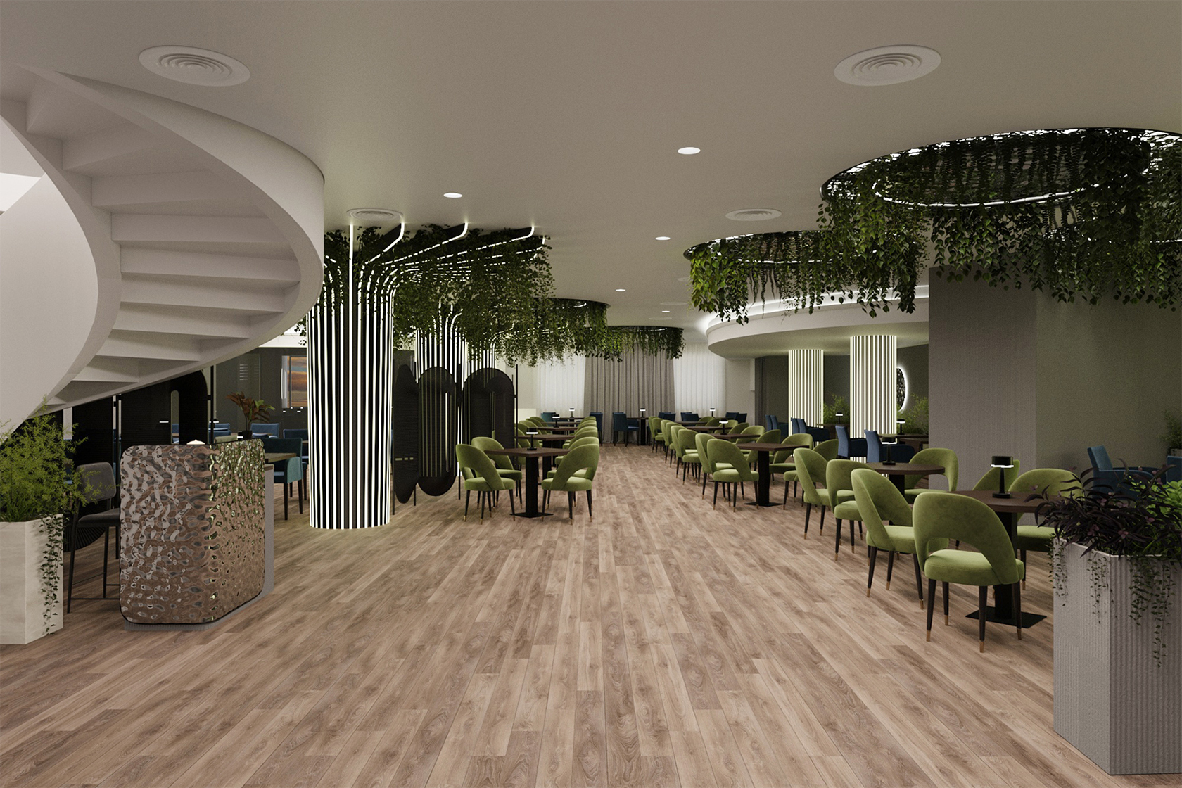 Этот проект представляет собой фудкорт нового поколения в «Екатеринбург Сити», переосмысливающий традиционный подход к гастрономическим пространствам. Создан как цельное, единое пространство, свободное от визуального шума, он призван обеспечить атмосферу ресторана, а не обычного фудкорта, объединяя разнообразие кухонь в выдержанную концепцию.
