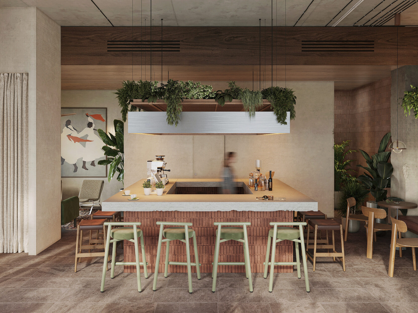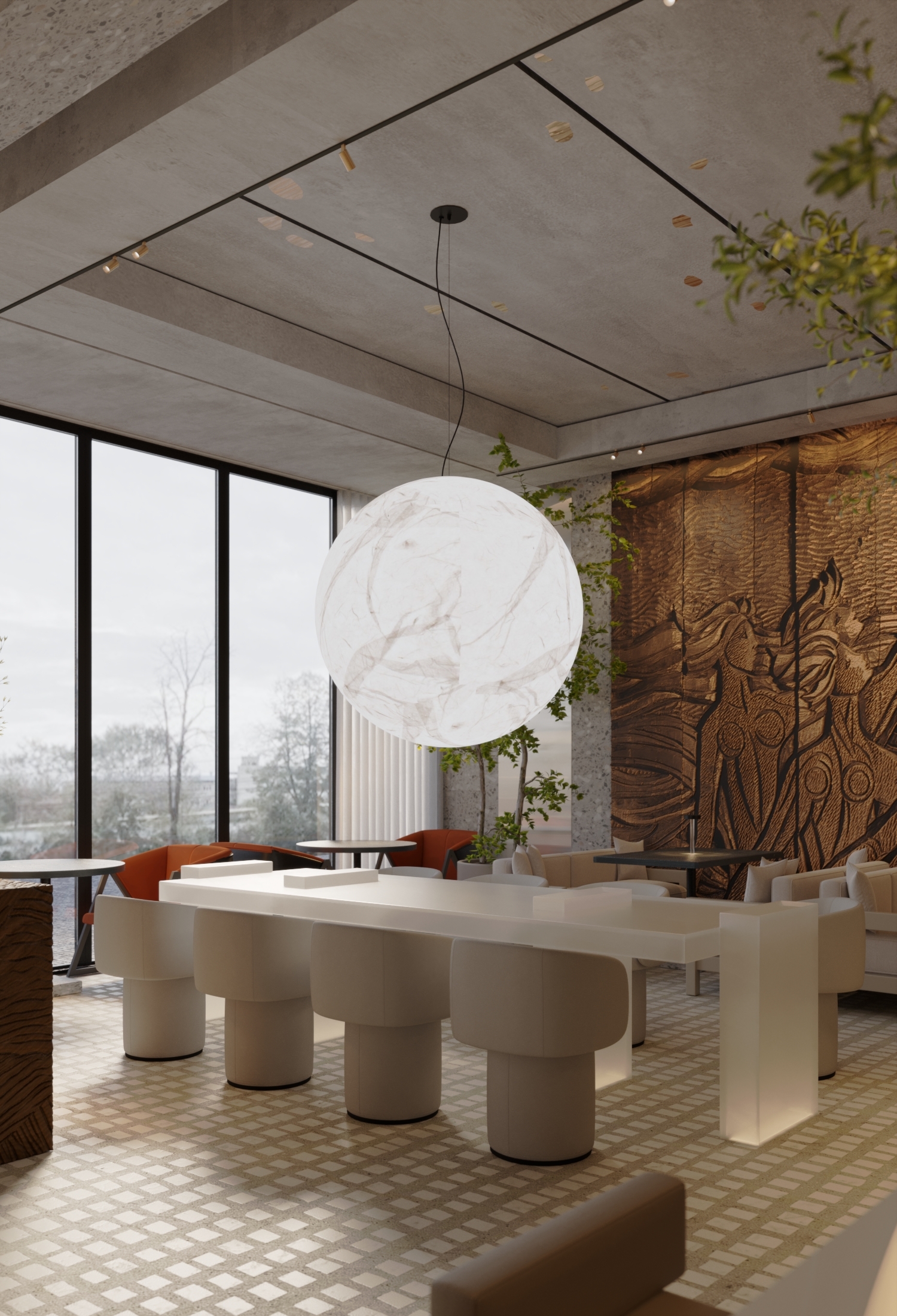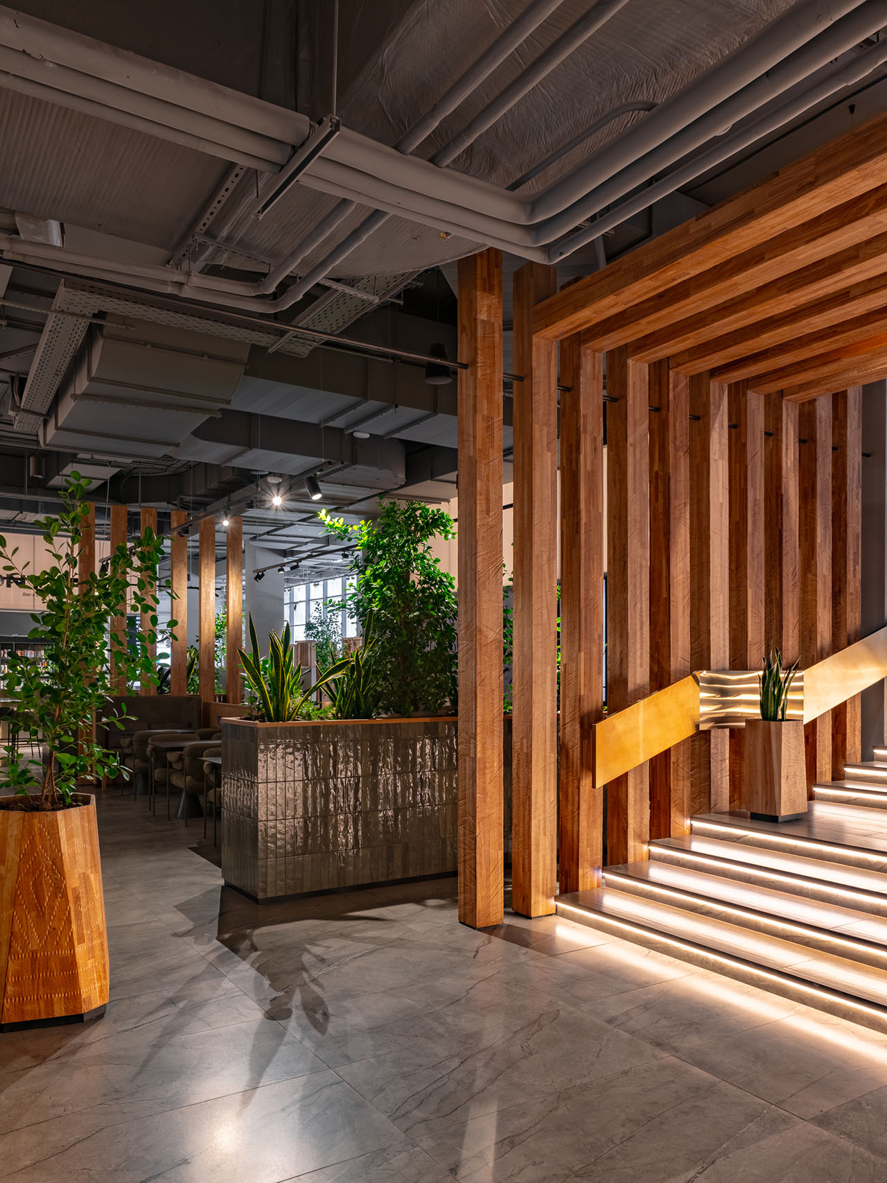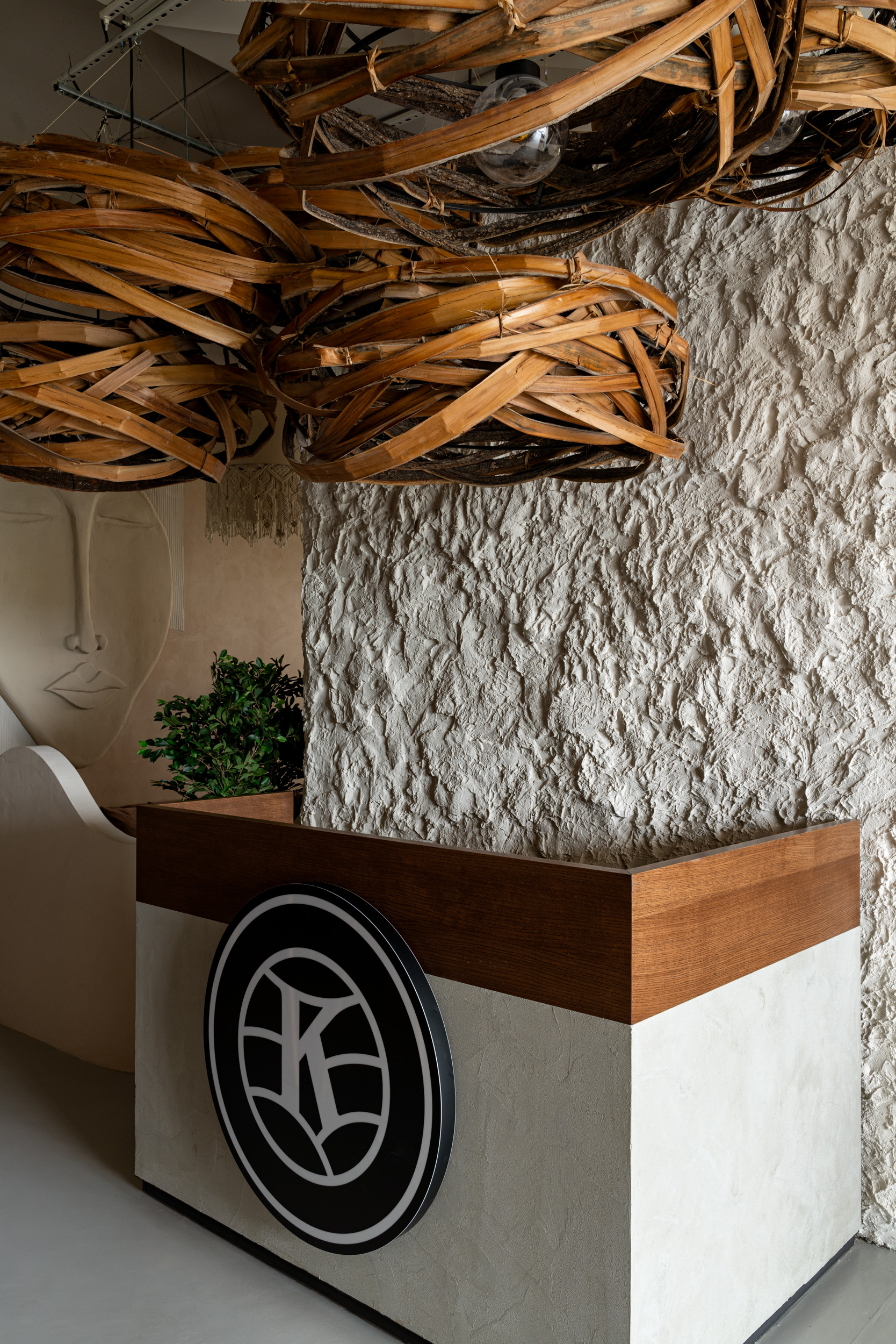 Концепция: Ключевая идея — интеграция мягкого тепла Бали с суровой красотой Сибири. Это реализовано через уникальное сочетание натурального дерева, дарящего ощущение уюта, и бетона, символизирующего прочность и характер. Центральным акцентом стал комьюнити-стол, над которым расположена световая инсталляция с живыми растениями, подчеркивающая единство света и природы. Дизайн основан на натуральных фактурах, мягкой цветовой палитре и продуманном освещении, формируя гармоничное и приглашающее пространство.