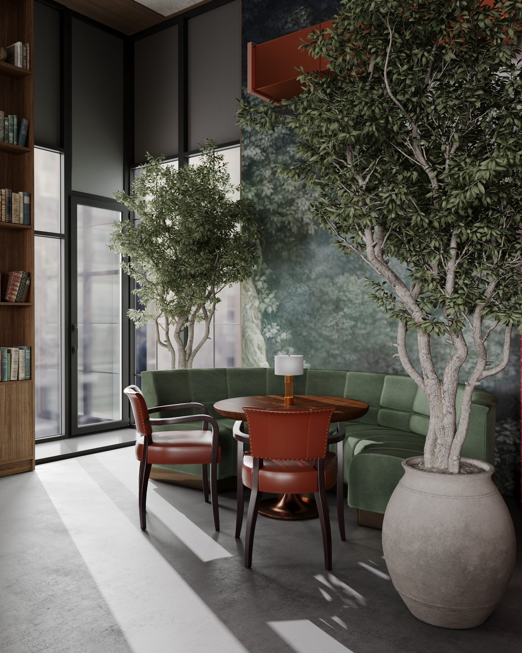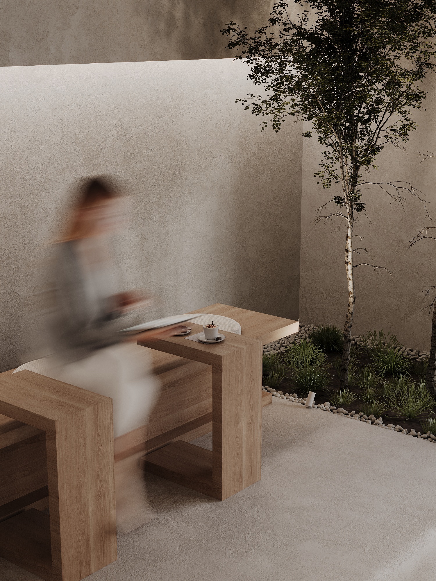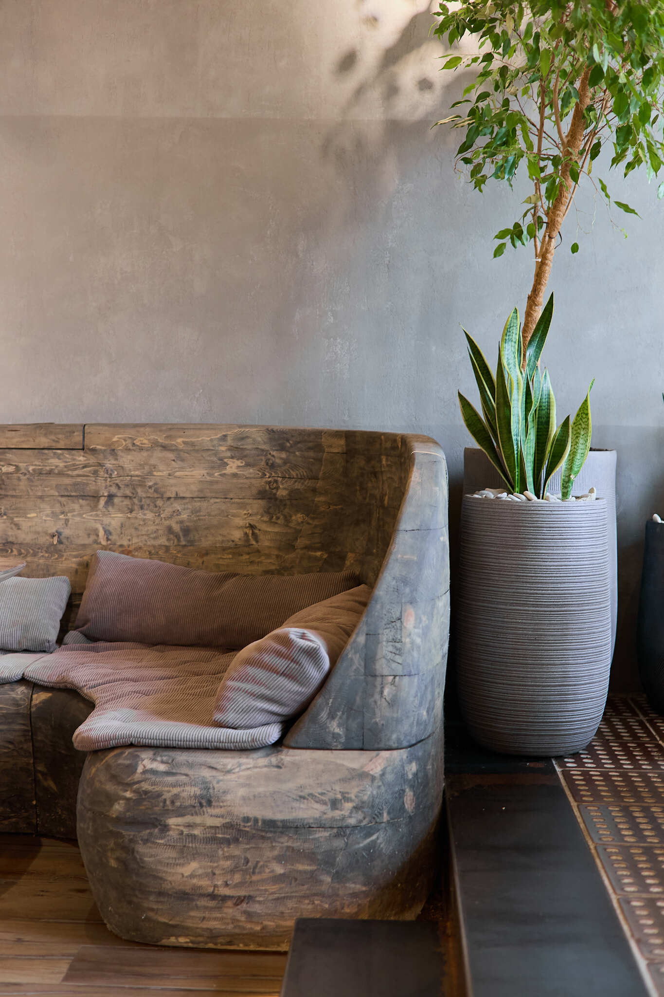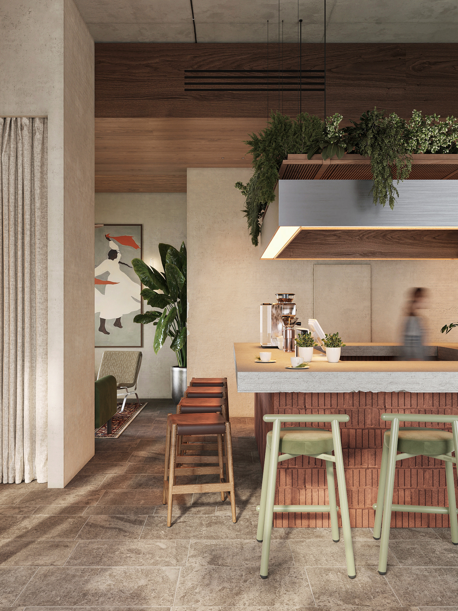 Концепция: Ключевая идея — интеграция мягкого тепла Бали с суровой красотой Сибири. Это реализовано через уникальное сочетание натурального дерева, дарящего ощущение уюта, и бетона, символизирующего прочность и характер. Центральным акцентом стал комьюнити-стол, над которым расположена световая инсталляция с живыми растениями, подчеркивающая единство света и природы. Дизайн основан на натуральных фактурах, мягкой цветовой палитре и продуманном освещении, формируя гармоничное и приглашающее пространство.