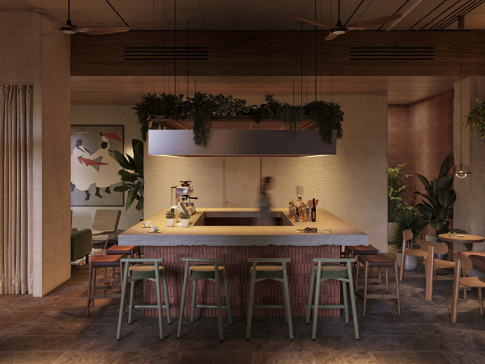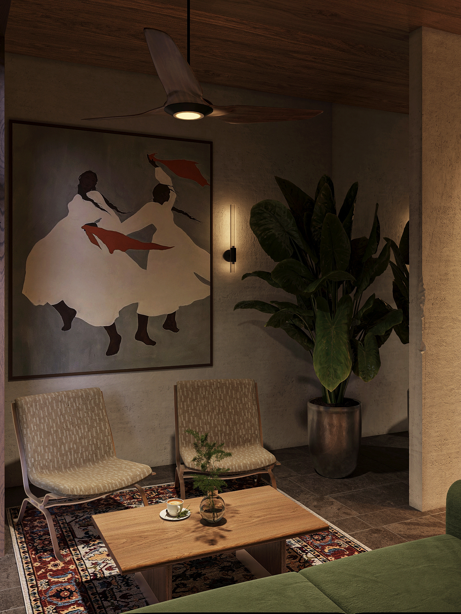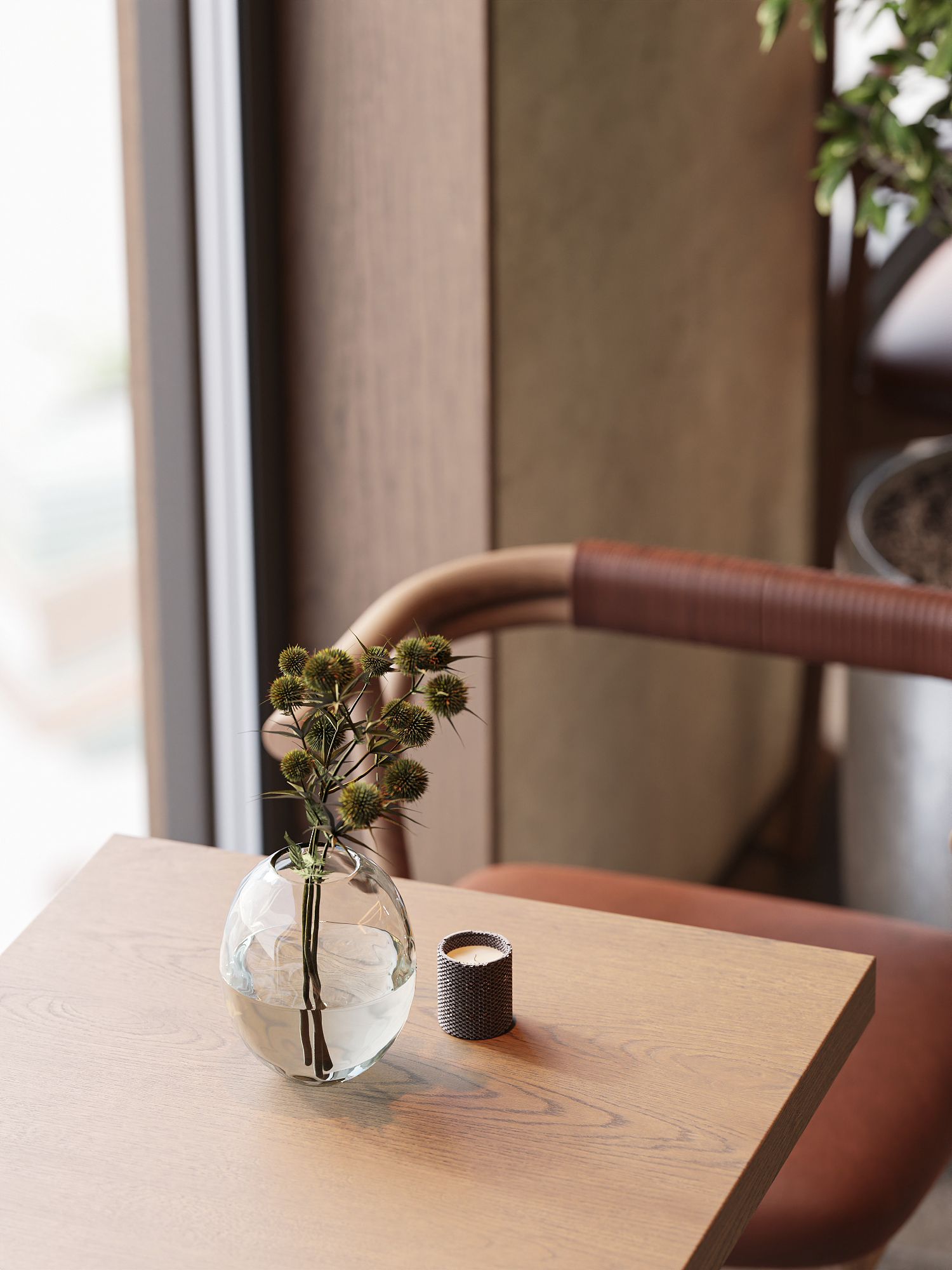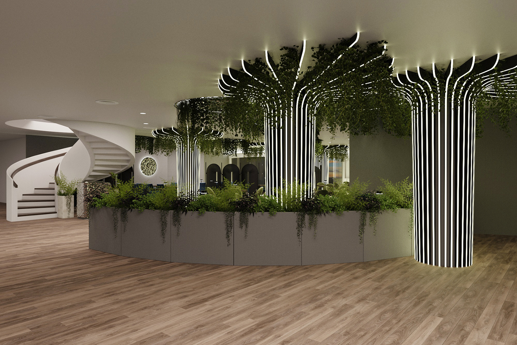 Концепция: Ключевая идея — интеграция мягкого тепла Бали с суровой красотой Сибири. Это реализовано через уникальное сочетание натурального дерева, дарящего ощущение уюта, и бетона, символизирующего прочность и характер. Центральным акцентом стал комьюнити-стол, над которым расположена световая инсталляция с живыми растениями, подчеркивающая единство света и природы. Дизайн основан на натуральных фактурах, мягкой цветовой палитре и продуманном освещении, формируя гармоничное и приглашающее пространство.
