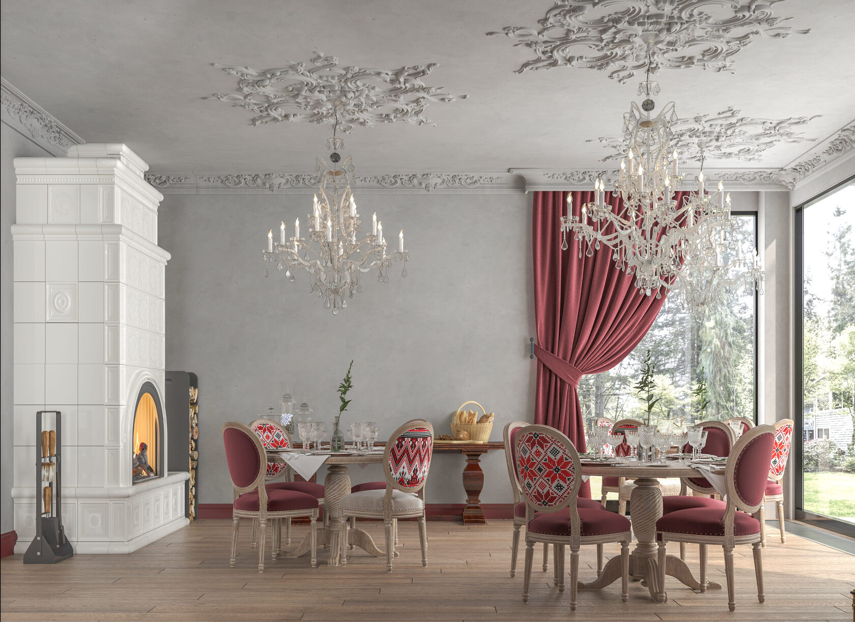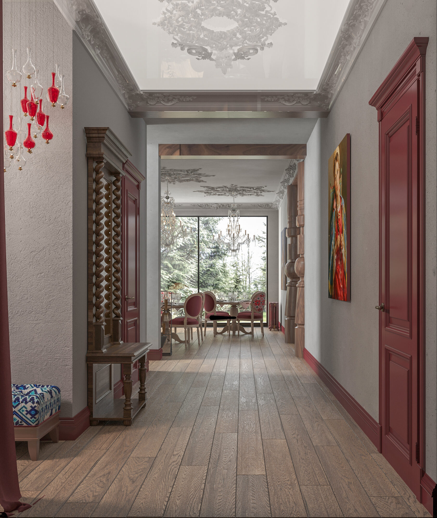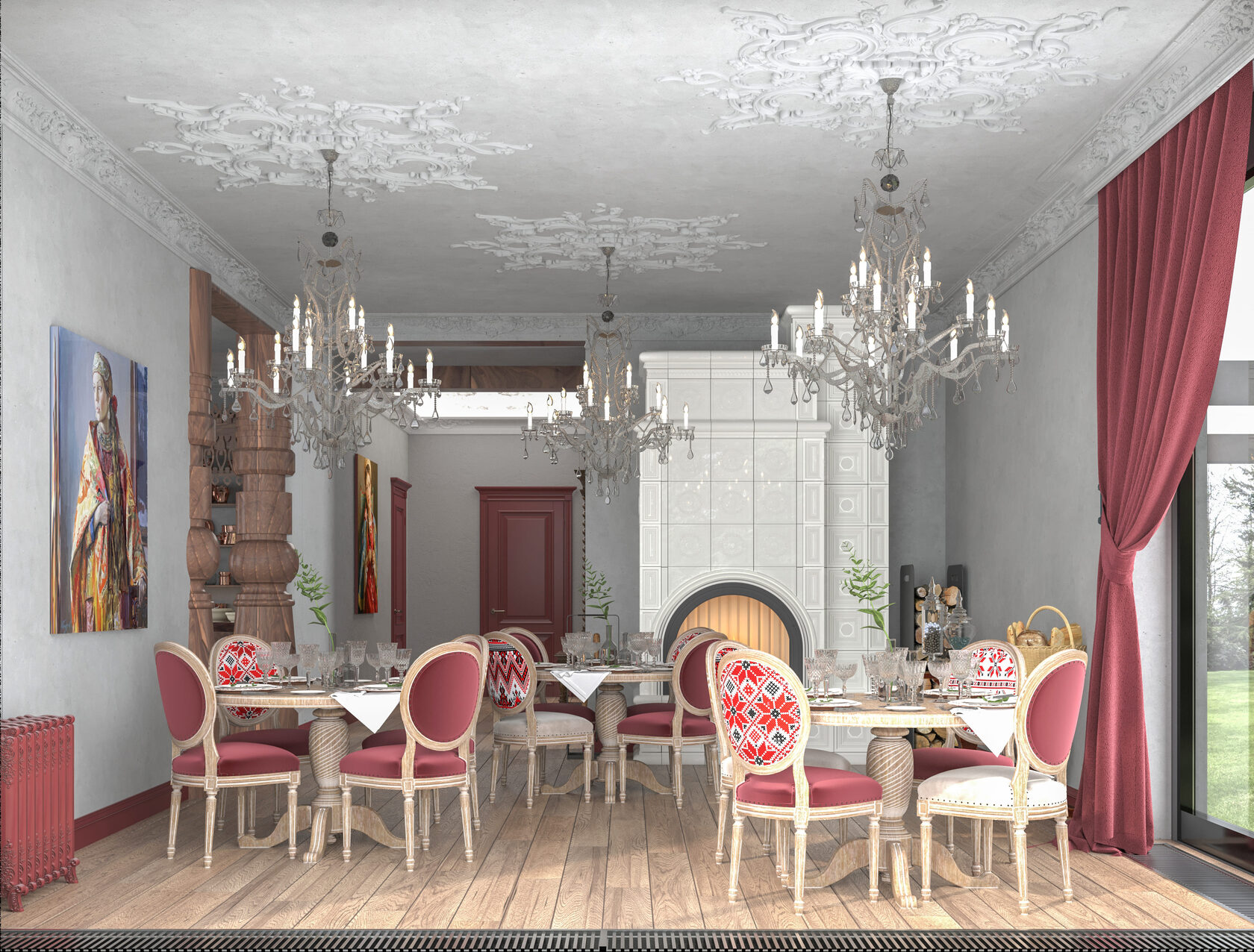 Концепция В центре концепции — переосмысление традиционного русского стиля «А-ля Рус», адаптированного под актуальные запросы современного человека. Колористическая палитра строится на сочетании белого, насыщенного красного, древесных и бежевых оттенков. Такое решение одновременно отсылает к народному декоративному искусству и создает уютную, нейтральную базу.
