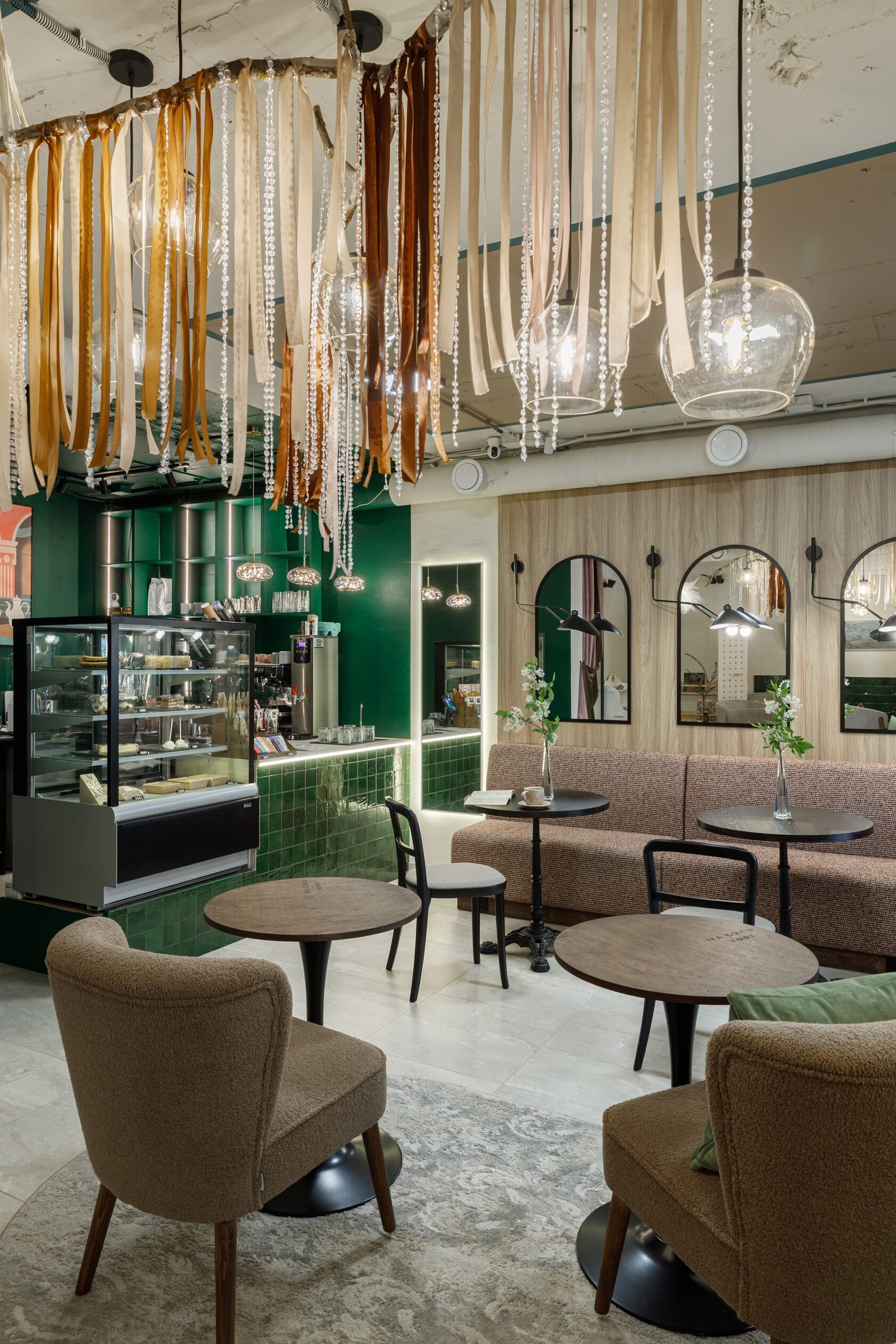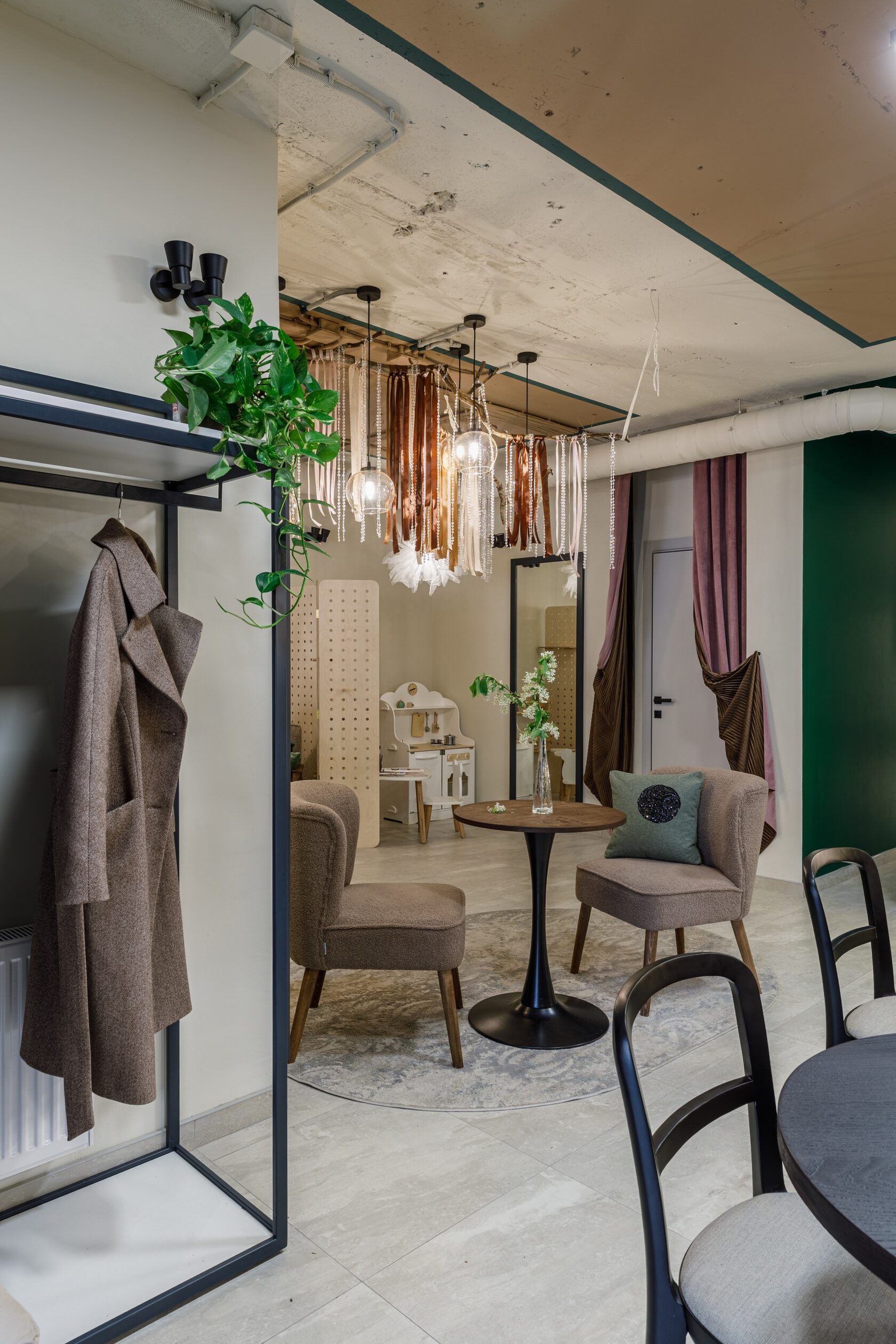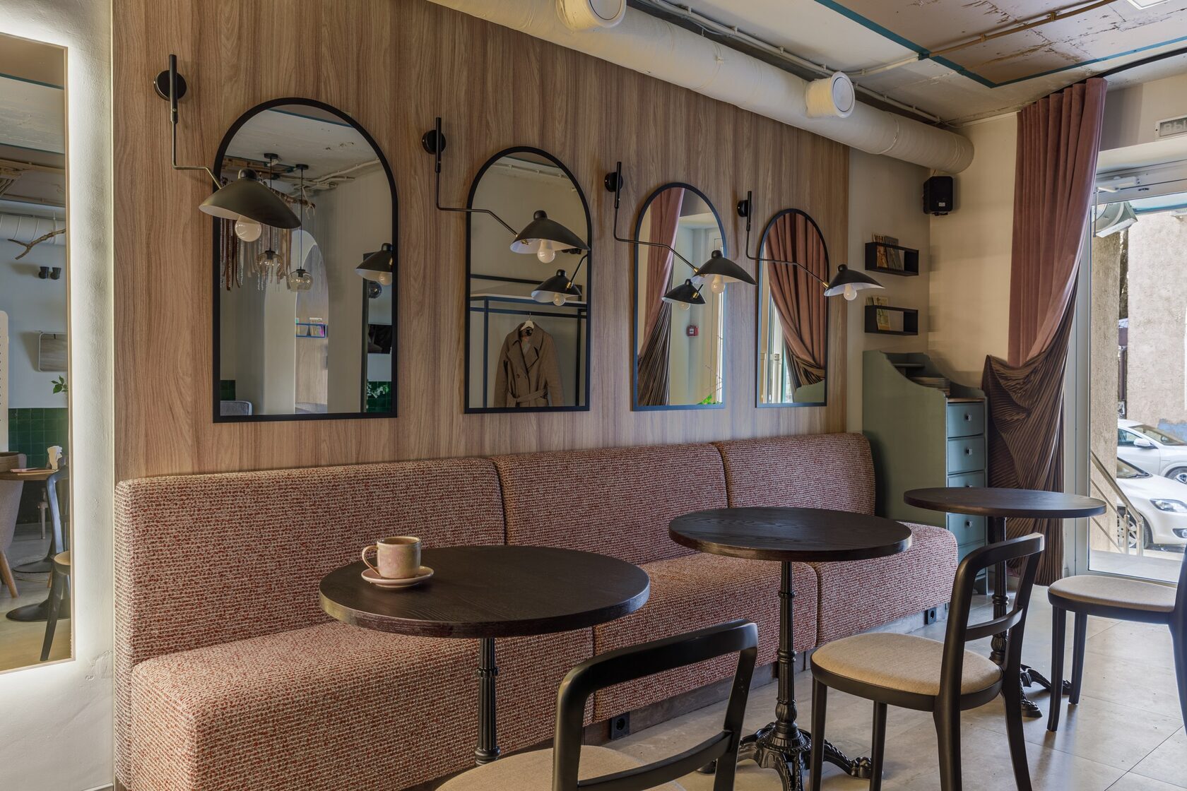 В декоре использован легкий винтаж — он создаёт ощущение воспоминаний, тёплоты и индивидуальности. Атмосфера — легкая, воздушная, игривая, как сама идея заглянуть за кофе между примеркой и прогулкой.