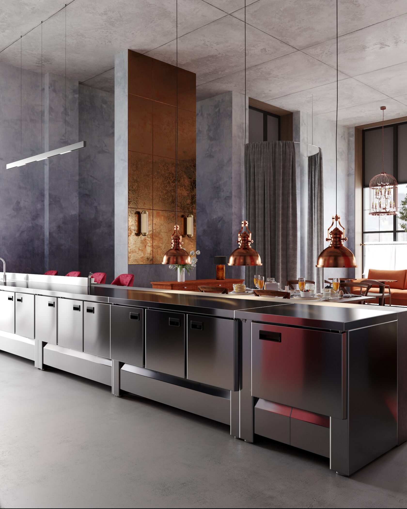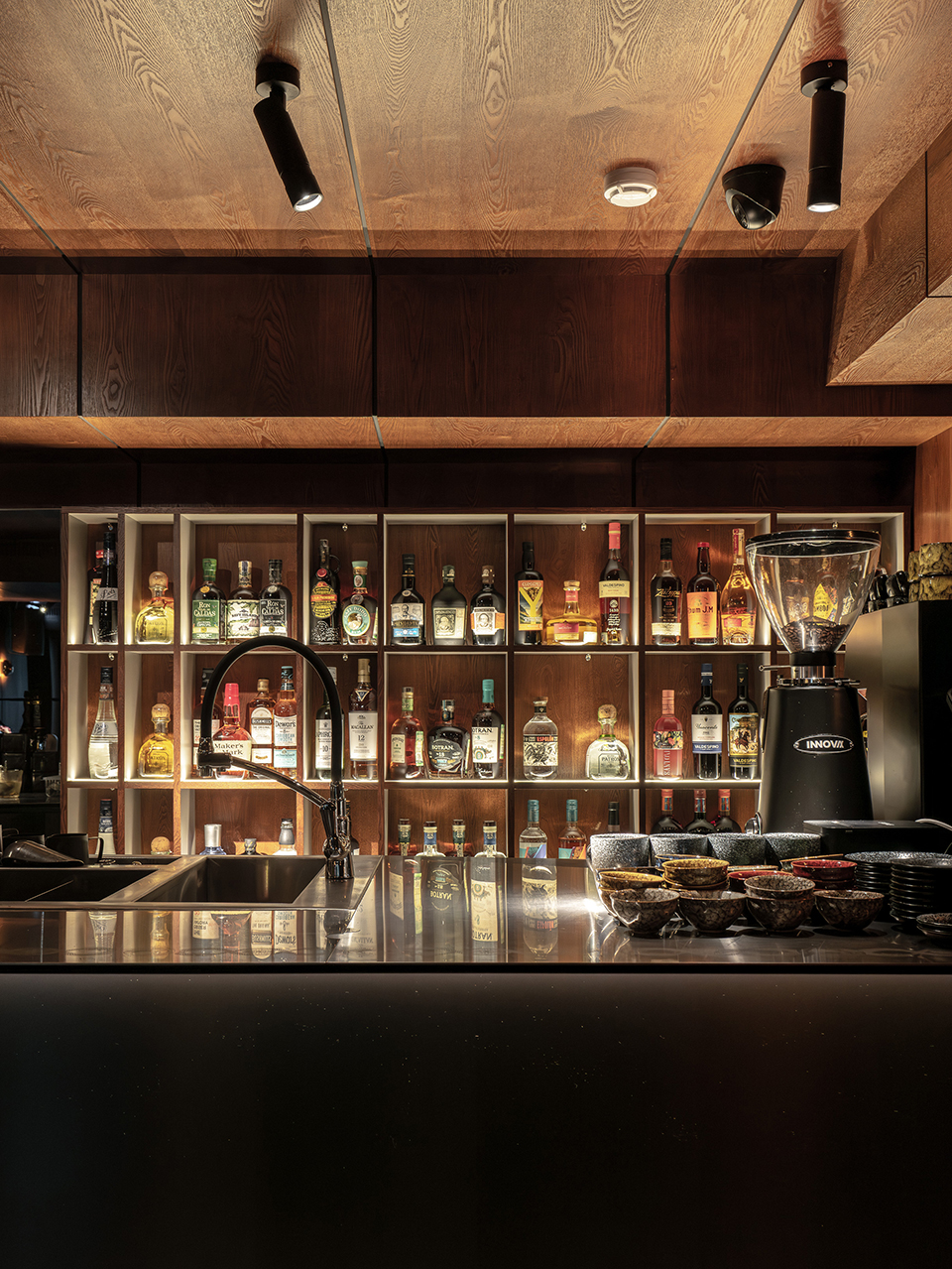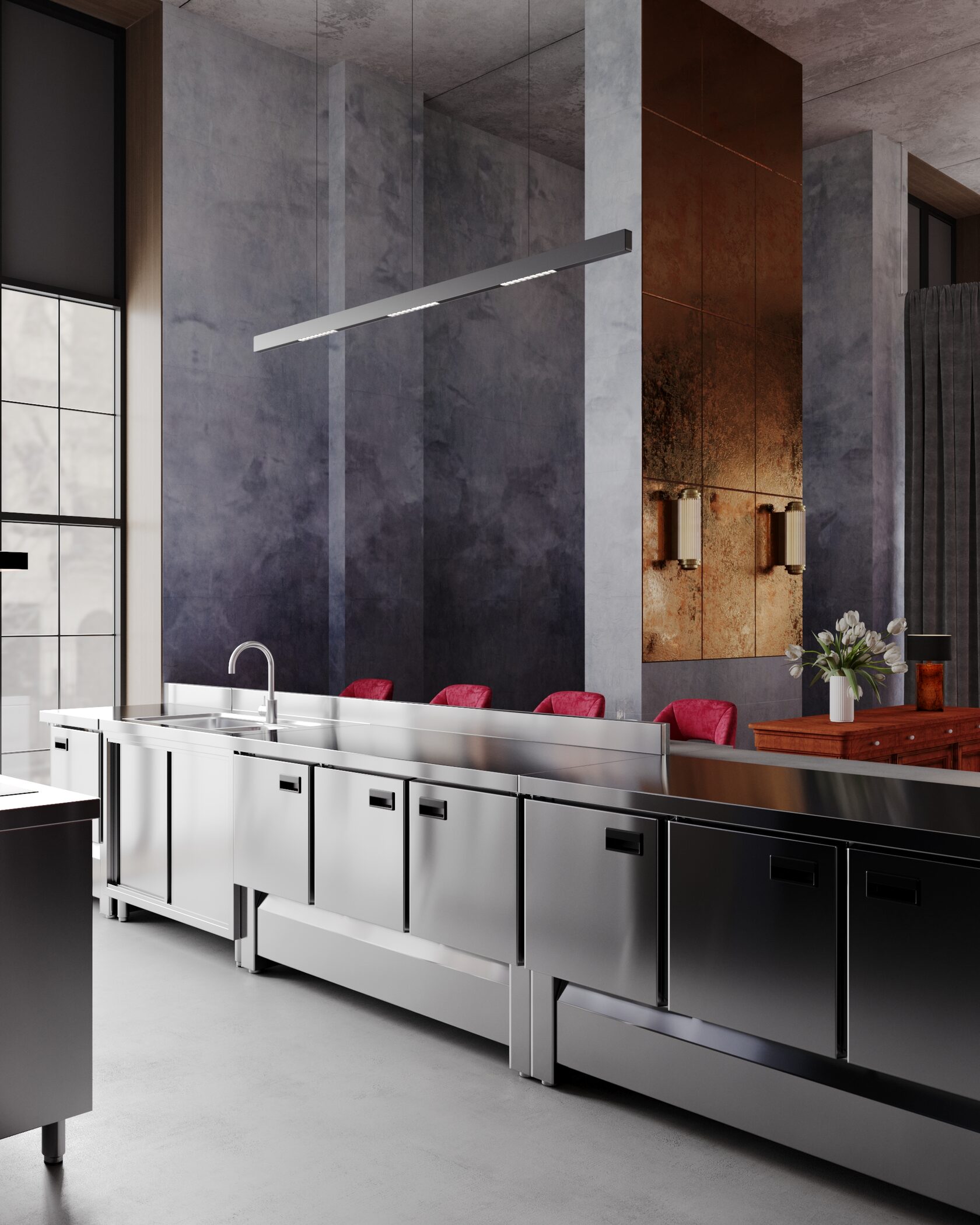 Функциональность Главной находкой стал сквозной бар из нержавеющей стали, напоминающий своим плавным изгибом течение реки. Над ним парит светильник-профиль, стилизованный под горный рельеф.