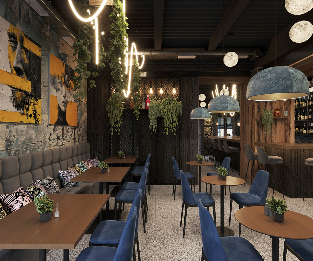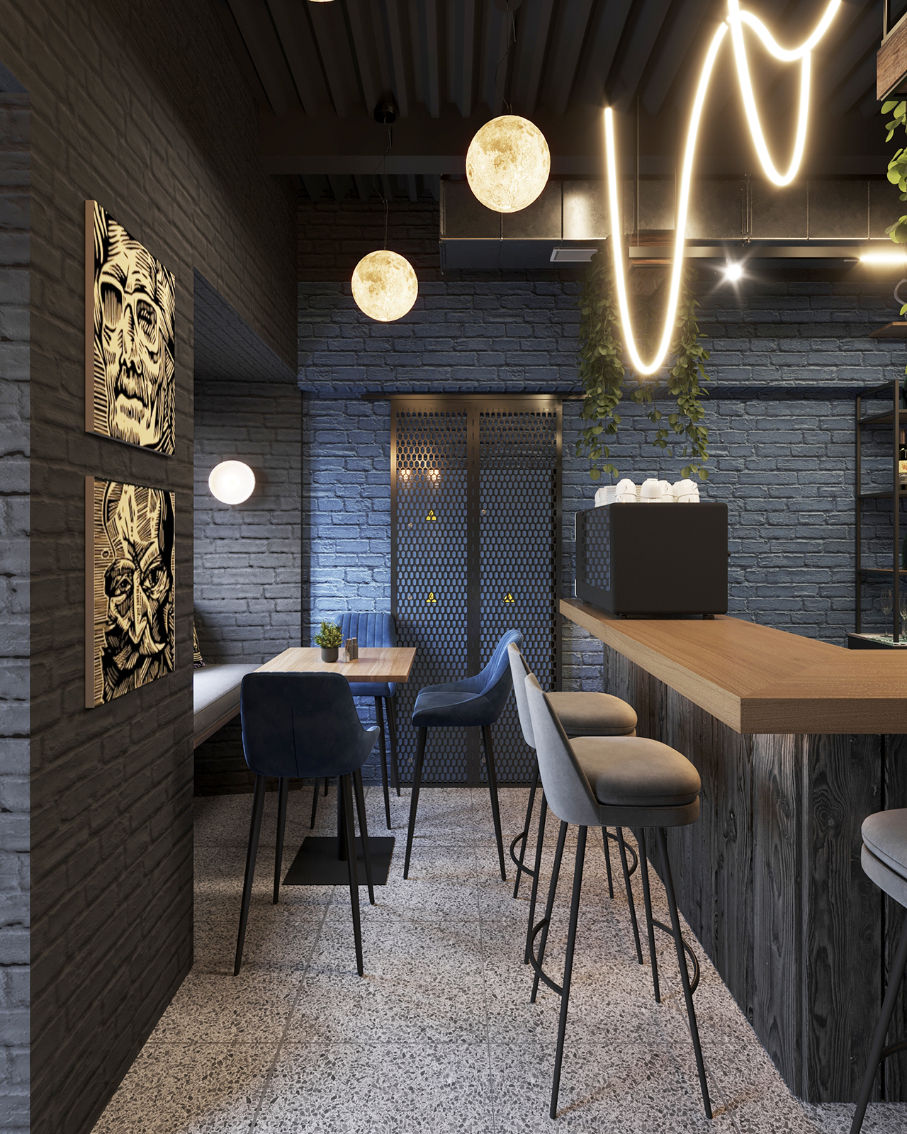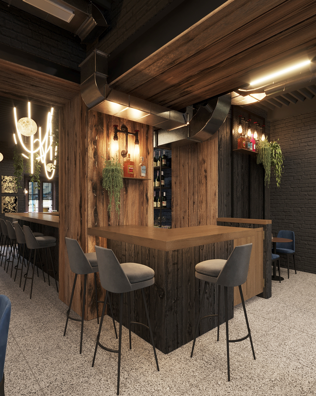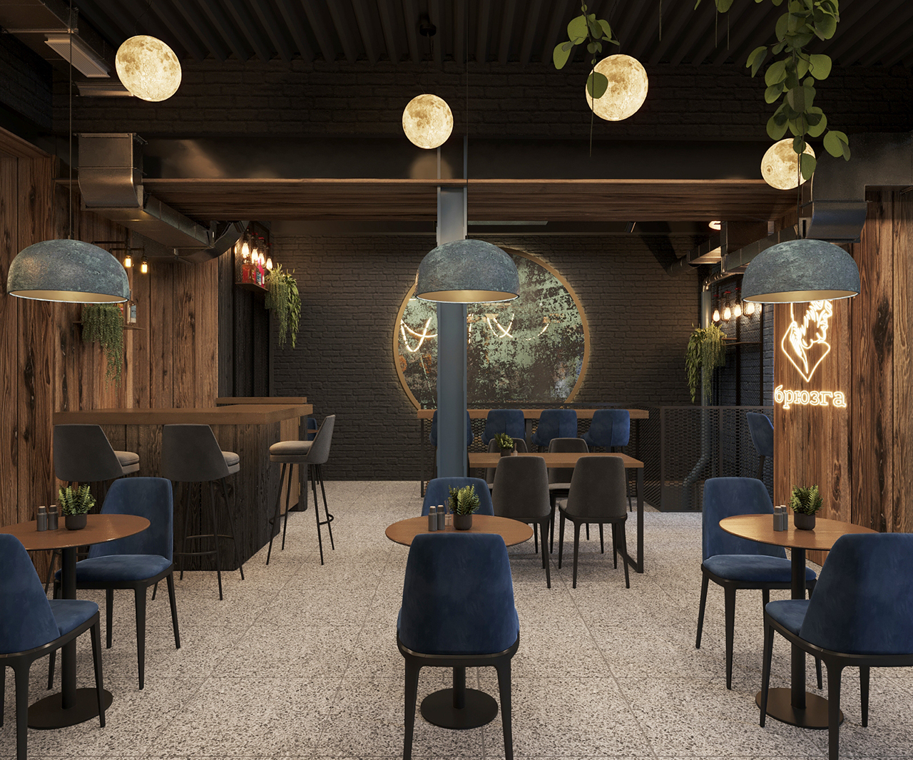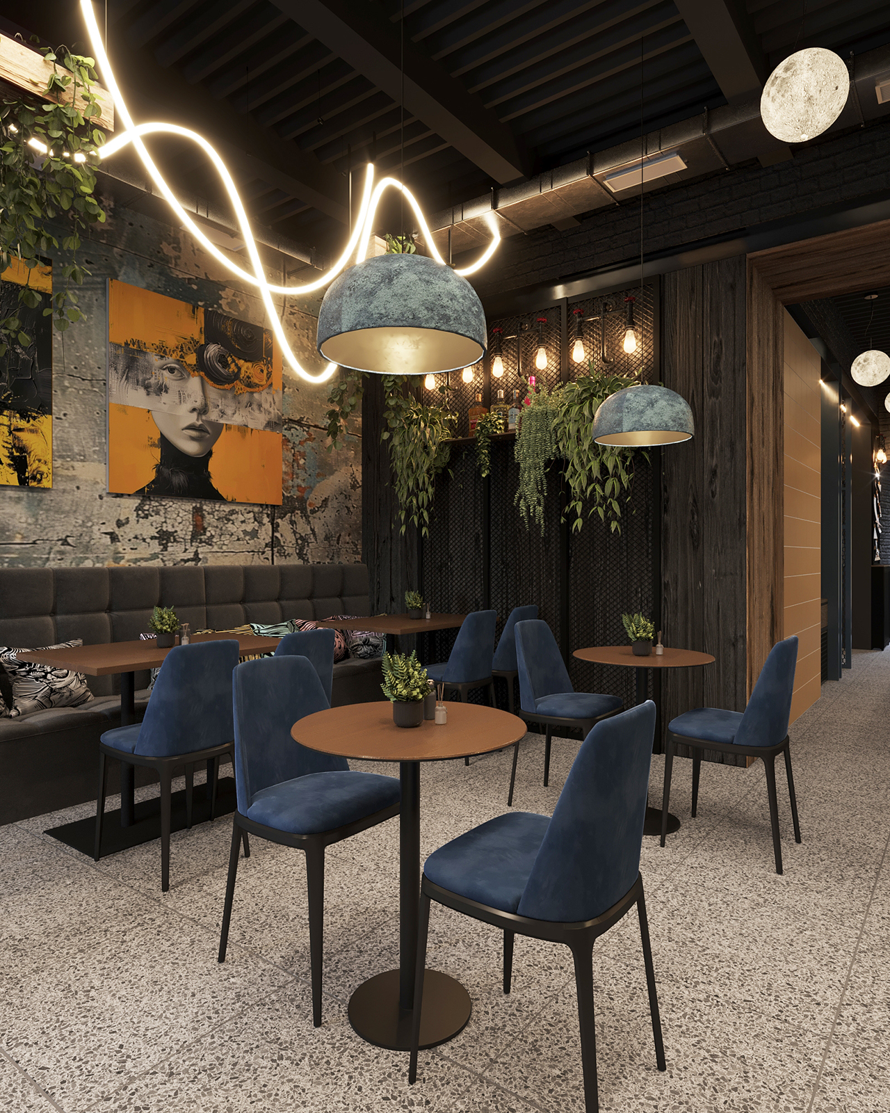 Концепция: В основе концепции лежит амбивалентность городского духа – отшлифованная небрежность и продуманная экспрессия. Дизайн намеренно играет на контрастах: холод металла встречается с теплом текстиля, строгие геометрические формы дополняются органическими вкраплениями растений и винтажными деталями. Особое внимание уделено световому сценарию, имитирующему пульс ночного города, что подчеркивает уникальность и характер заведения.