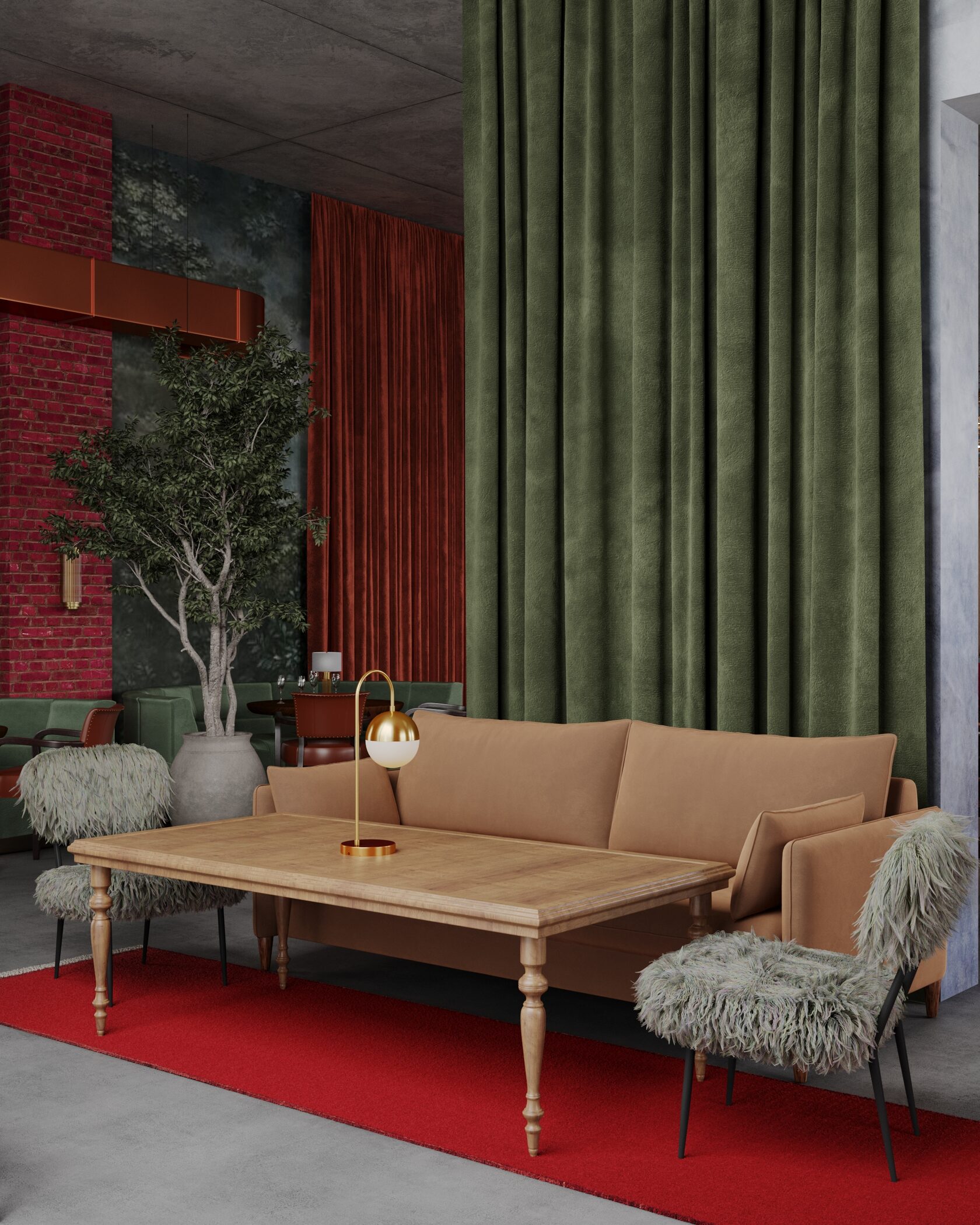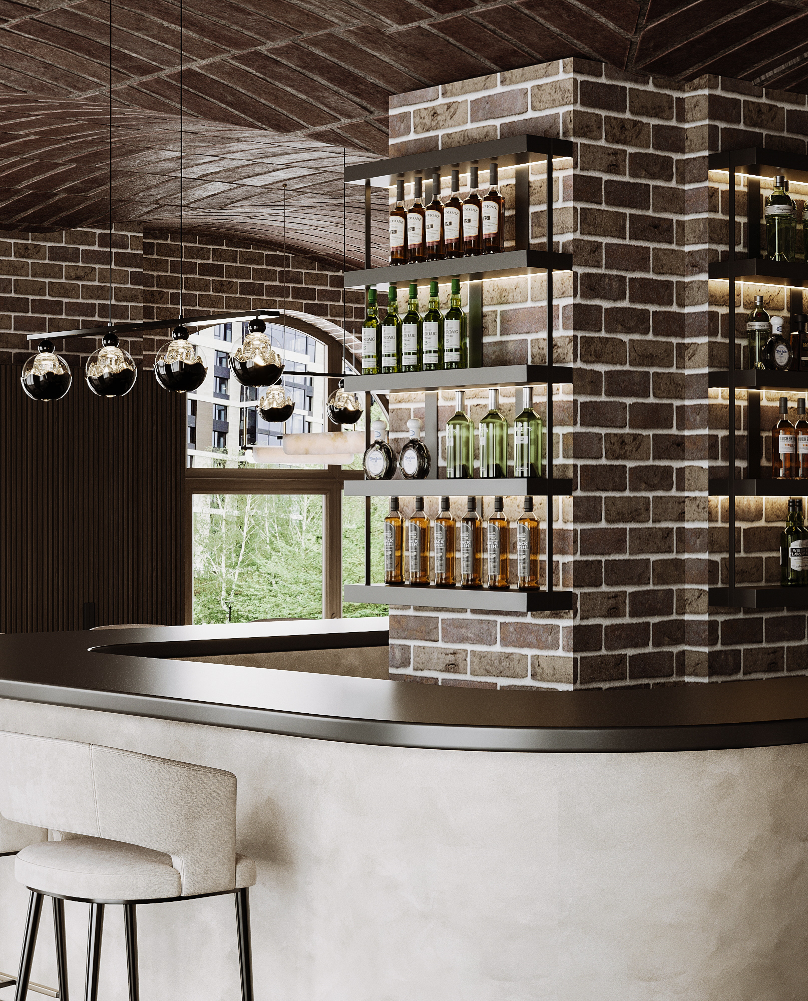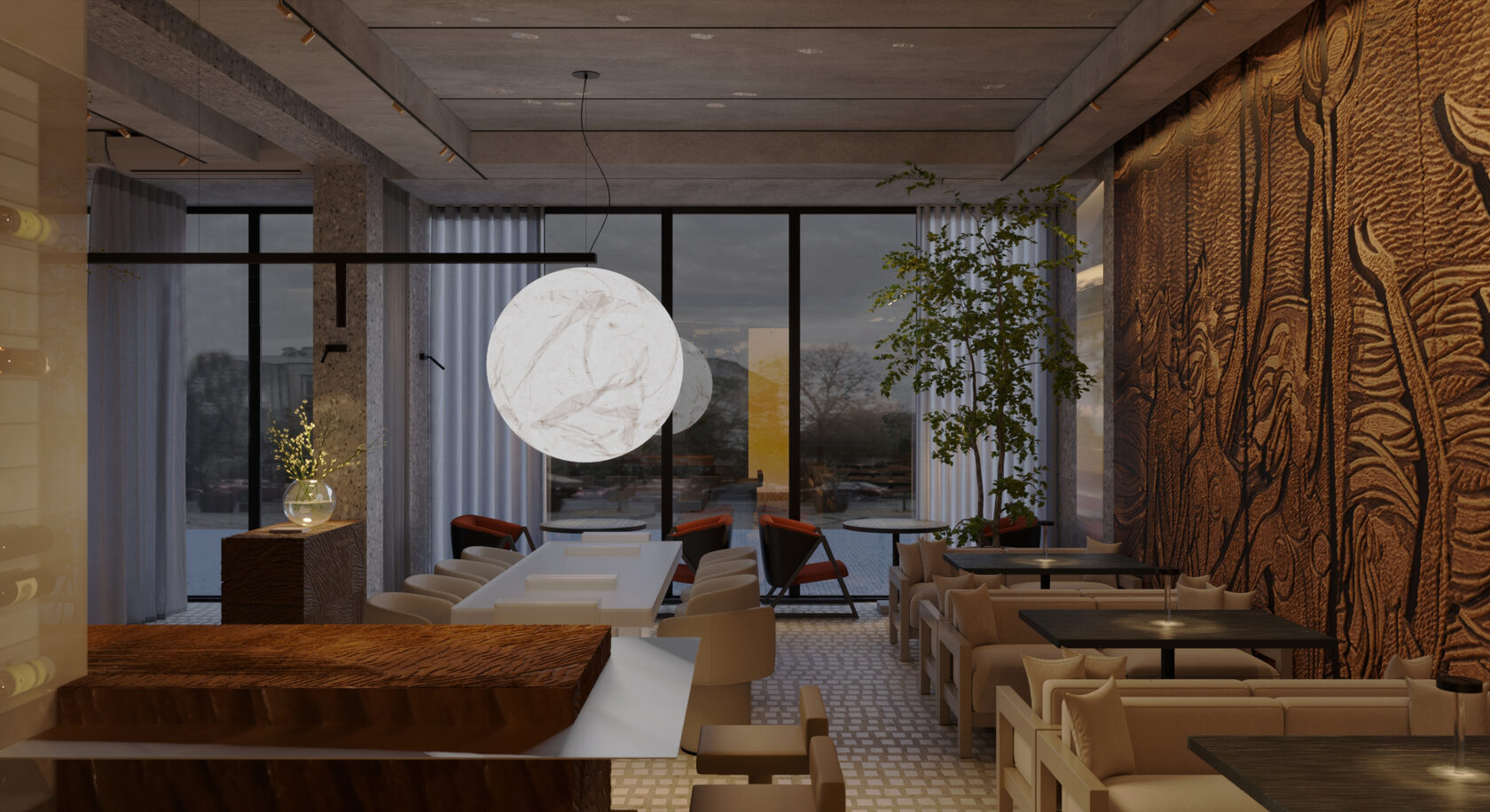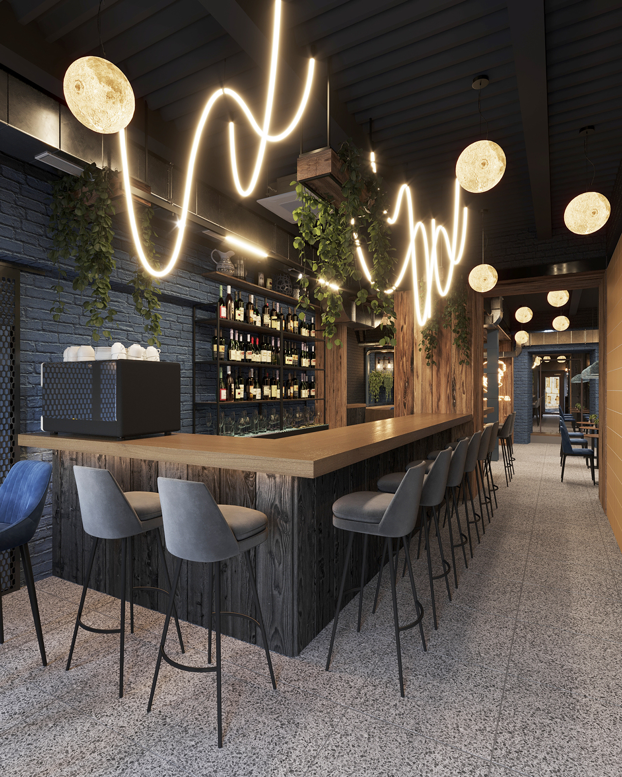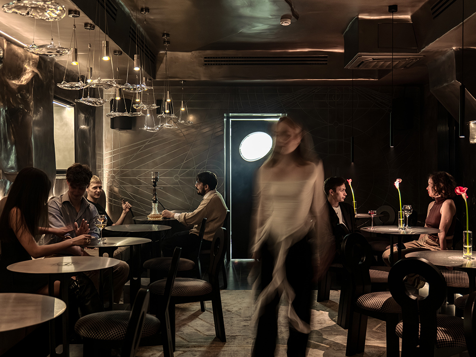 Концепция: В основе концепции лежит амбивалентность городского духа – отшлифованная небрежность и продуманная экспрессия. Дизайн намеренно играет на контрастах: холод металла встречается с теплом текстиля, строгие геометрические формы дополняются органическими вкраплениями растений и винтажными деталями. Особое внимание уделено световому сценарию, имитирующему пульс ночного города, что подчеркивает уникальность и характер заведения.