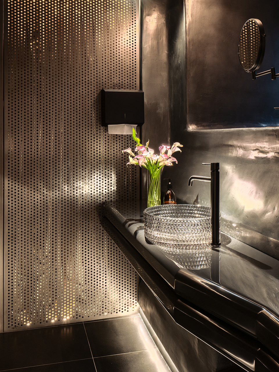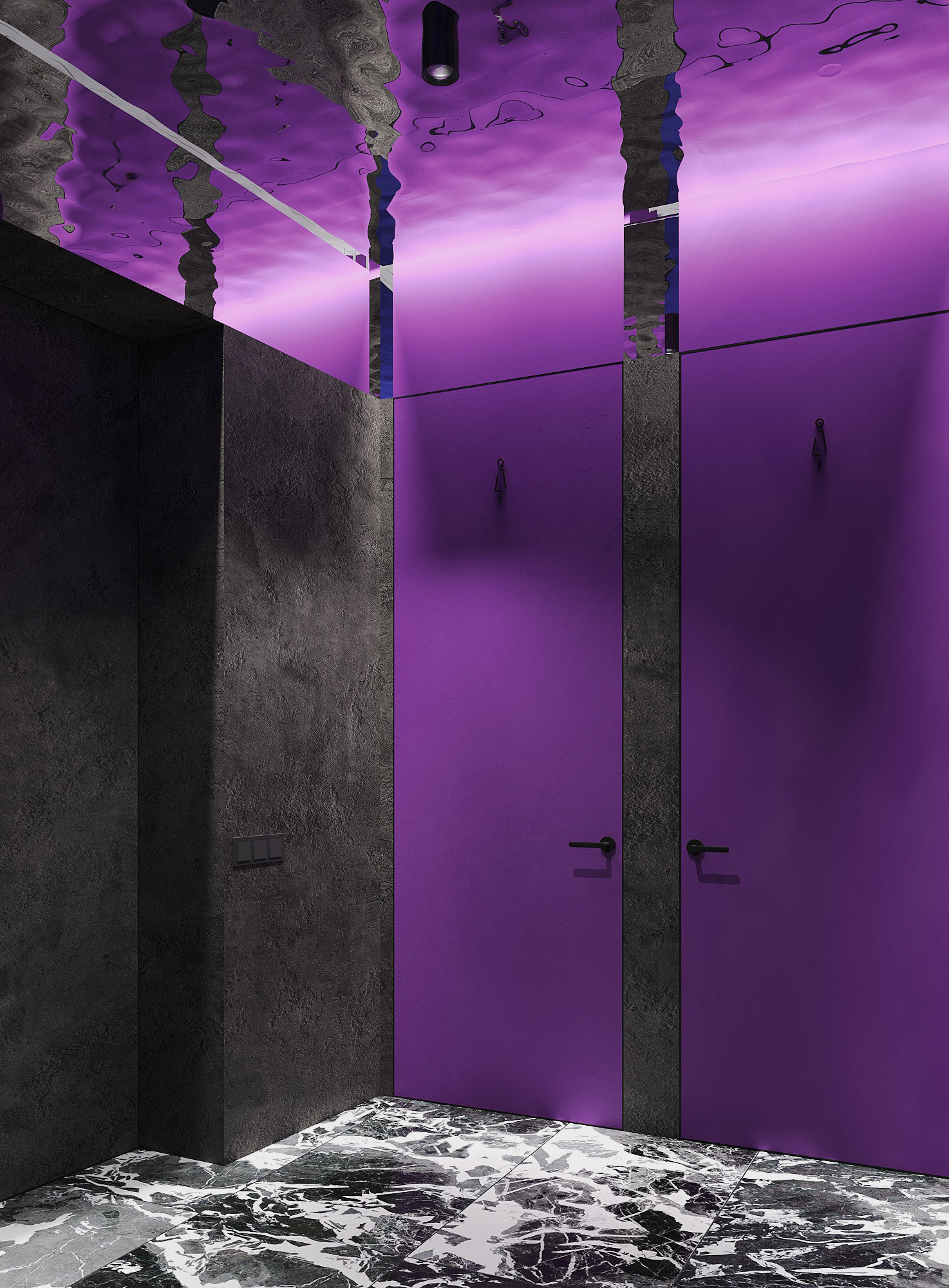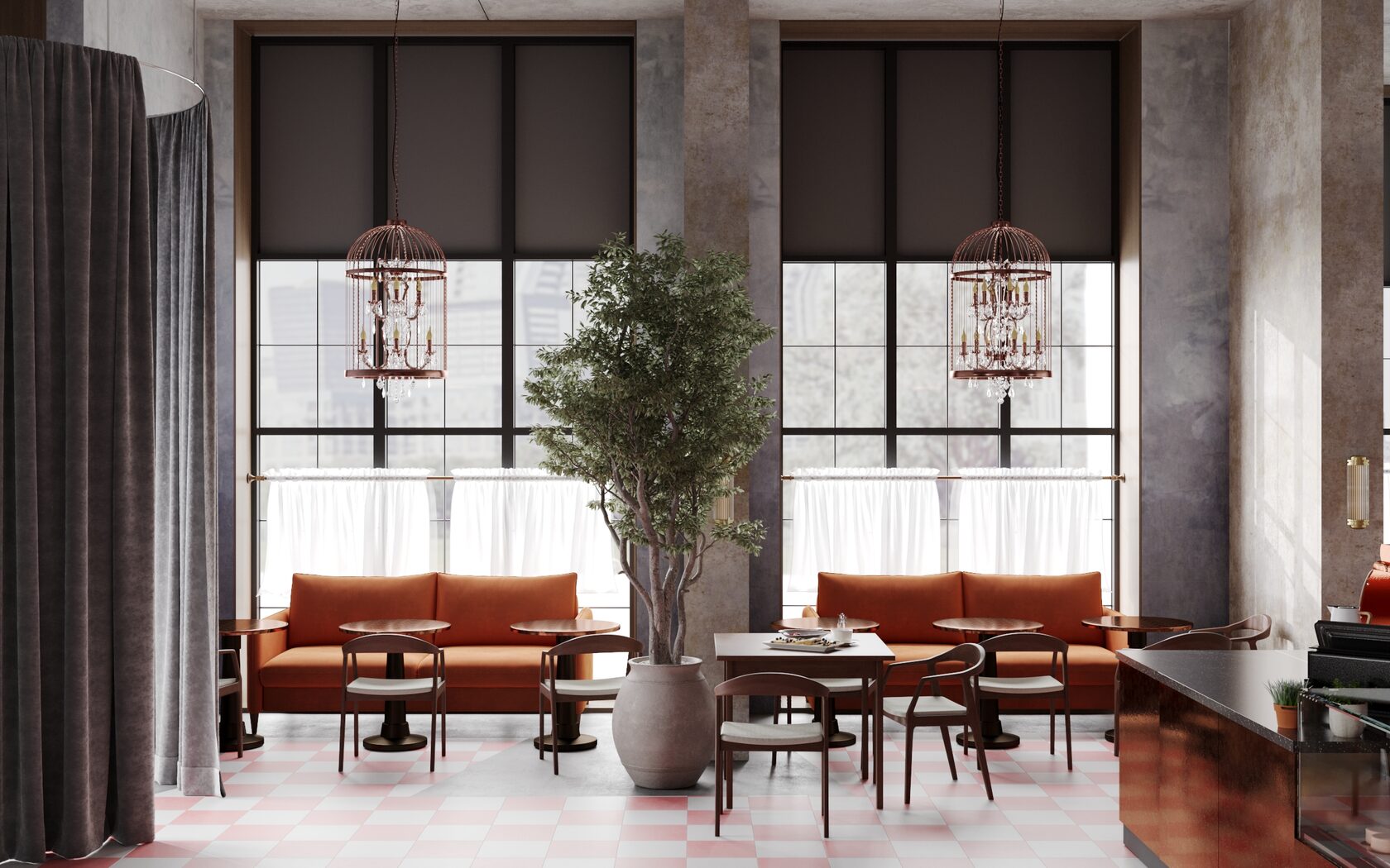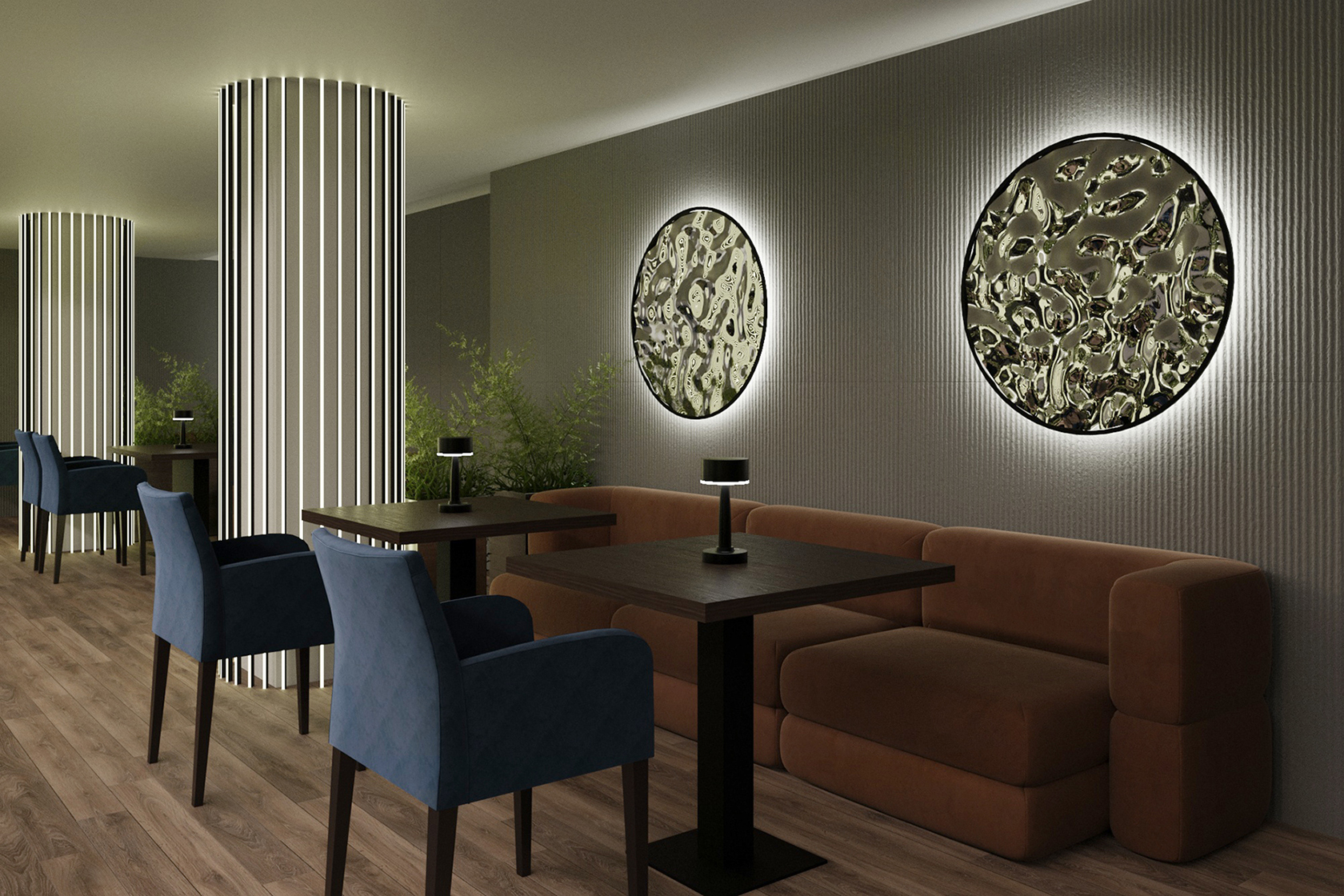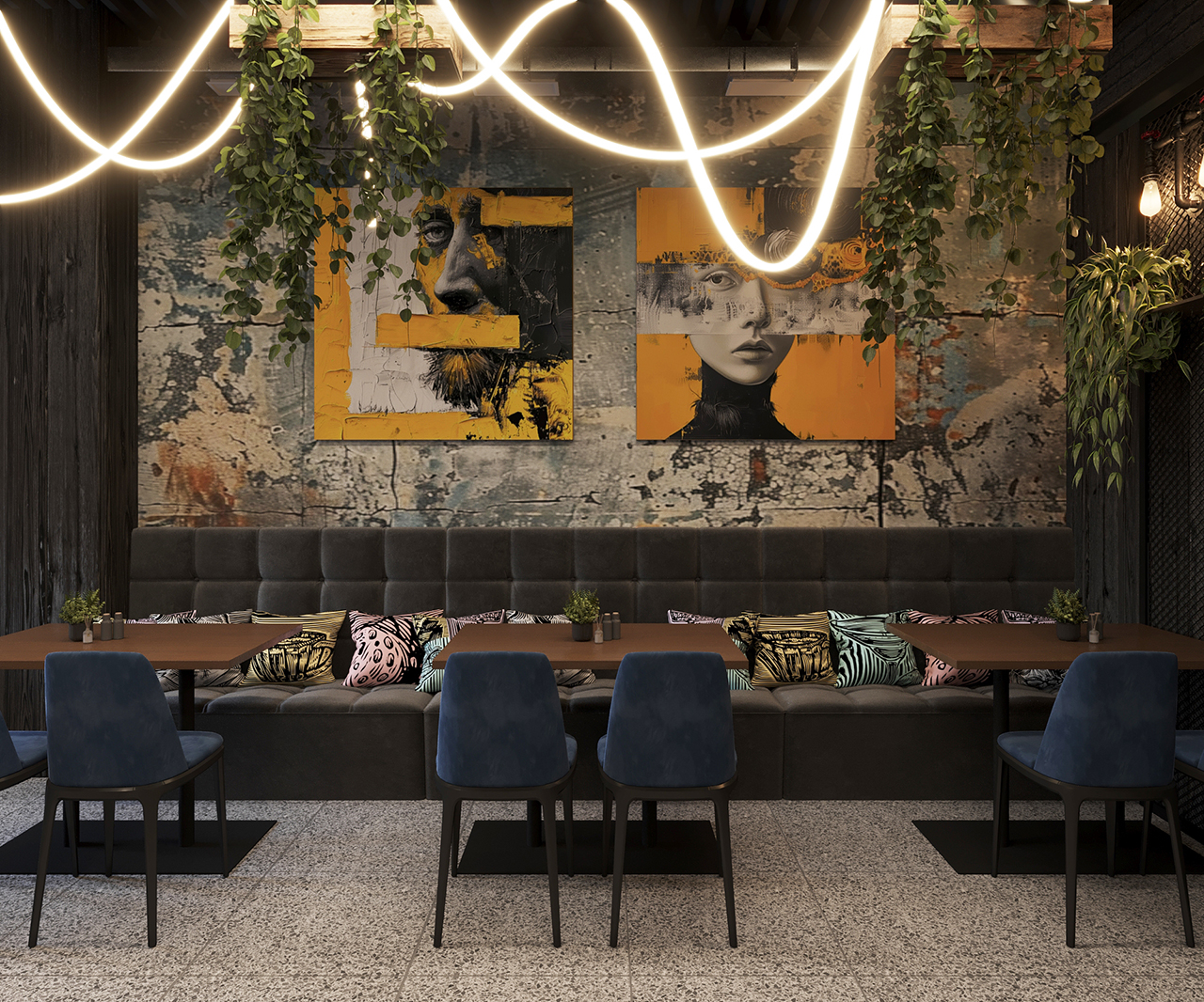 Концепция: В основе концепции лежит амбивалентность городского духа – отшлифованная небрежность и продуманная экспрессия. Дизайн намеренно играет на контрастах: холод металла встречается с теплом текстиля, строгие геометрические формы дополняются органическими вкраплениями растений и винтажными деталями. Особое внимание уделено световому сценарию, имитирующему пульс ночного города, что подчеркивает уникальность и характер заведения.