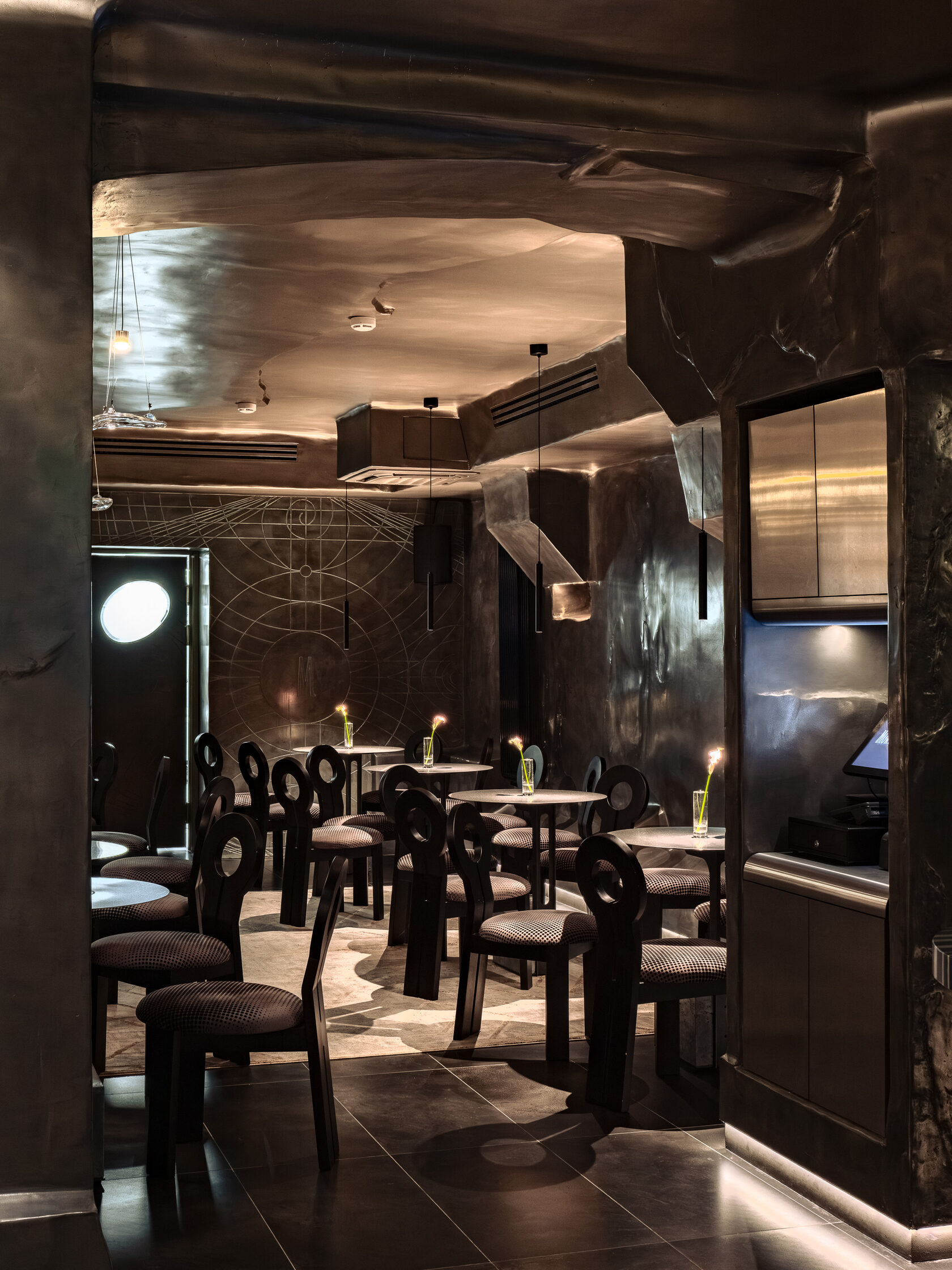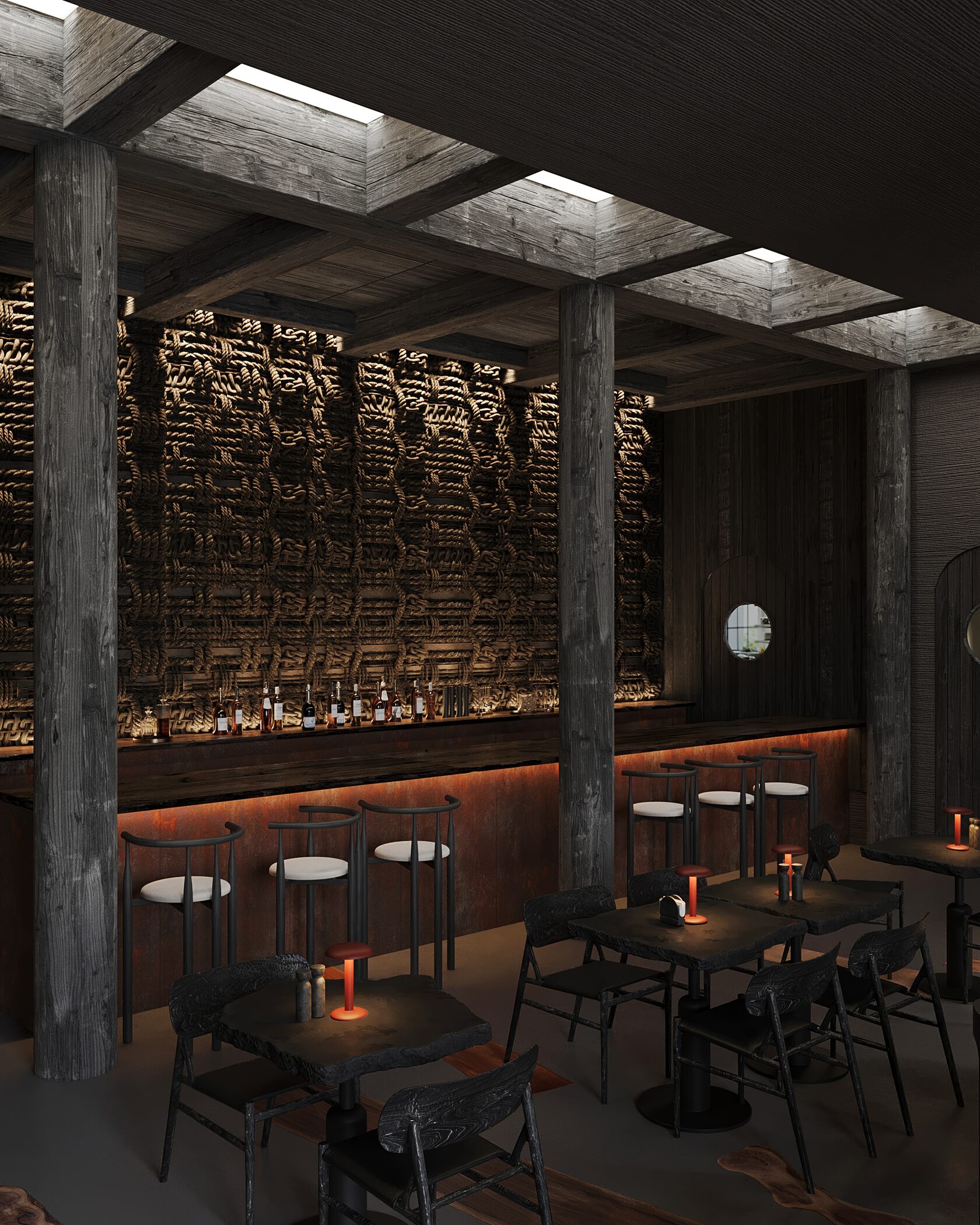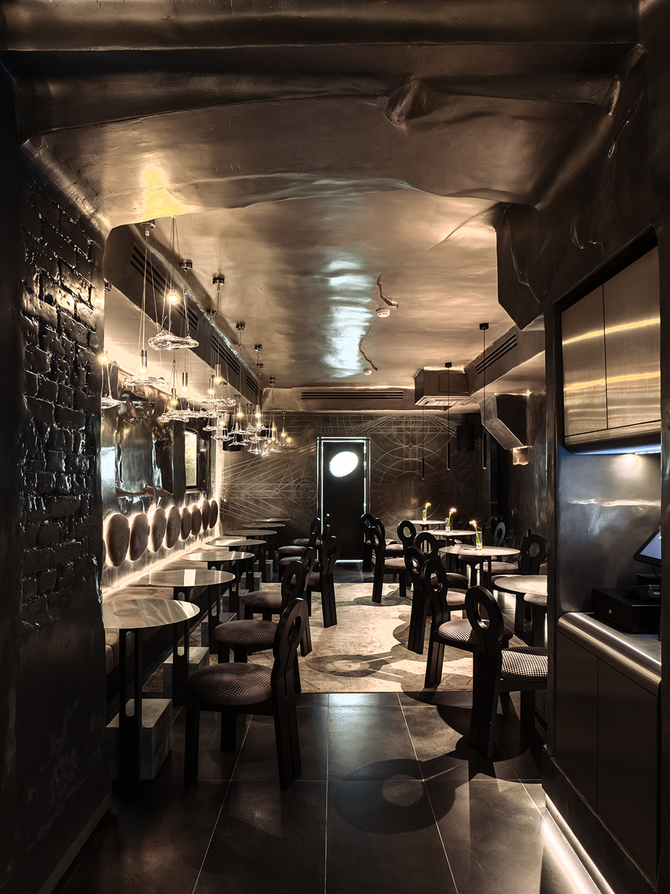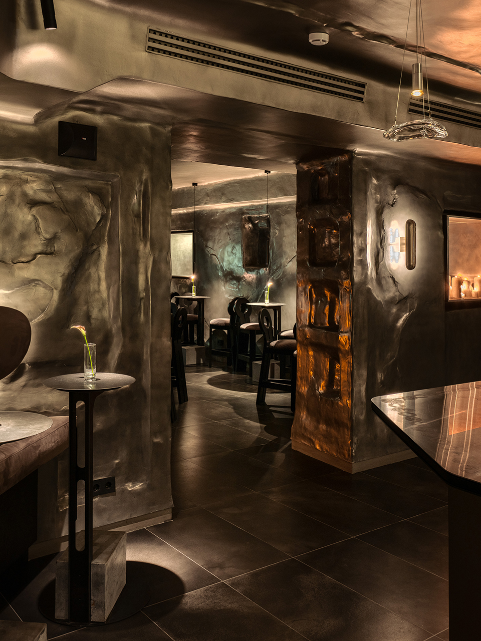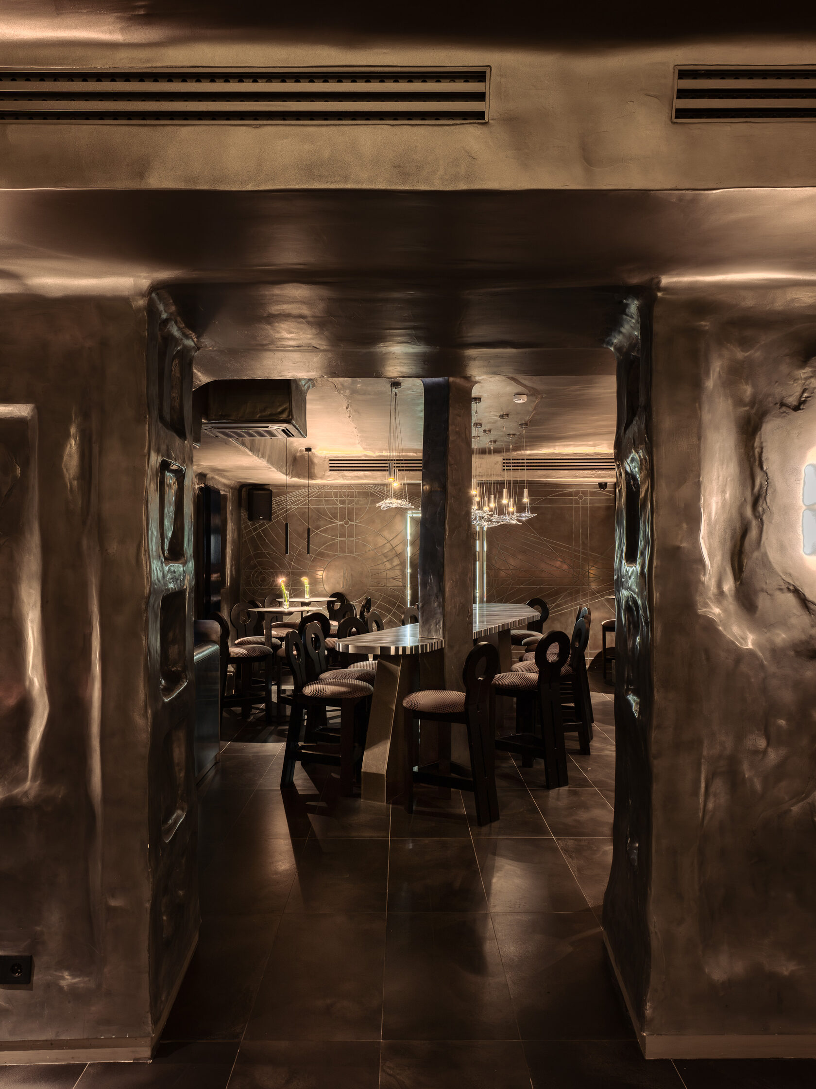 Концепция: Проект представляет собой смелый эксперимент на стыке бионических форм и технологичных материалов. Центральная идея — формирование мистической и вовлекающей среды, где каждый элемент, от гравировок на стальных поверхностях и дверях до медных стен, меняющих свой оттенок, работает на создание глубокого погружения. Расположенный в цокольном этаже исторического здания 1928 года, бар бережно сохраняет и интегрирует культурные слои прошлого, такие как старинная кирпичная кладка и оконные ниши, что придает пространству особую аутентичность и глубину.