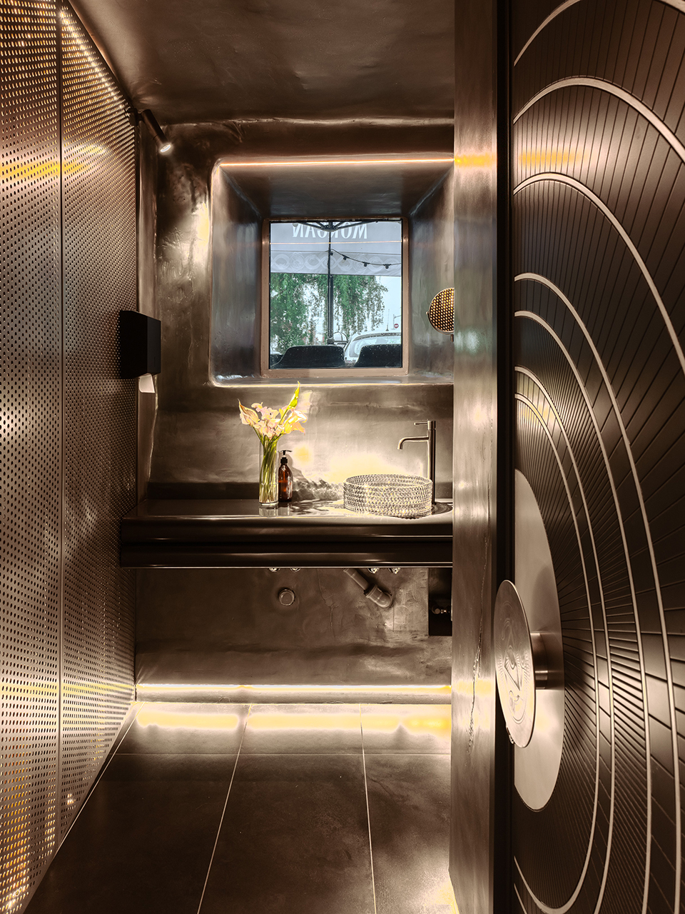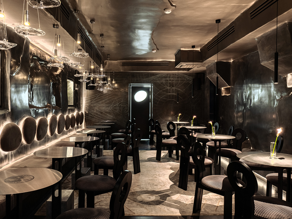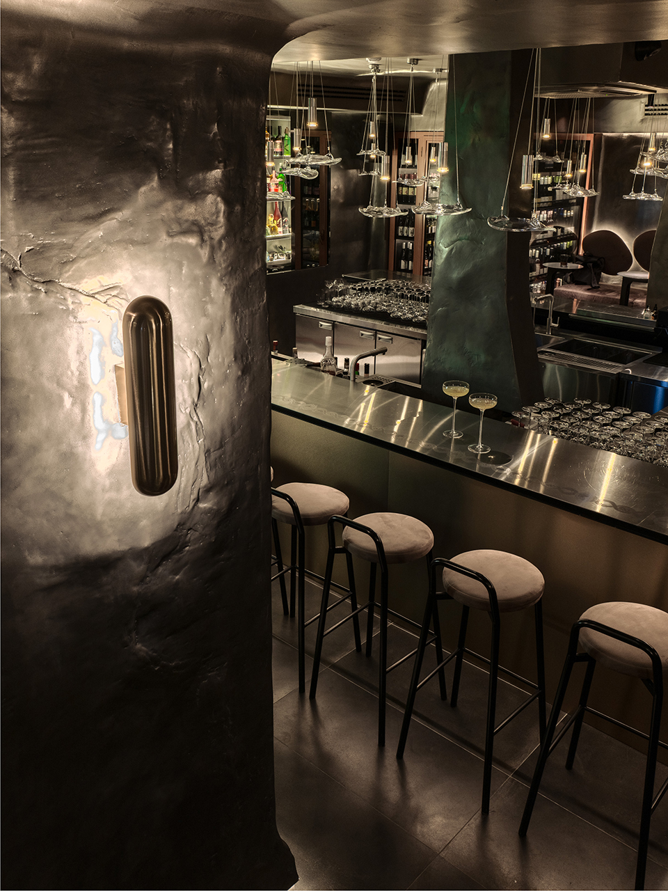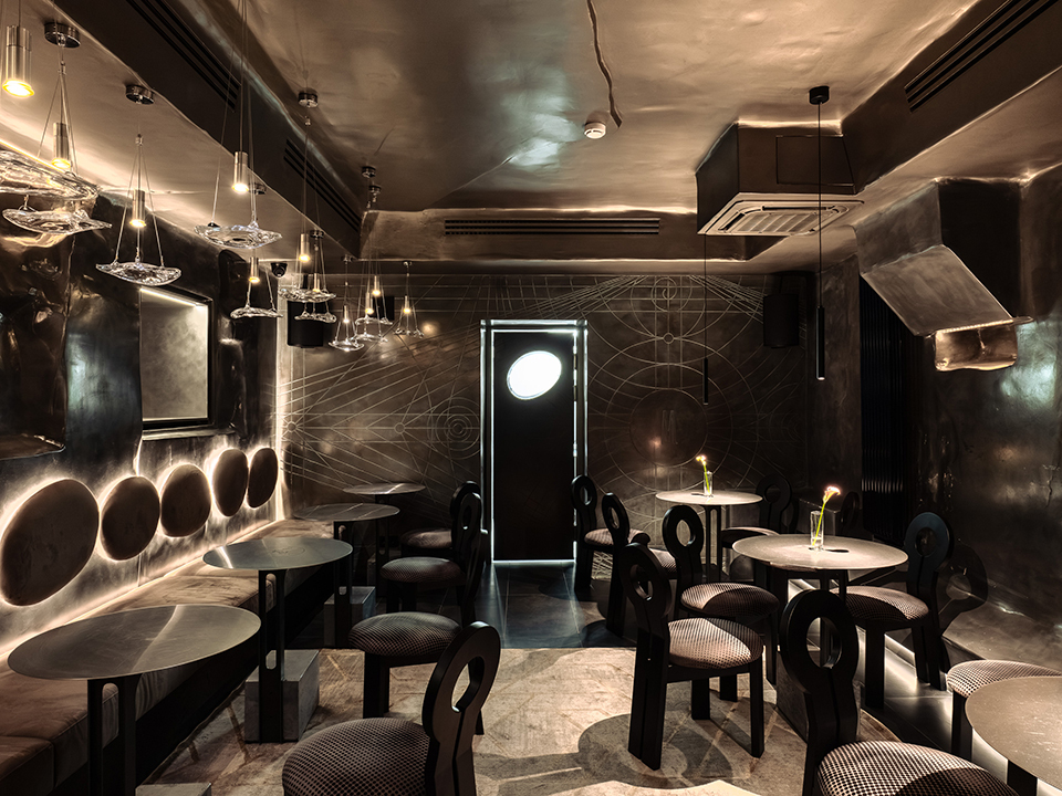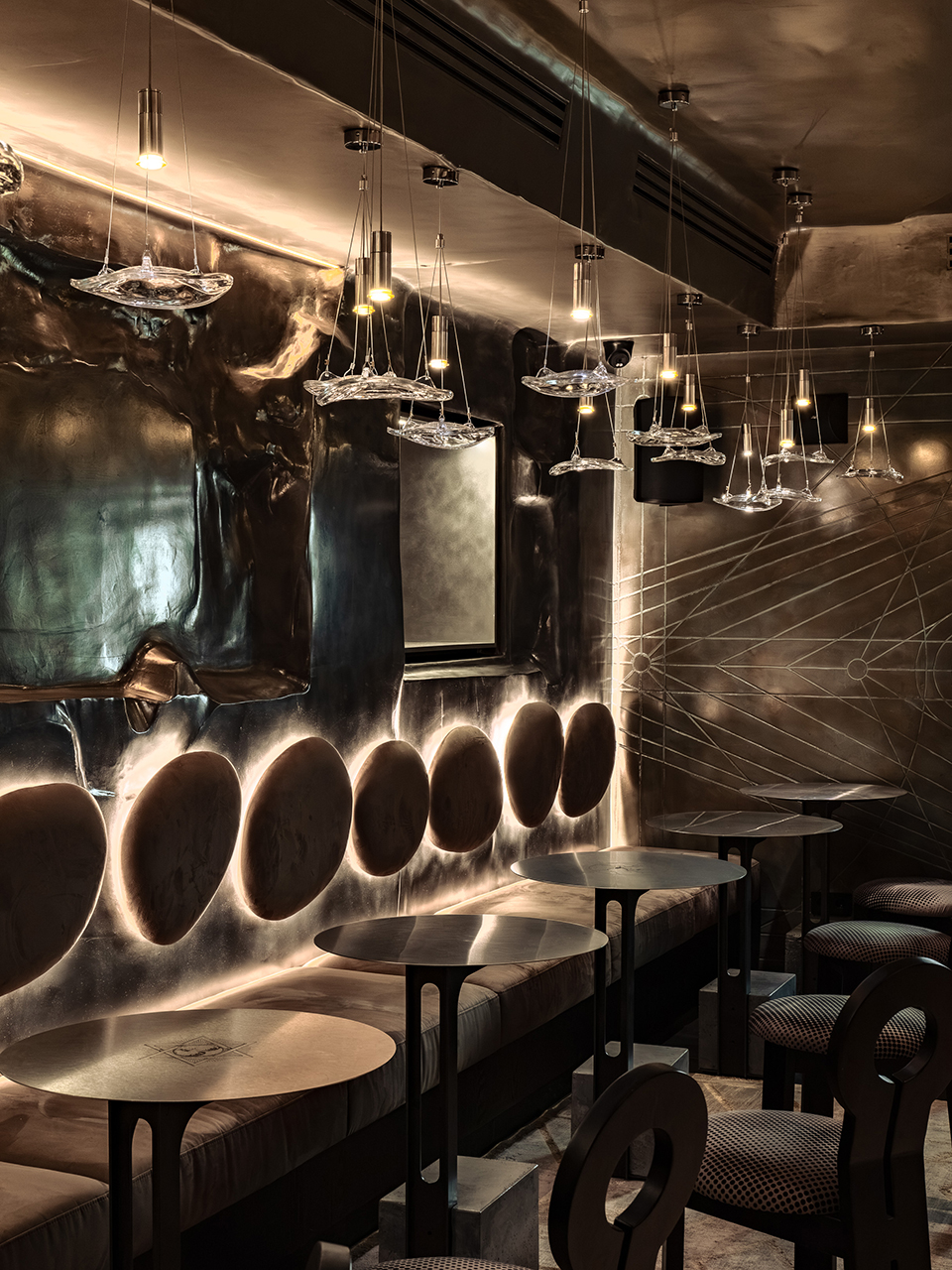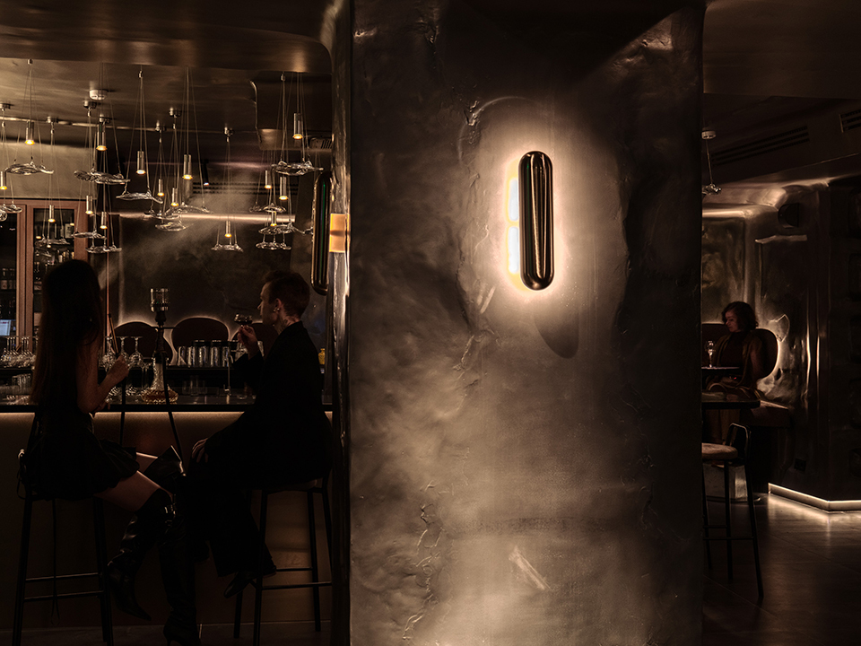 Концепция: Проект представляет собой смелый эксперимент на стыке бионических форм и технологичных материалов. Центральная идея — формирование мистической и вовлекающей среды, где каждый элемент, от гравировок на стальных поверхностях и дверях до медных стен, меняющих свой оттенок, работает на создание глубокого погружения. Расположенный в цокольном этаже исторического здания 1928 года, бар бережно сохраняет и интегрирует культурные слои прошлого, такие как старинная кирпичная кладка и оконные ниши, что придает пространству особую аутентичность и глубину.
