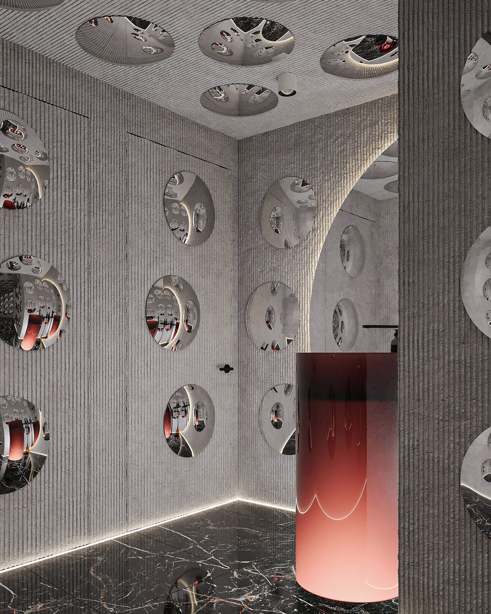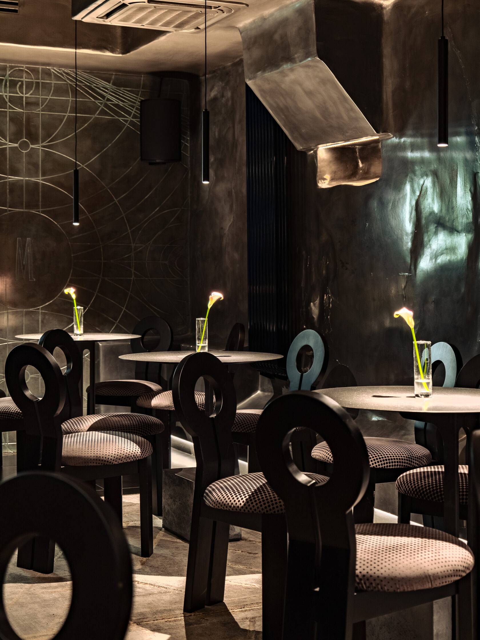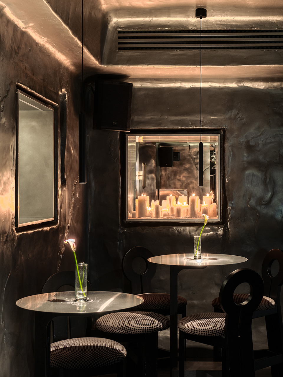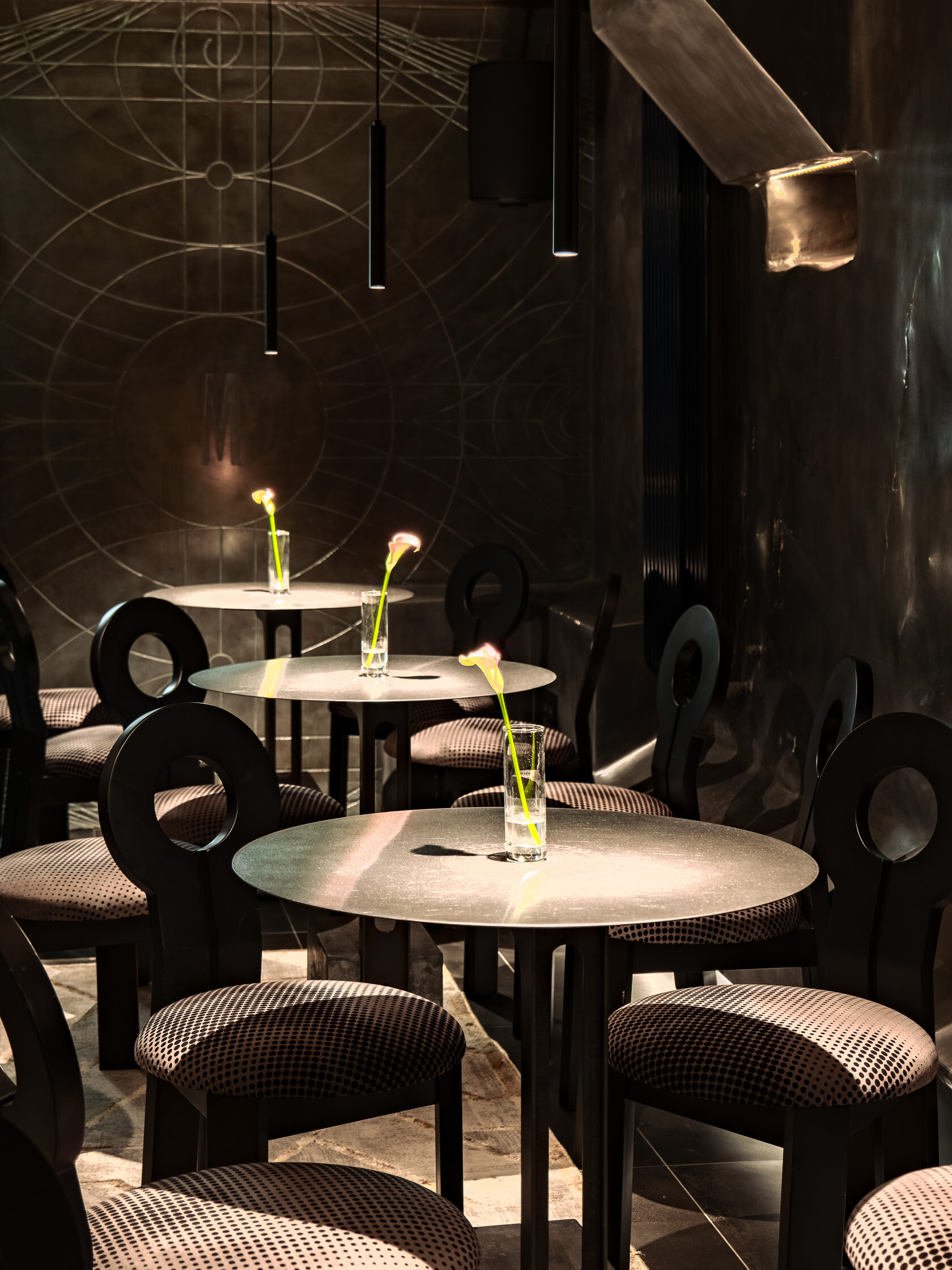Концепция: Проект представляет собой смелый эксперимент на стыке бионических форм и технологичных материалов. Центральная идея — формирование мистической и вовлекающей среды, где каждый элемент, от гравировок на стальных поверхностях и дверях до медных стен, меняющих свой оттенок, работает на создание глубокого погружения. Расположенный в цокольном этаже исторического здания 1928 года, бар бережно сохраняет и интегрирует культурные слои прошлого, такие как старинная кирпичная кладка и оконные ниши, что придает пространству особую аутентичность и глубину.