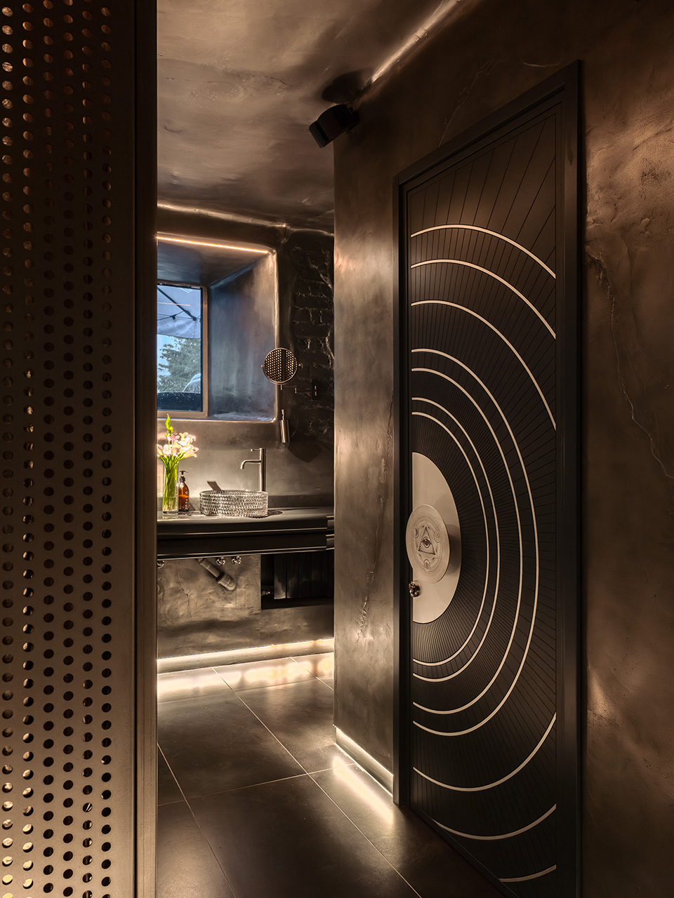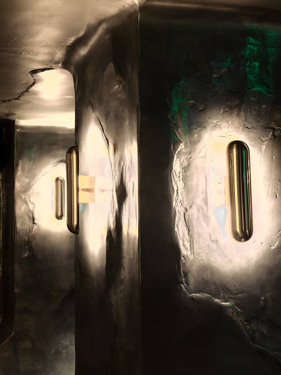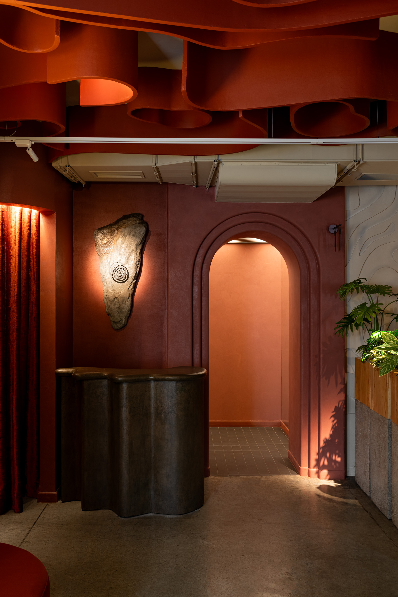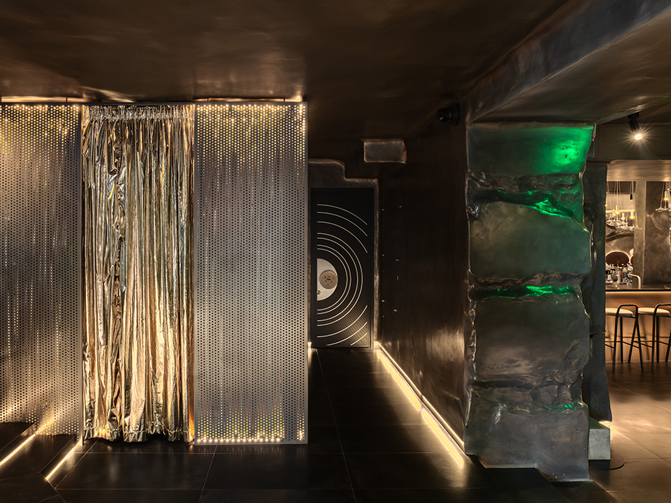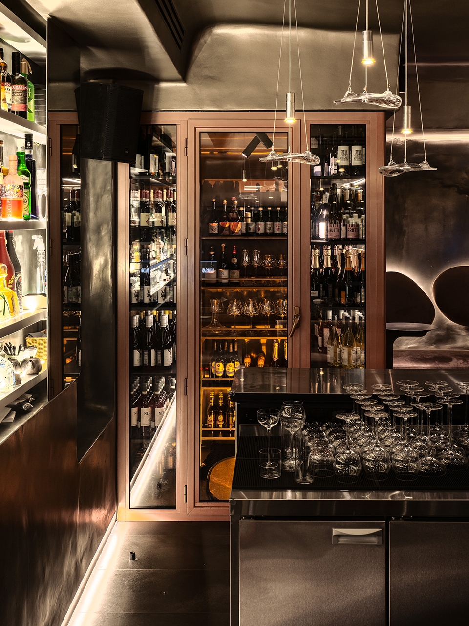 Концепция: Проект представляет собой смелый эксперимент на стыке бионических форм и технологичных материалов. Центральная идея — формирование мистической и вовлекающей среды, где каждый элемент, от гравировок на стальных поверхностях и дверях до медных стен, меняющих свой оттенок, работает на создание глубокого погружения. Расположенный в цокольном этаже исторического здания 1928 года, бар бережно сохраняет и интегрирует культурные слои прошлого, такие как старинная кирпичная кладка и оконные ниши, что придает пространству особую аутентичность и глубину.