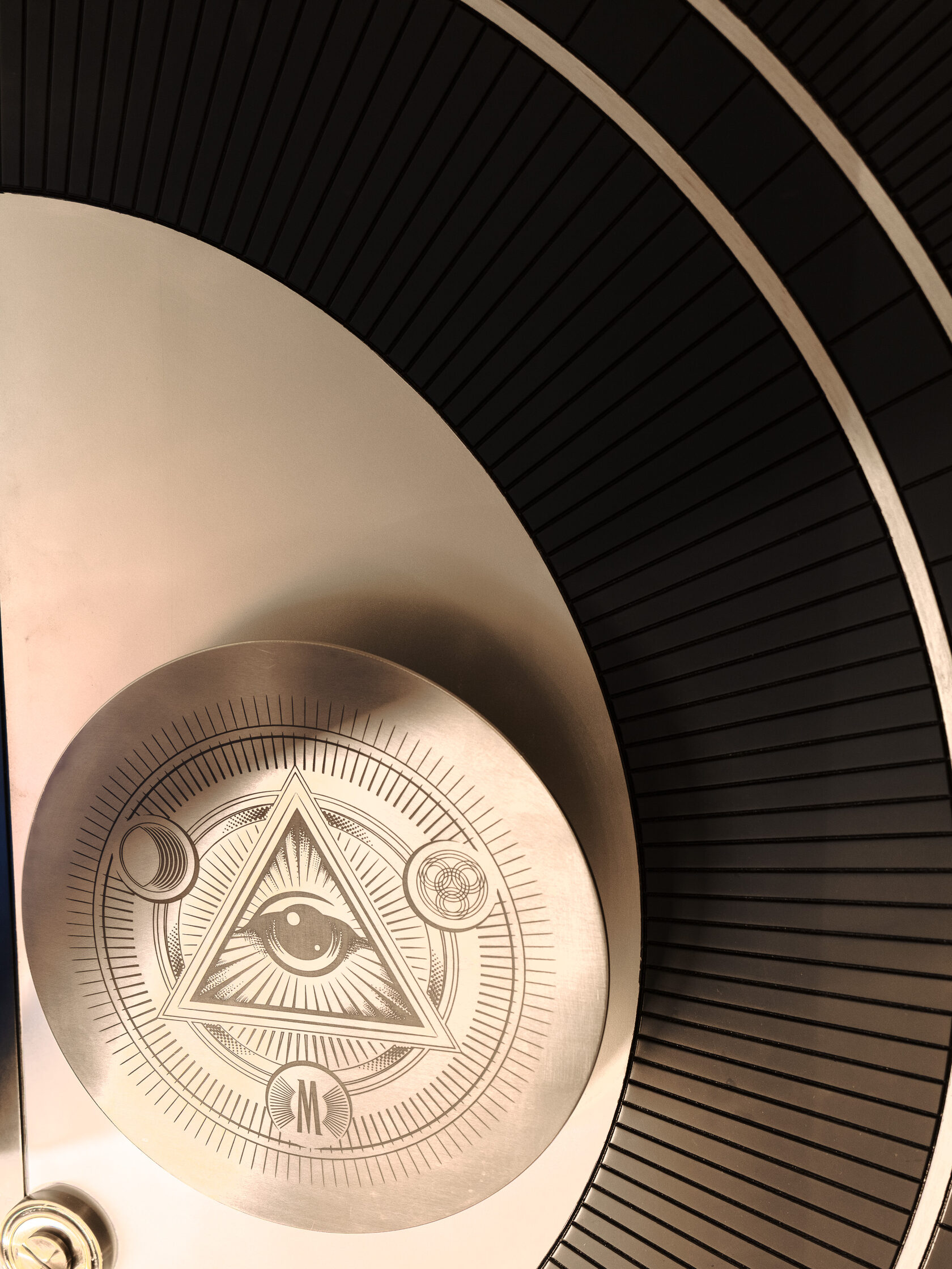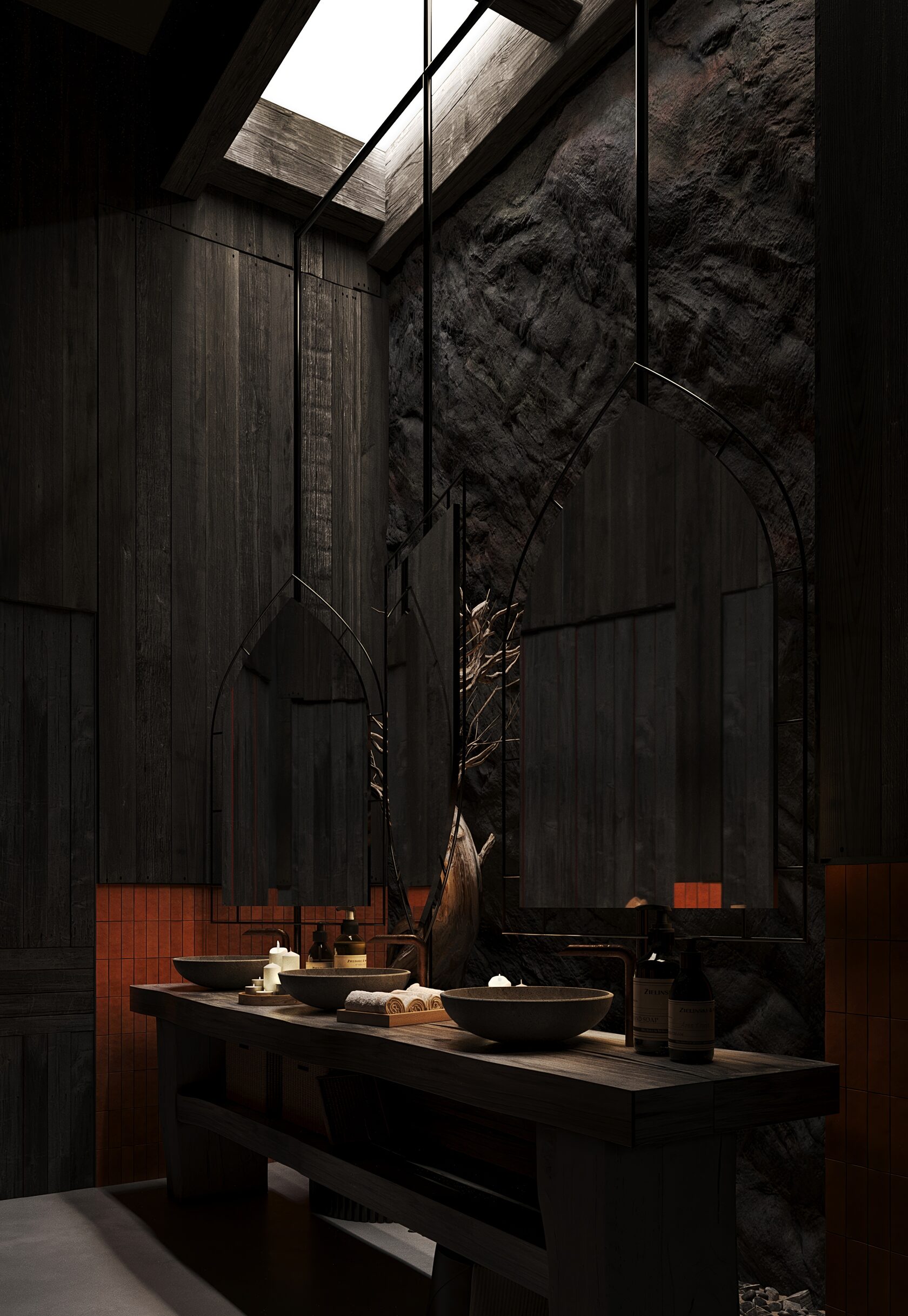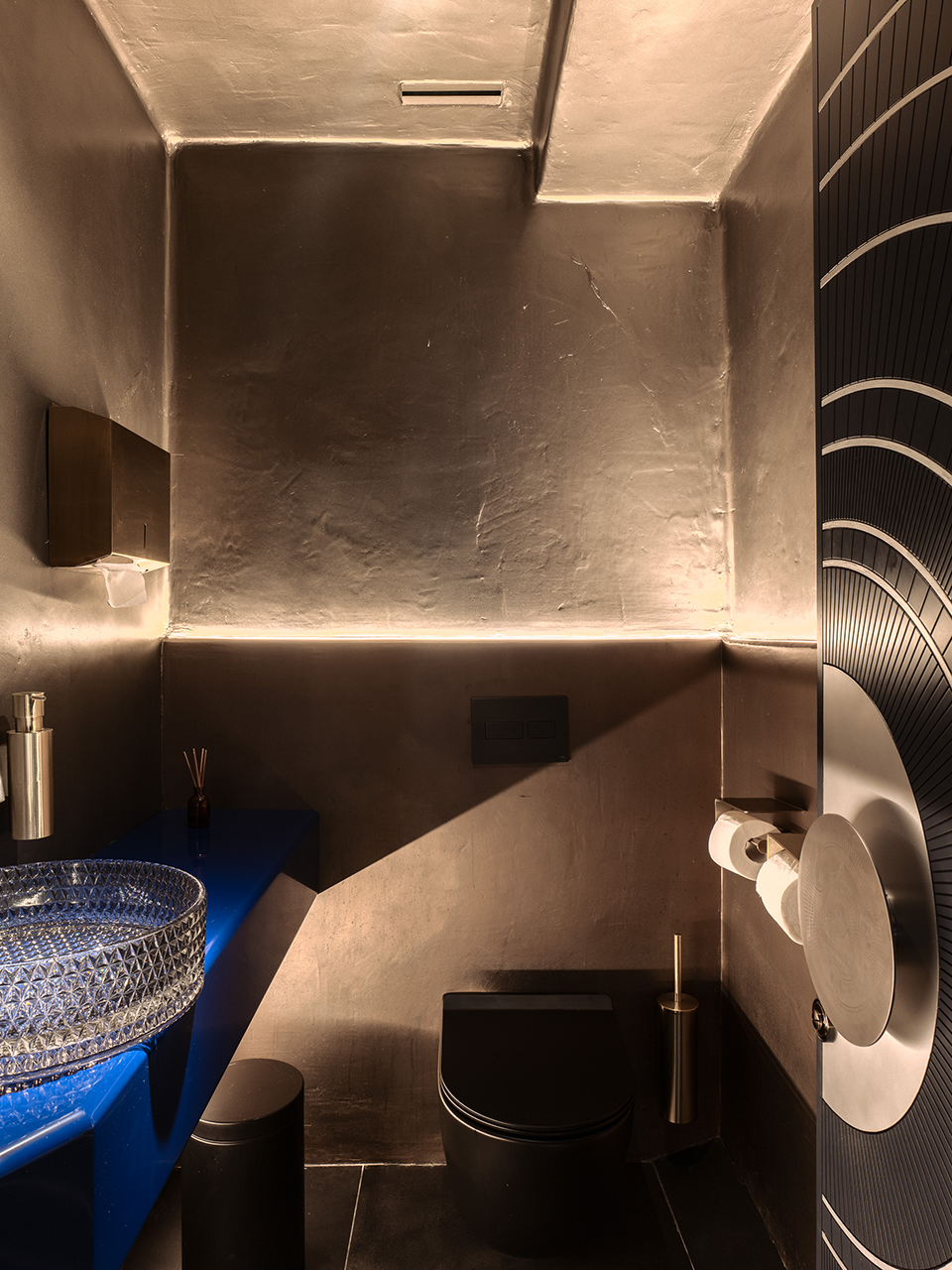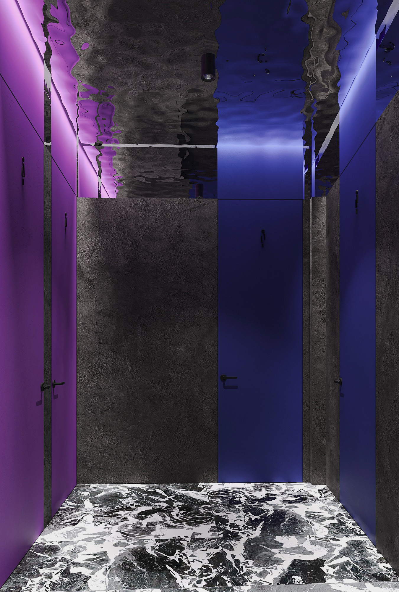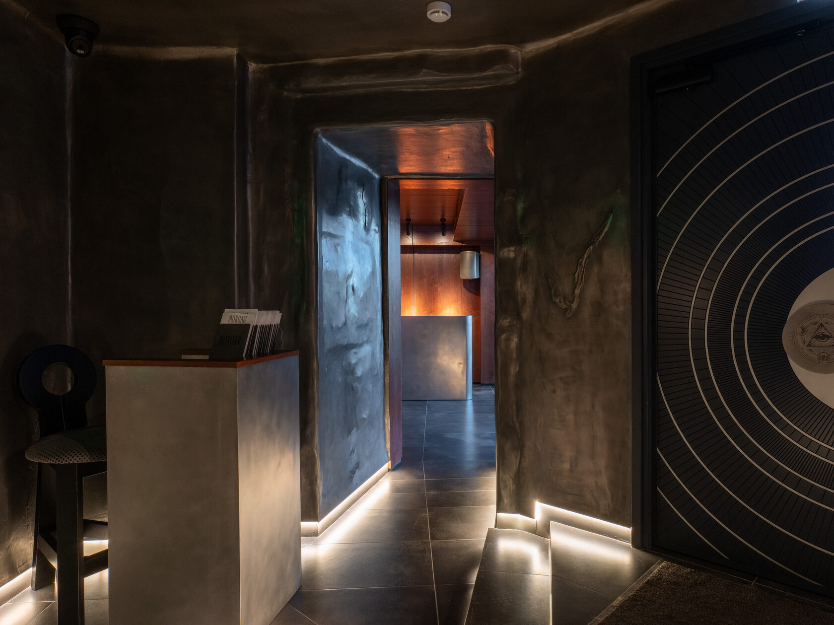 Концепция: Проект представляет собой смелый эксперимент на стыке бионических форм и технологичных материалов. Центральная идея — формирование мистической и вовлекающей среды, где каждый элемент, от гравировок на стальных поверхностях и дверях до медных стен, меняющих свой оттенок, работает на создание глубокого погружения. Расположенный в цокольном этаже исторического здания 1928 года, бар бережно сохраняет и интегрирует культурные слои прошлого, такие как старинная кирпичная кладка и оконные ниши, что придает пространству особую аутентичность и глубину.